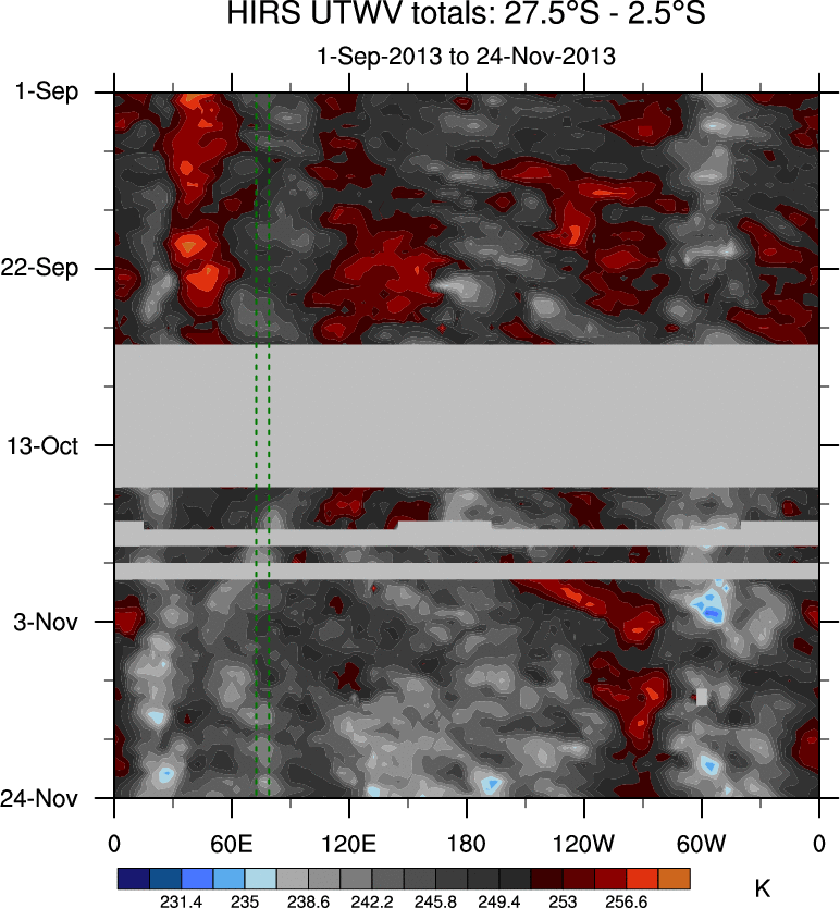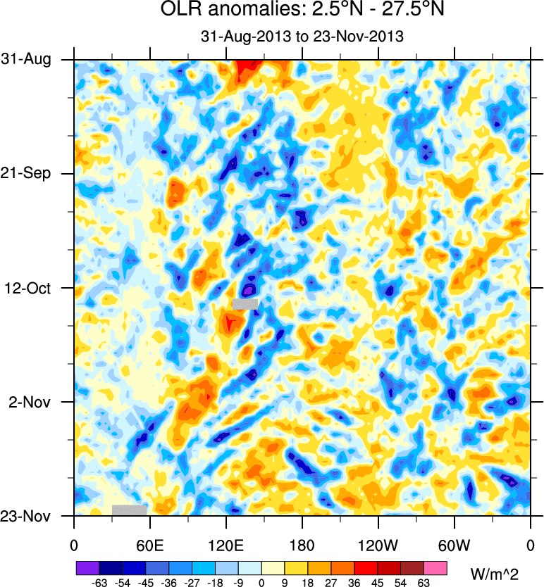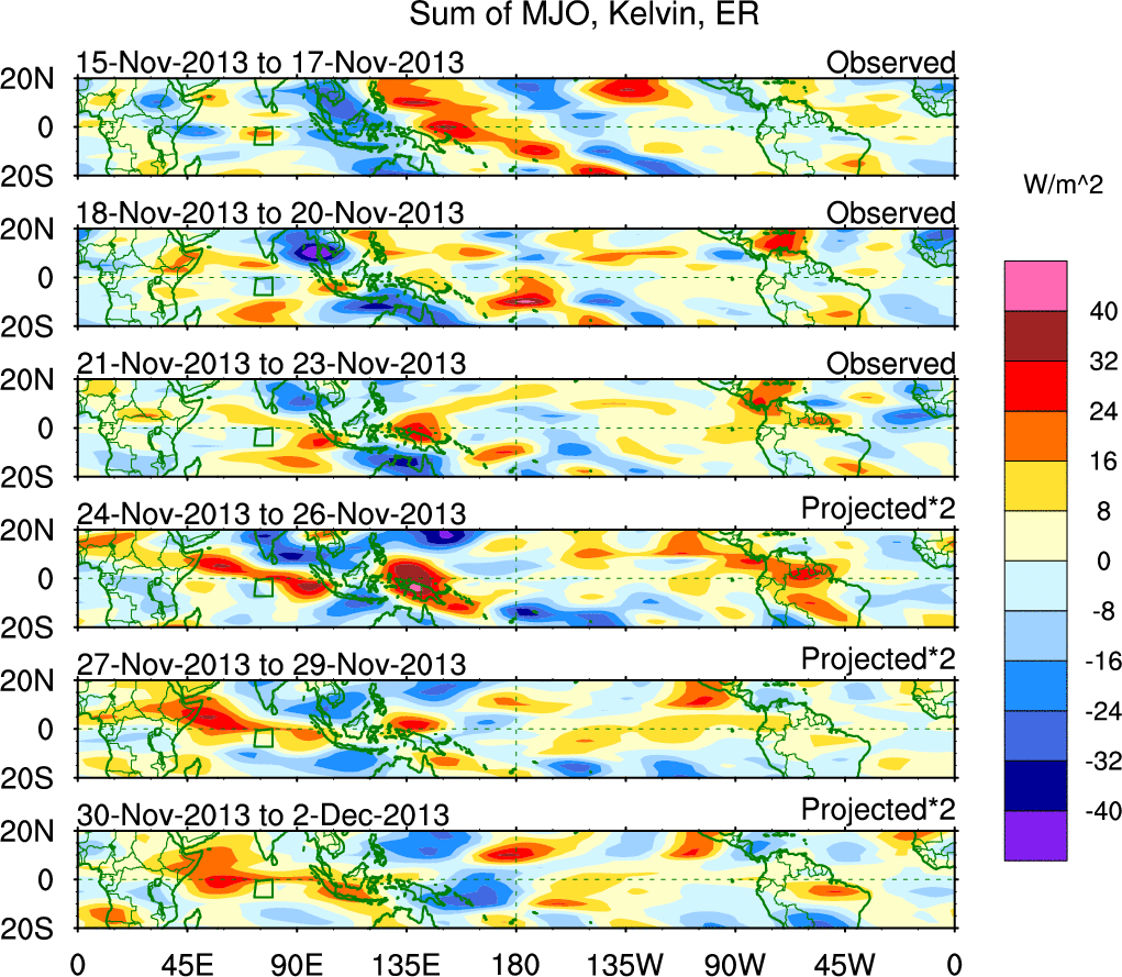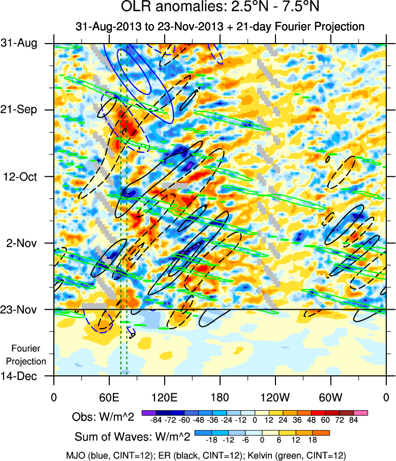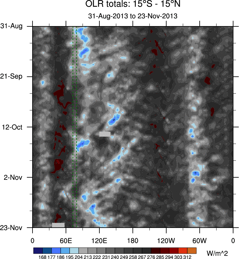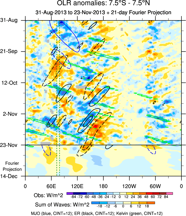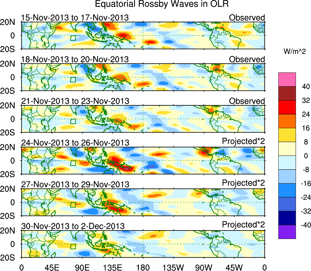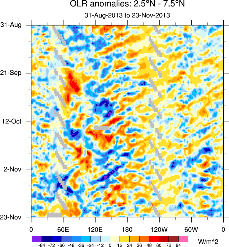 To identify tropical waves in near real-time, the OLR and UTWV data are filtered following Wheeler & Weickmann (2001 MWR). The daily anomalies are calculated using the first 3 harmonics of the seasonal cycle for 1979–2009. Missing values are then filled using linear interpolation in space and time. The most recent 365 days of anomalies are padded with 659 days of zeroes, and the result is filtered for each wave type.