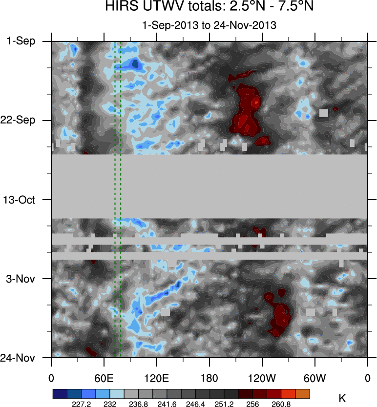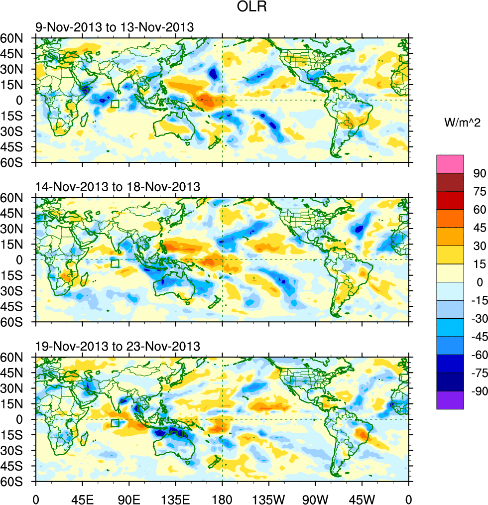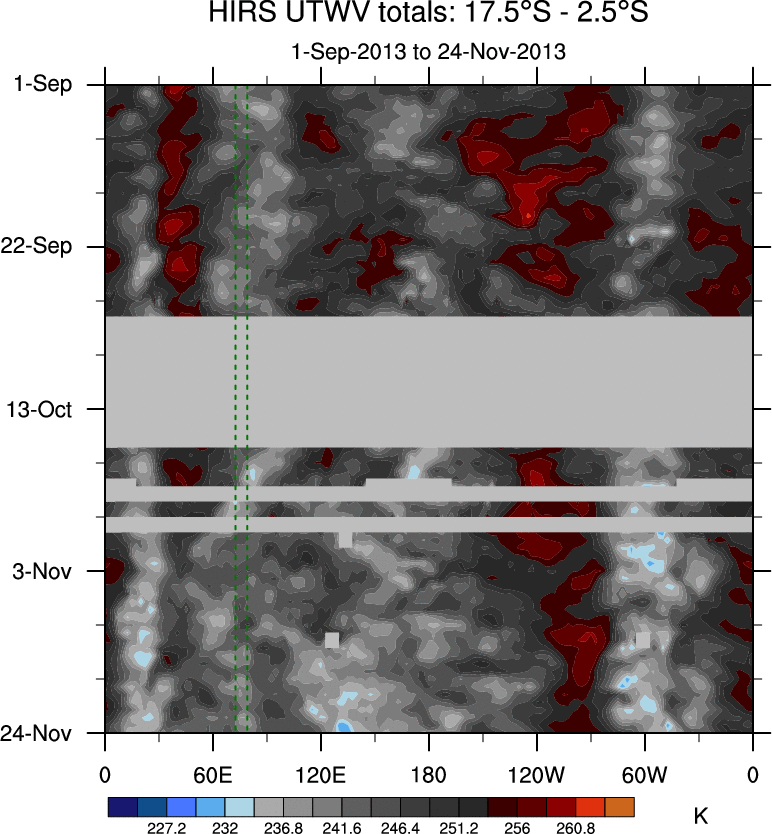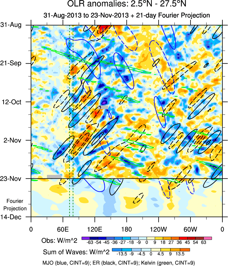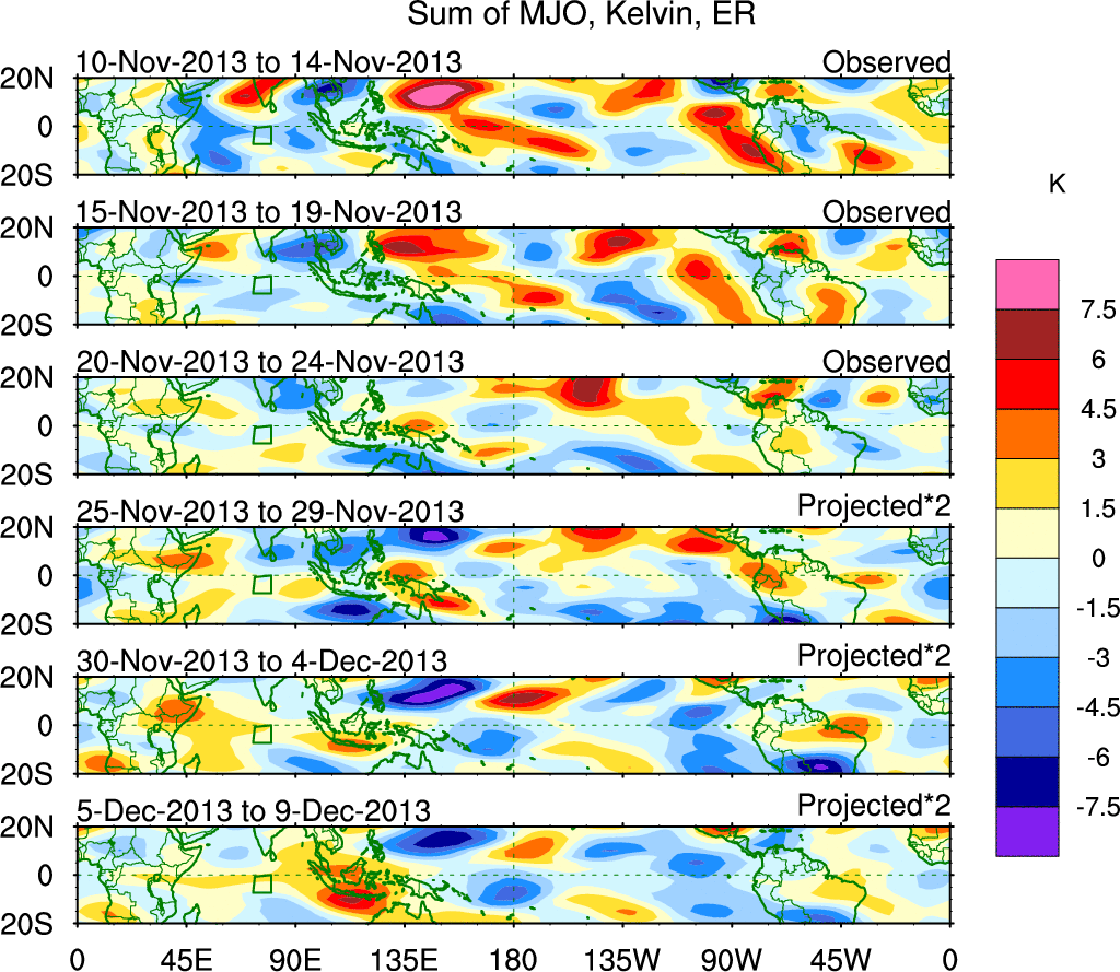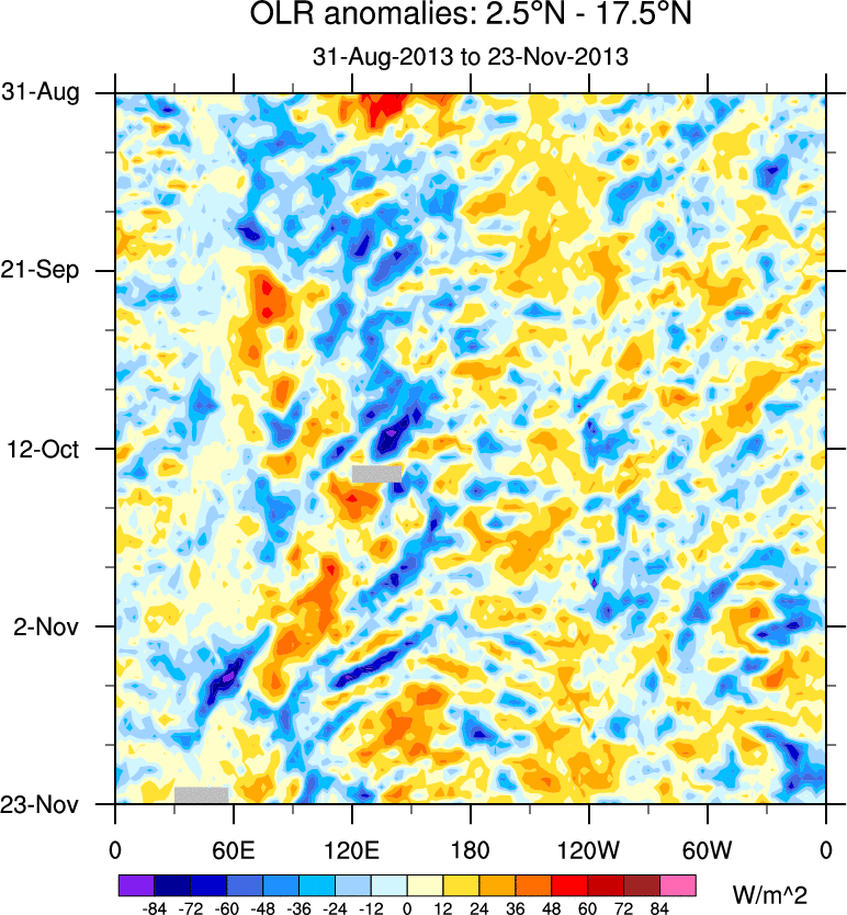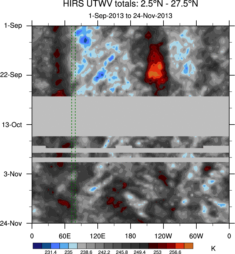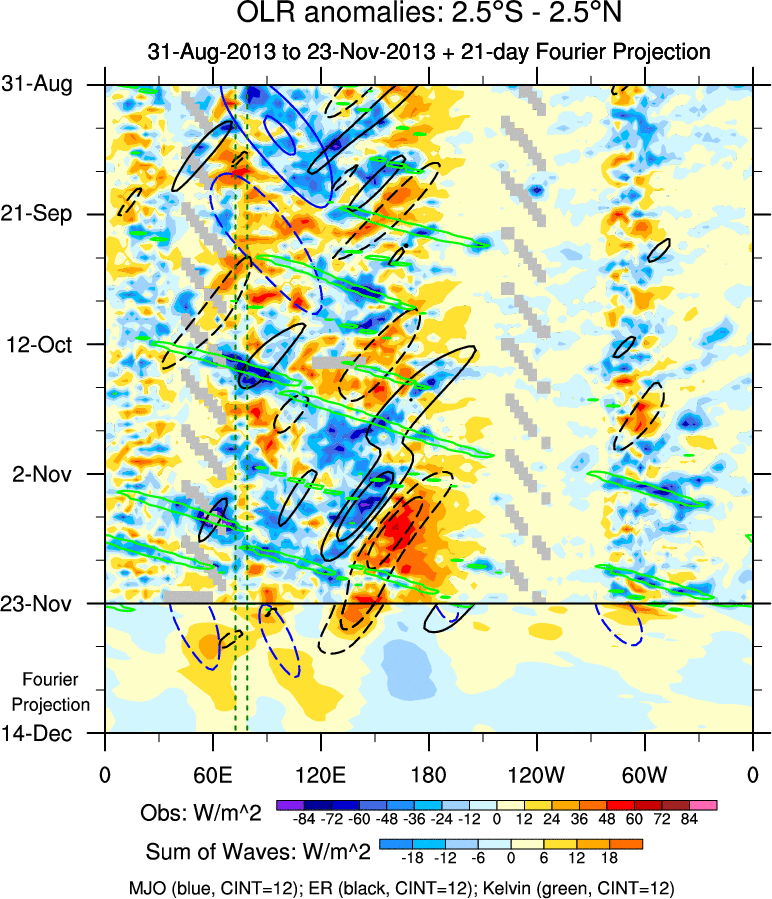To identify tropical waves in near real-time, the OLR and UTWV data are filtered following Wheeler & Weickmann (2001 MWR). The daily anomalies are calculated using the first 3 harmonics of the seasonal cycle for 1979–2009. Missing values are then filled using linear interpolation in space and time. The most recent 365 days of anomalies are padded with 659 days of zeroes, and the result is filtered for each wave type.
