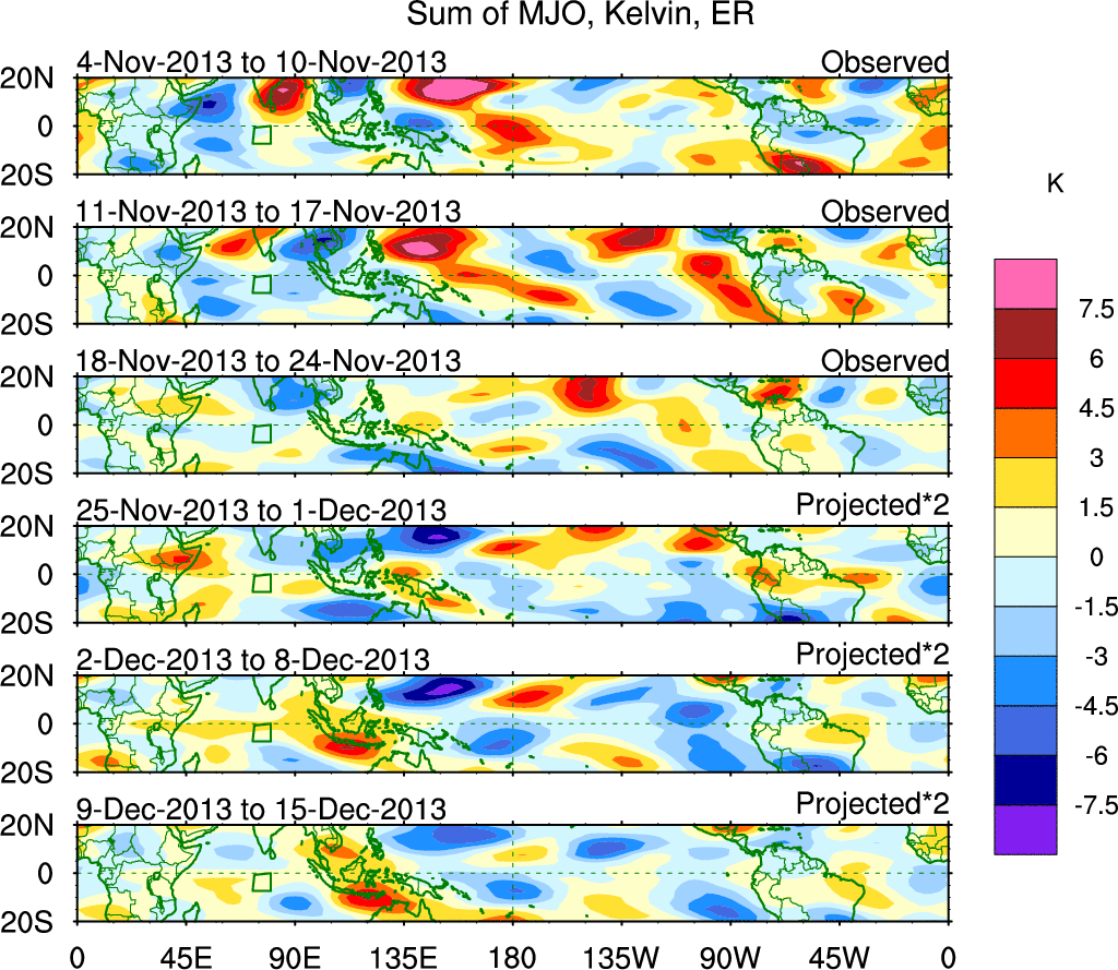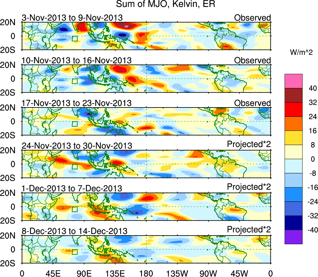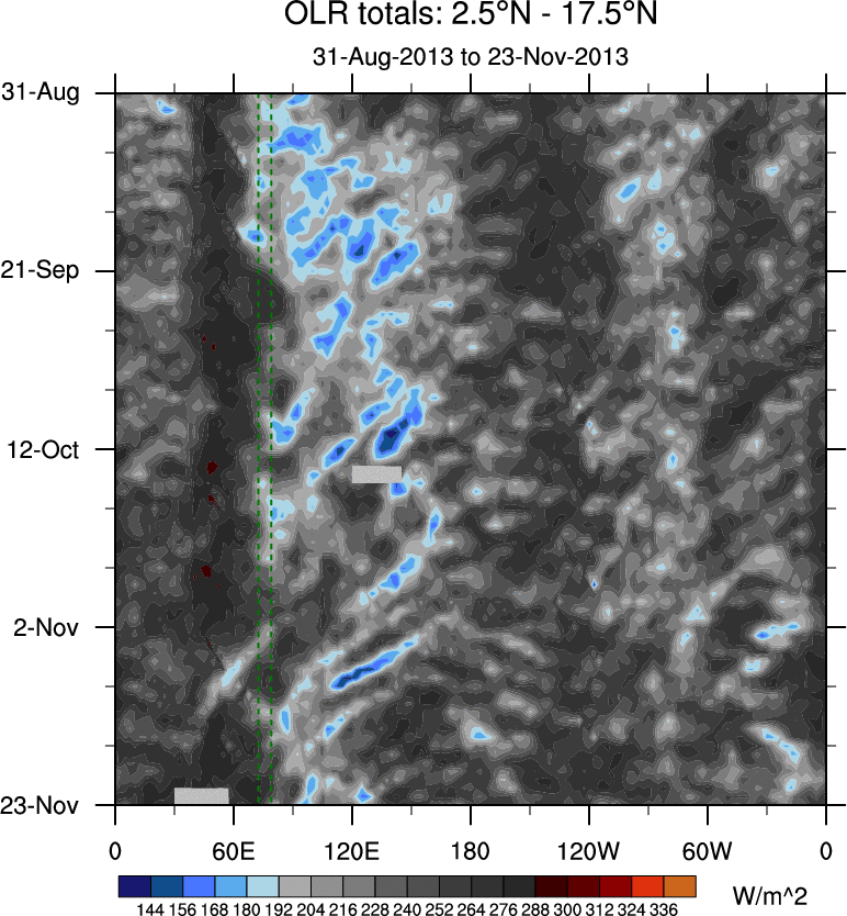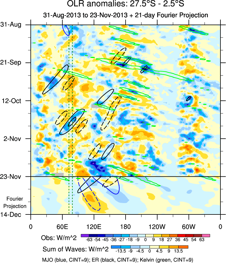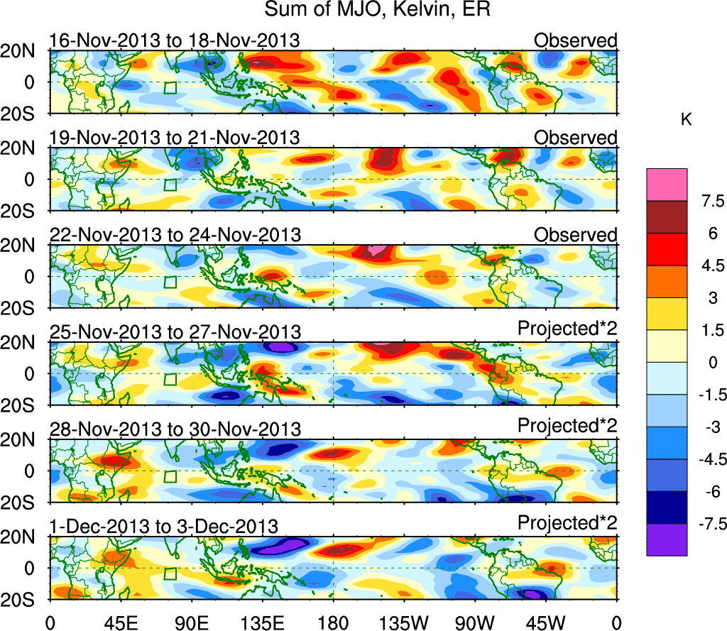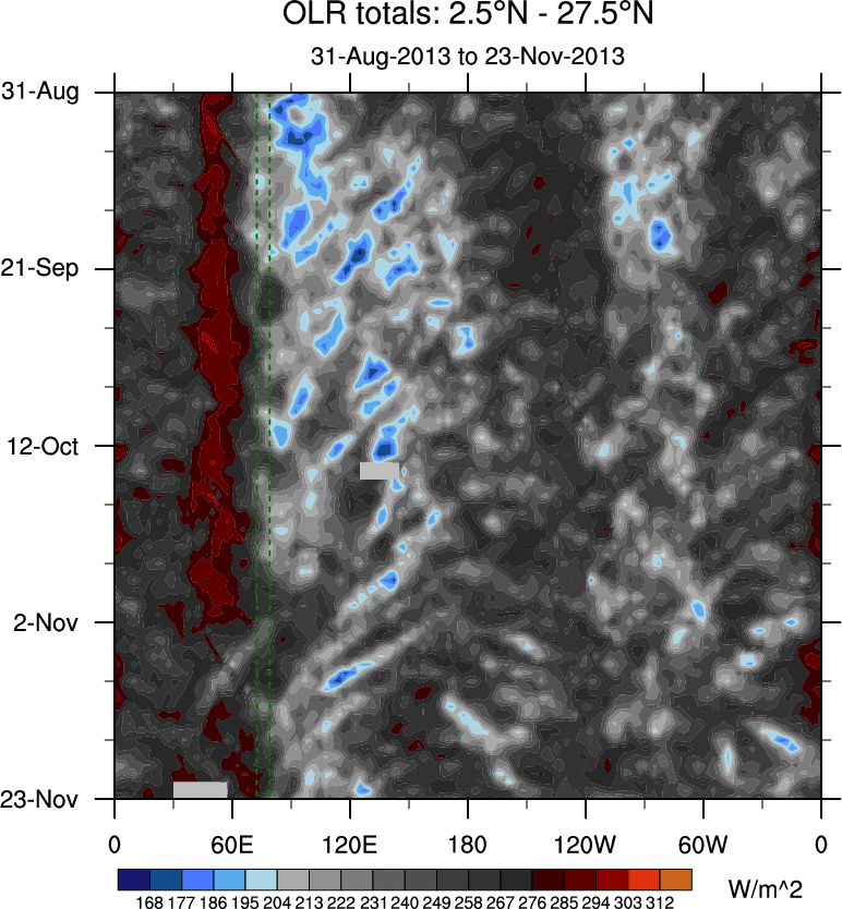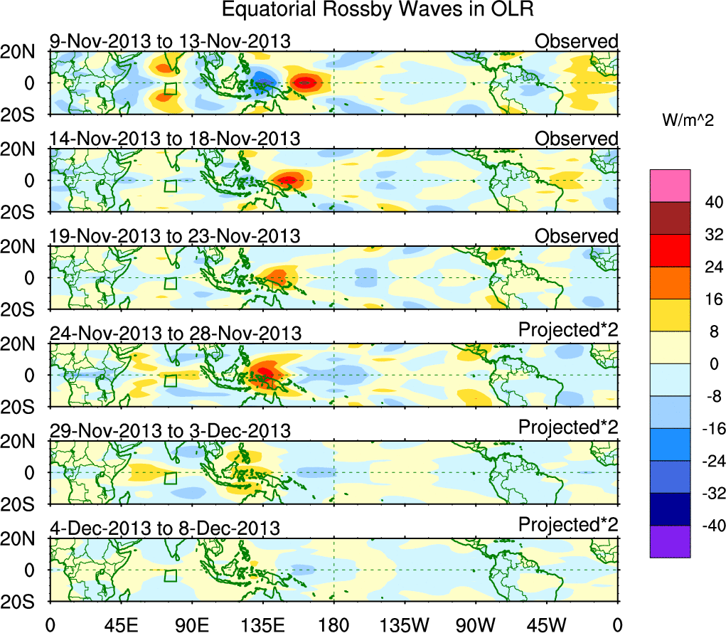 To identify tropical waves in near real-time, the OLR and UTWV data are filtered following Wheeler & Weickmann (2001 MWR). The daily anomalies are calculated using the first 3 harmonics of the seasonal cycle for 1979–2009. Missing values are then filled using linear interpolation in space and time. The most recent 365 days of anomalies are padded with 659 days of zeroes, and the result is filtered for each wave type.