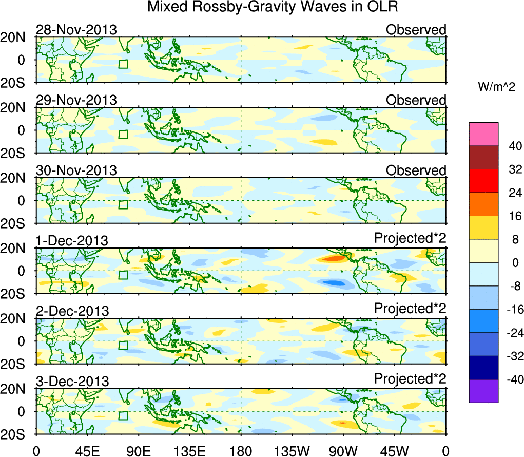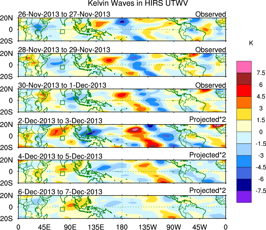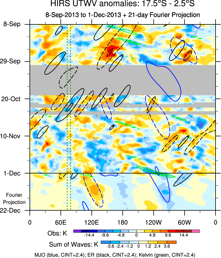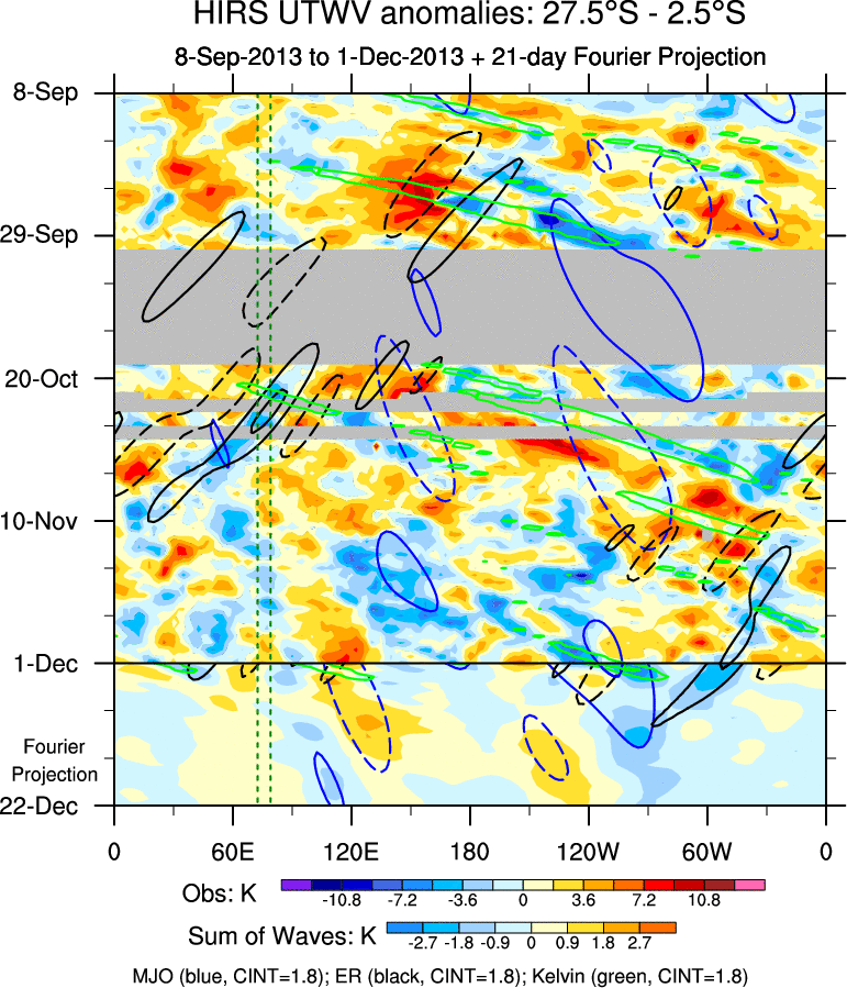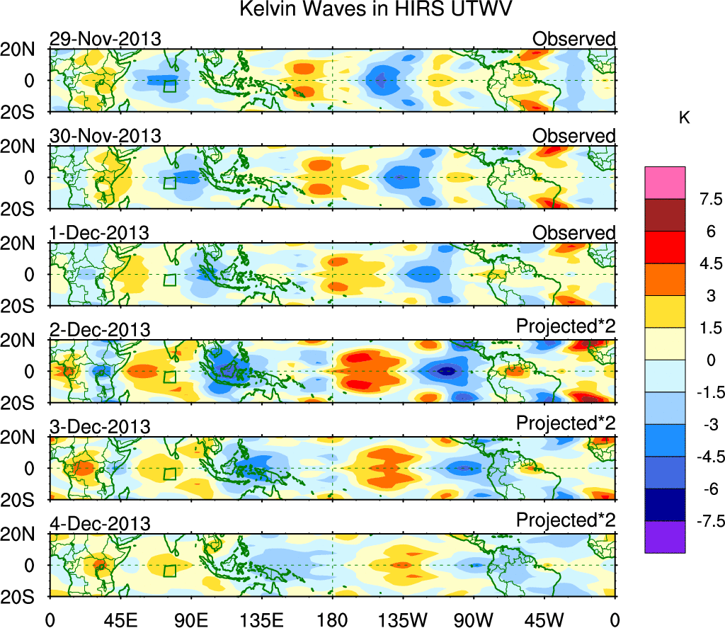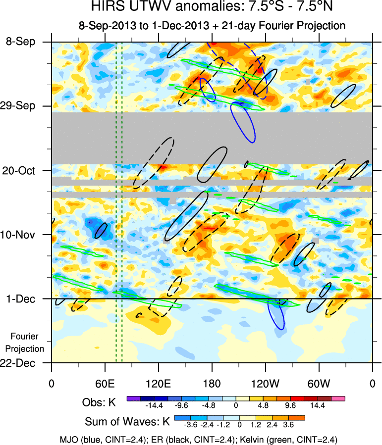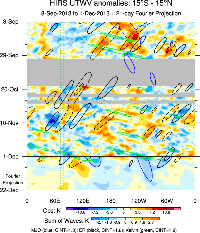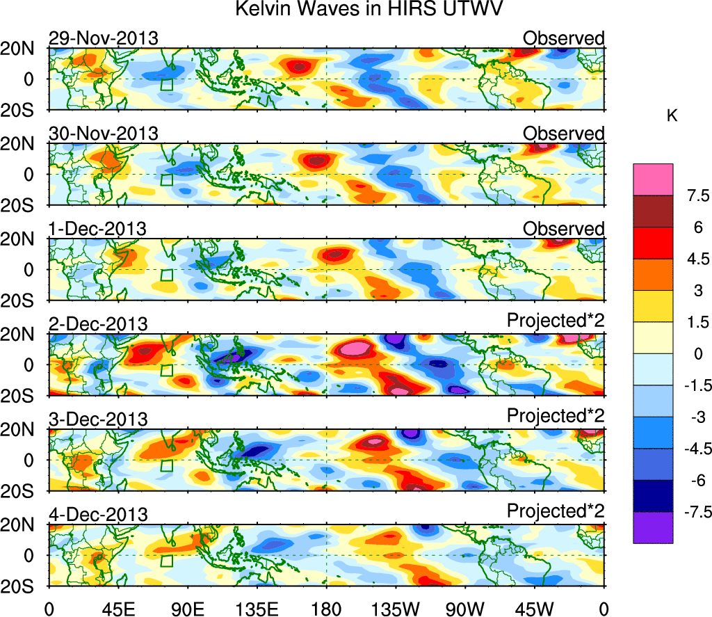 To identify tropical waves in near real-time, the OLR and UTWV data are filtered following Wheeler & Weickmann (2001 MWR). The daily anomalies are calculated using the first 3 harmonics of the seasonal cycle for 1979–2009. Missing values are then filled using linear interpolation in space and time. The most recent 365 days of anomalies are padded with 659 days of zeroes, and the result is filtered for each wave type.