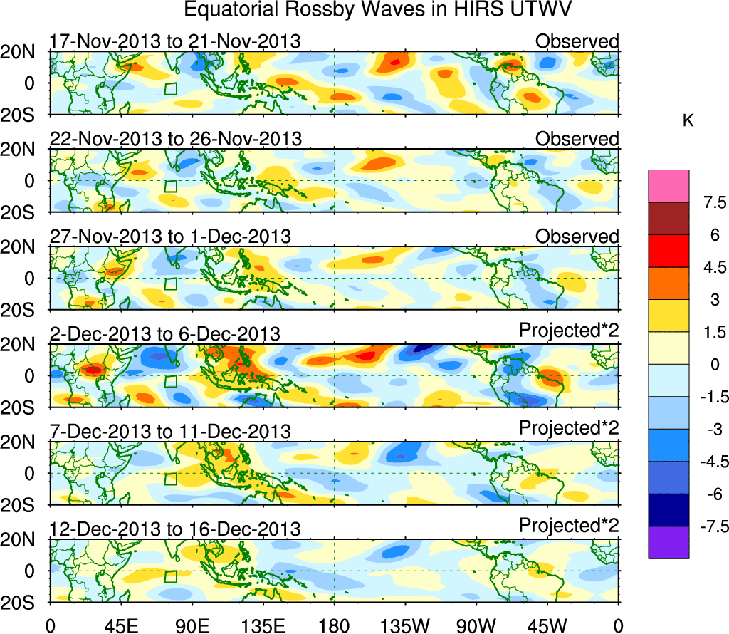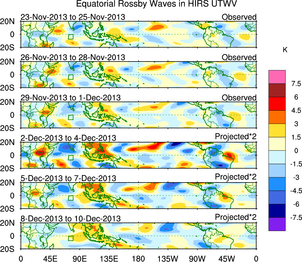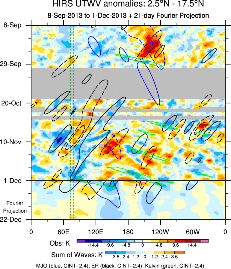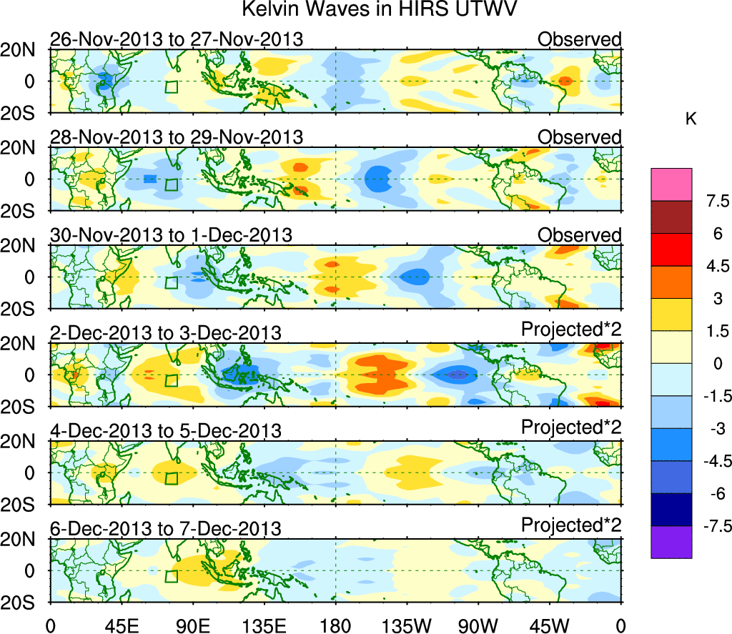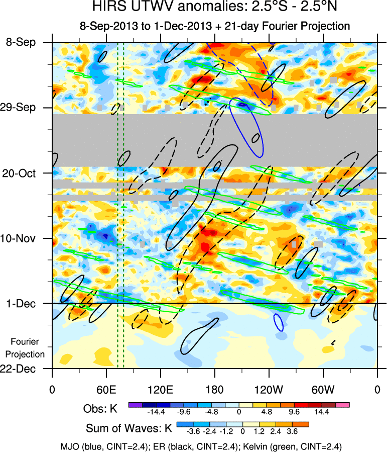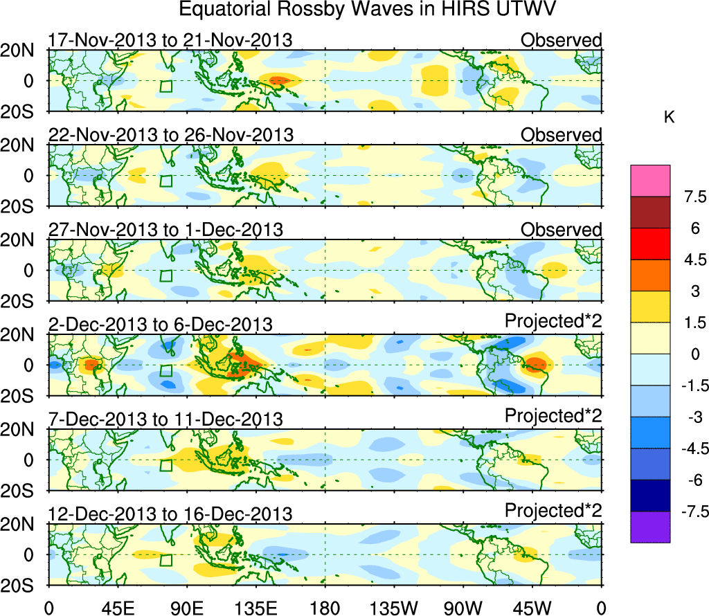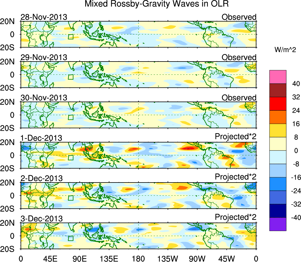 To identify tropical waves in near real-time, the OLR and UTWV data are filtered following Wheeler & Weickmann (2001 MWR). The daily anomalies are calculated using the first 3 harmonics of the seasonal cycle for 1979–2009. Missing values are then filled using linear interpolation in space and time. The most recent 365 days of anomalies are padded with 659 days of zeroes, and the result is filtered for each wave type.