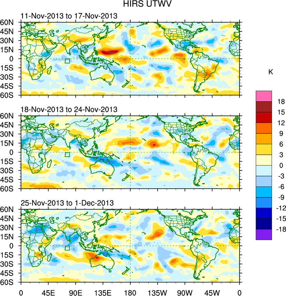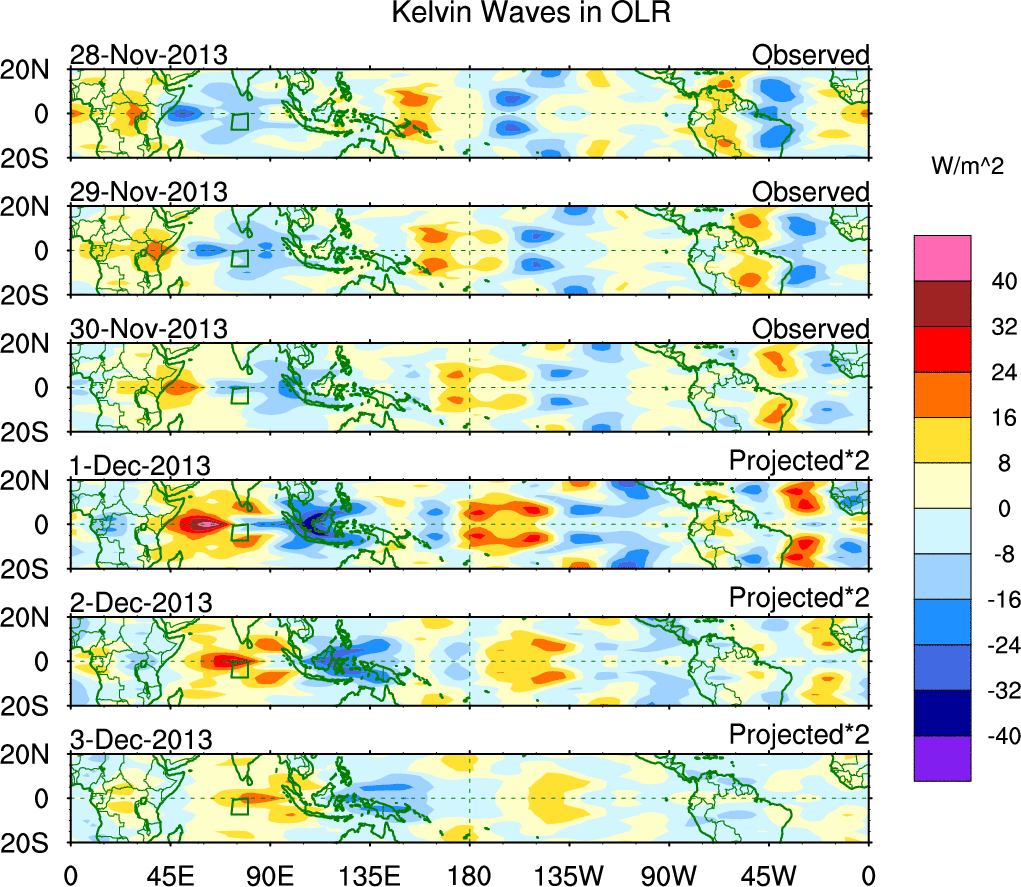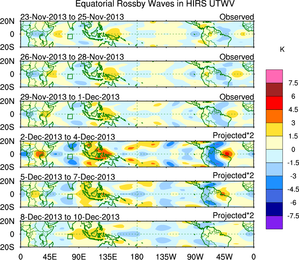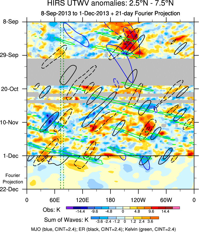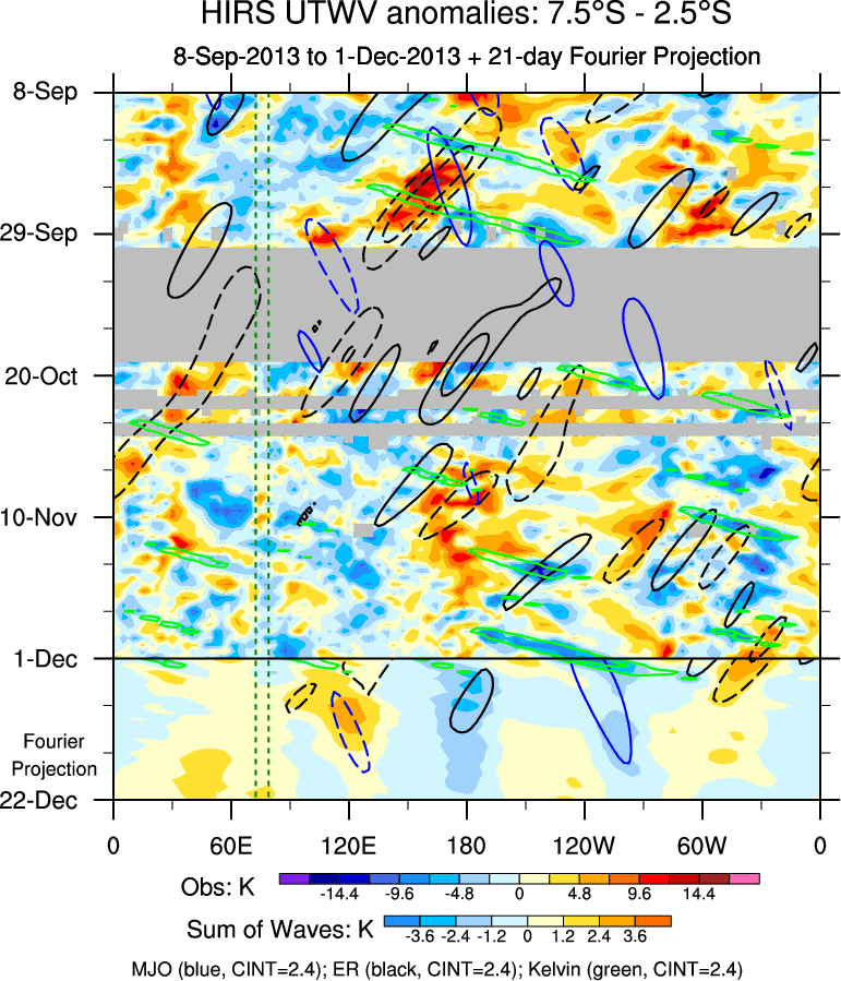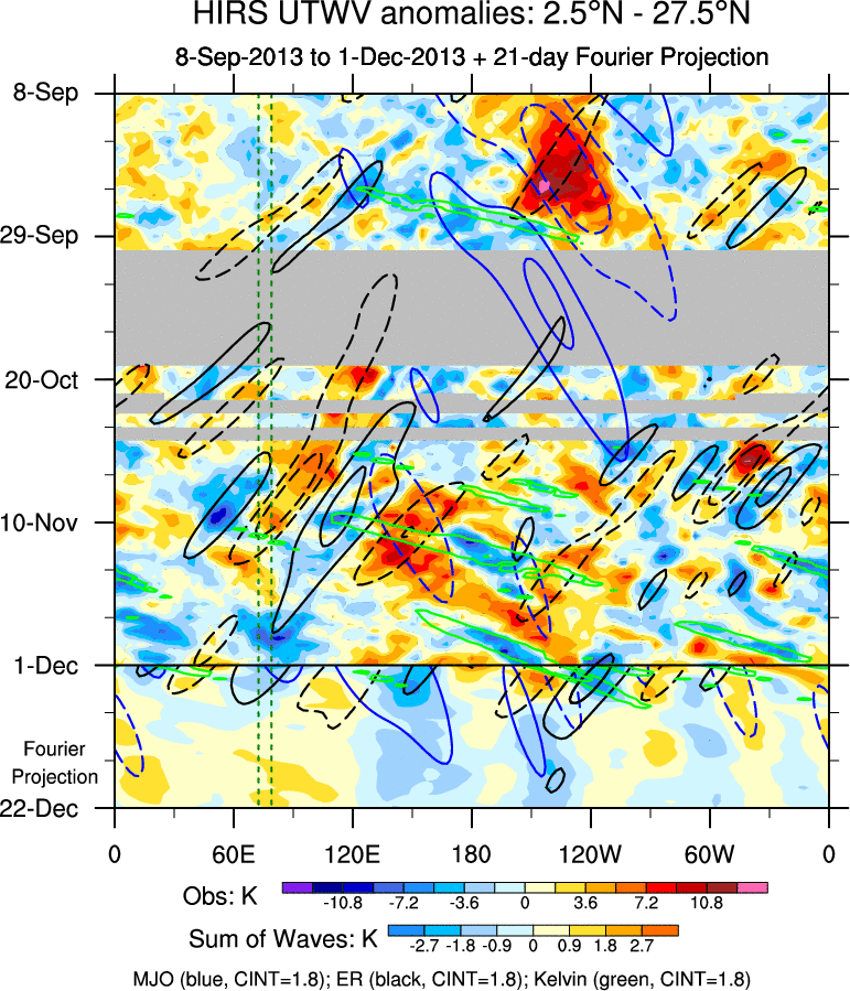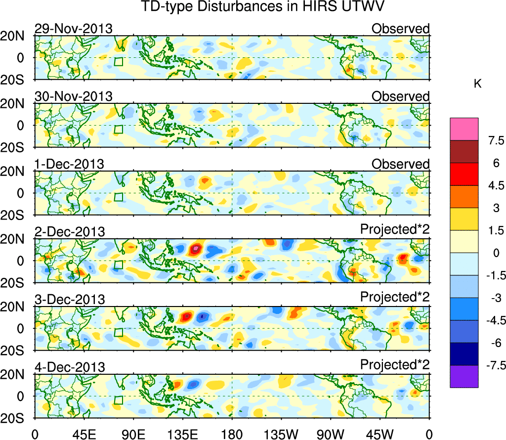 To identify tropical waves in near real-time, the OLR and UTWV data are filtered following Wheeler & Weickmann (2001 MWR). The daily anomalies are calculated using the first 3 harmonics of the seasonal cycle for 1979–2009. Missing values are then filled using linear interpolation in space and time. The most recent 365 days of anomalies are padded with 659 days of zeroes, and the result is filtered for each wave type.