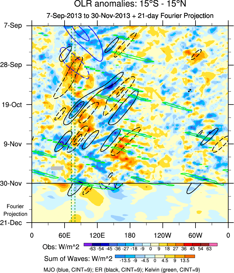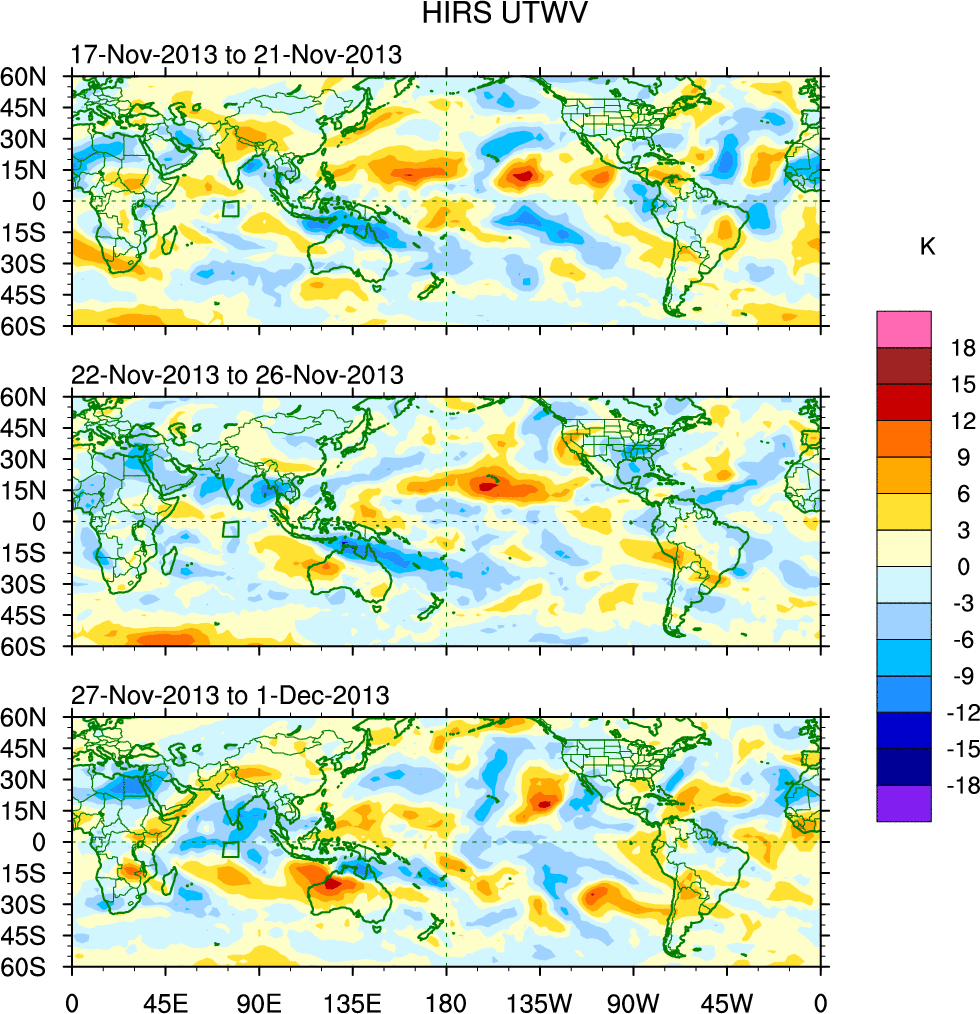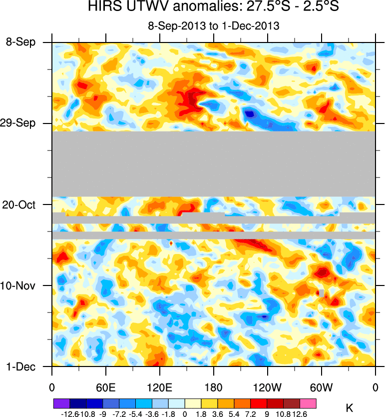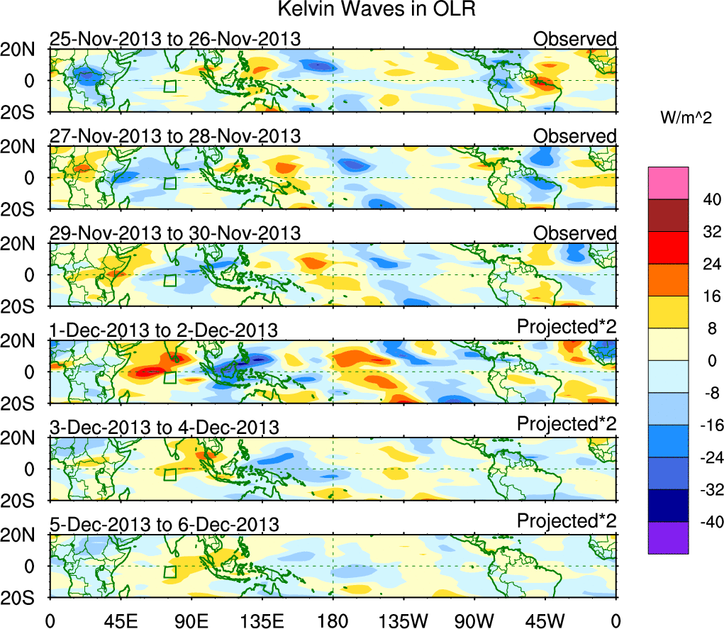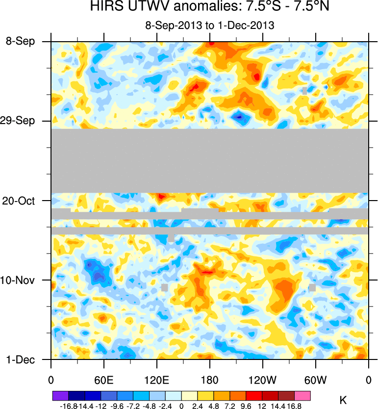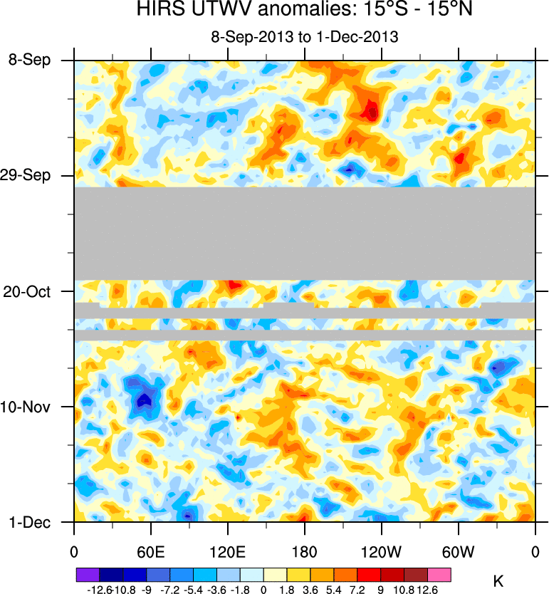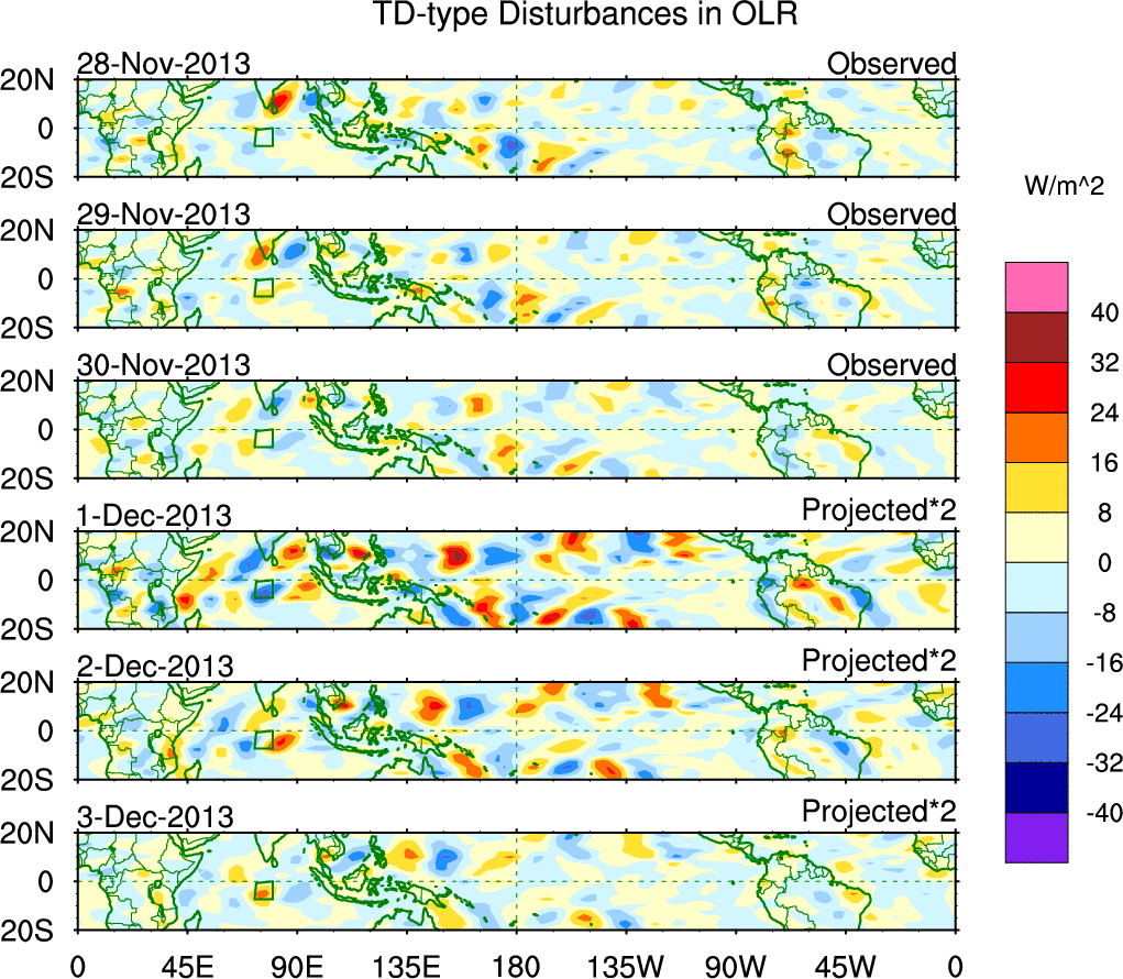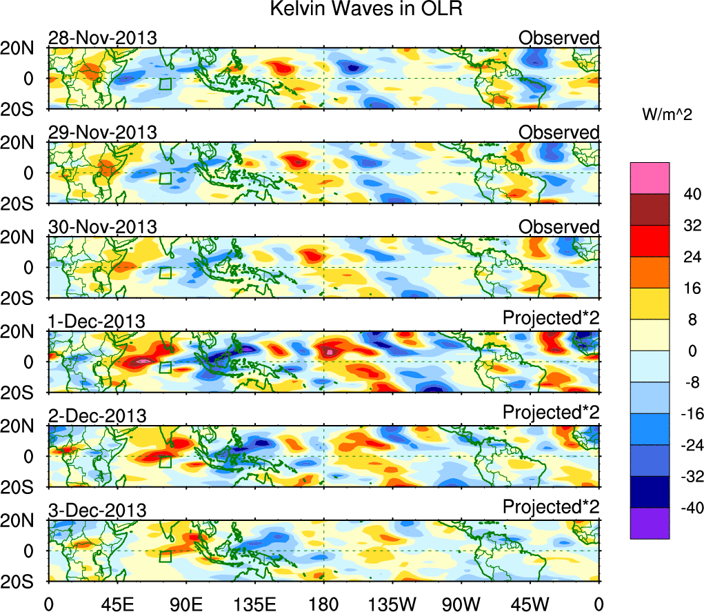 To identify tropical waves in near real-time, the OLR and UTWV data are filtered following Wheeler & Weickmann (2001 MWR). The daily anomalies are calculated using the first 3 harmonics of the seasonal cycle for 1979–2009. Missing values are then filled using linear interpolation in space and time. The most recent 365 days of anomalies are padded with 659 days of zeroes, and the result is filtered for each wave type.
