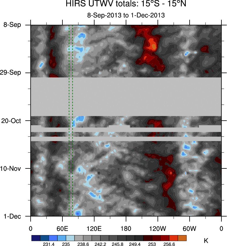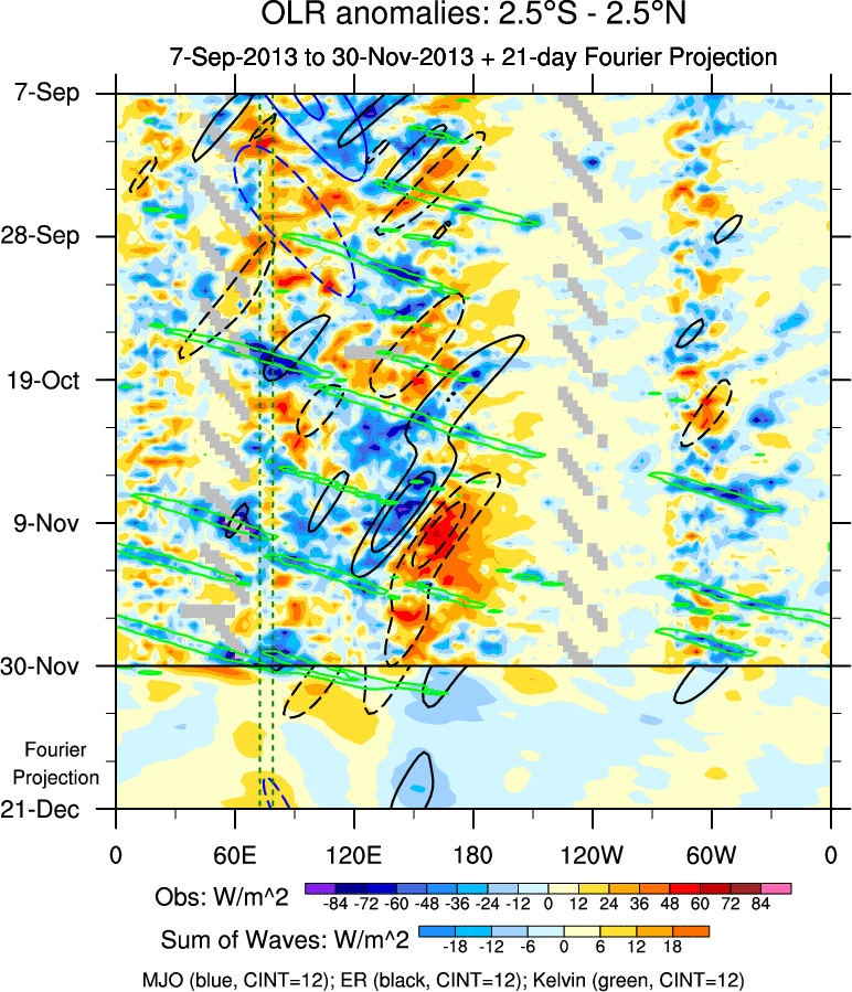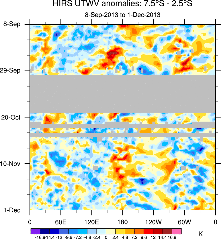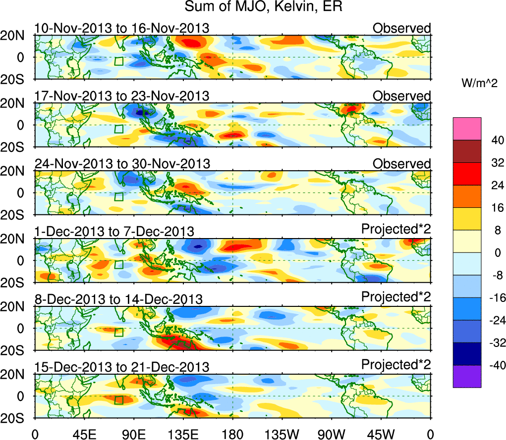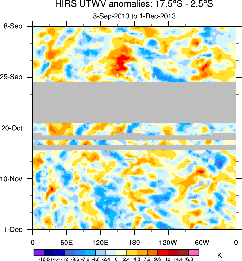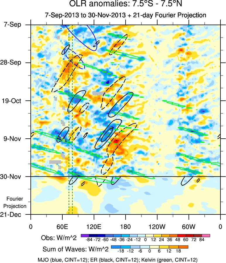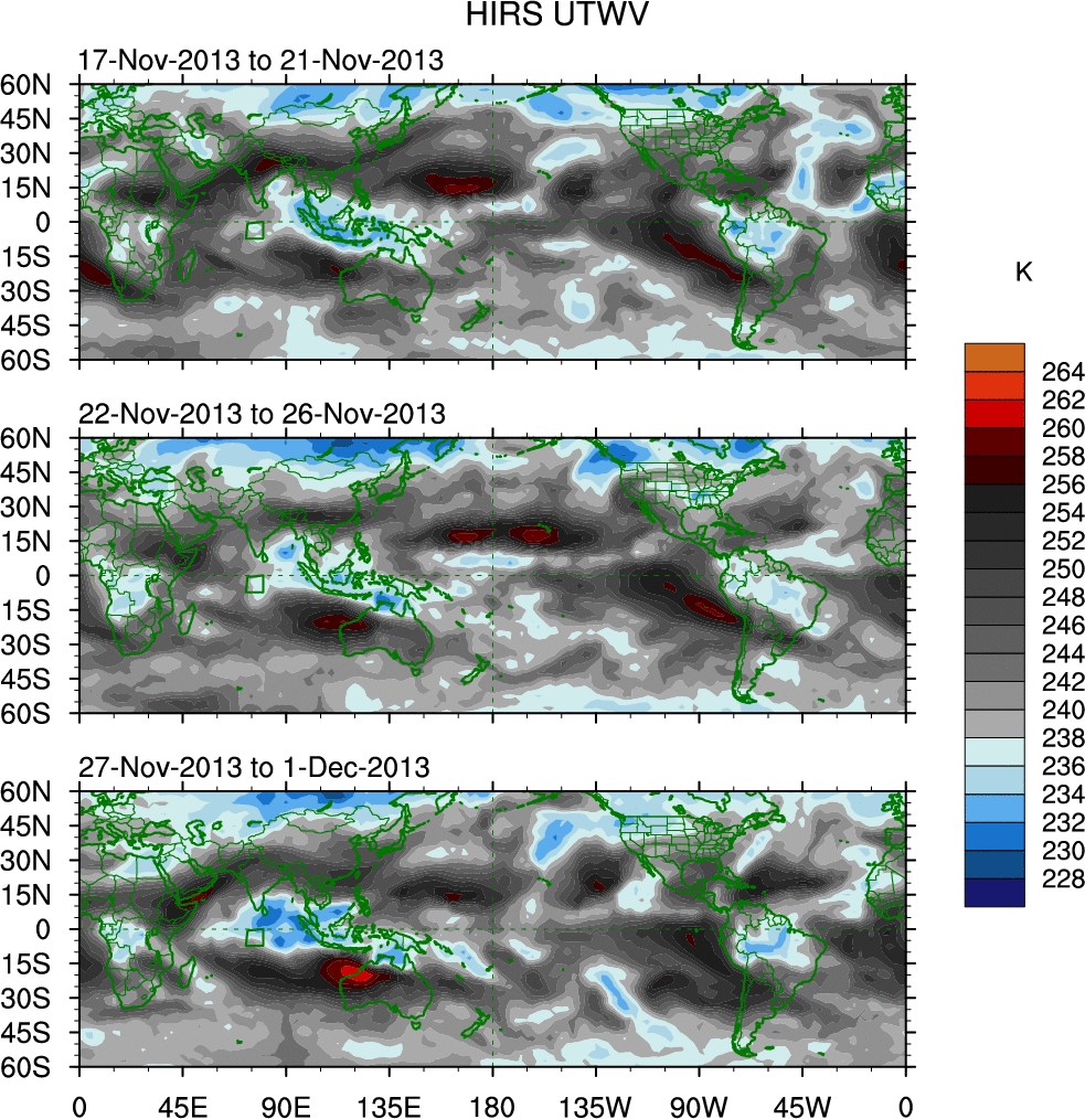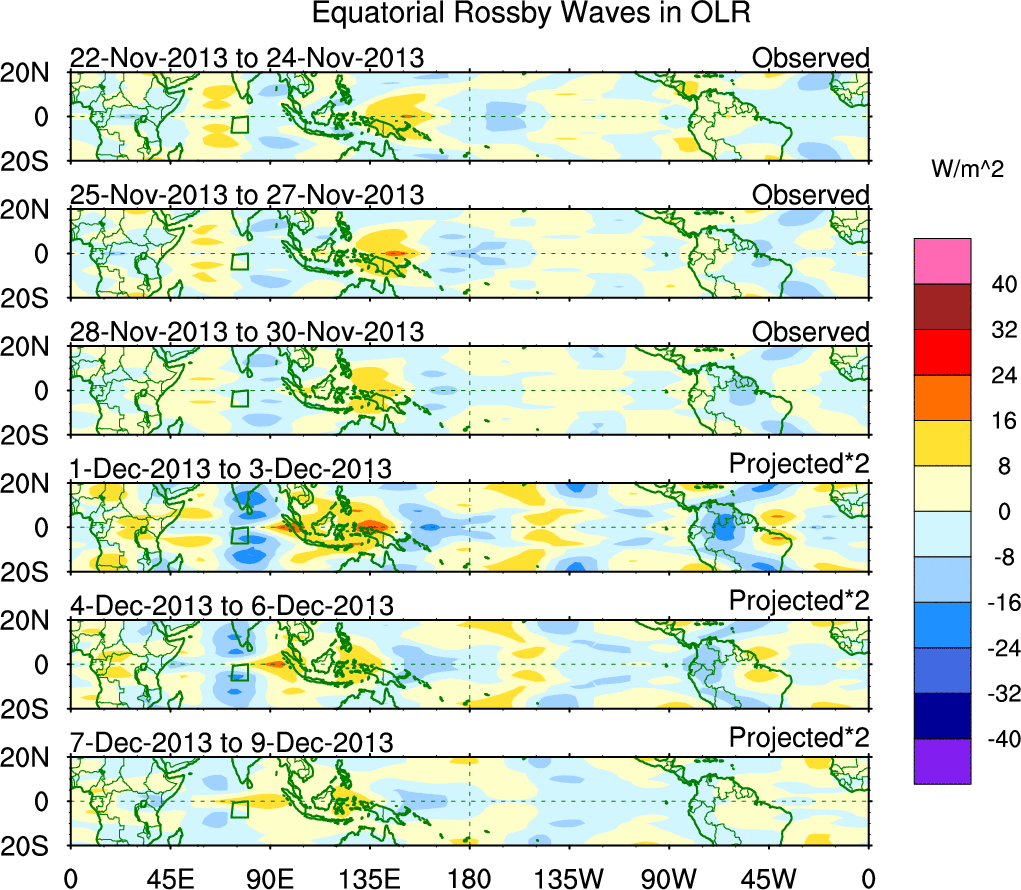 To identify tropical waves in near real-time, the OLR and UTWV data are filtered following Wheeler & Weickmann (2001 MWR). The daily anomalies are calculated using the first 3 harmonics of the seasonal cycle for 1979–2009. Missing values are then filled using linear interpolation in space and time. The most recent 365 days of anomalies are padded with 659 days of zeroes, and the result is filtered for each wave type.