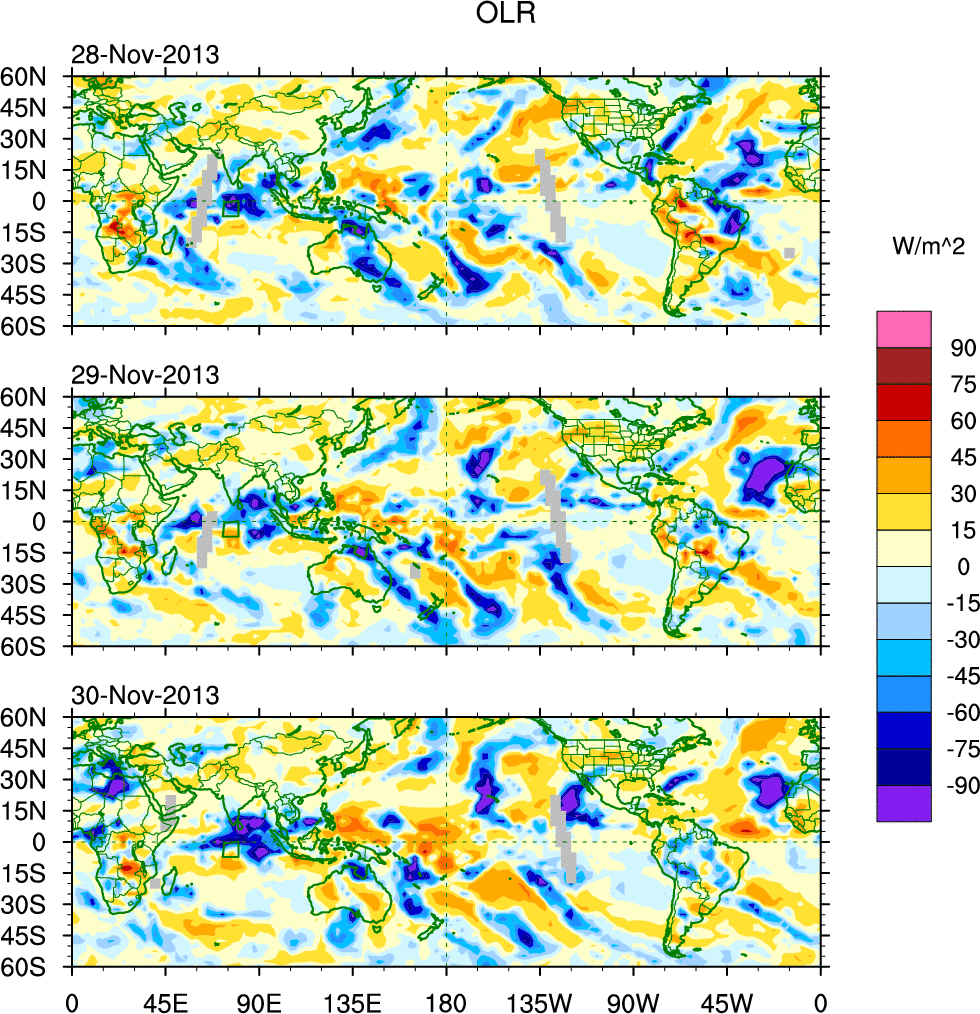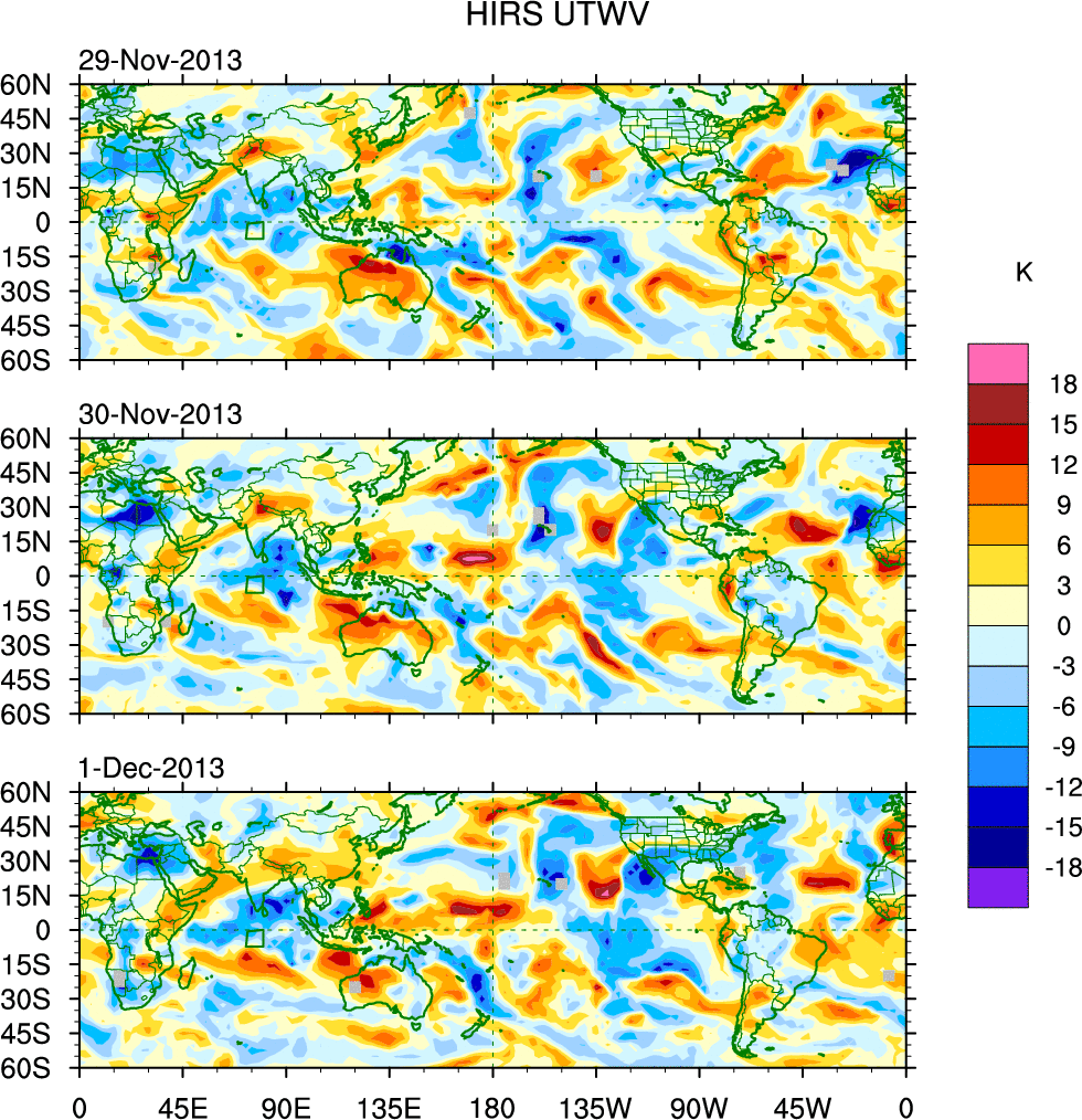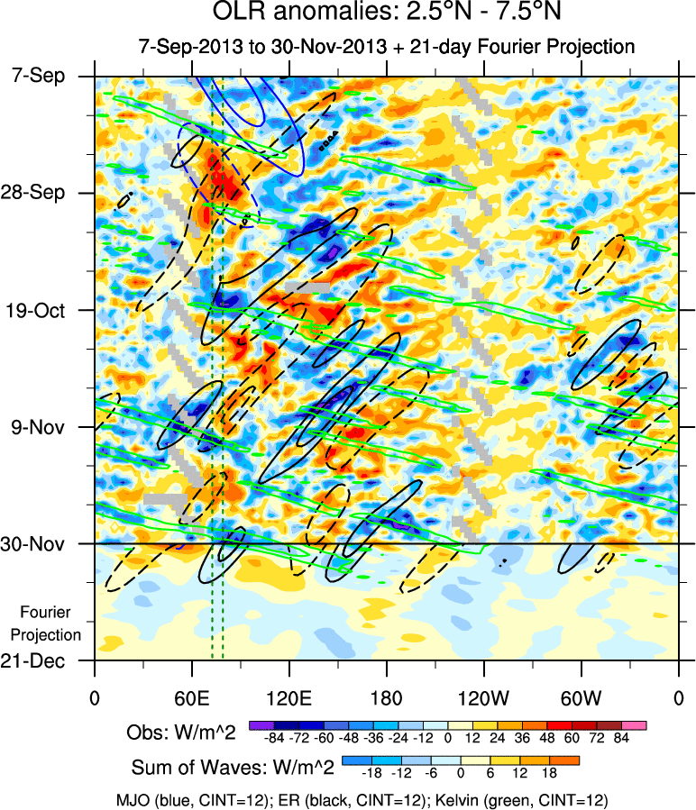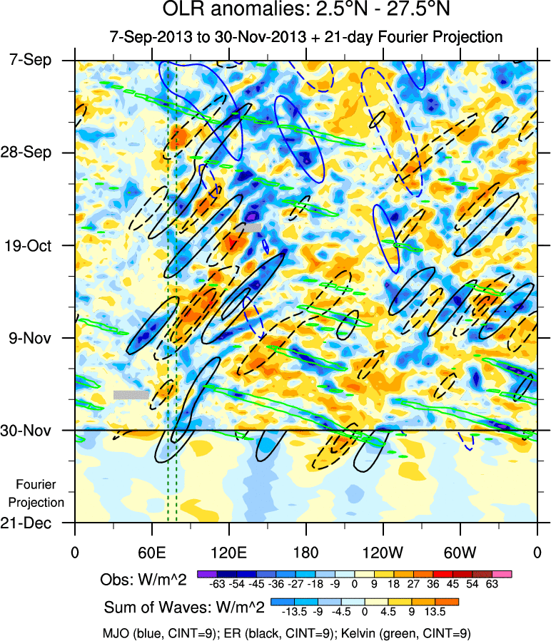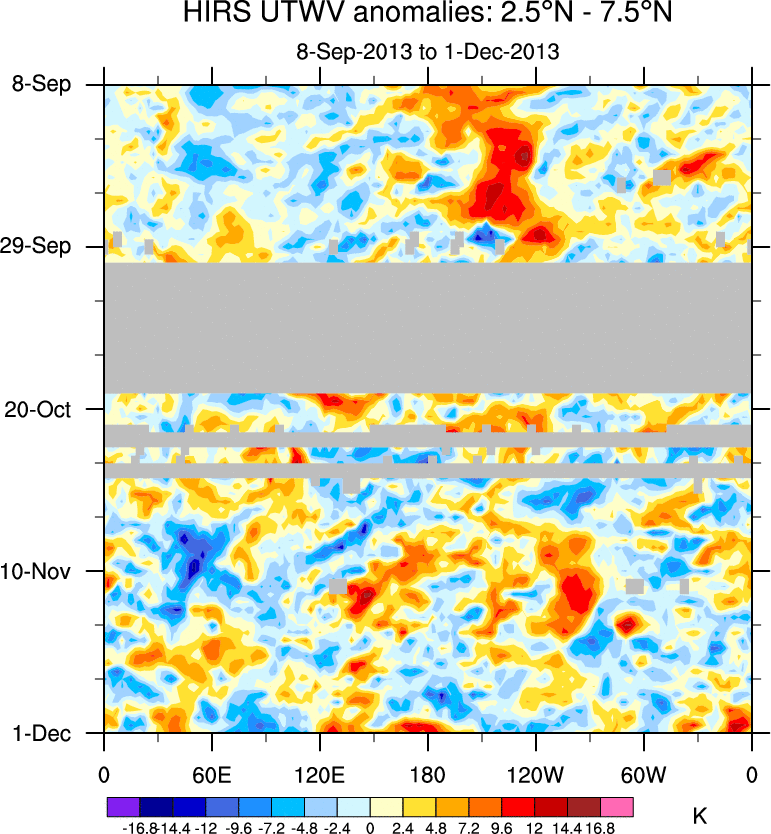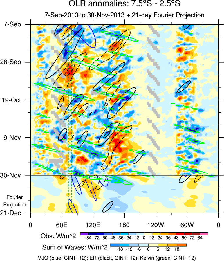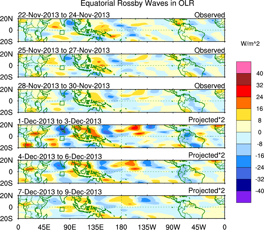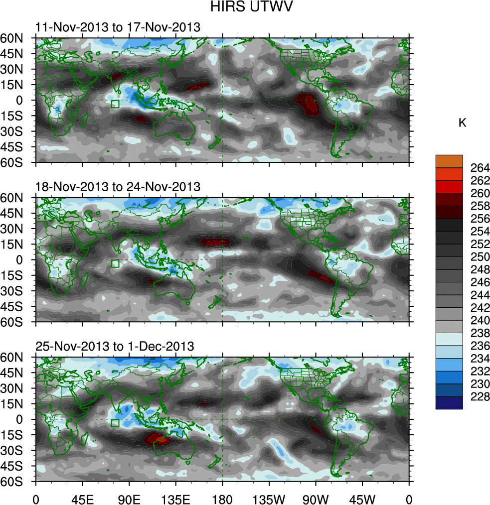 To identify tropical waves in near real-time, the OLR and UTWV data are filtered following Wheeler & Weickmann (2001 MWR). The daily anomalies are calculated using the first 3 harmonics of the seasonal cycle for 1979–2009. Missing values are then filled using linear interpolation in space and time. The most recent 365 days of anomalies are padded with 659 days of zeroes, and the result is filtered for each wave type.