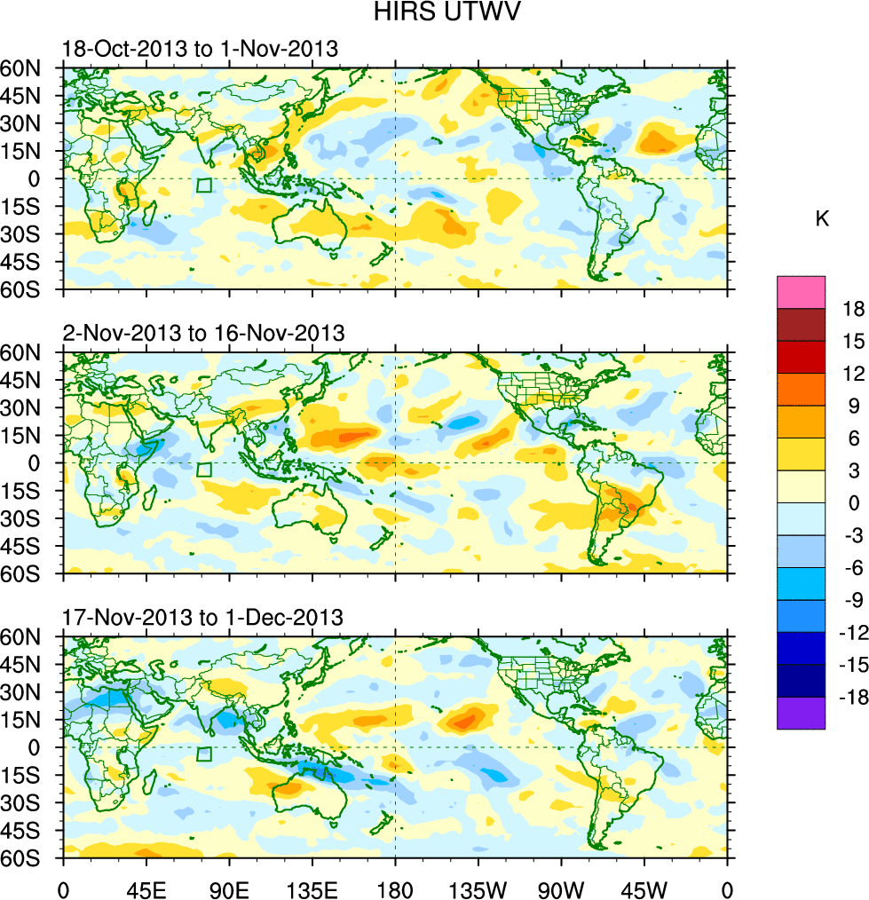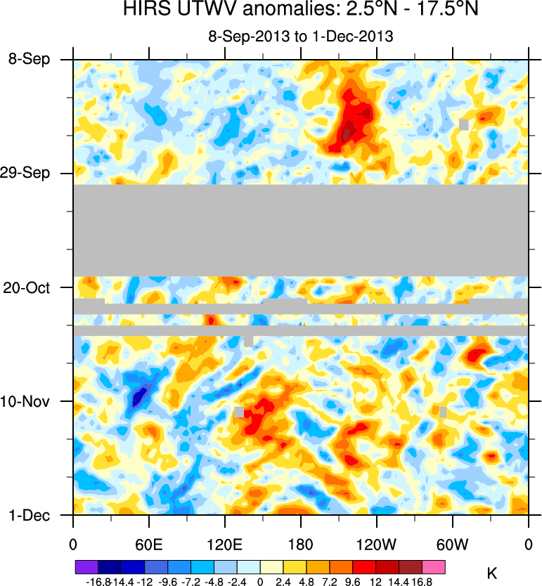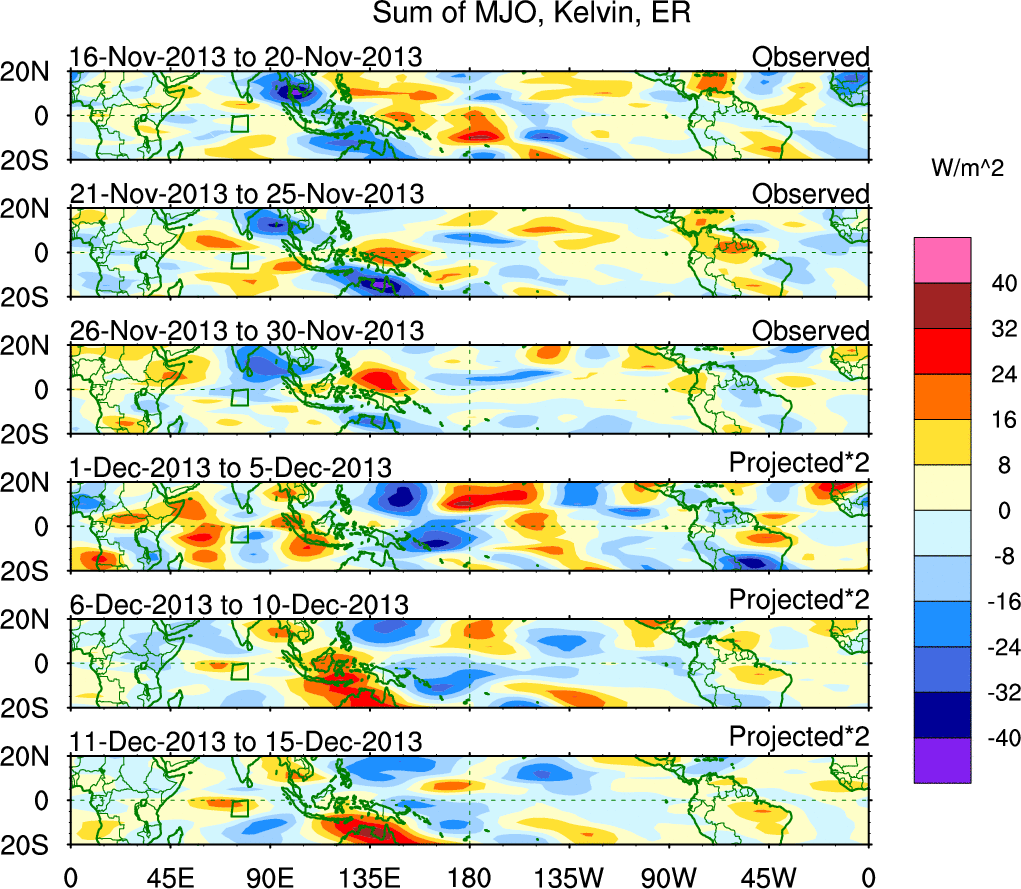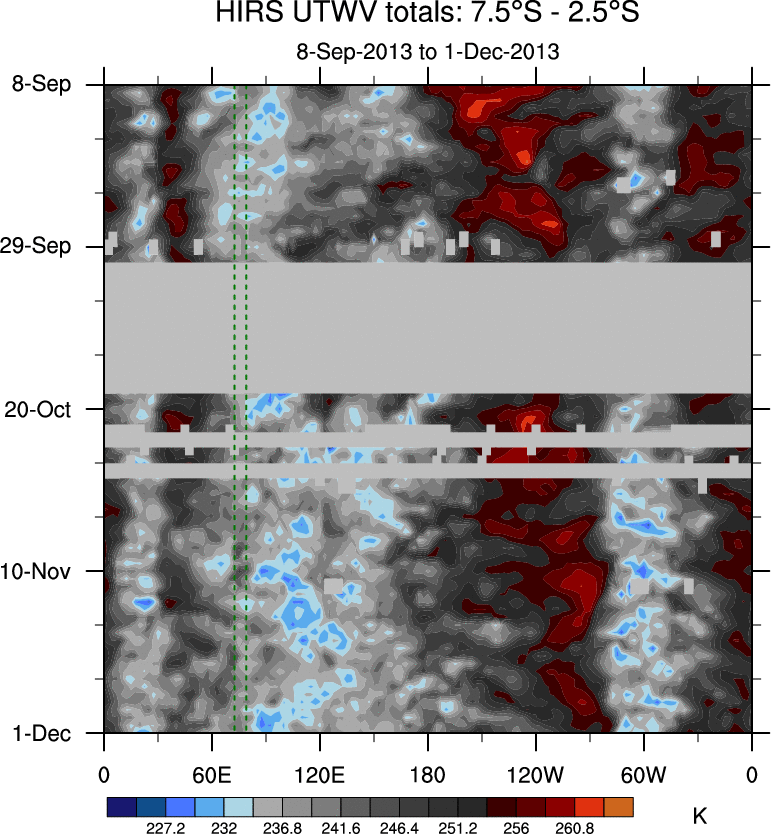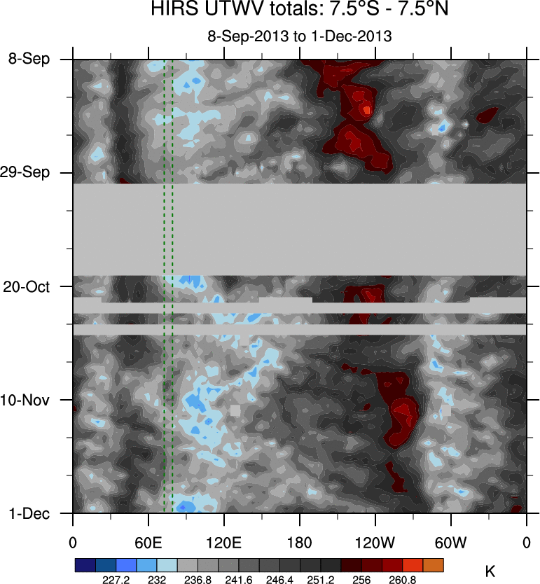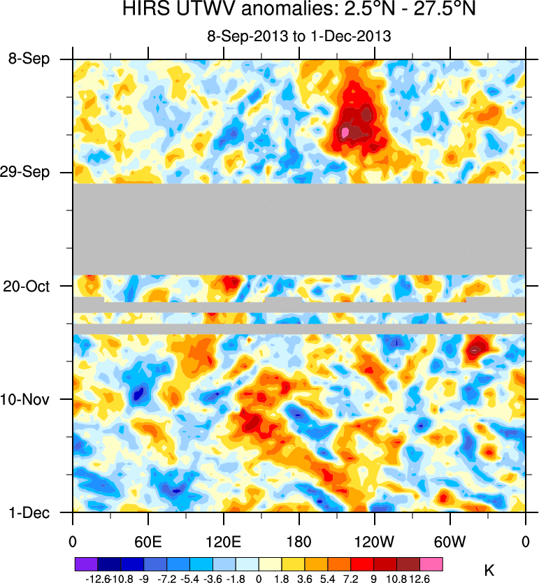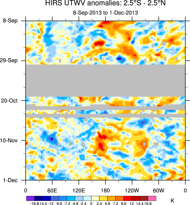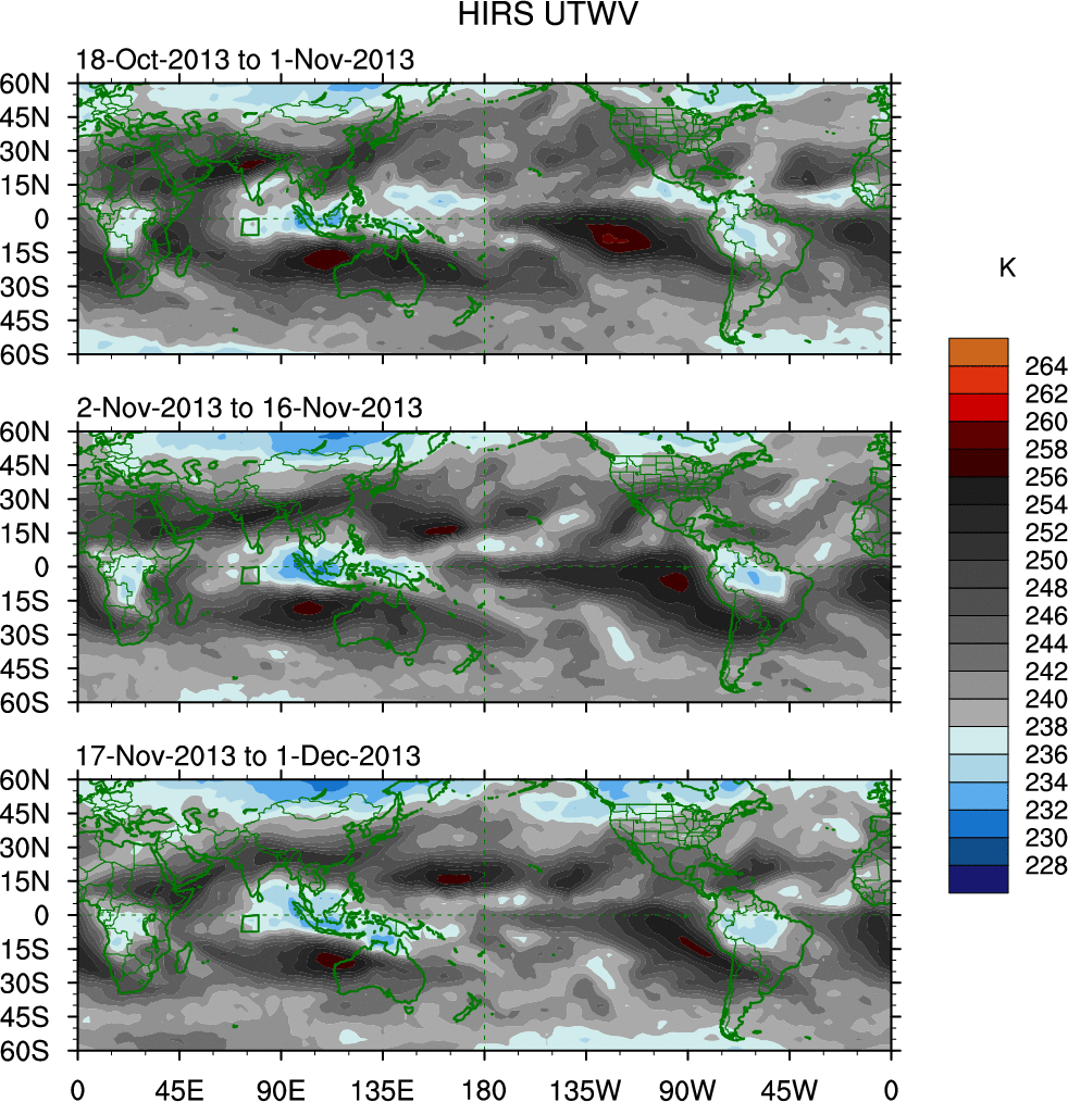 To identify tropical waves in near real-time, the OLR and UTWV data are filtered following Wheeler & Weickmann (2001 MWR). The daily anomalies are calculated using the first 3 harmonics of the seasonal cycle for 1979–2009. Missing values are then filled using linear interpolation in space and time. The most recent 365 days of anomalies are padded with 659 days of zeroes, and the result is filtered for each wave type.