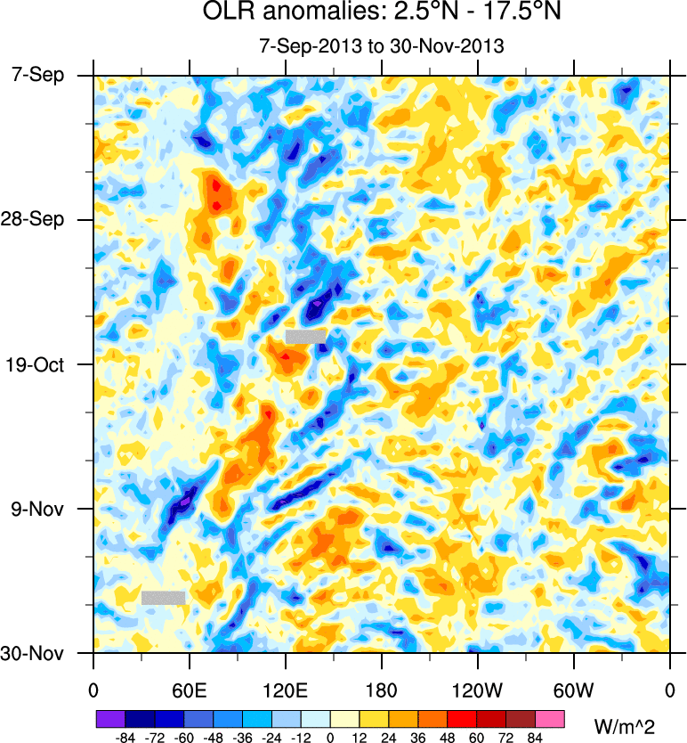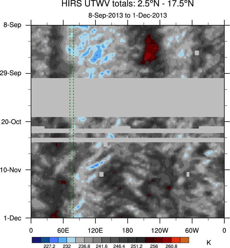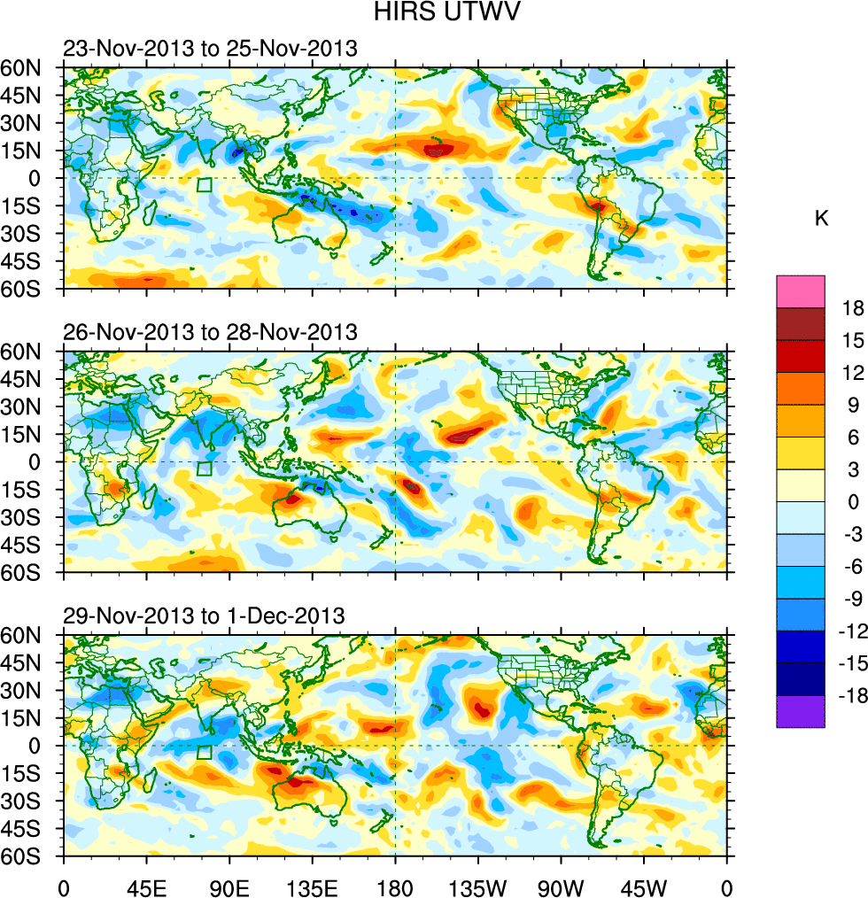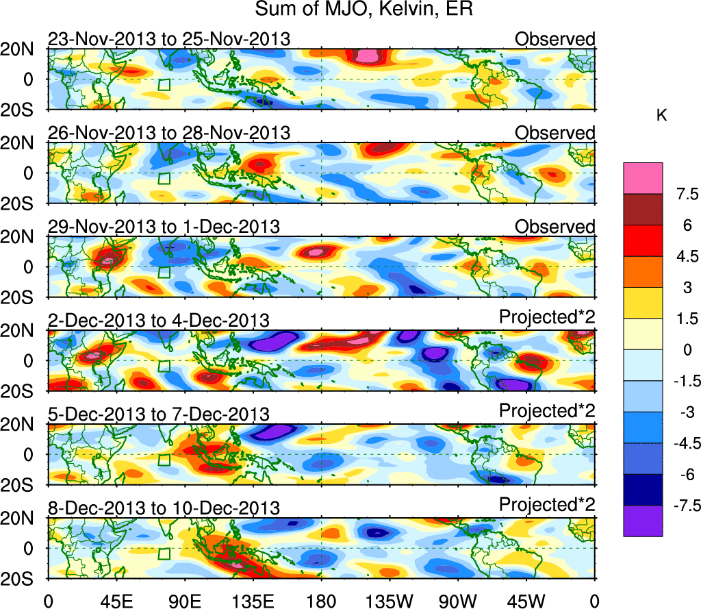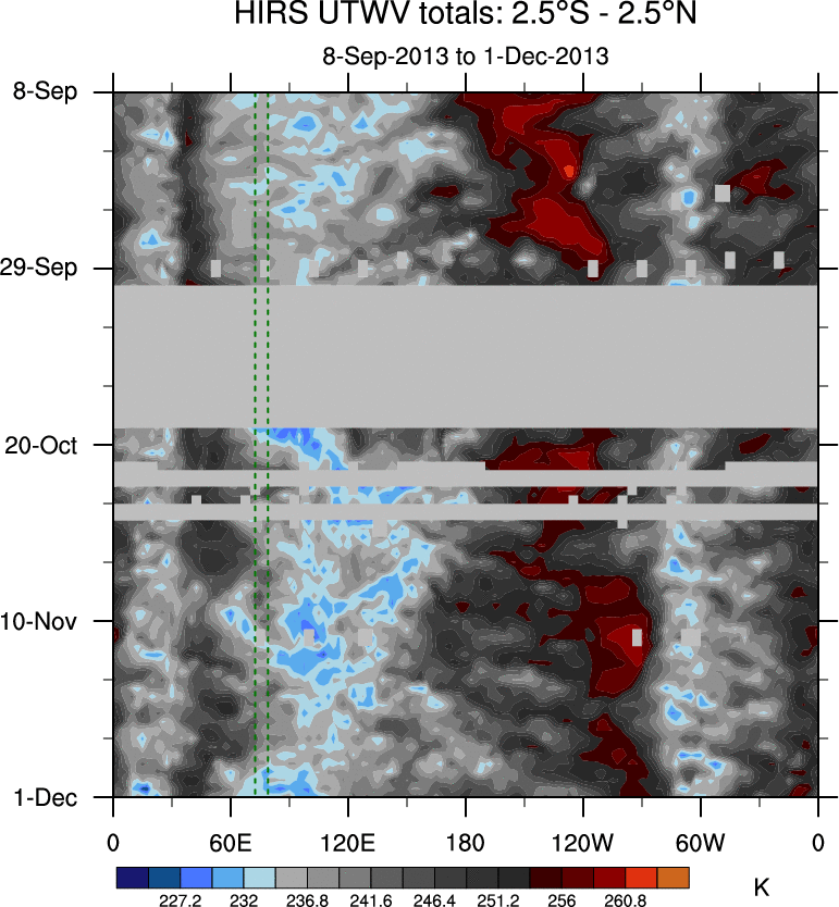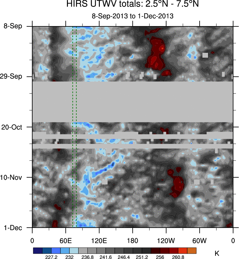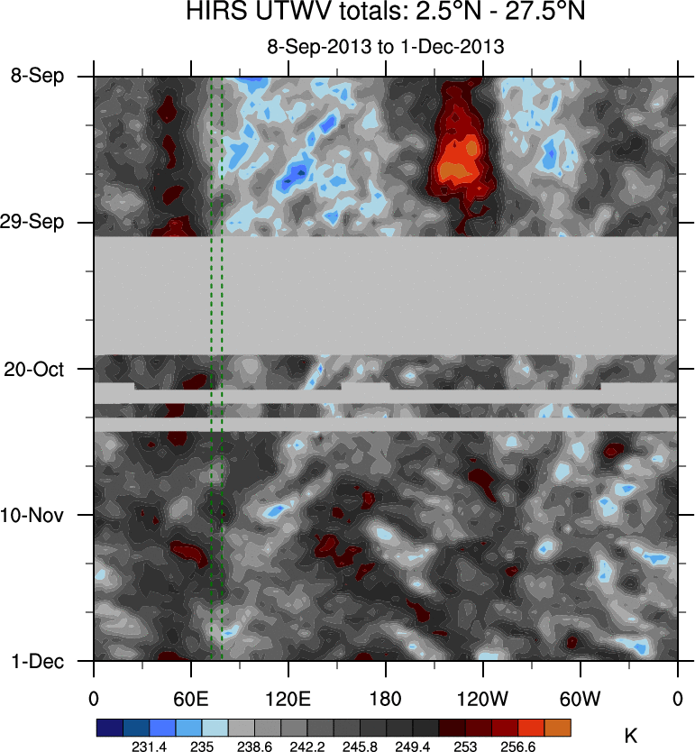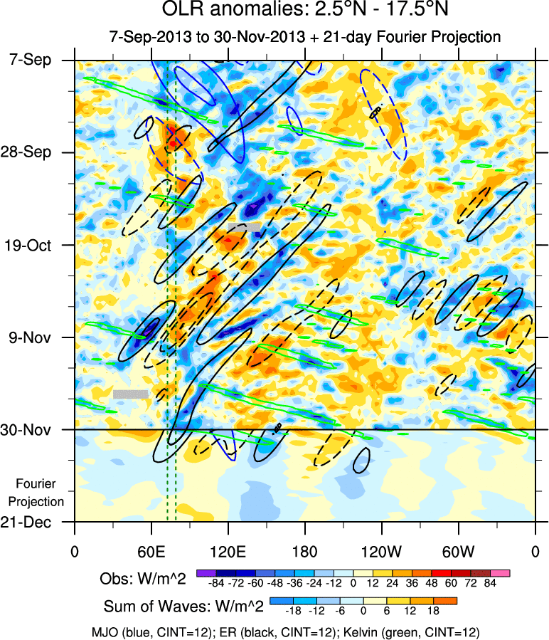 To identify tropical waves in near real-time, the OLR and UTWV data are filtered following Wheeler & Weickmann (2001 MWR). The daily anomalies are calculated using the first 3 harmonics of the seasonal cycle for 1979–2009. Missing values are then filled using linear interpolation in space and time. The most recent 365 days of anomalies are padded with 659 days of zeroes, and the result is filtered for each wave type.