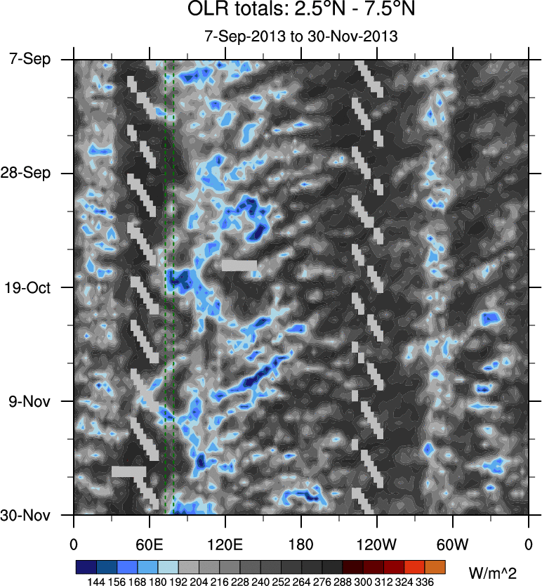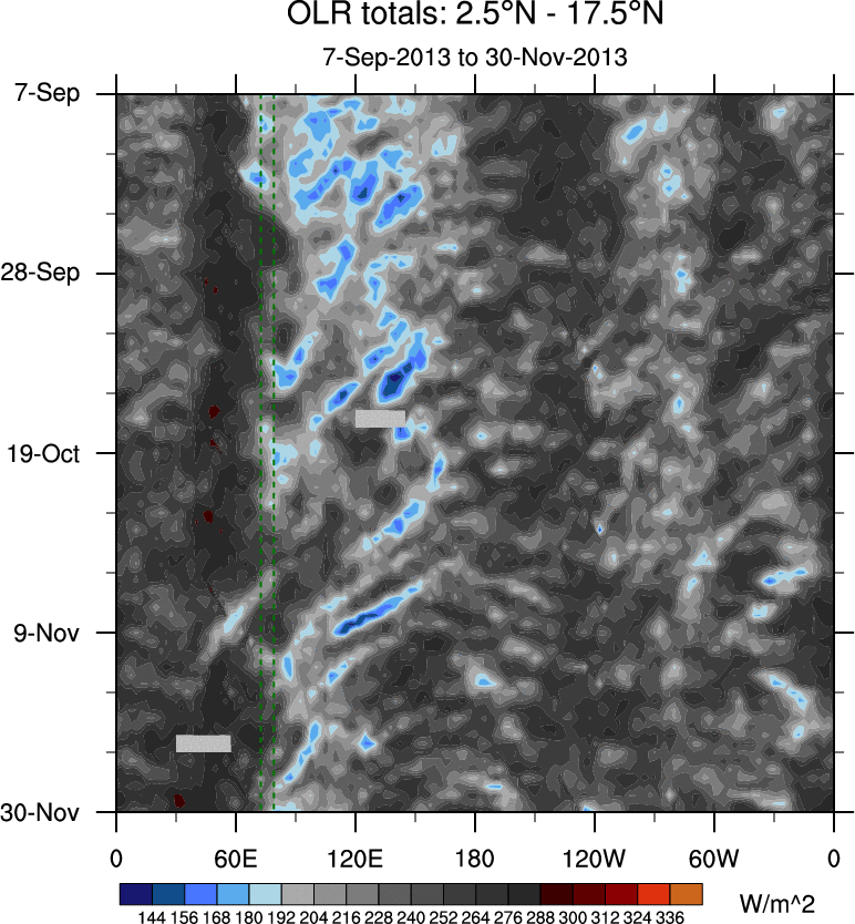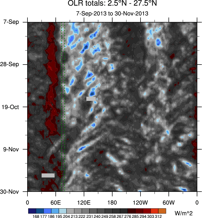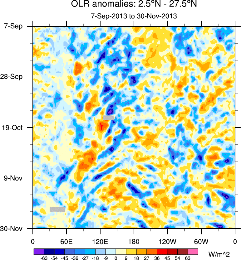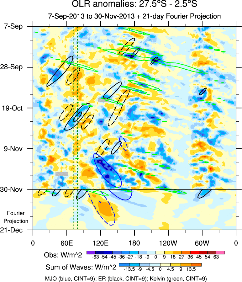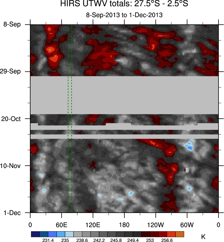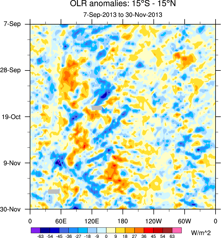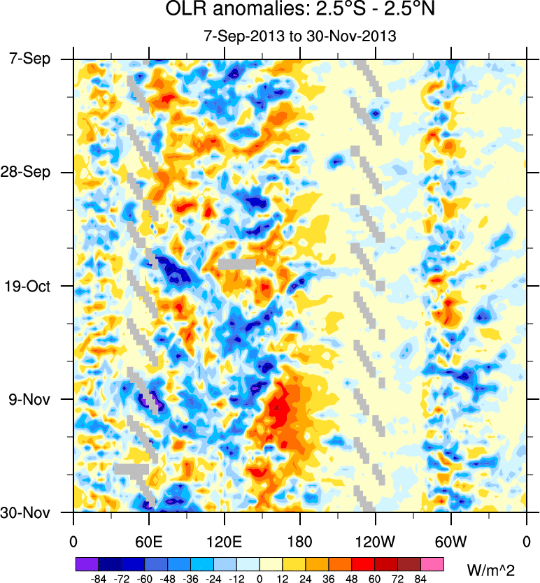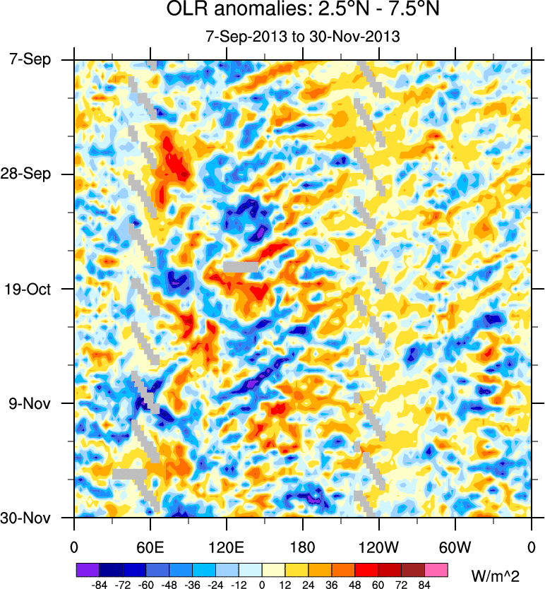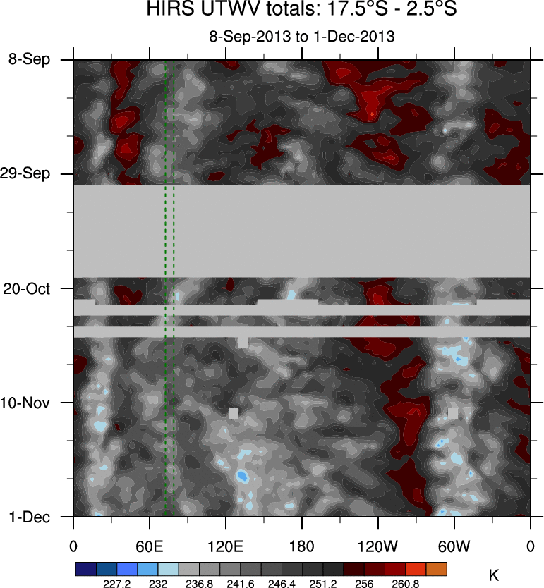 To identify tropical waves in near real-time, the OLR and UTWV data are filtered following Wheeler & Weickmann (2001 MWR). The daily anomalies are calculated using the first 3 harmonics of the seasonal cycle for 1979–2009. Missing values are then filled using linear interpolation in space and time. The most recent 365 days of anomalies are padded with 659 days of zeroes, and the result is filtered for each wave type.