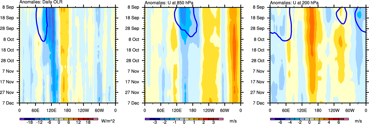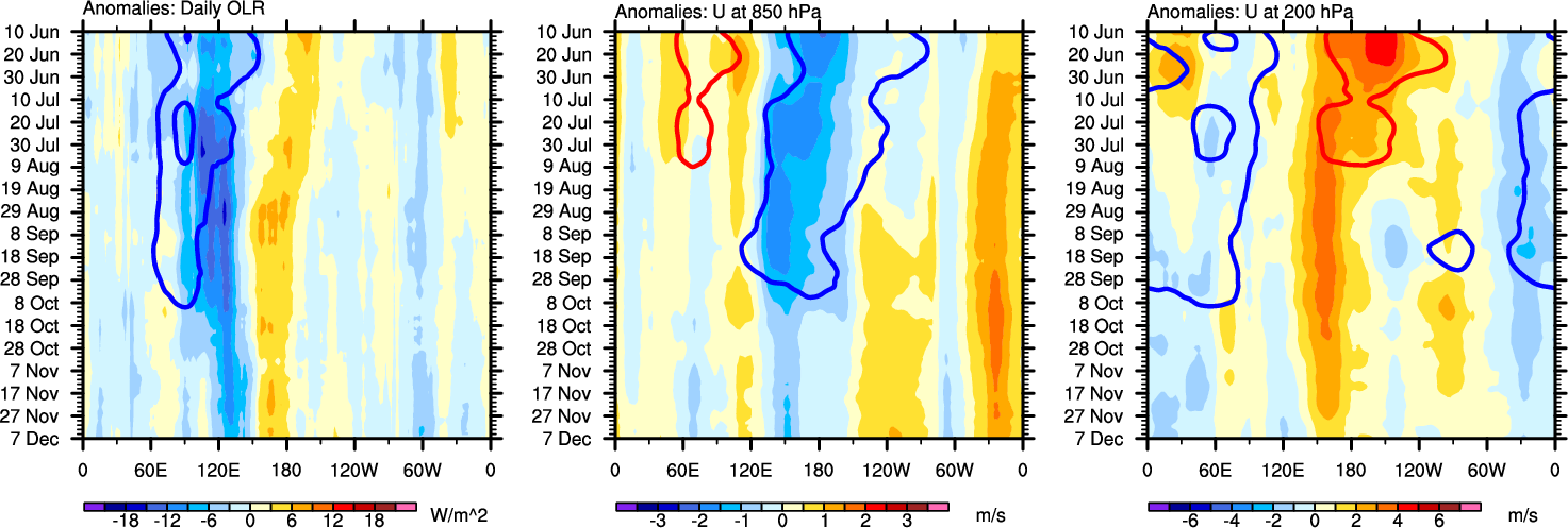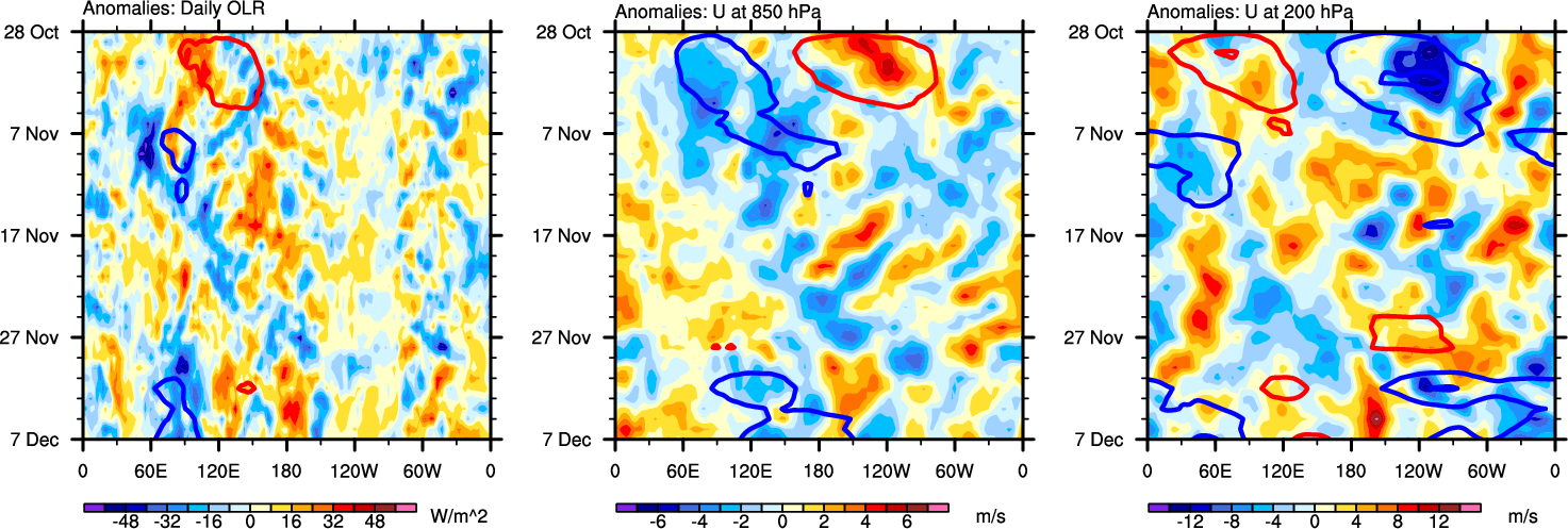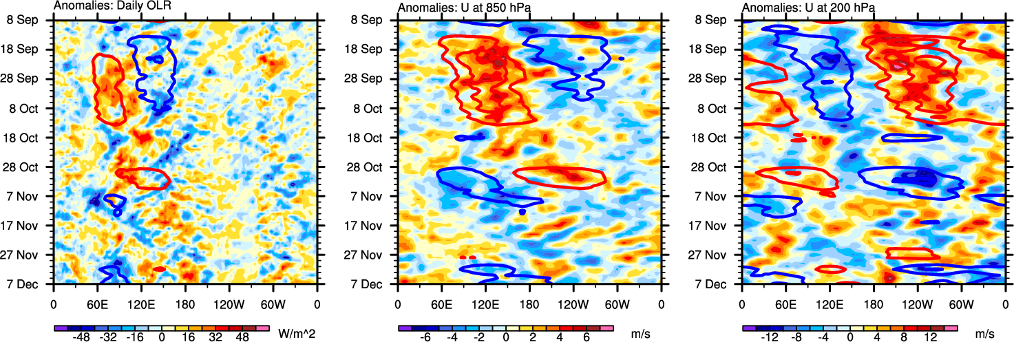 The Hovmollers show longitude-time plots for OLR, U-850, and U-200. The shading indicates the observed anomalies, while the contours are the projection of those anomalies onto the RMM EOFs.