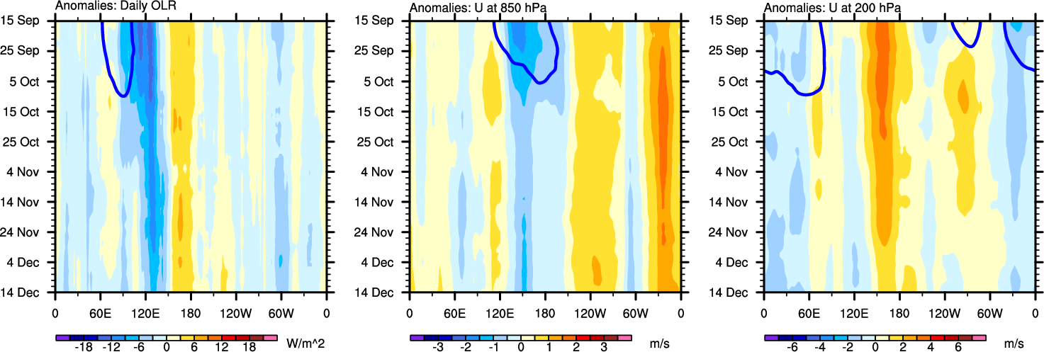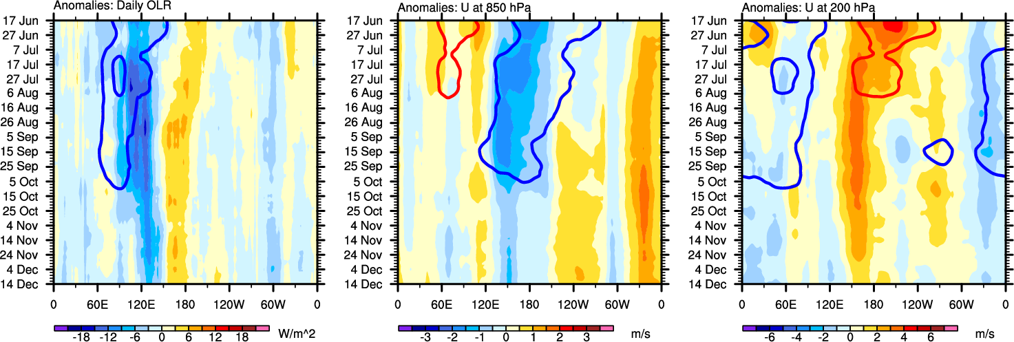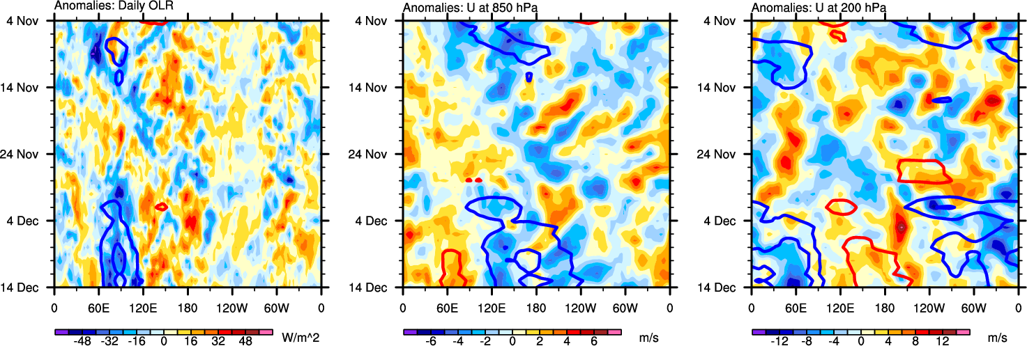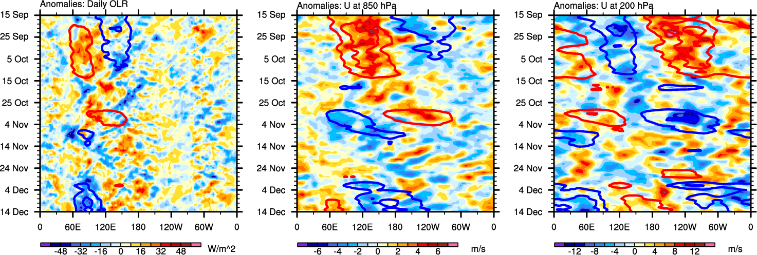 The Hovmollers show longitude-time plots for OLR, U-850, and U-200. The shading indicates the observed anomalies, while the contours are the projection of those anomalies onto the RMM EOFs.
