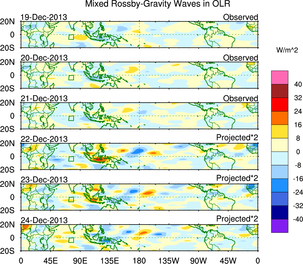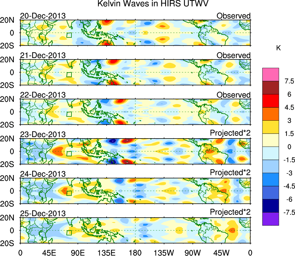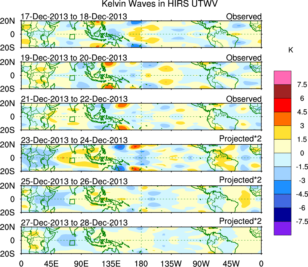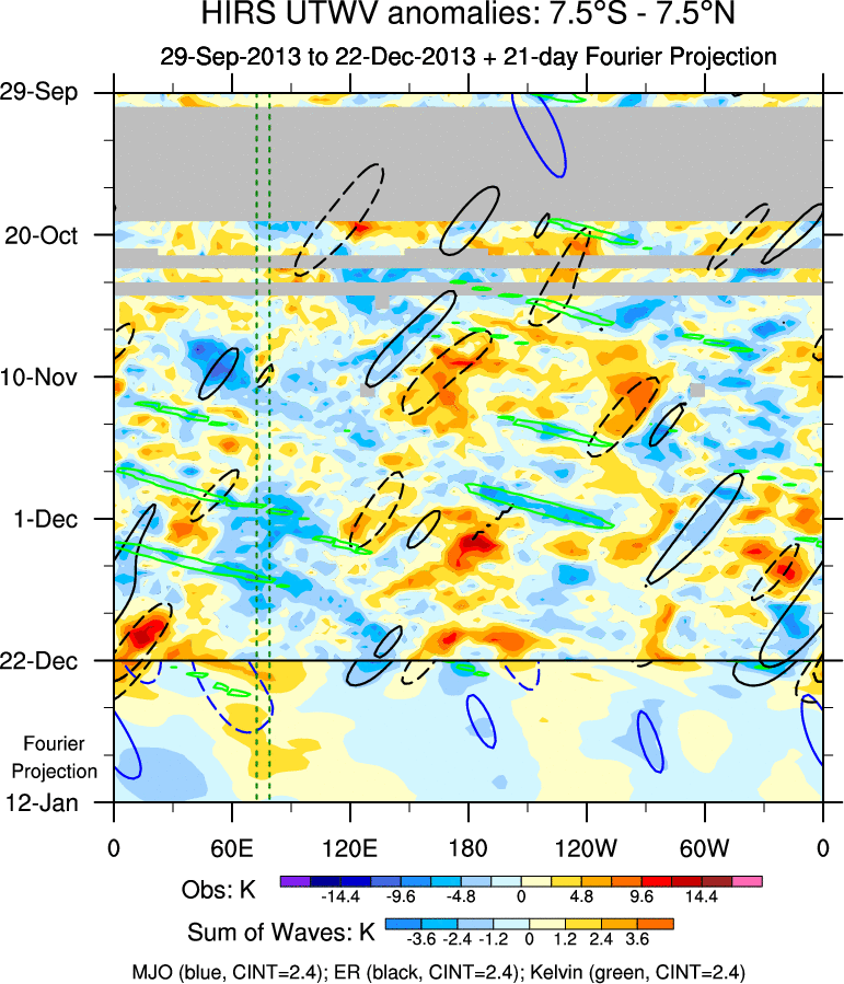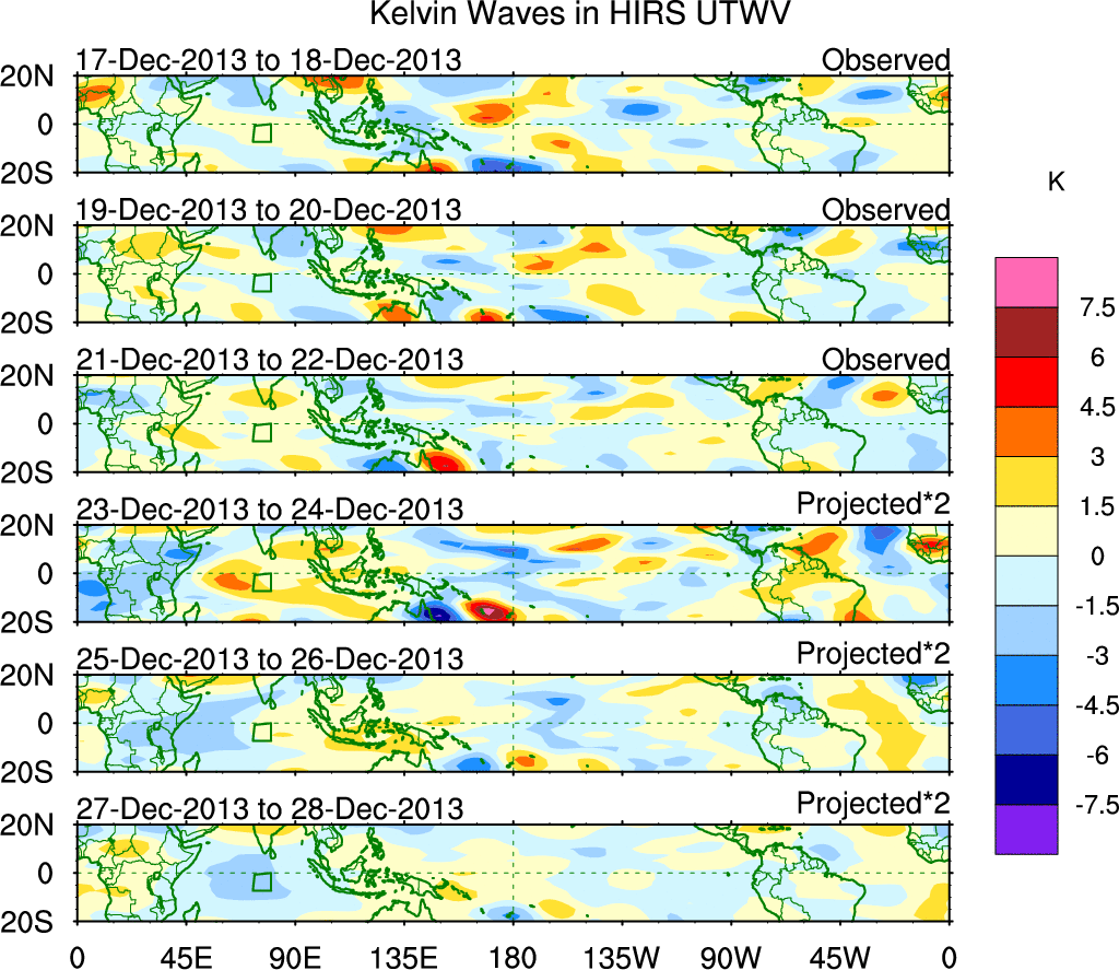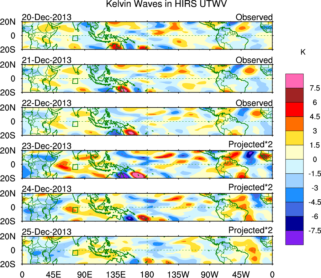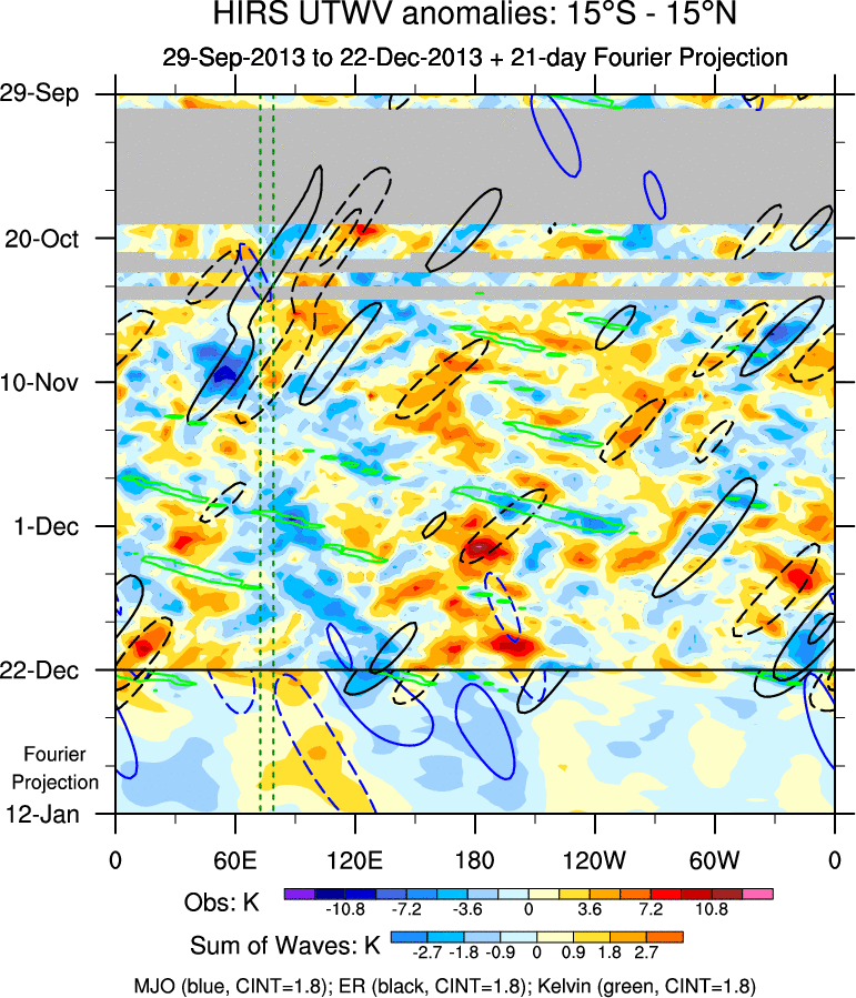 To identify tropical waves in near real-time, the OLR and UTWV data are filtered following Wheeler & Weickmann (2001 MWR). The daily anomalies are calculated using the first 3 harmonics of the seasonal cycle for 1979–2009. Missing values are then filled using linear interpolation in space and time. The most recent 365 days of anomalies are padded with 659 days of zeroes, and the result is filtered for each wave type.
