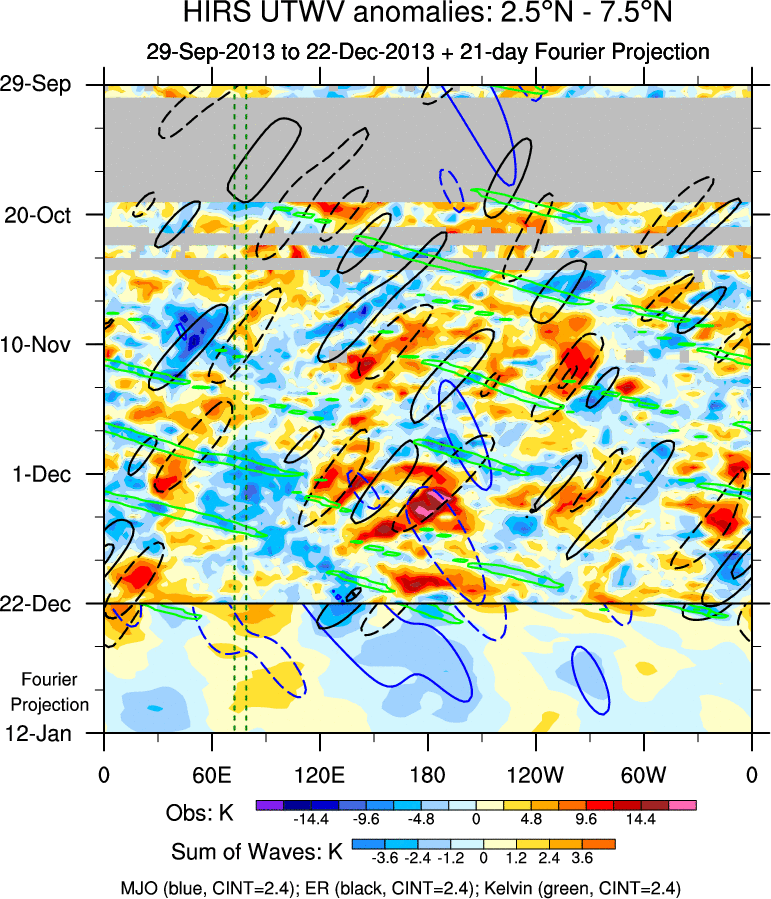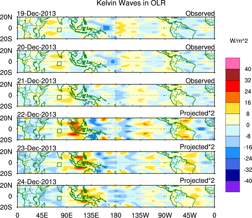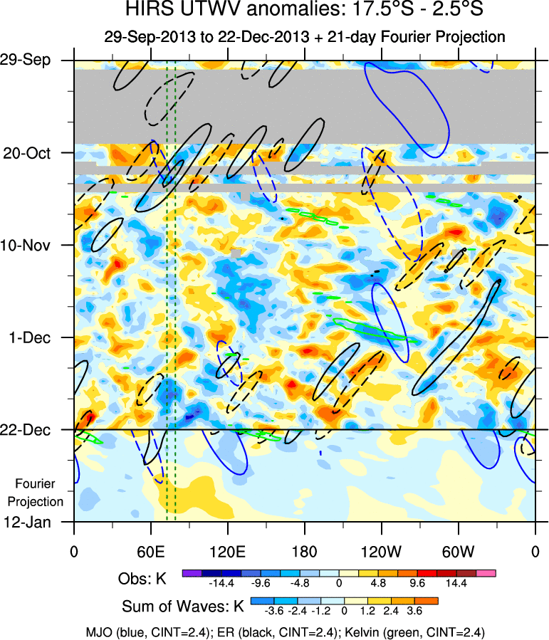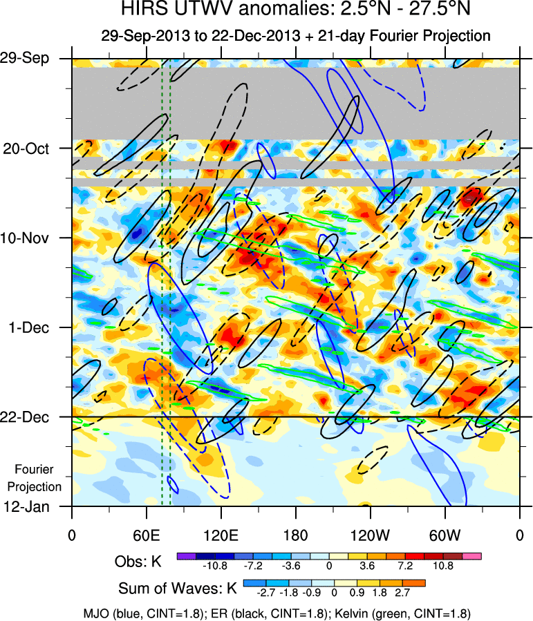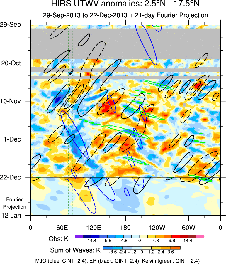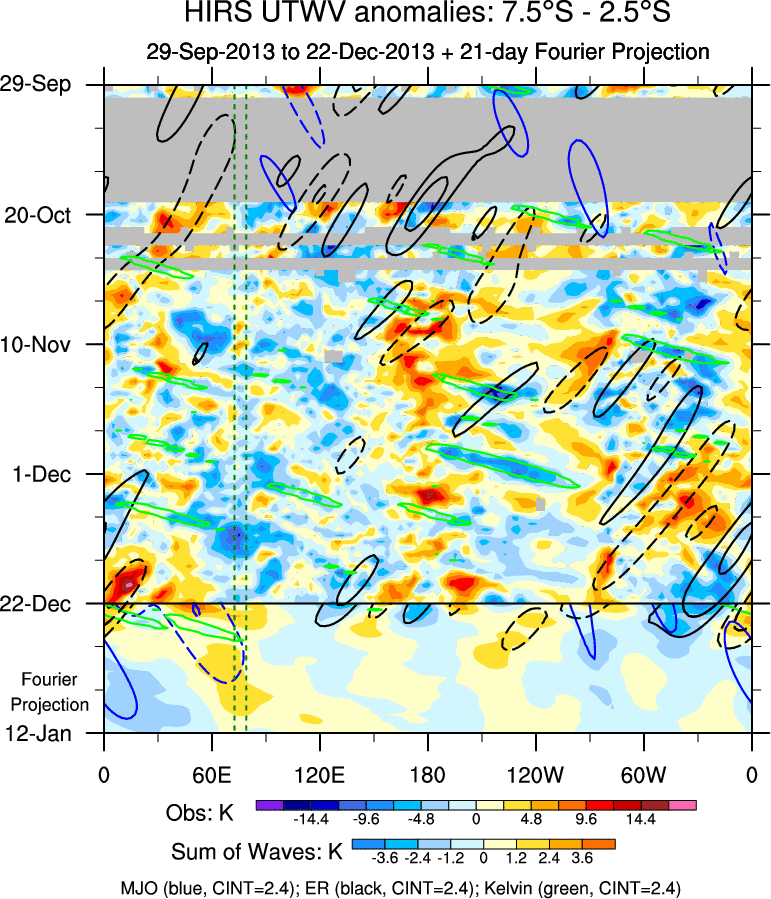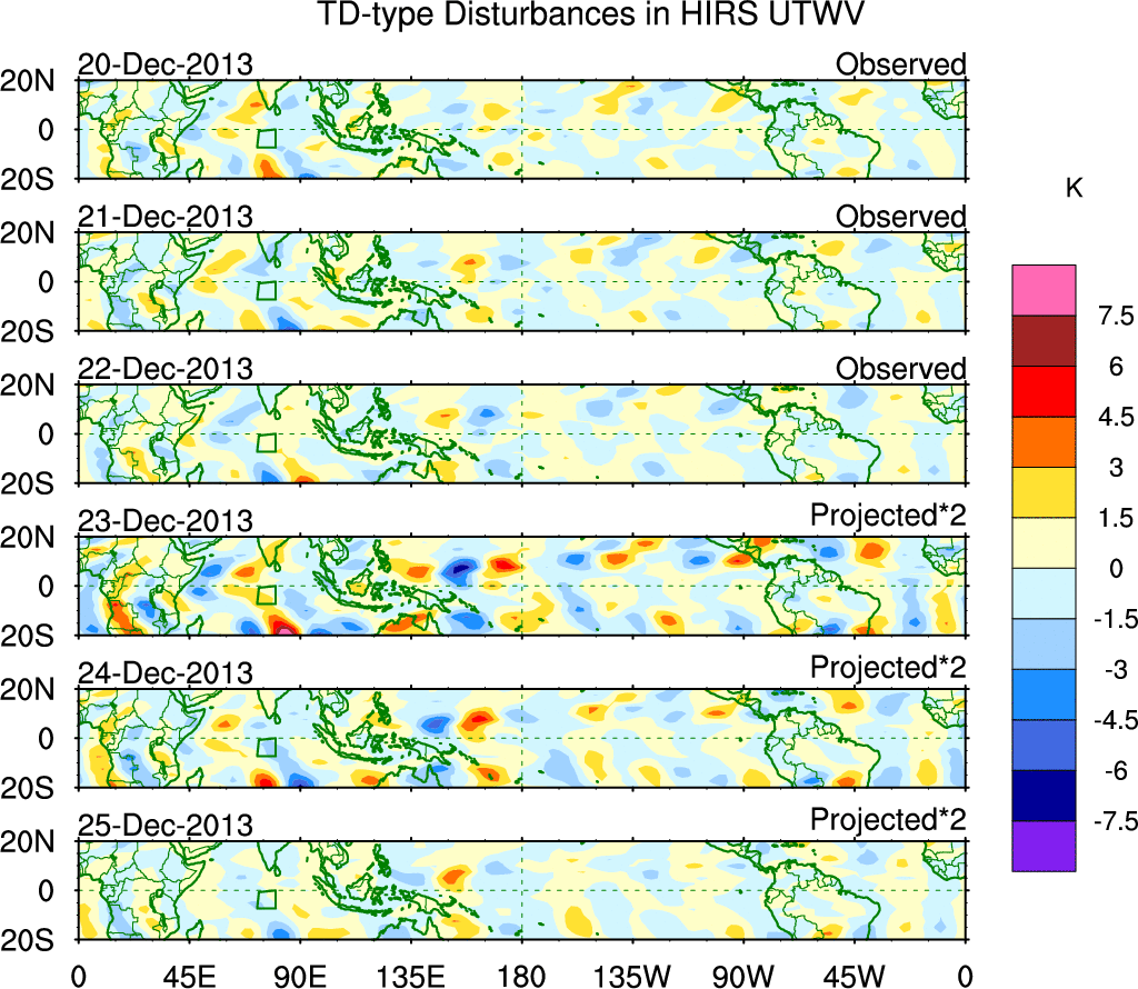 To identify tropical waves in near real-time, the OLR and UTWV data are filtered following Wheeler & Weickmann (2001 MWR). The daily anomalies are calculated using the first 3 harmonics of the seasonal cycle for 1979–2009. Missing values are then filled using linear interpolation in space and time. The most recent 365 days of anomalies are padded with 659 days of zeroes, and the result is filtered for each wave type.