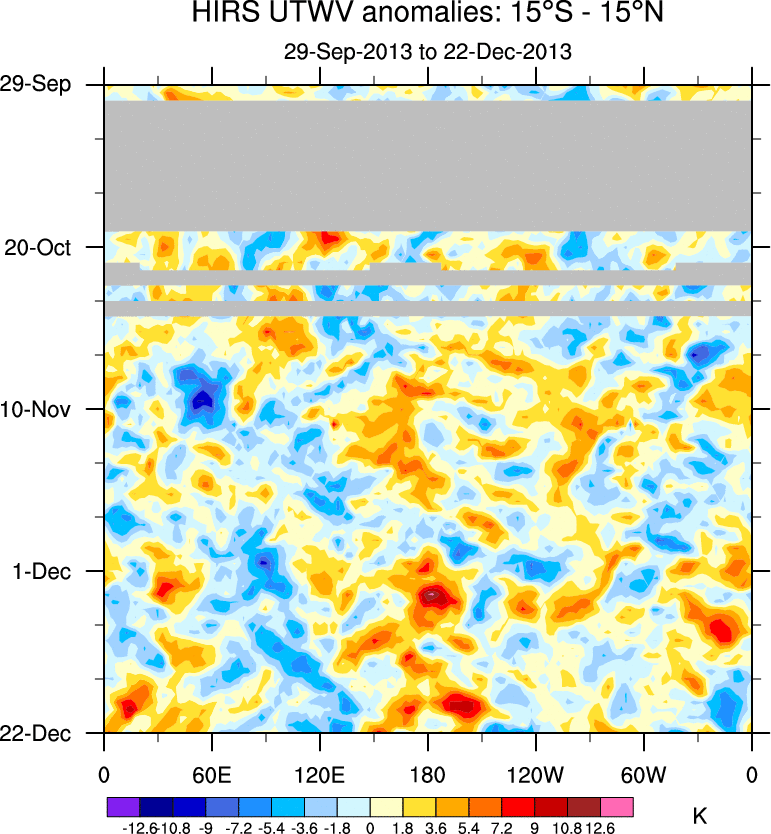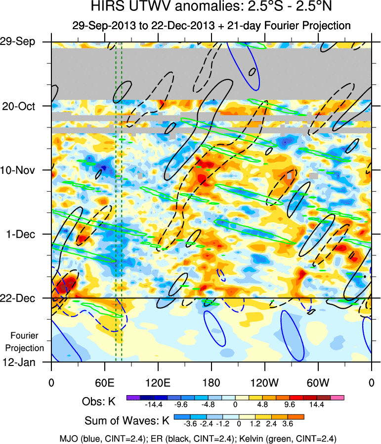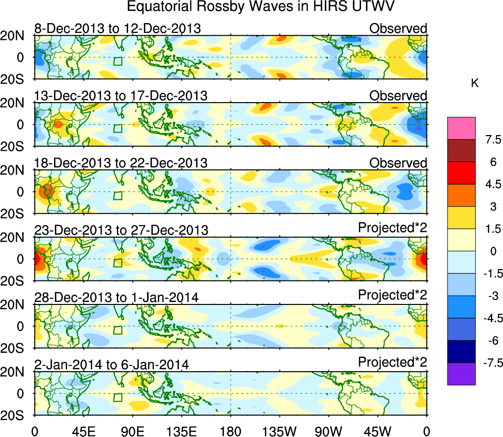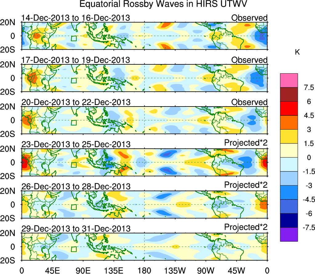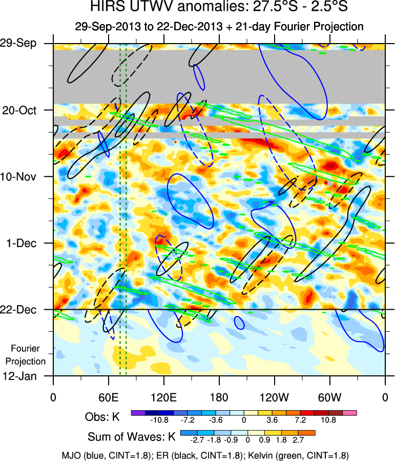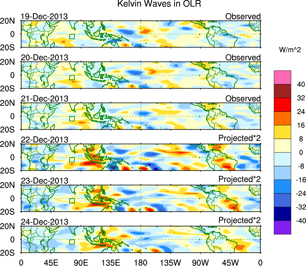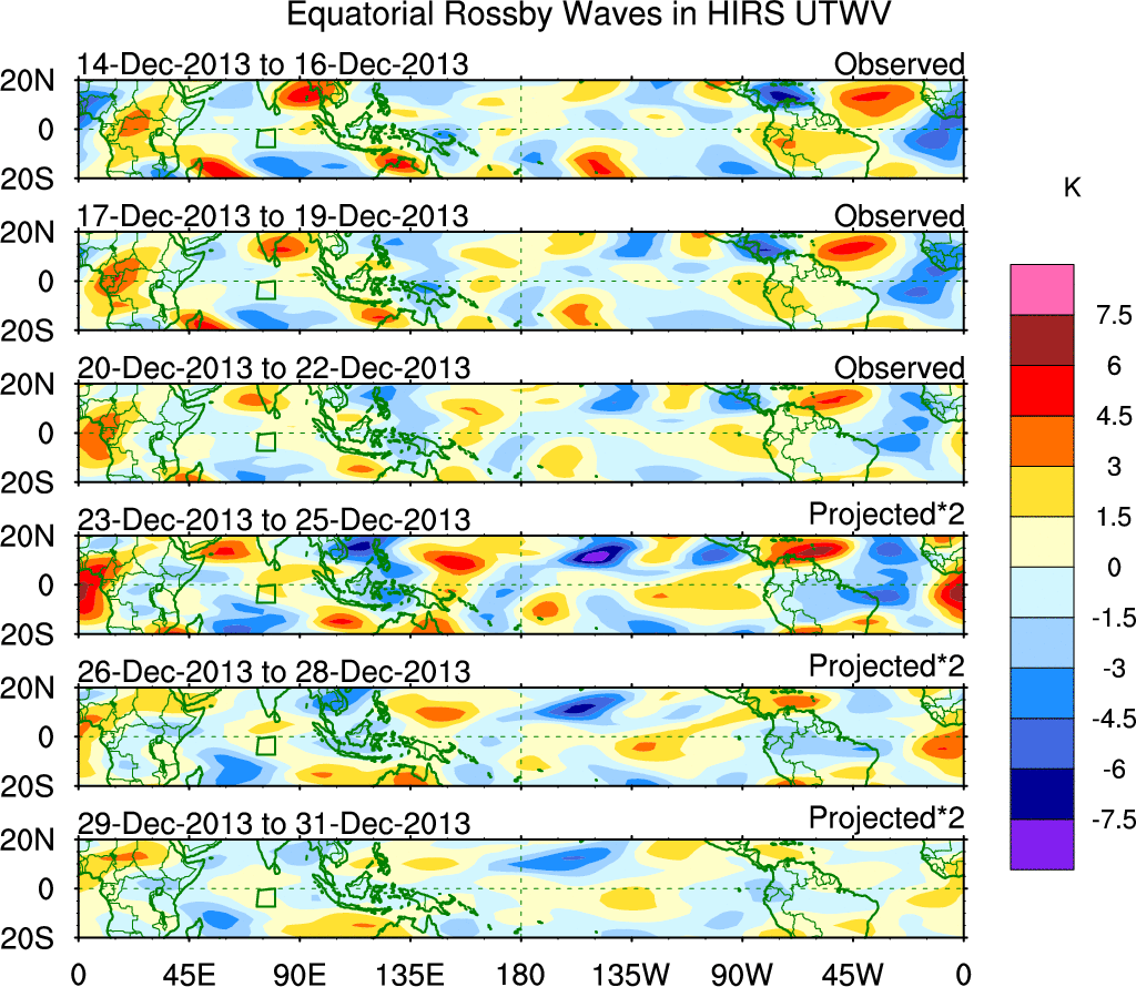 To identify tropical waves in near real-time, the OLR and UTWV data are filtered following Wheeler & Weickmann (2001 MWR). The daily anomalies are calculated using the first 3 harmonics of the seasonal cycle for 1979–2009. Missing values are then filled using linear interpolation in space and time. The most recent 365 days of anomalies are padded with 659 days of zeroes, and the result is filtered for each wave type.
