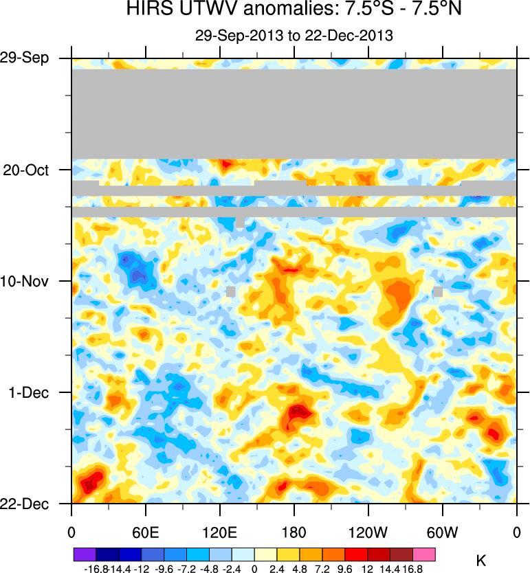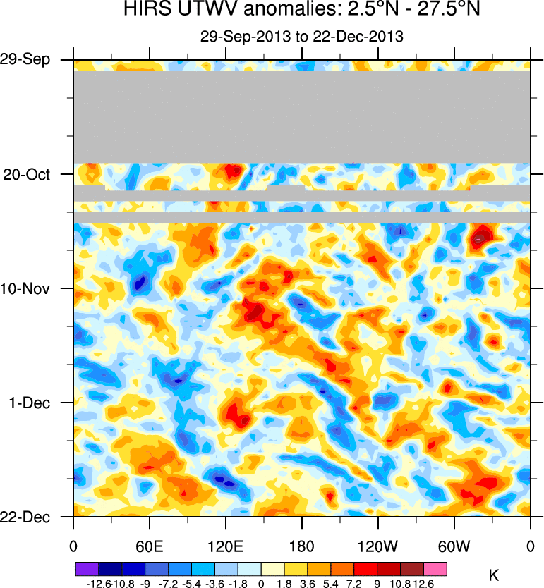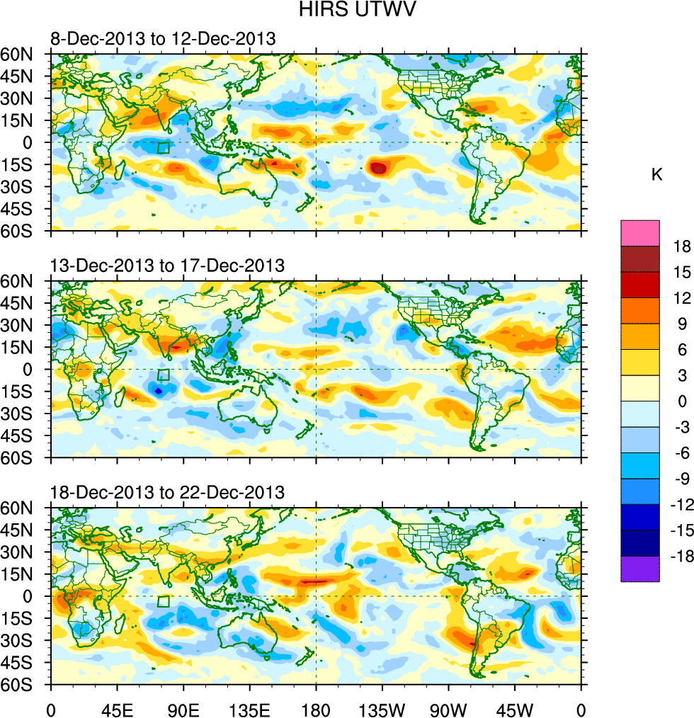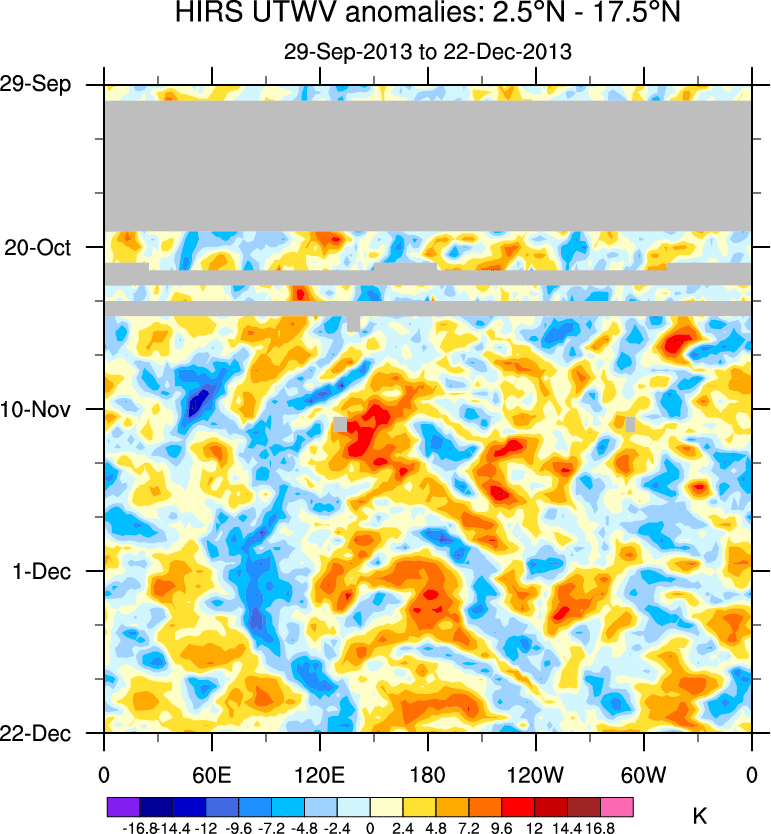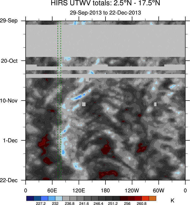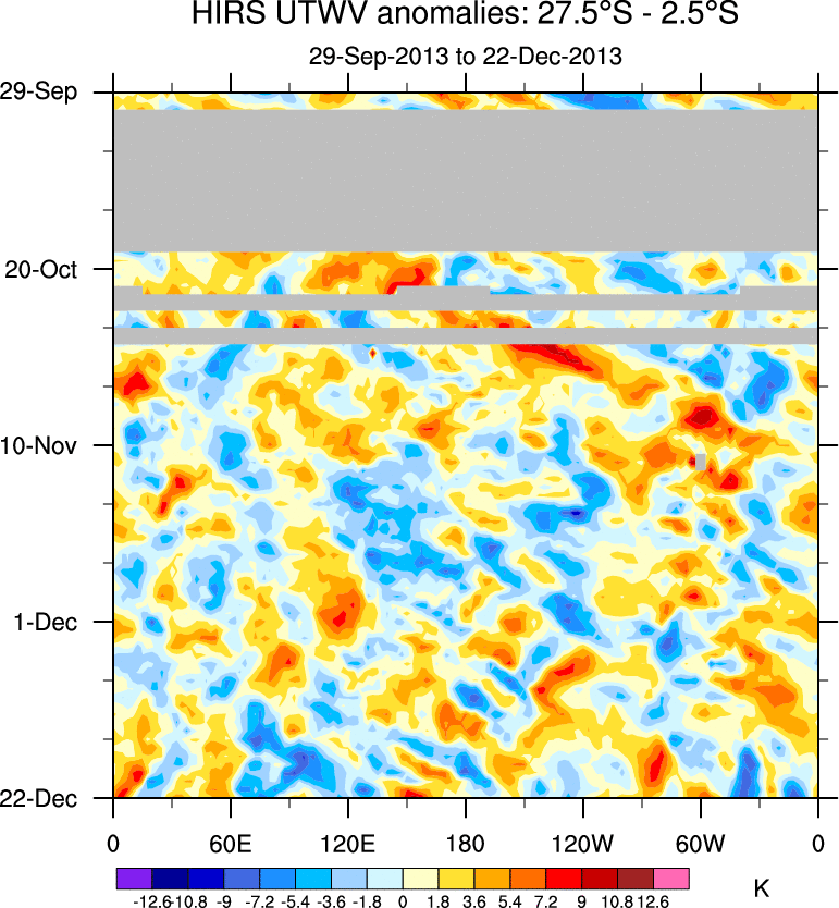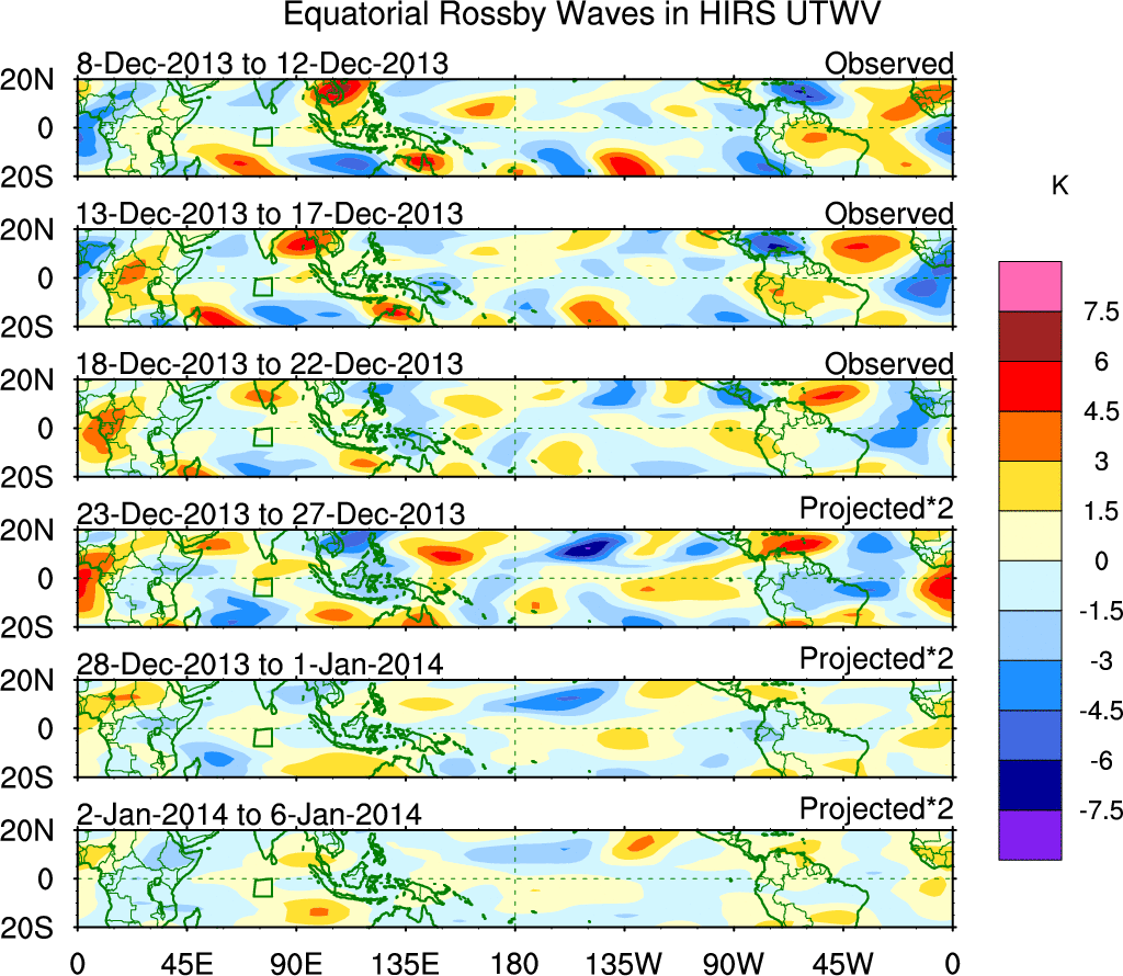 To identify tropical waves in near real-time, the OLR and UTWV data are filtered following Wheeler & Weickmann (2001 MWR). The daily anomalies are calculated using the first 3 harmonics of the seasonal cycle for 1979–2009. Missing values are then filled using linear interpolation in space and time. The most recent 365 days of anomalies are padded with 659 days of zeroes, and the result is filtered for each wave type.