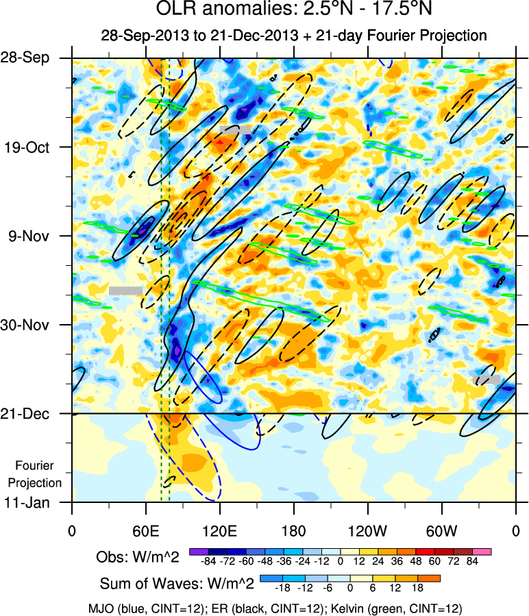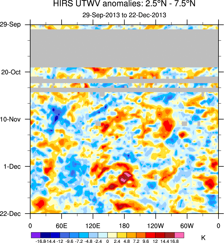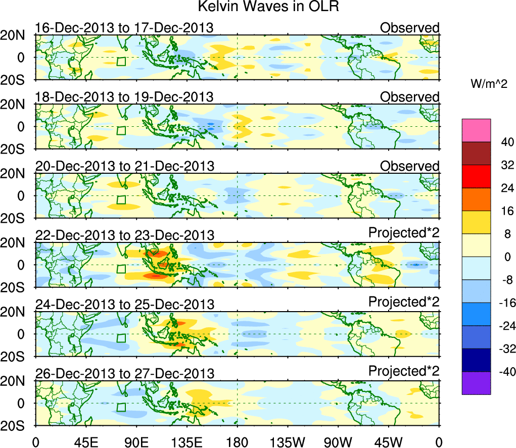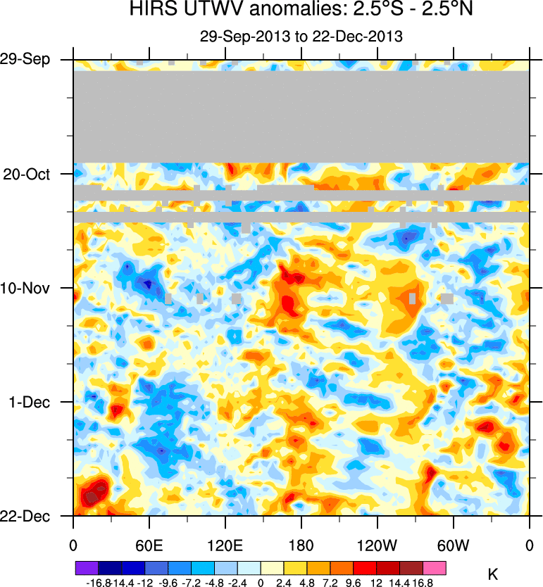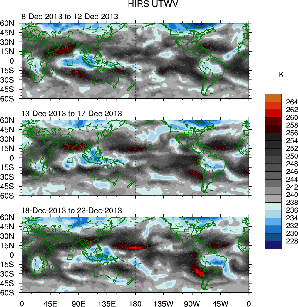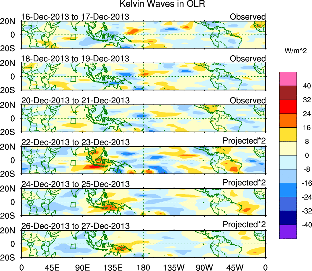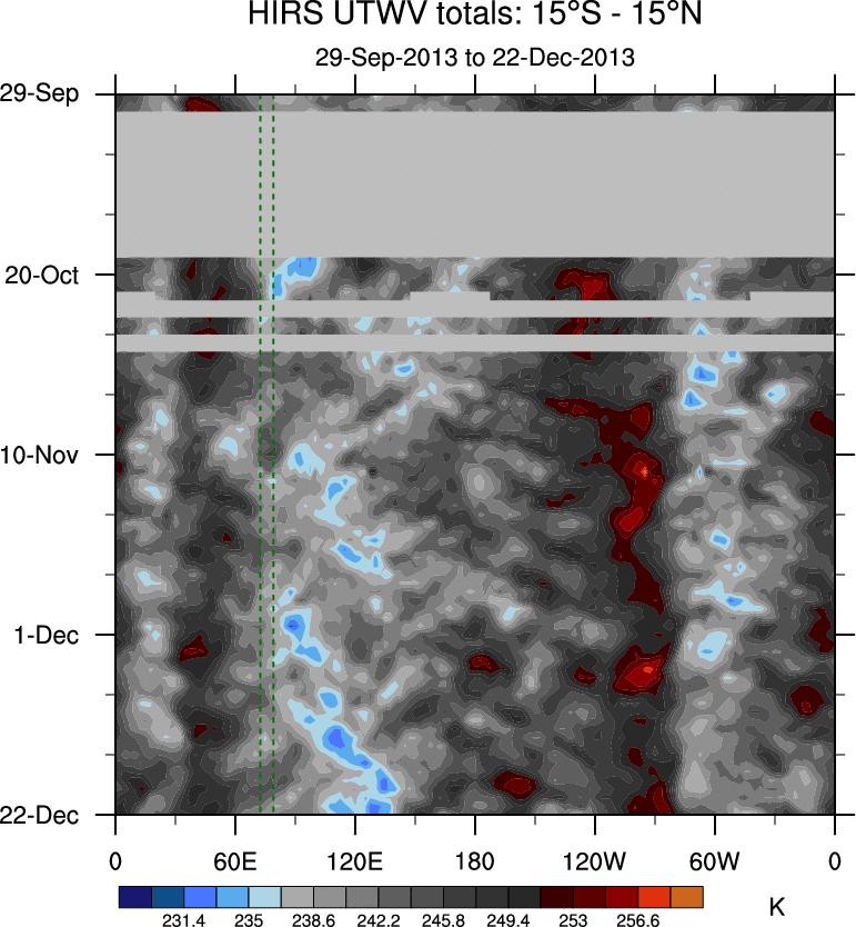 To identify tropical waves in near real-time, the OLR and UTWV data are filtered following Wheeler & Weickmann (2001 MWR). The daily anomalies are calculated using the first 3 harmonics of the seasonal cycle for 1979–2009. Missing values are then filled using linear interpolation in space and time. The most recent 365 days of anomalies are padded with 659 days of zeroes, and the result is filtered for each wave type.