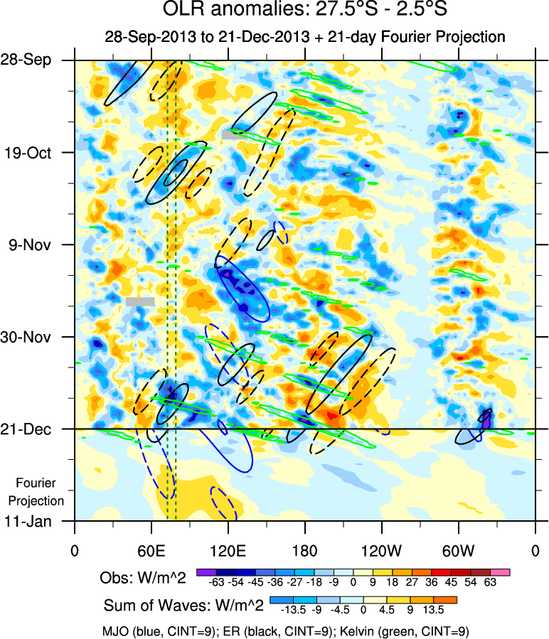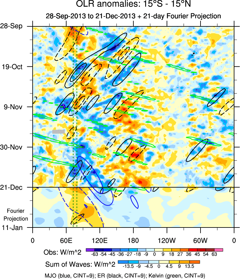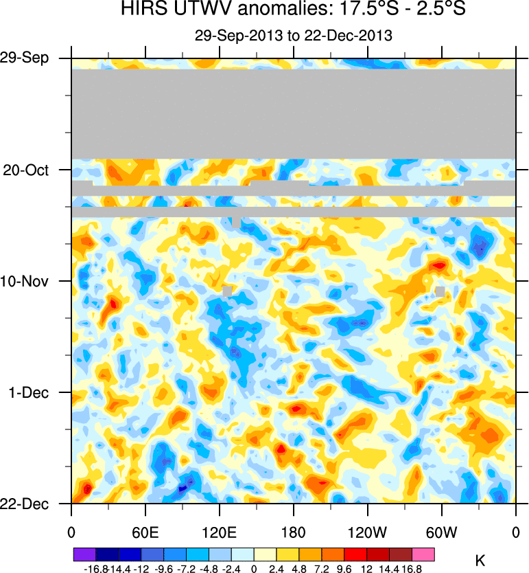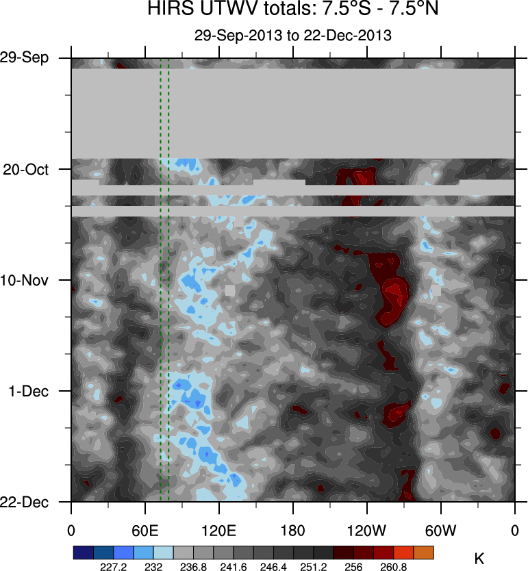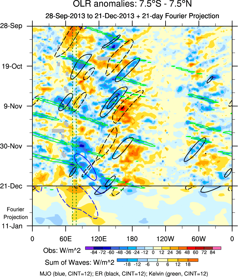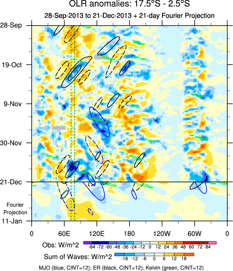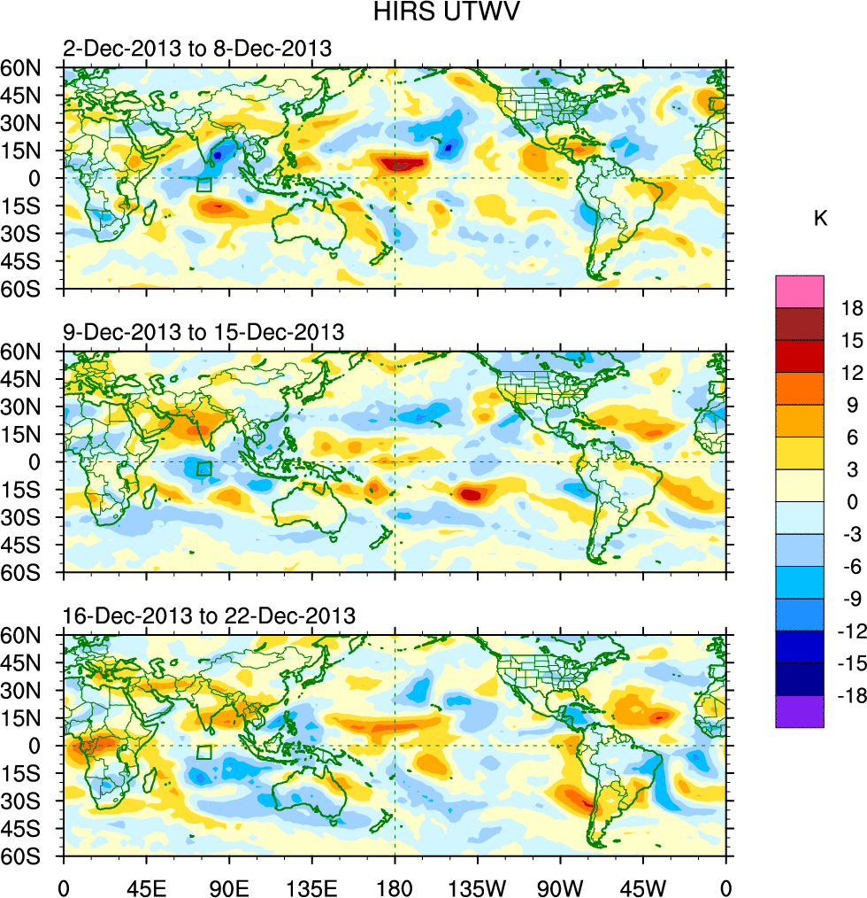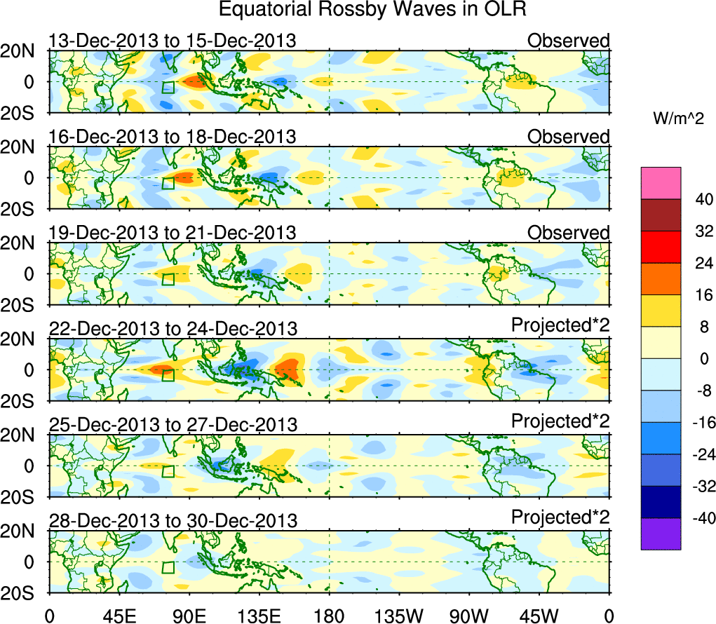 To identify tropical waves in near real-time, the OLR and UTWV data are filtered following Wheeler & Weickmann (2001 MWR). The daily anomalies are calculated using the first 3 harmonics of the seasonal cycle for 1979–2009. Missing values are then filled using linear interpolation in space and time. The most recent 365 days of anomalies are padded with 659 days of zeroes, and the result is filtered for each wave type.