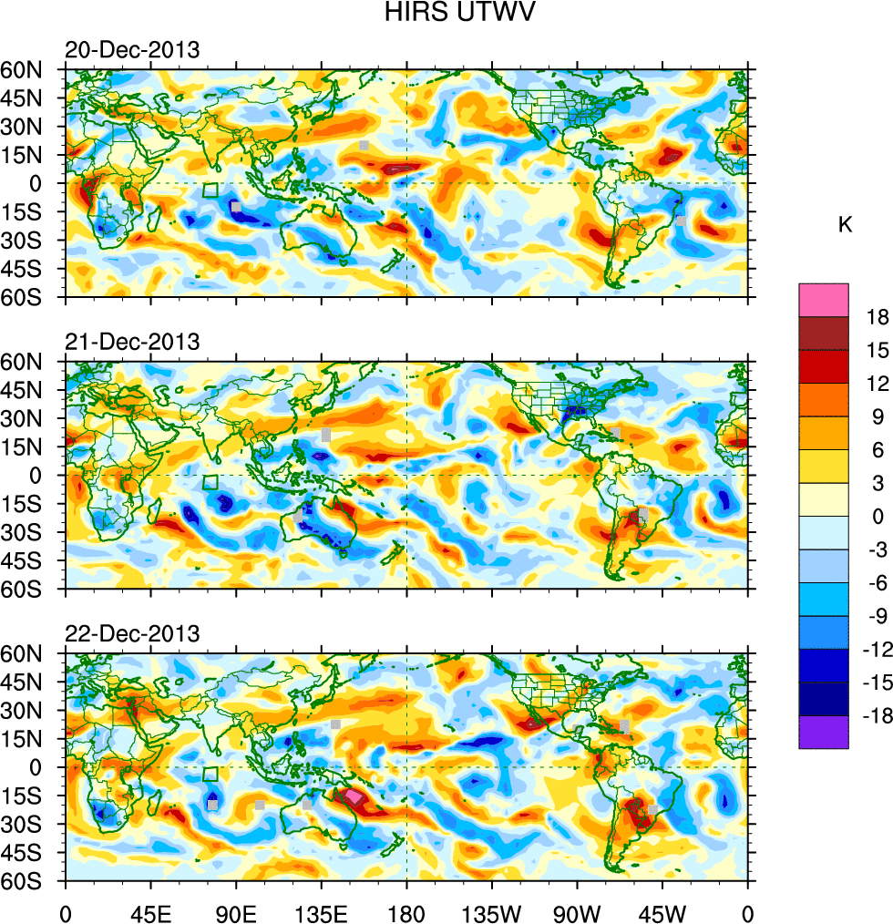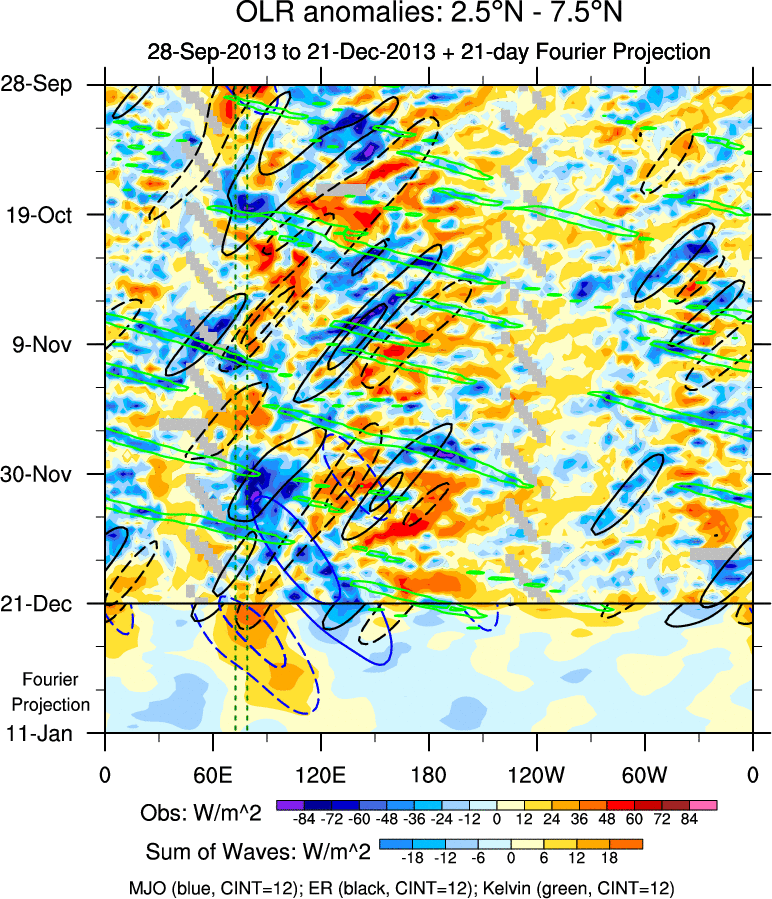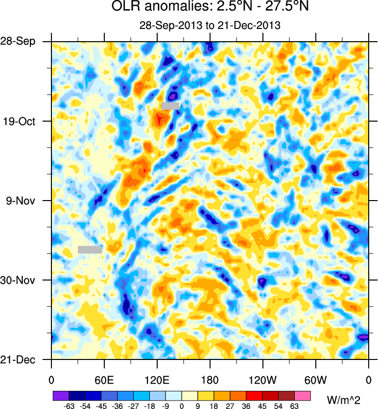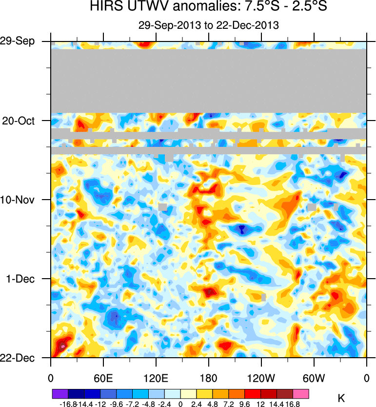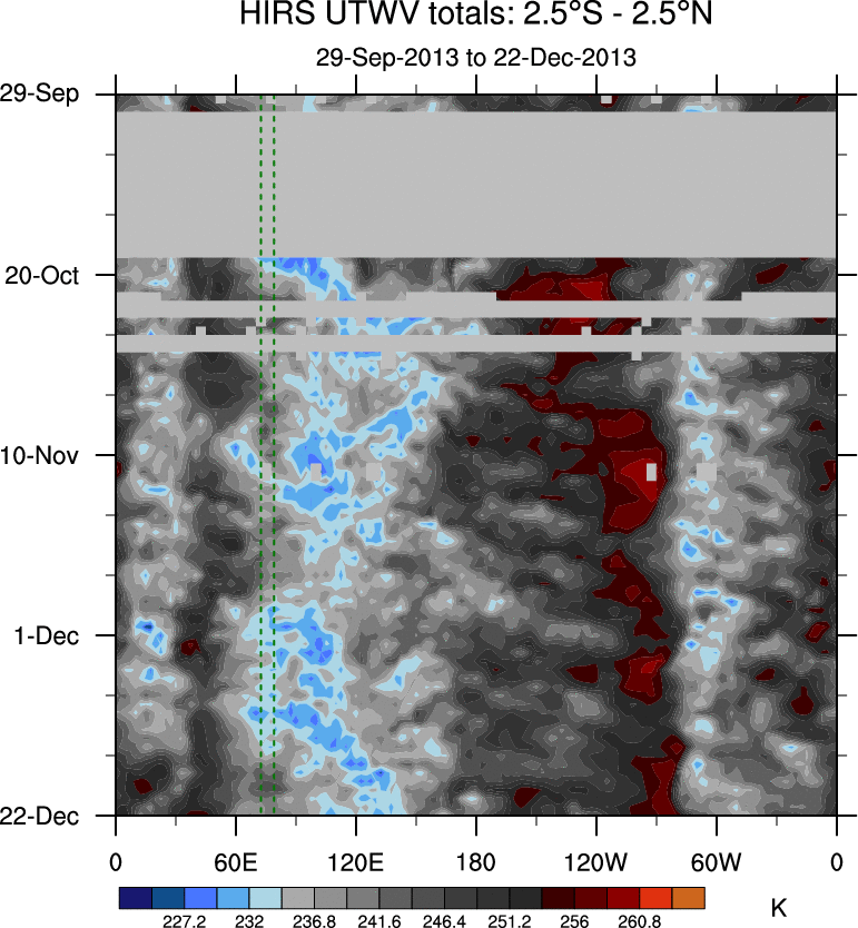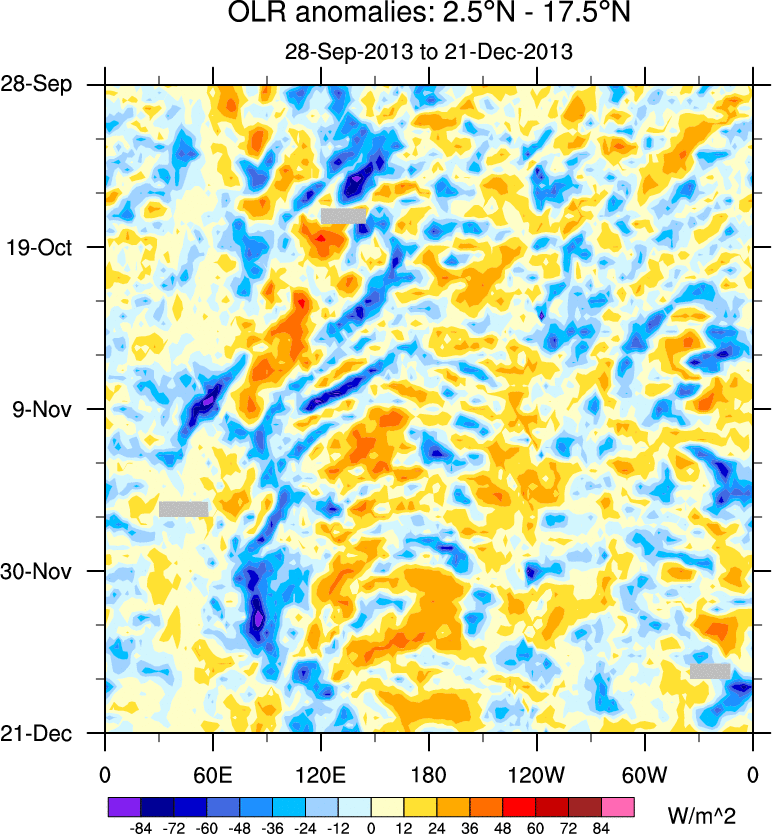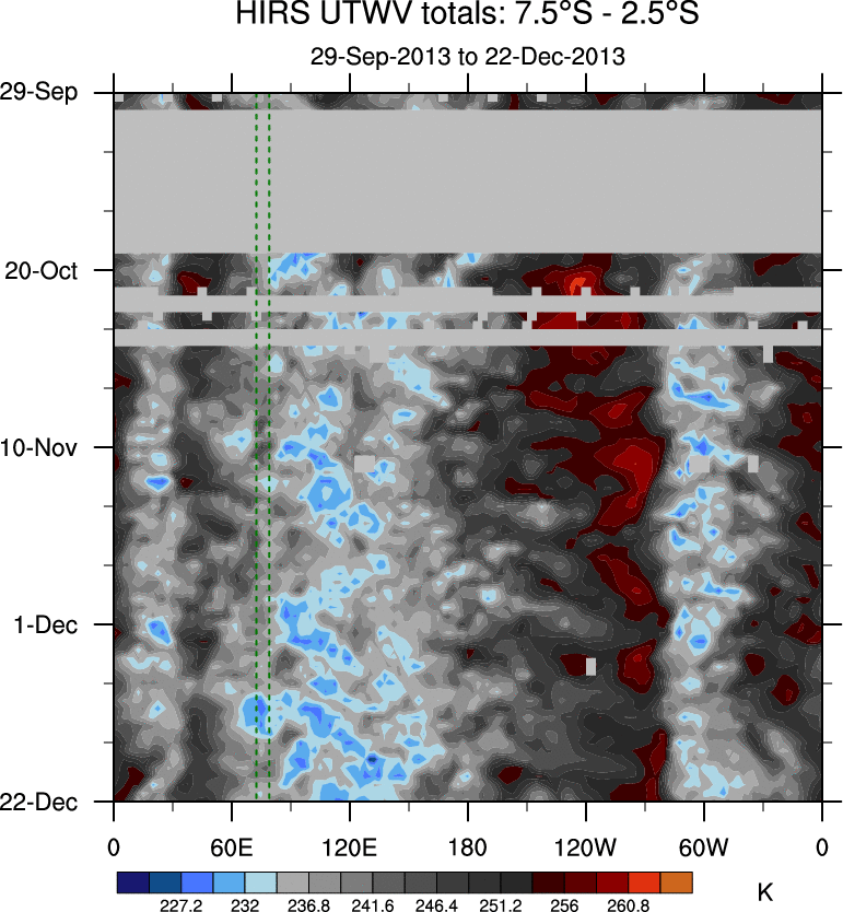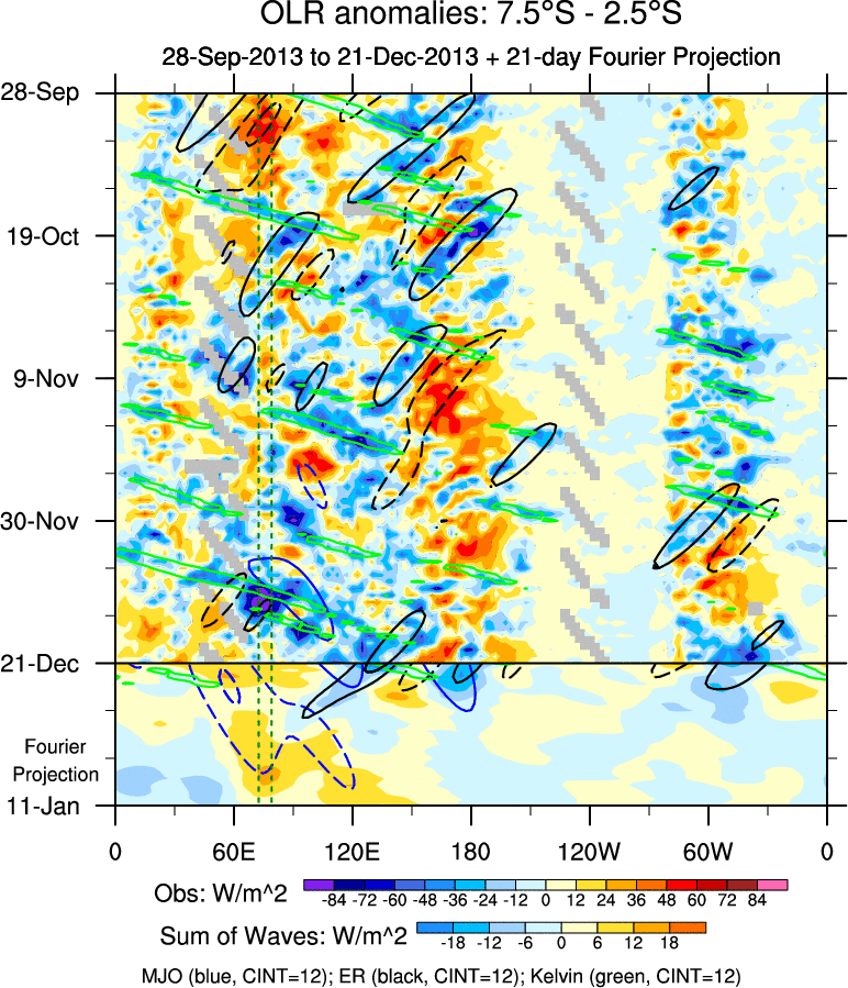 To identify tropical waves in near real-time, the OLR and UTWV data are filtered following Wheeler & Weickmann (2001 MWR). The daily anomalies are calculated using the first 3 harmonics of the seasonal cycle for 1979–2009. Missing values are then filled using linear interpolation in space and time. The most recent 365 days of anomalies are padded with 659 days of zeroes, and the result is filtered for each wave type.