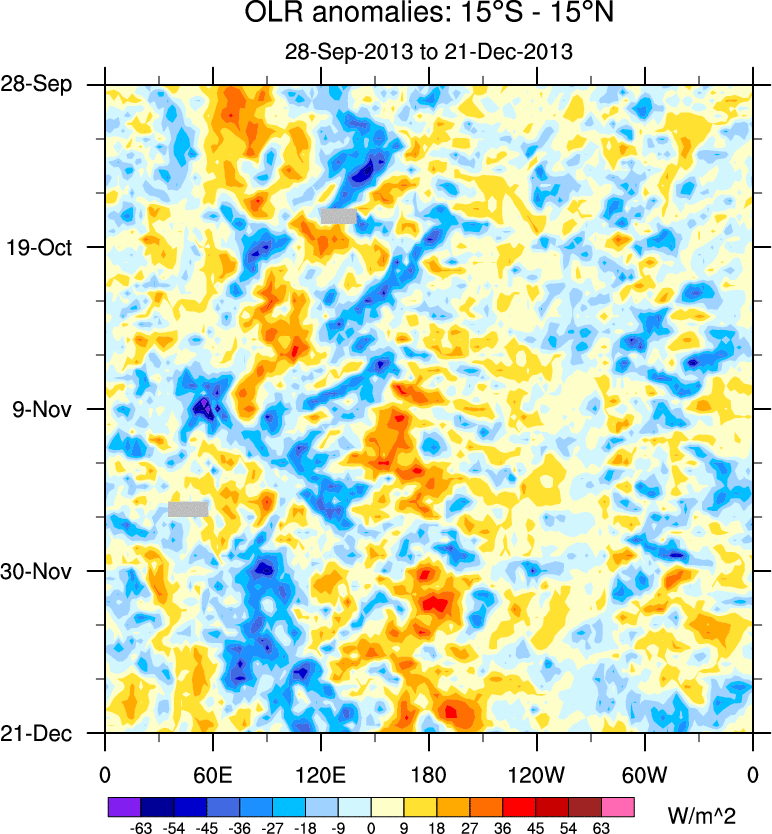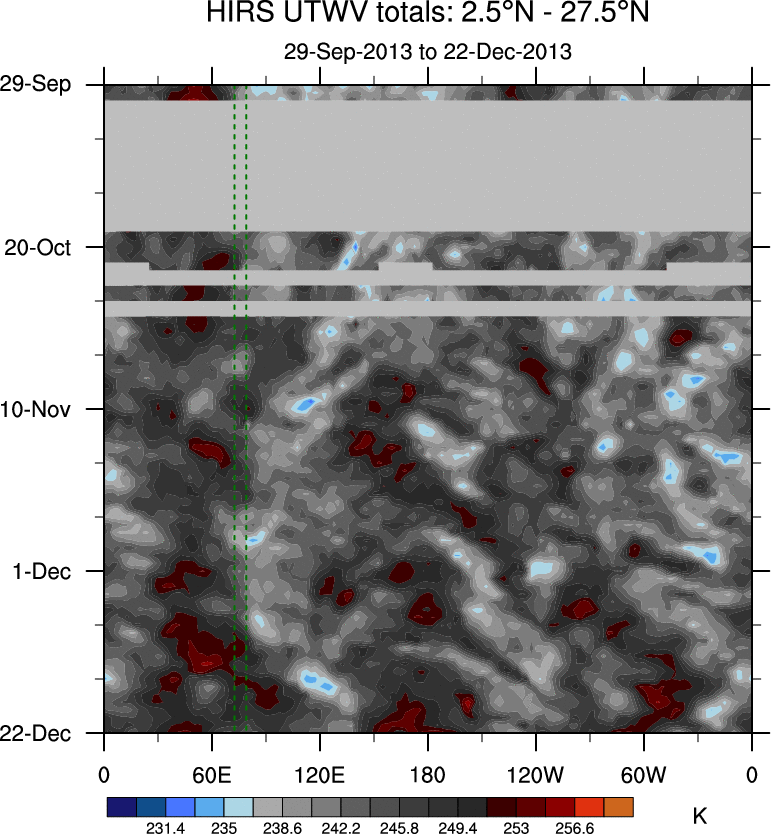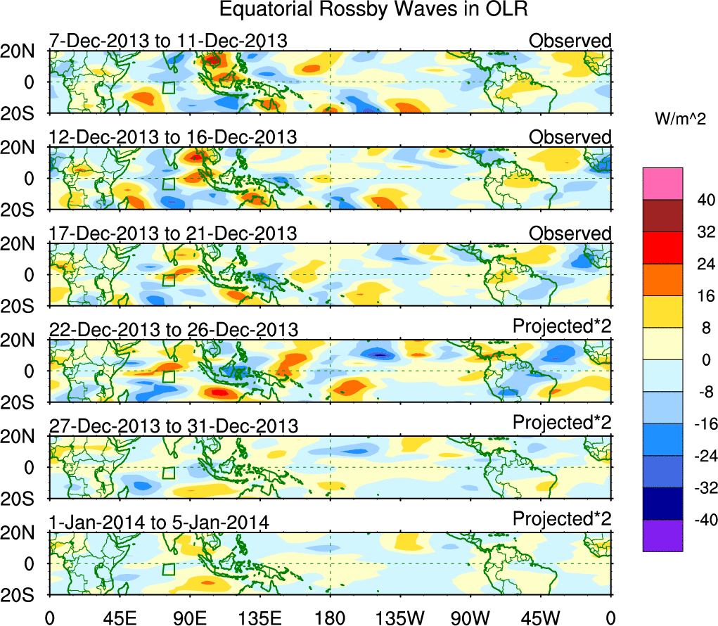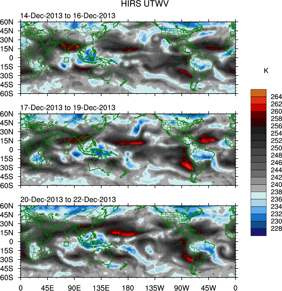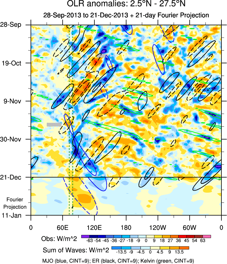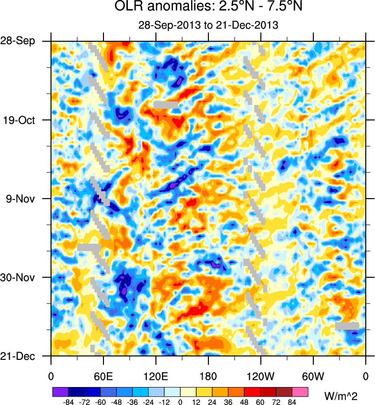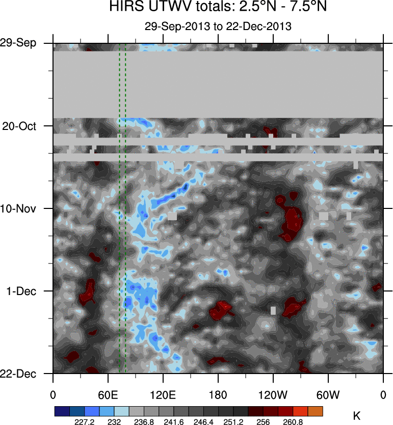 To identify tropical waves in near real-time, the OLR and UTWV data are filtered following Wheeler & Weickmann (2001 MWR). The daily anomalies are calculated using the first 3 harmonics of the seasonal cycle for 1979–2009. Missing values are then filled using linear interpolation in space and time. The most recent 365 days of anomalies are padded with 659 days of zeroes, and the result is filtered for each wave type.