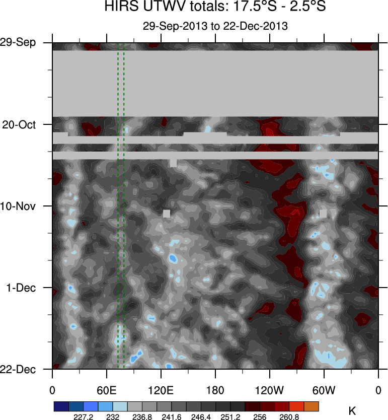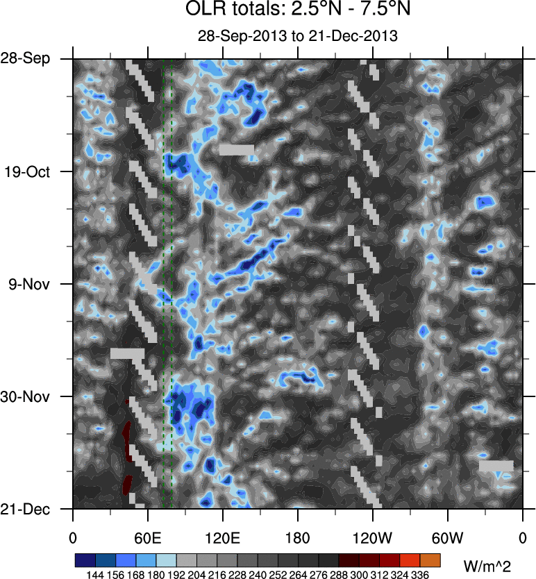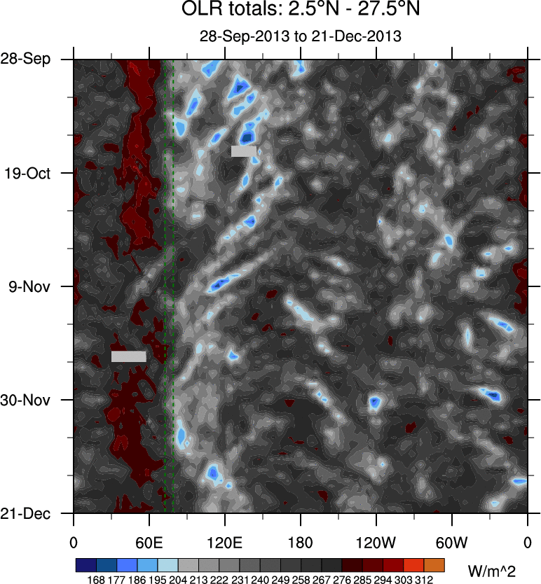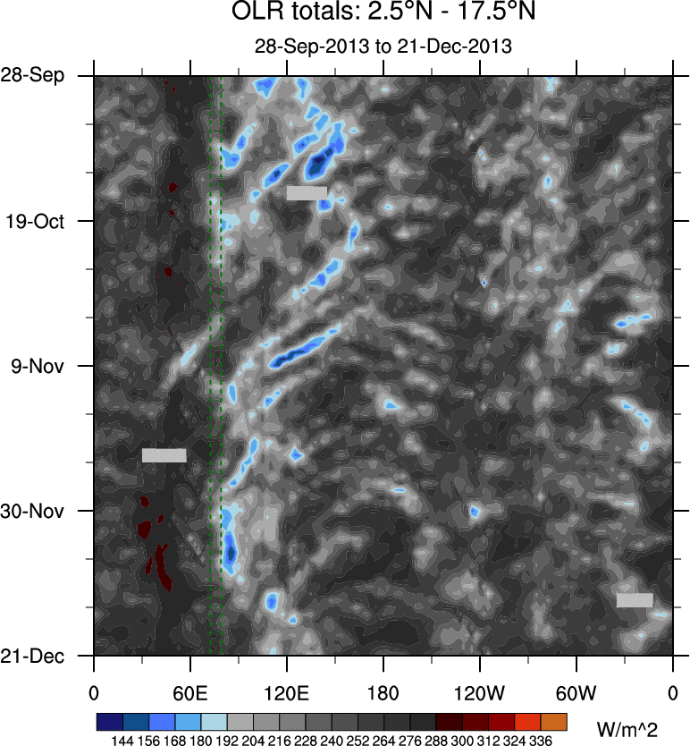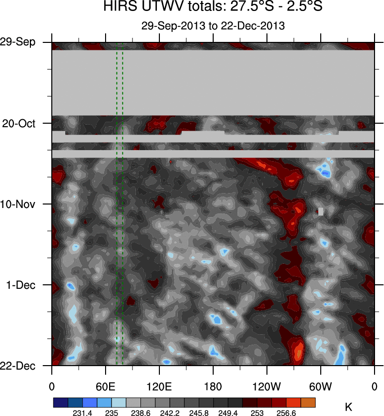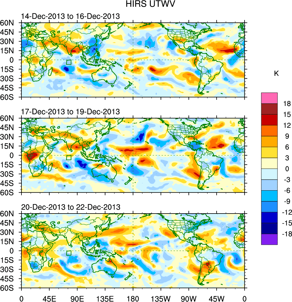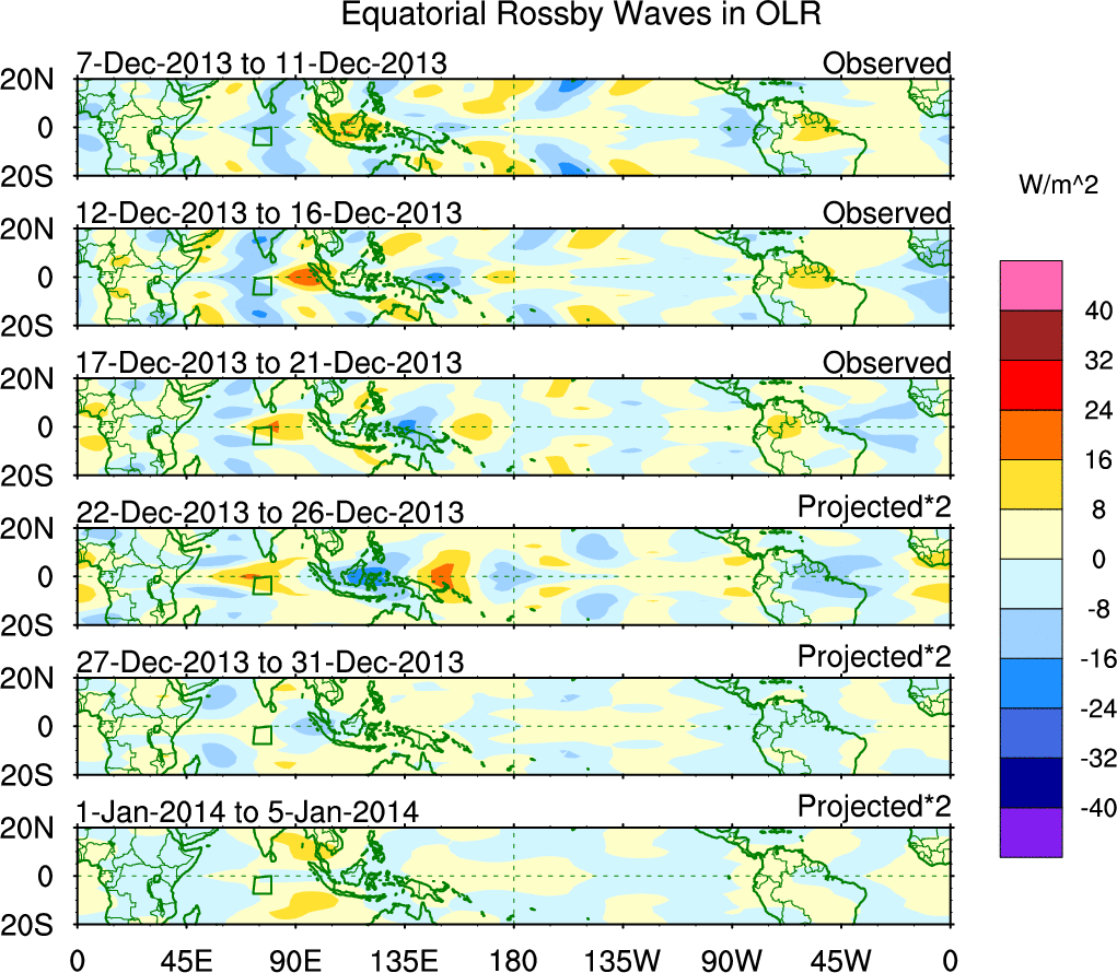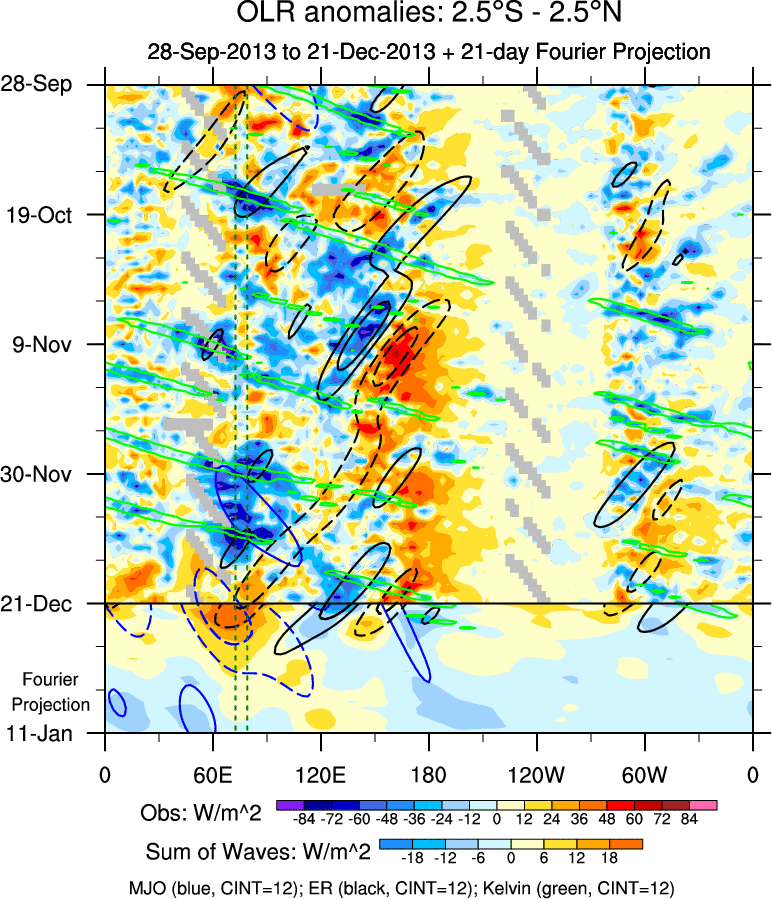To identify tropical waves in near real-time, the OLR and UTWV data are filtered following Wheeler & Weickmann (2001 MWR). The daily anomalies are calculated using the first 3 harmonics of the seasonal cycle for 1979–2009. Missing values are then filled using linear interpolation in space and time. The most recent 365 days of anomalies are padded with 659 days of zeroes, and the result is filtered for each wave type.