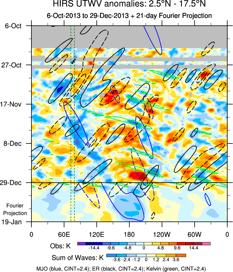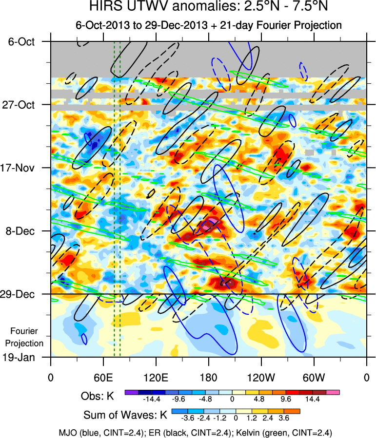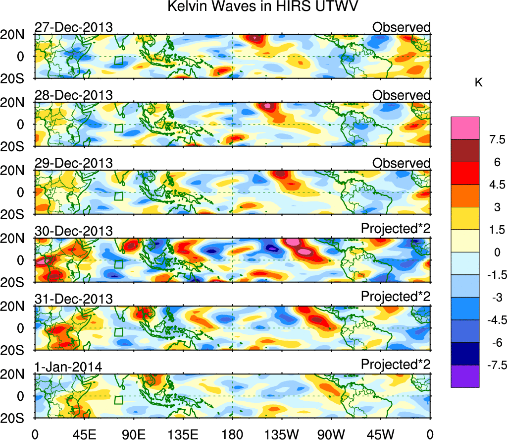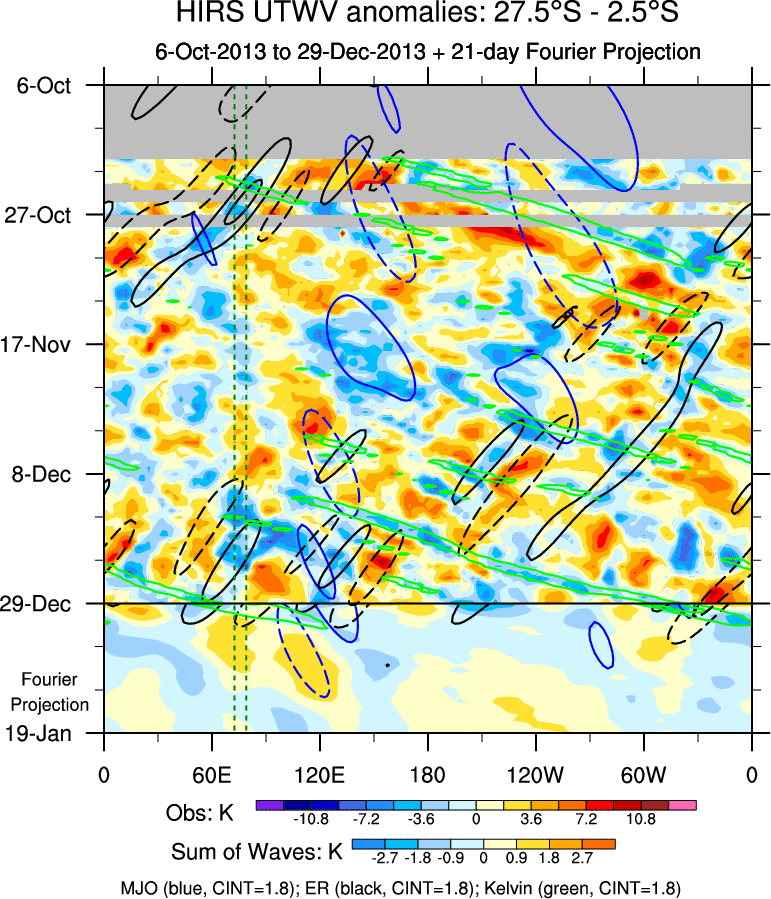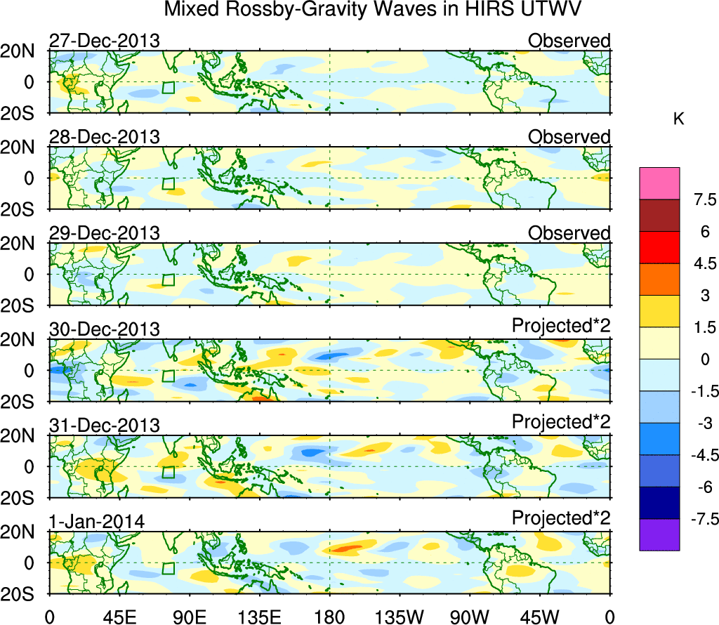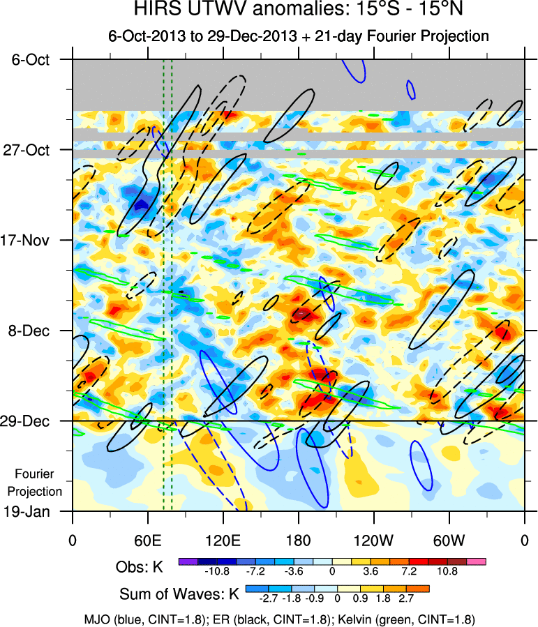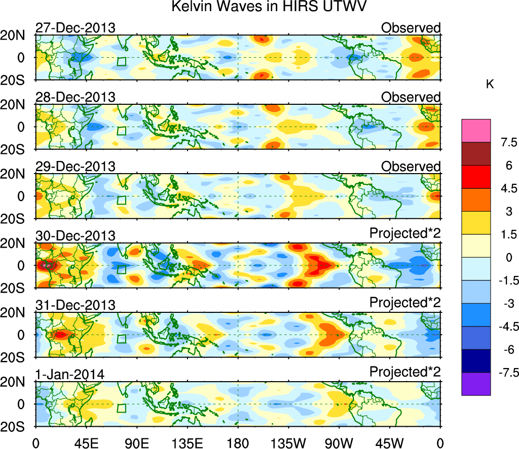 To identify tropical waves in near real-time, the OLR and UTWV data are filtered following Wheeler & Weickmann (2001 MWR). The daily anomalies are calculated using the first 3 harmonics of the seasonal cycle for 1979–2009. Missing values are then filled using linear interpolation in space and time. The most recent 365 days of anomalies are padded with 659 days of zeroes, and the result is filtered for each wave type.