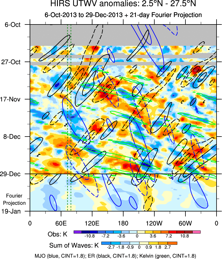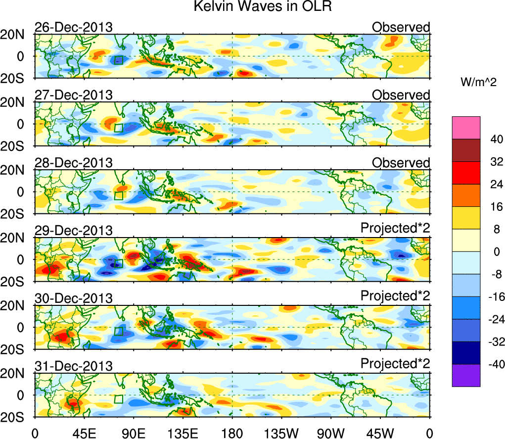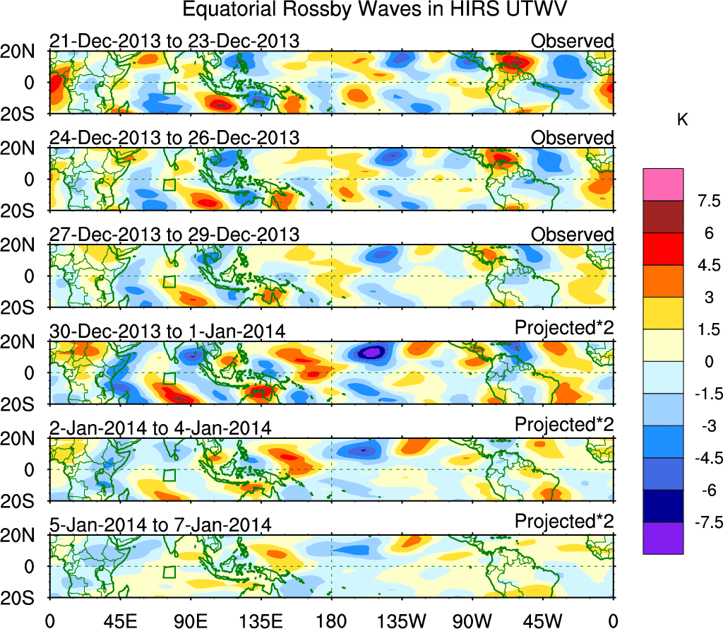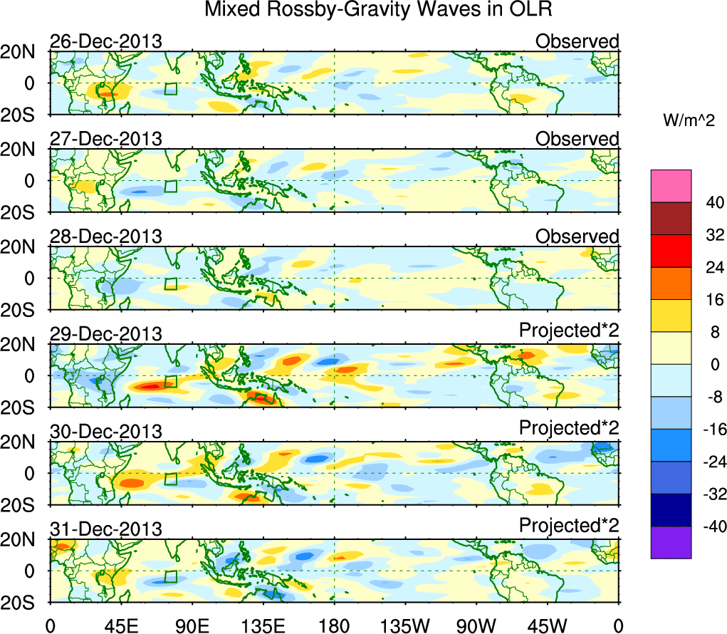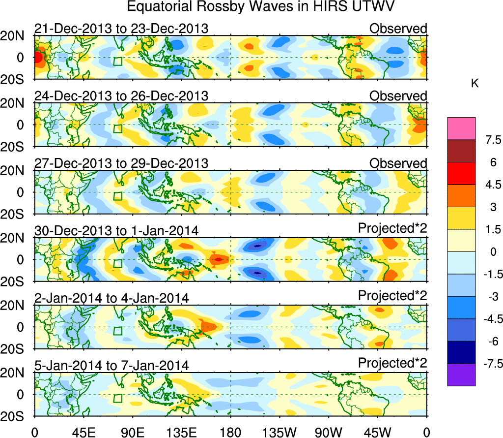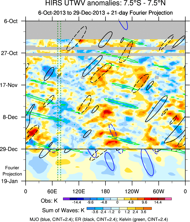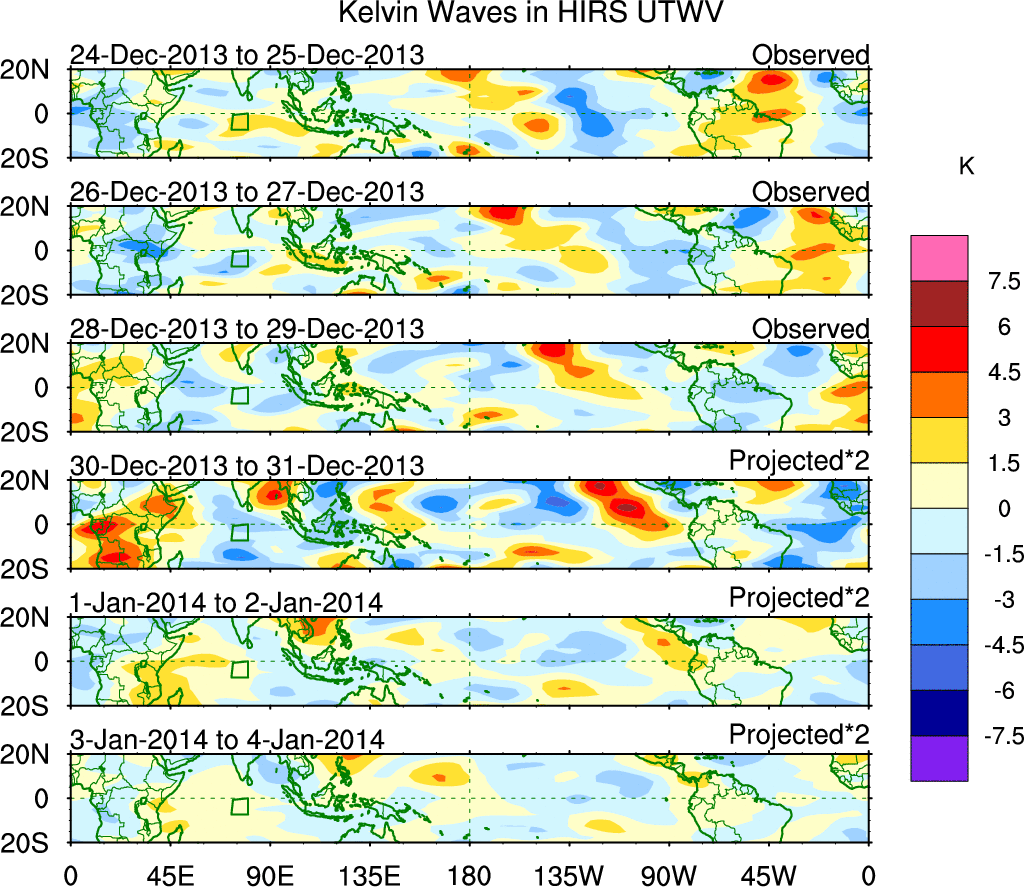 To identify tropical waves in near real-time, the OLR and UTWV data are filtered following Wheeler & Weickmann (2001 MWR). The daily anomalies are calculated using the first 3 harmonics of the seasonal cycle for 1979–2009. Missing values are then filled using linear interpolation in space and time. The most recent 365 days of anomalies are padded with 659 days of zeroes, and the result is filtered for each wave type.