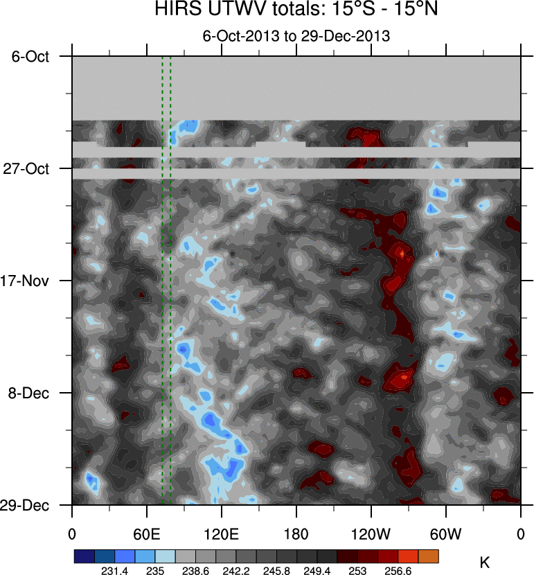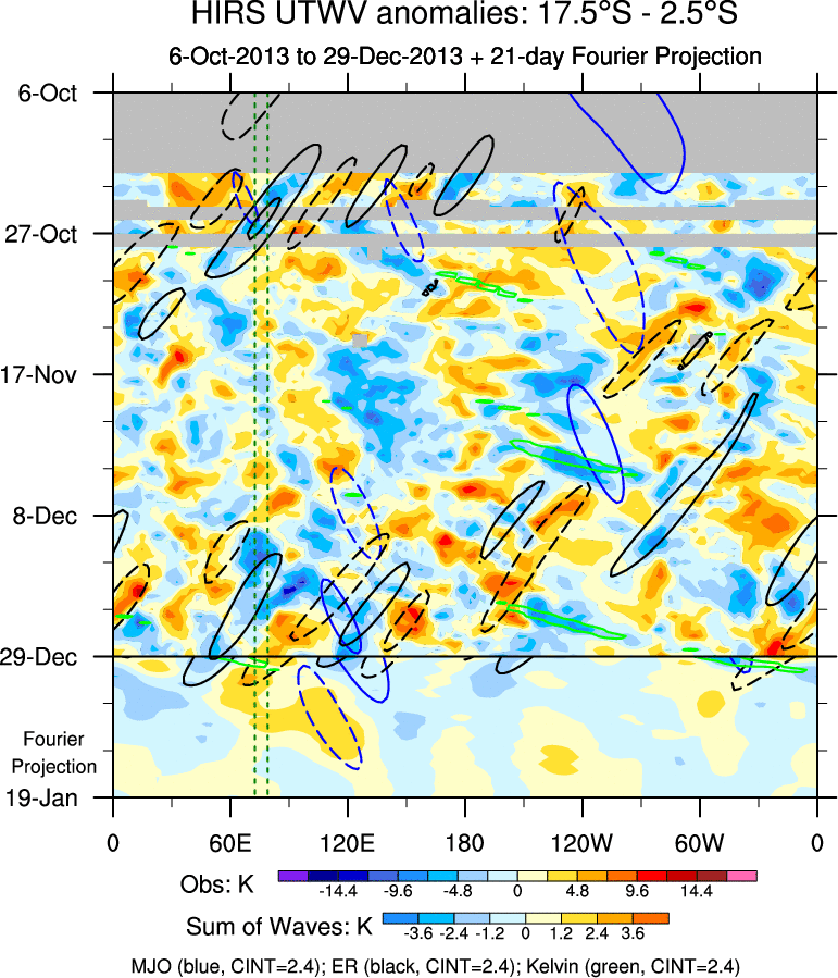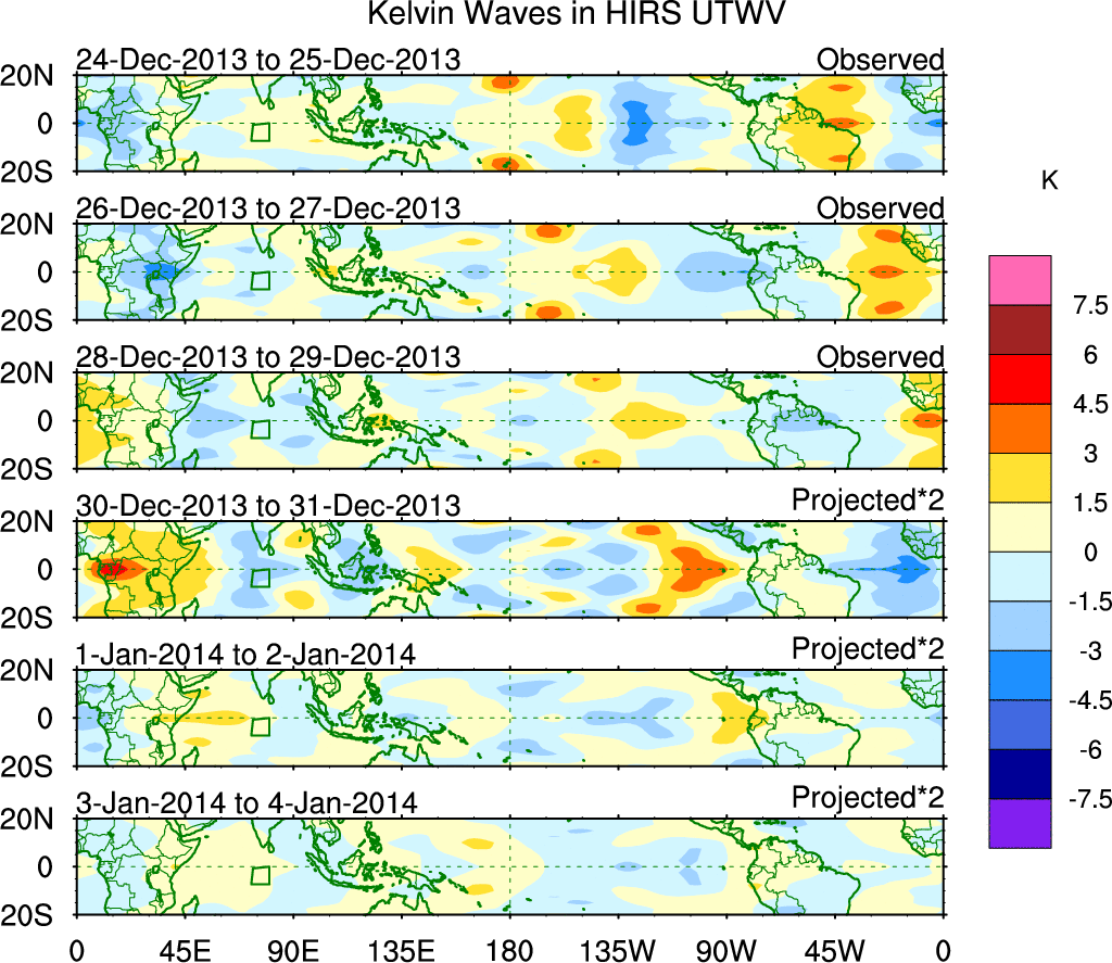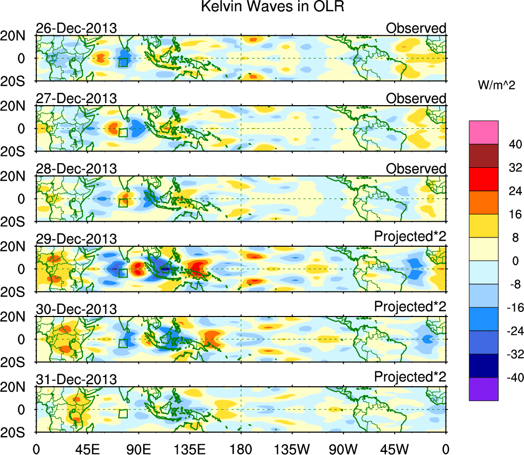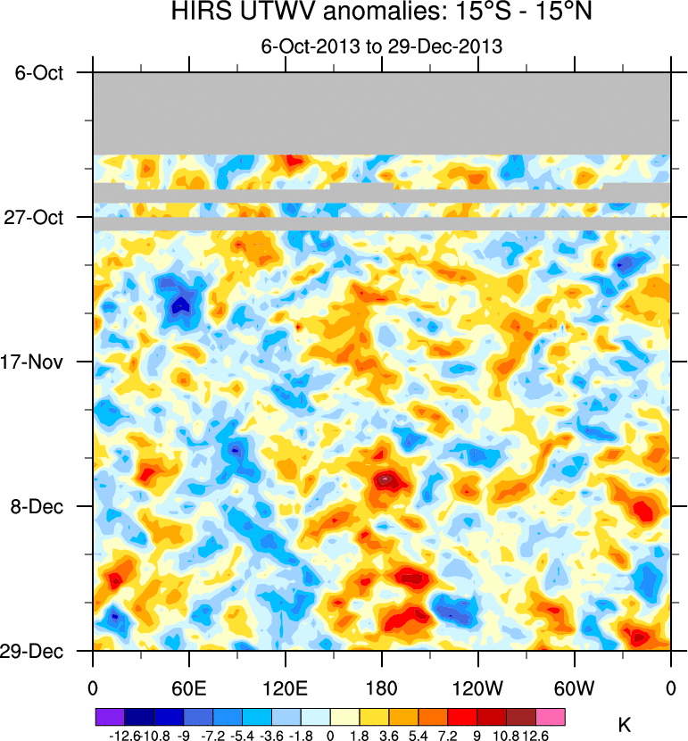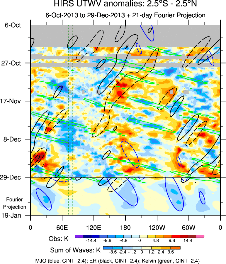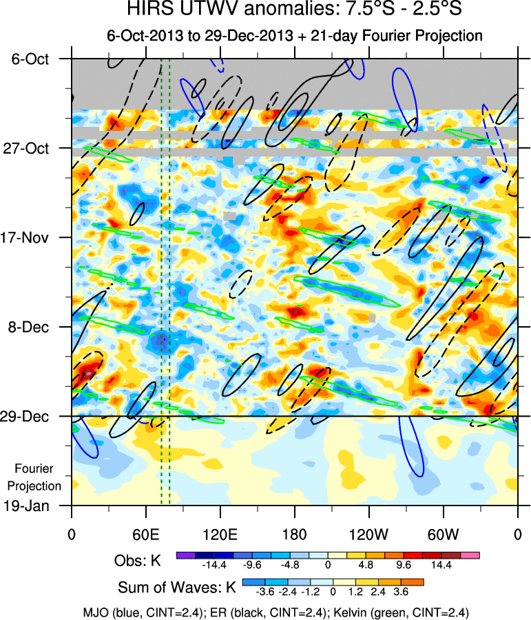 To identify tropical waves in near real-time, the OLR and UTWV data are filtered following Wheeler & Weickmann (2001 MWR). The daily anomalies are calculated using the first 3 harmonics of the seasonal cycle for 1979–2009. Missing values are then filled using linear interpolation in space and time. The most recent 365 days of anomalies are padded with 659 days of zeroes, and the result is filtered for each wave type.
