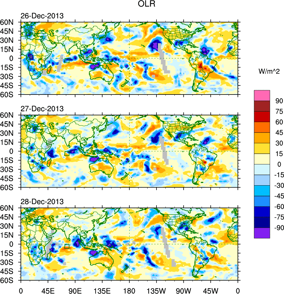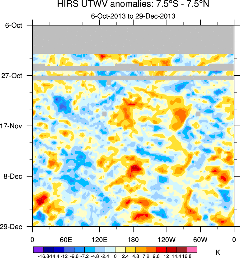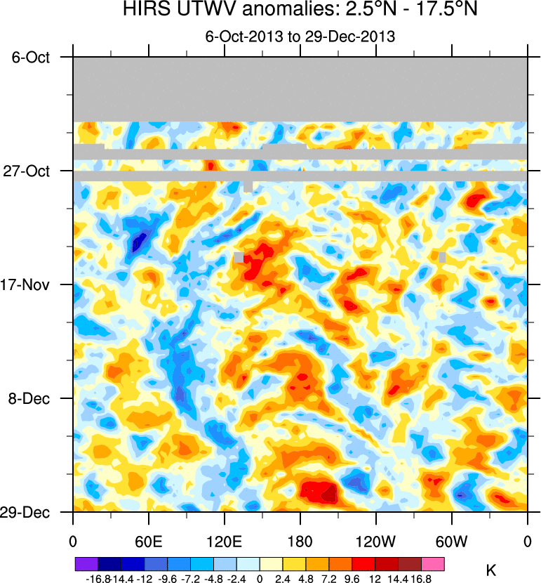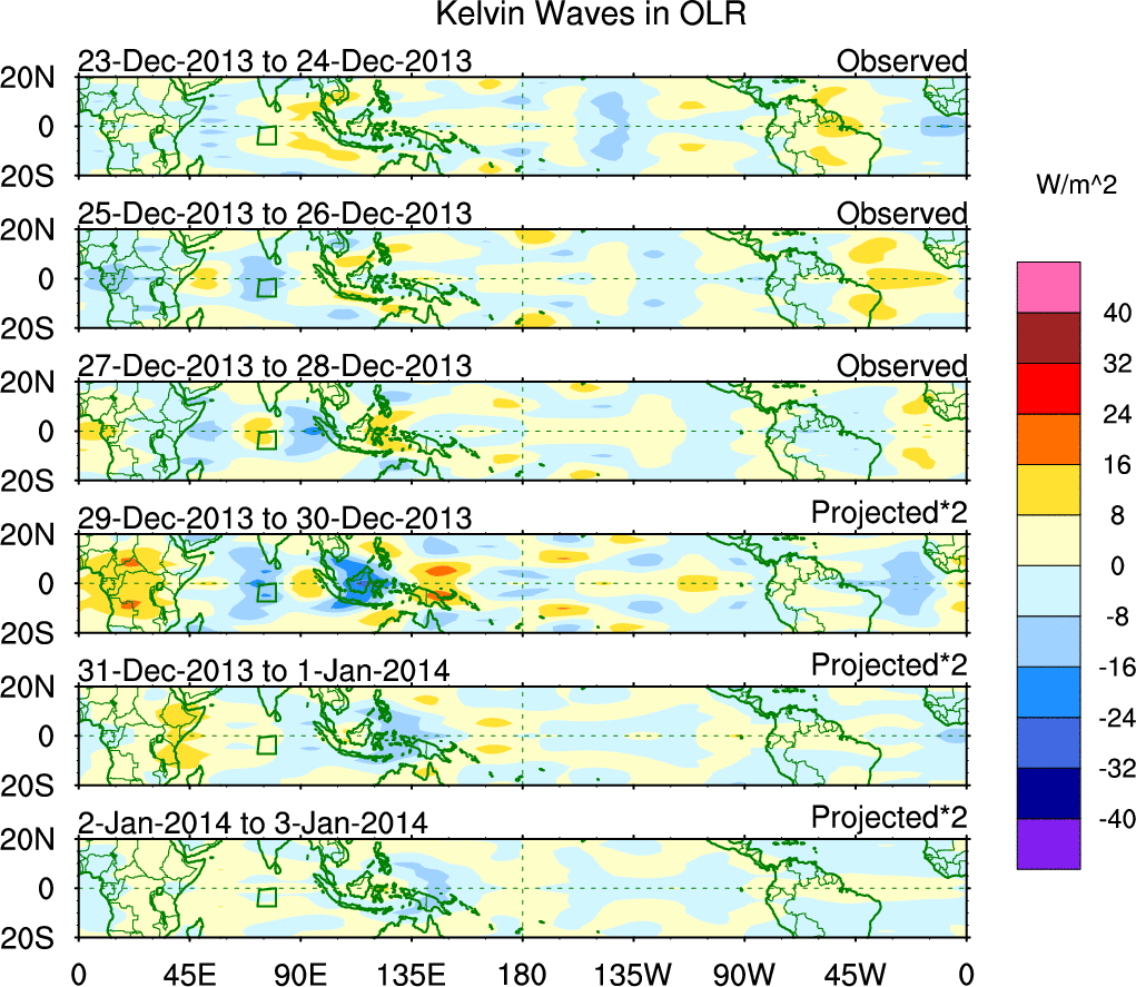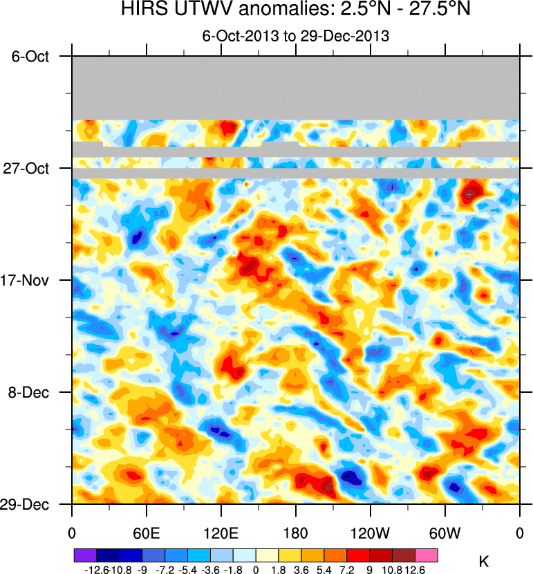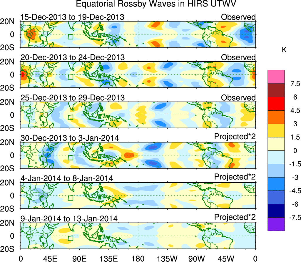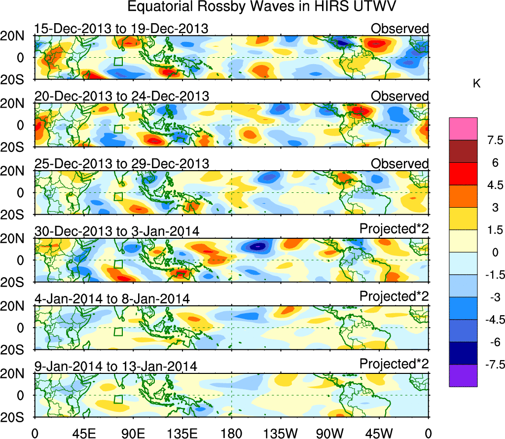 To identify tropical waves in near real-time, the OLR and UTWV data are filtered following Wheeler & Weickmann (2001 MWR). The daily anomalies are calculated using the first 3 harmonics of the seasonal cycle for 1979–2009. Missing values are then filled using linear interpolation in space and time. The most recent 365 days of anomalies are padded with 659 days of zeroes, and the result is filtered for each wave type.