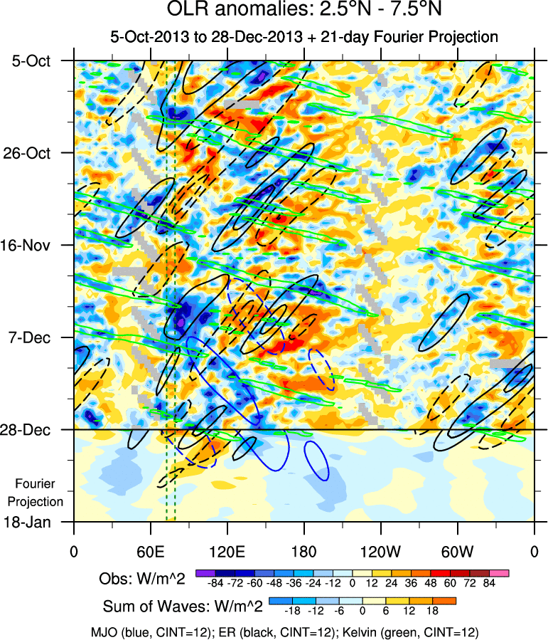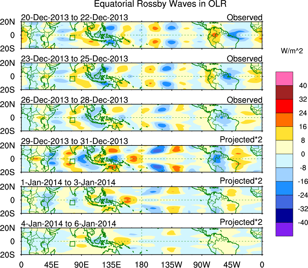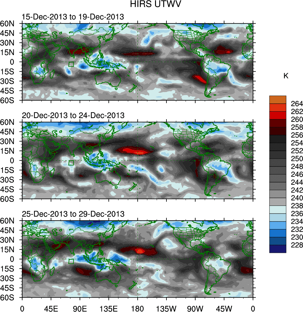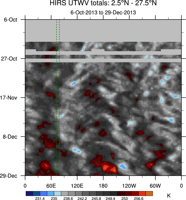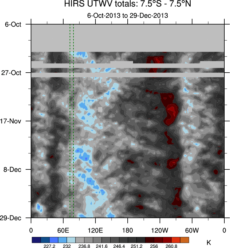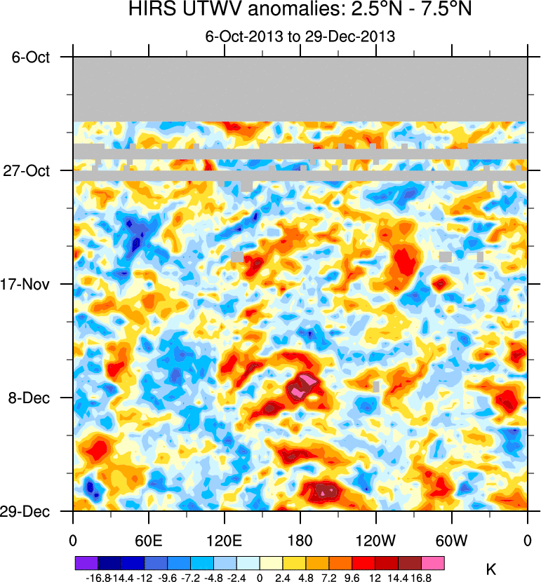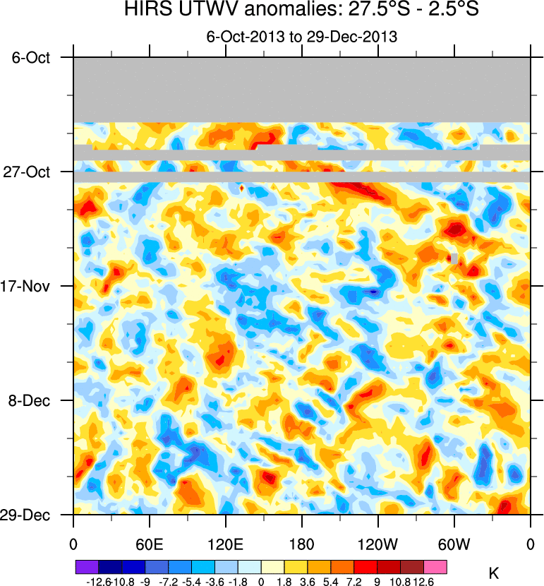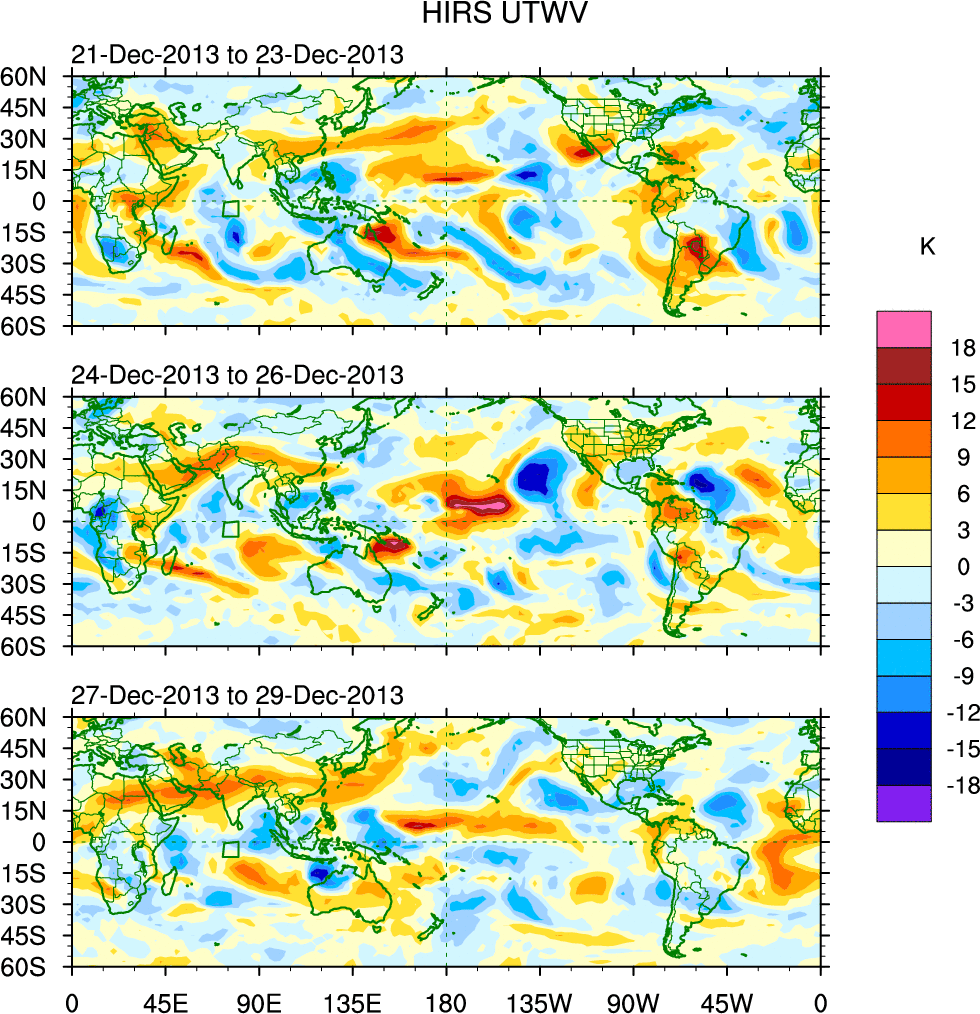 To identify tropical waves in near real-time, the OLR and UTWV data are filtered following Wheeler & Weickmann (2001 MWR). The daily anomalies are calculated using the first 3 harmonics of the seasonal cycle for 1979–2009. Missing values are then filled using linear interpolation in space and time. The most recent 365 days of anomalies are padded with 659 days of zeroes, and the result is filtered for each wave type.