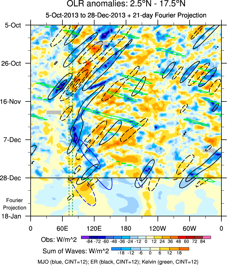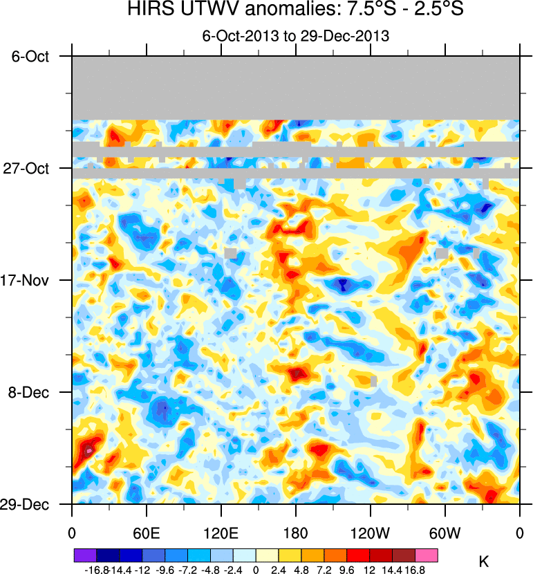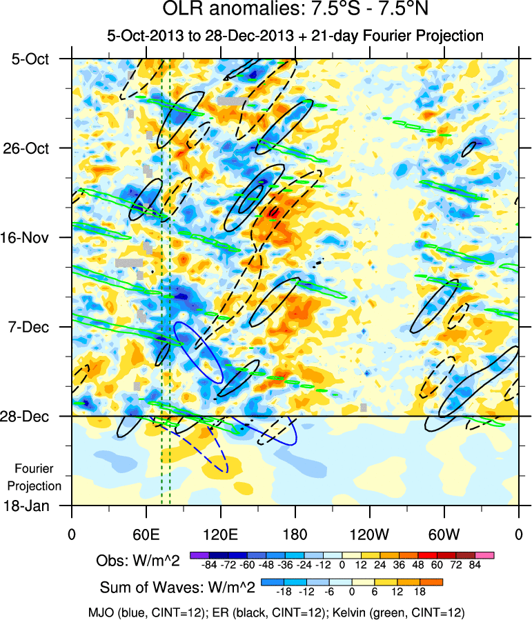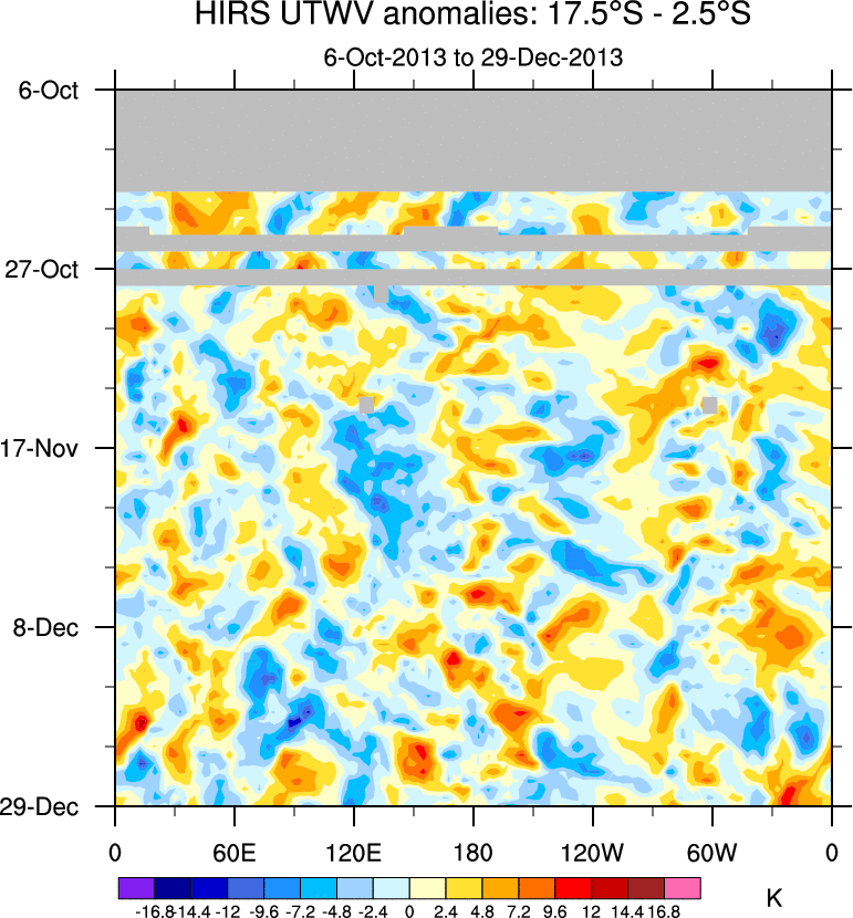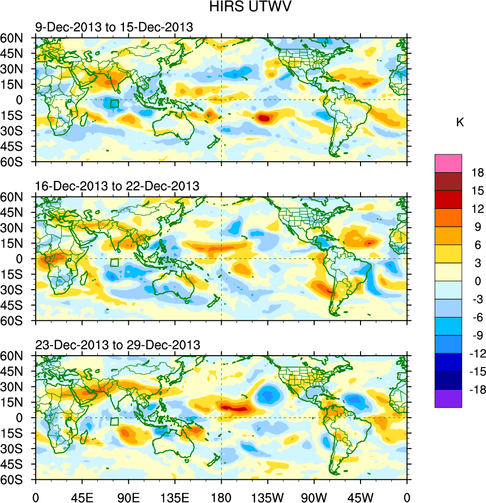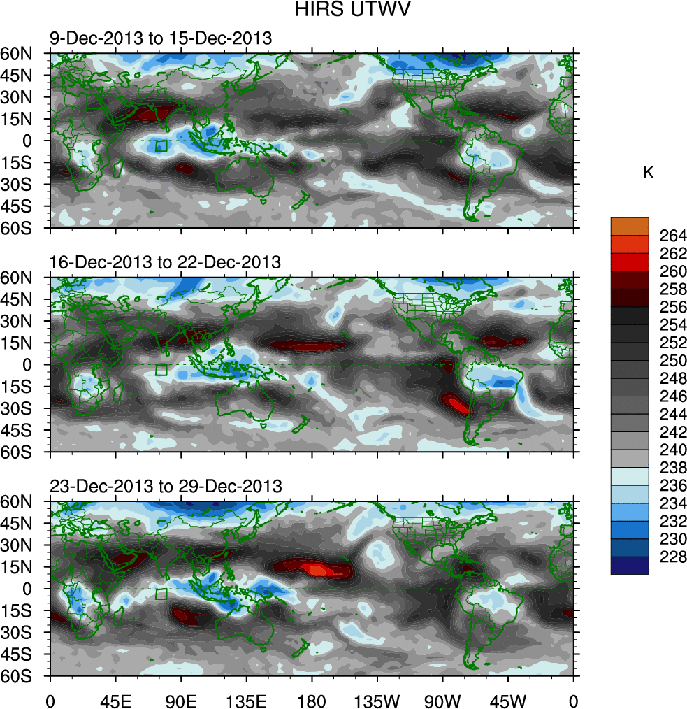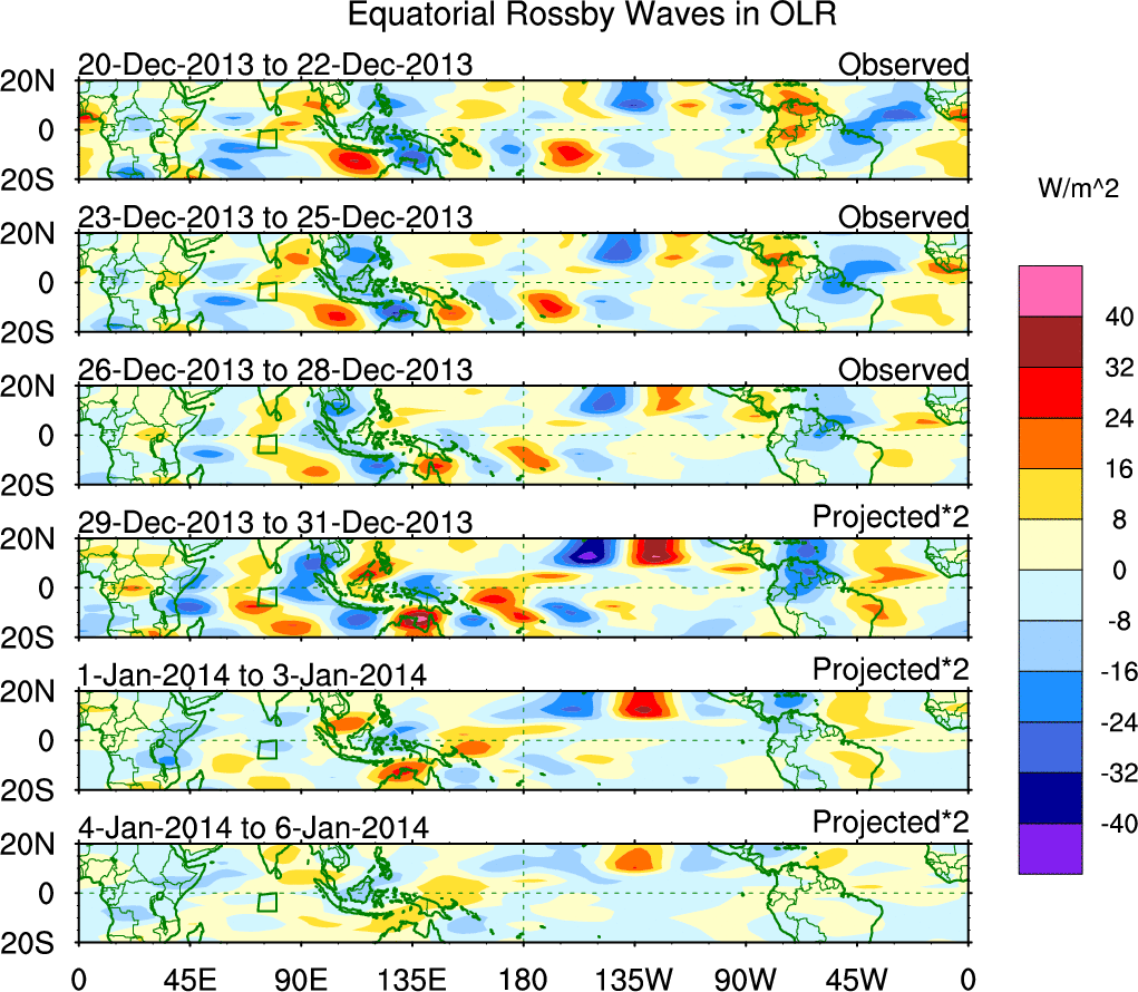 To identify tropical waves in near real-time, the OLR and UTWV data are filtered following Wheeler & Weickmann (2001 MWR). The daily anomalies are calculated using the first 3 harmonics of the seasonal cycle for 1979–2009. Missing values are then filled using linear interpolation in space and time. The most recent 365 days of anomalies are padded with 659 days of zeroes, and the result is filtered for each wave type.