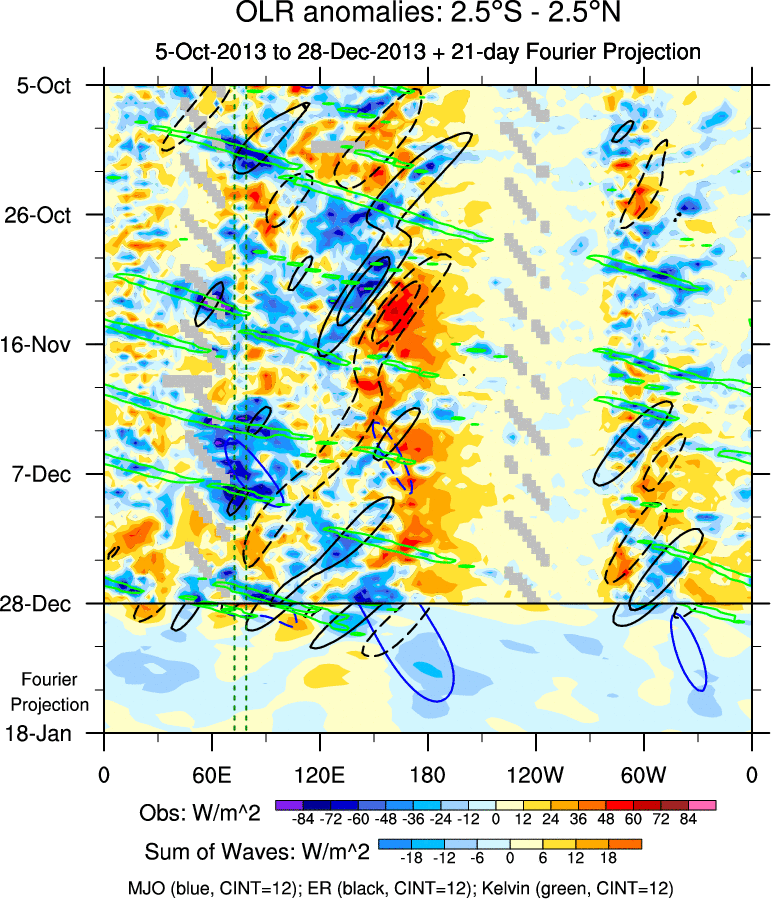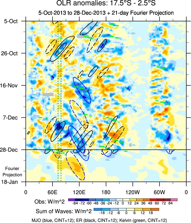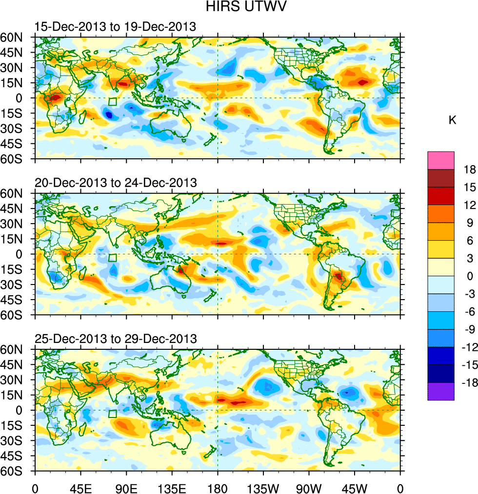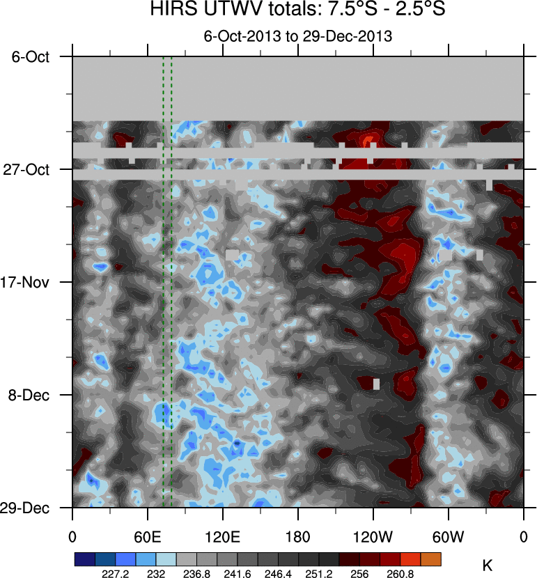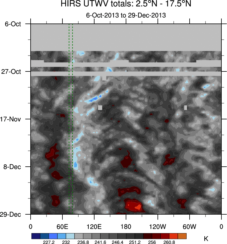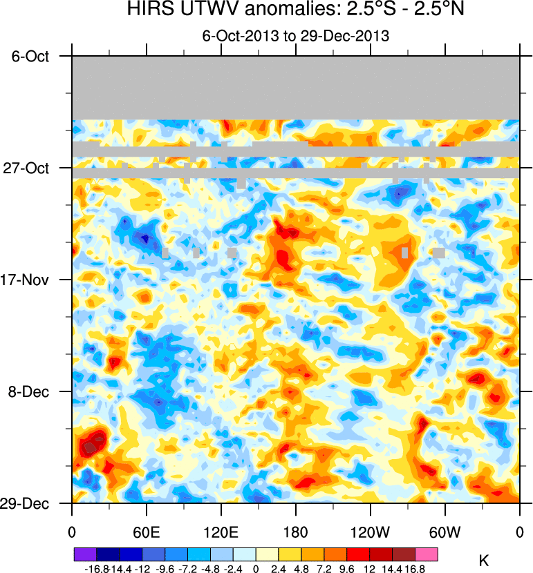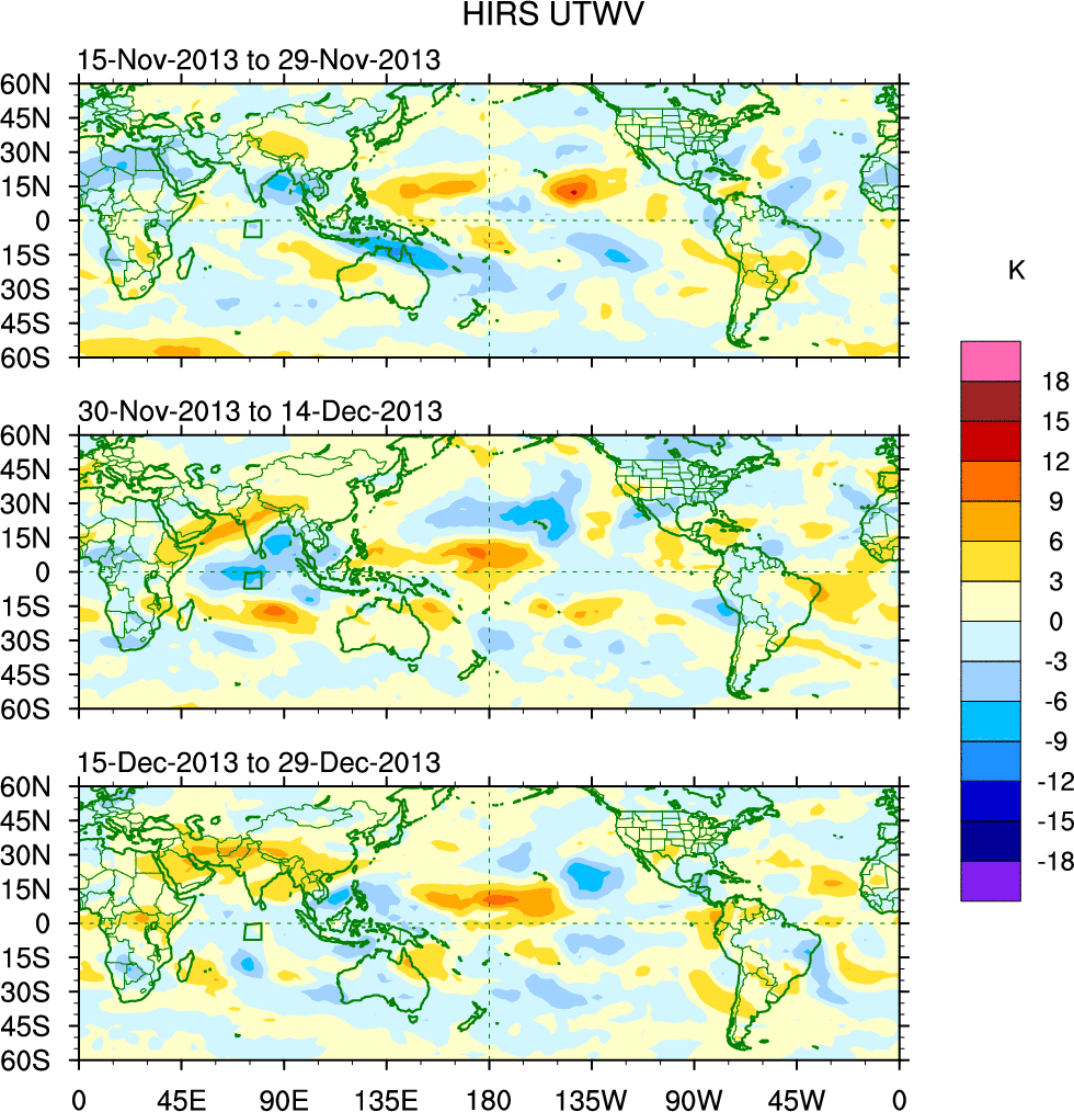 To identify tropical waves in near real-time, the OLR and UTWV data are filtered following Wheeler & Weickmann (2001 MWR). The daily anomalies are calculated using the first 3 harmonics of the seasonal cycle for 1979–2009. Missing values are then filled using linear interpolation in space and time. The most recent 365 days of anomalies are padded with 659 days of zeroes, and the result is filtered for each wave type.