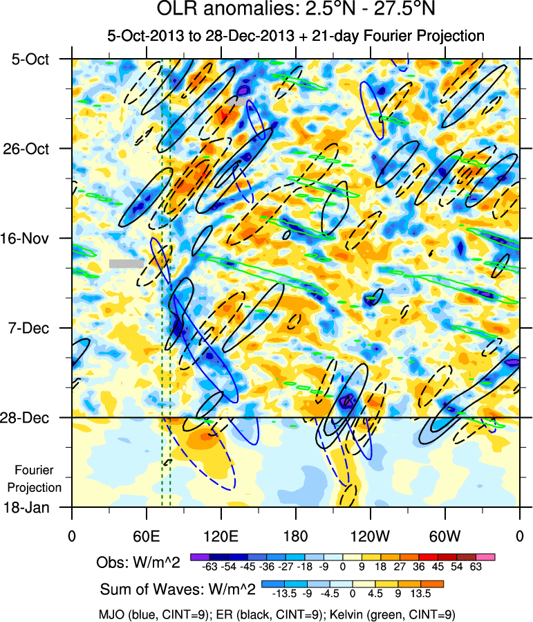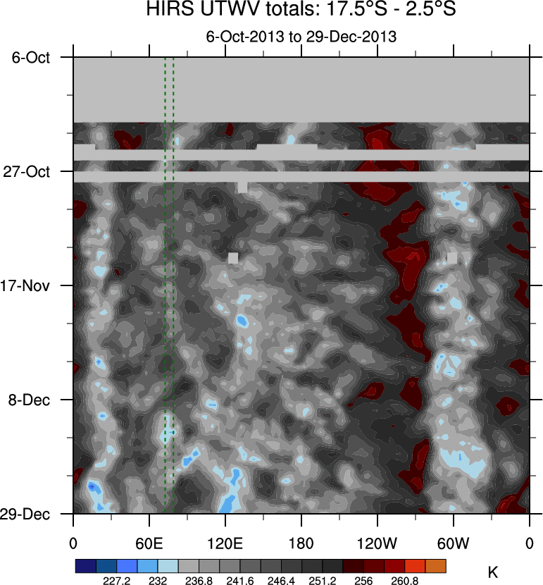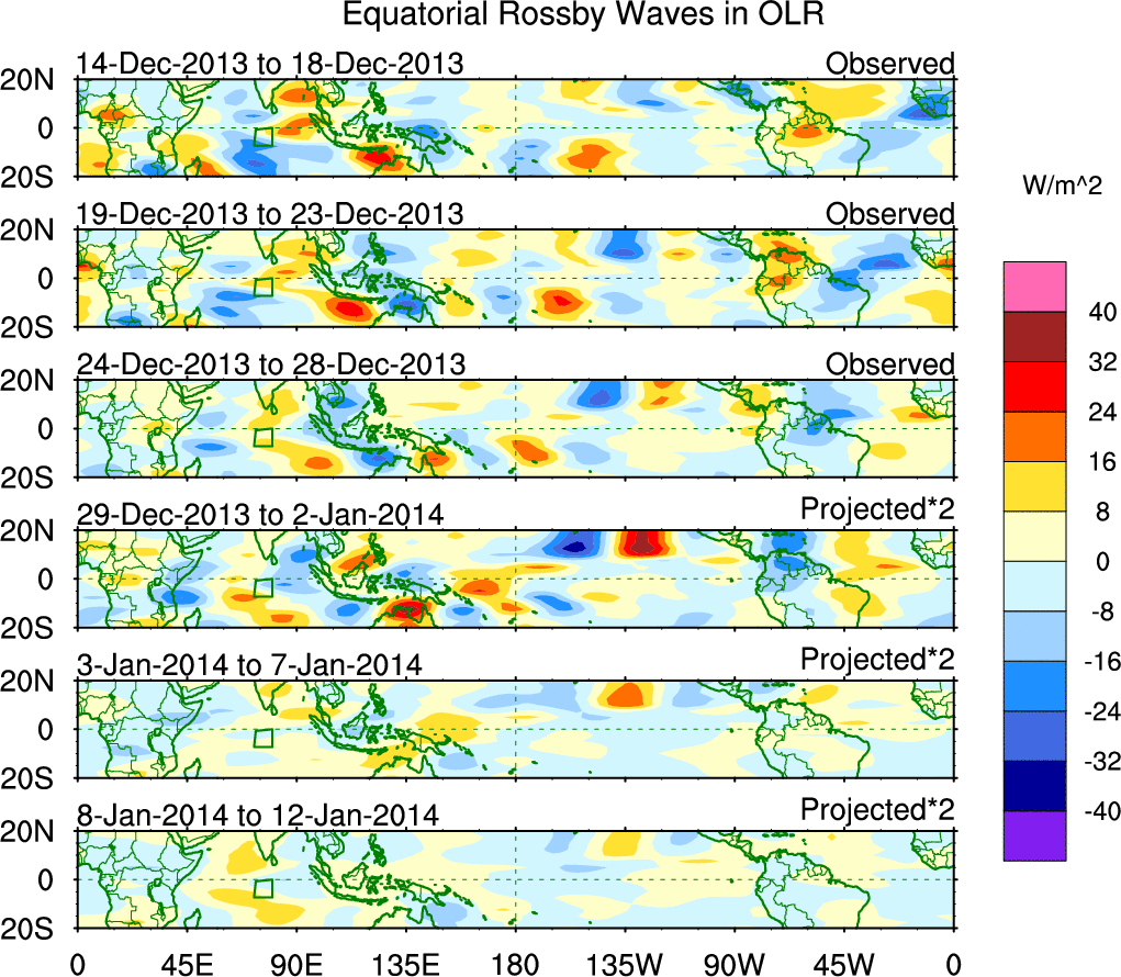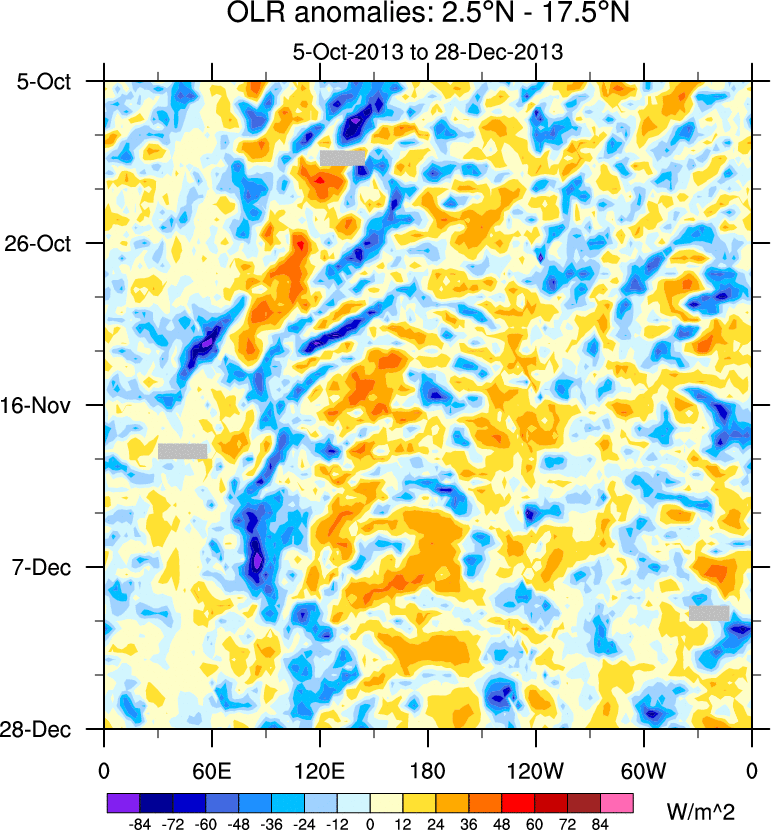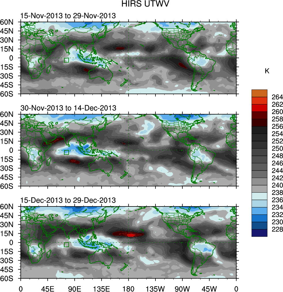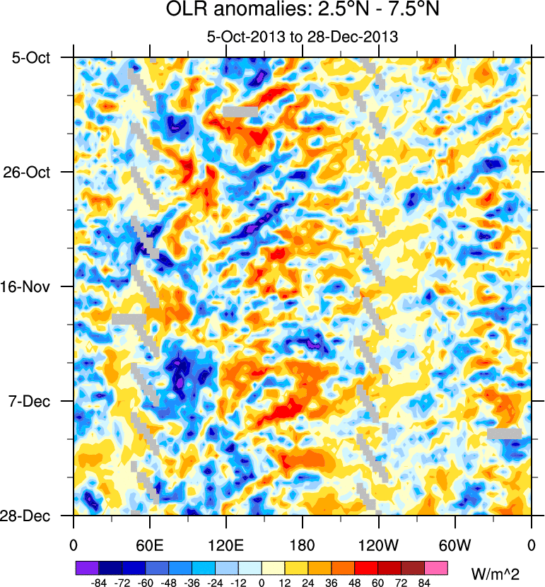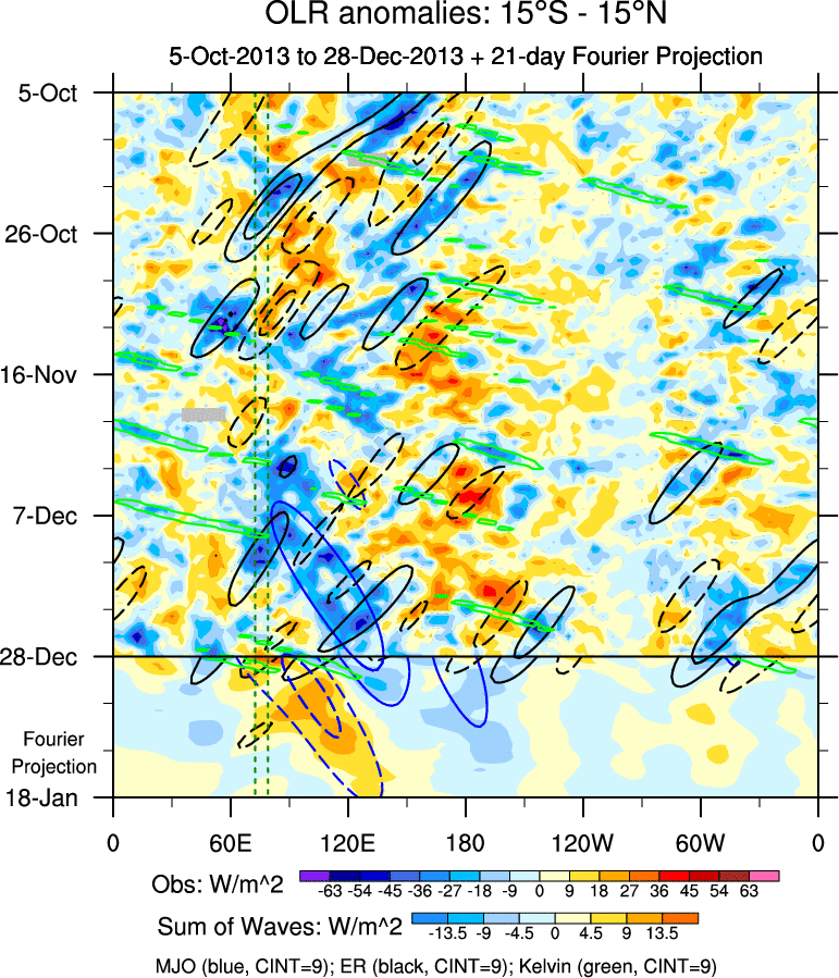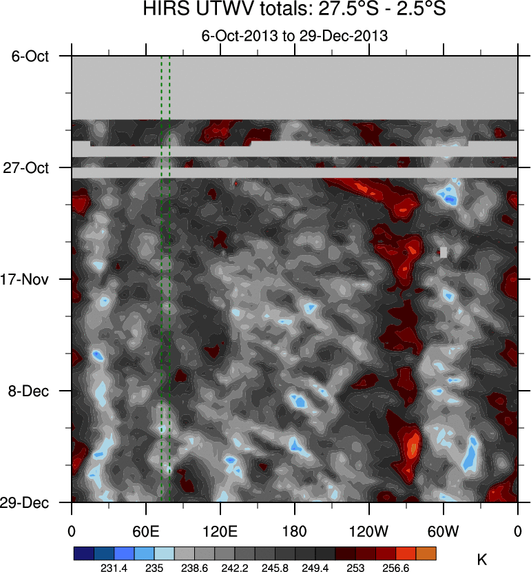 To identify tropical waves in near real-time, the OLR and UTWV data are filtered following Wheeler & Weickmann (2001 MWR). The daily anomalies are calculated using the first 3 harmonics of the seasonal cycle for 1979–2009. Missing values are then filled using linear interpolation in space and time. The most recent 365 days of anomalies are padded with 659 days of zeroes, and the result is filtered for each wave type.