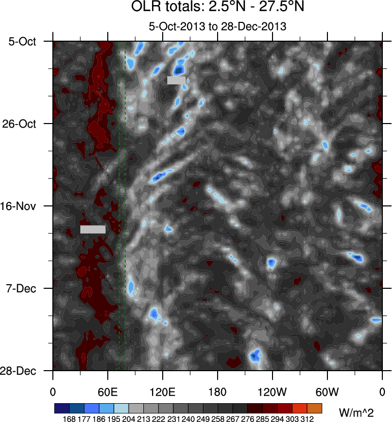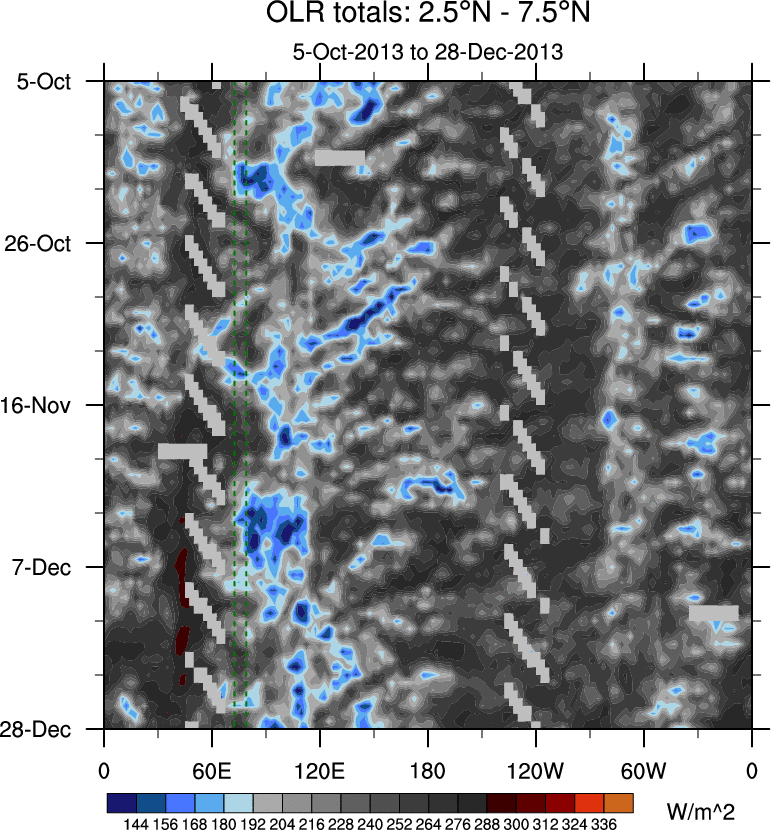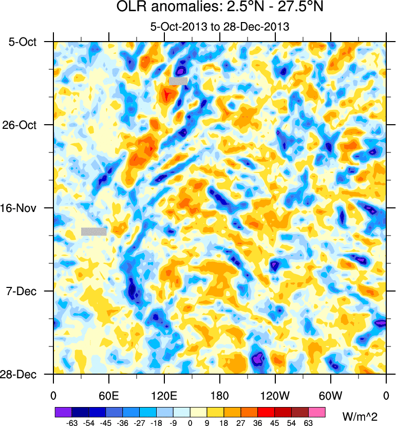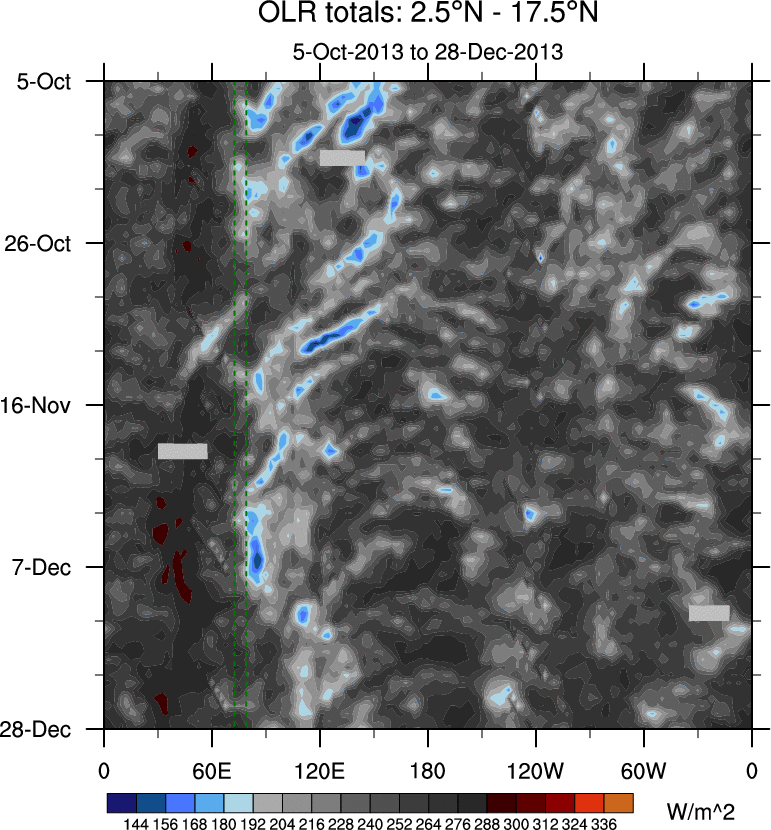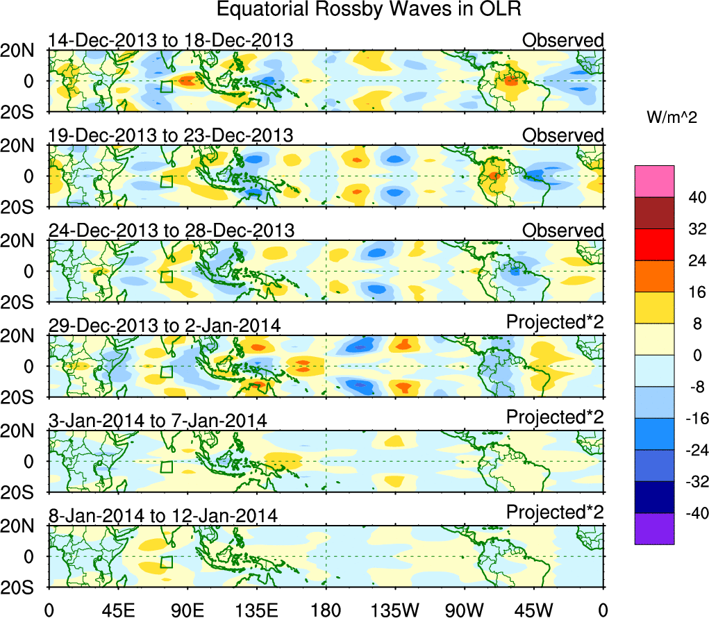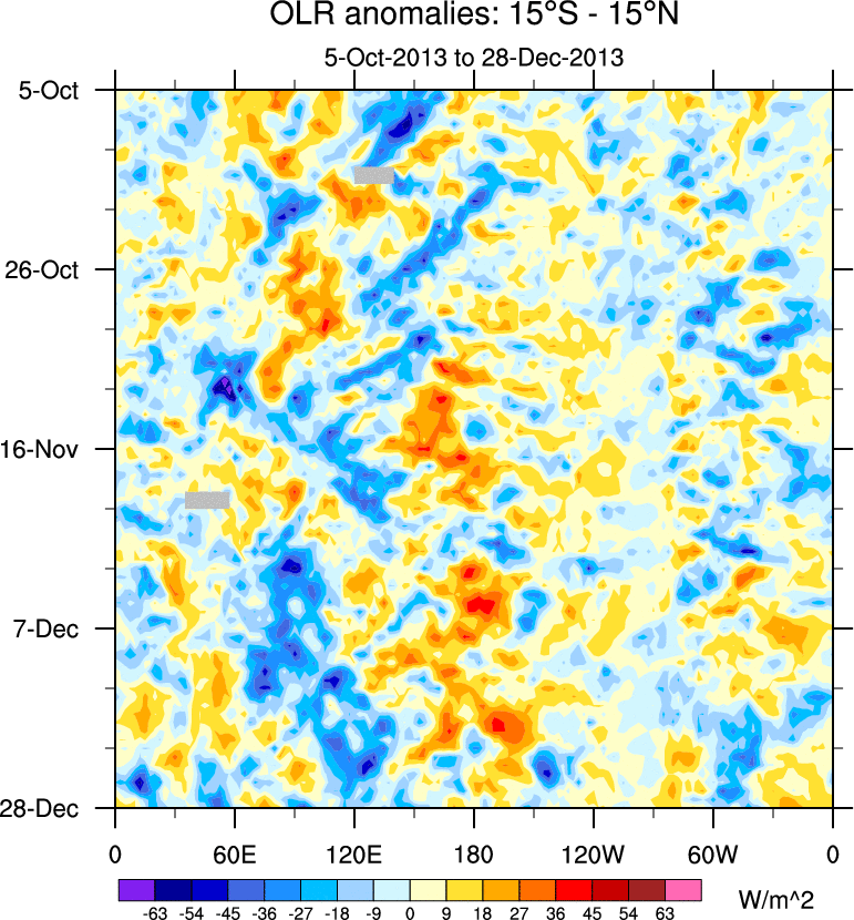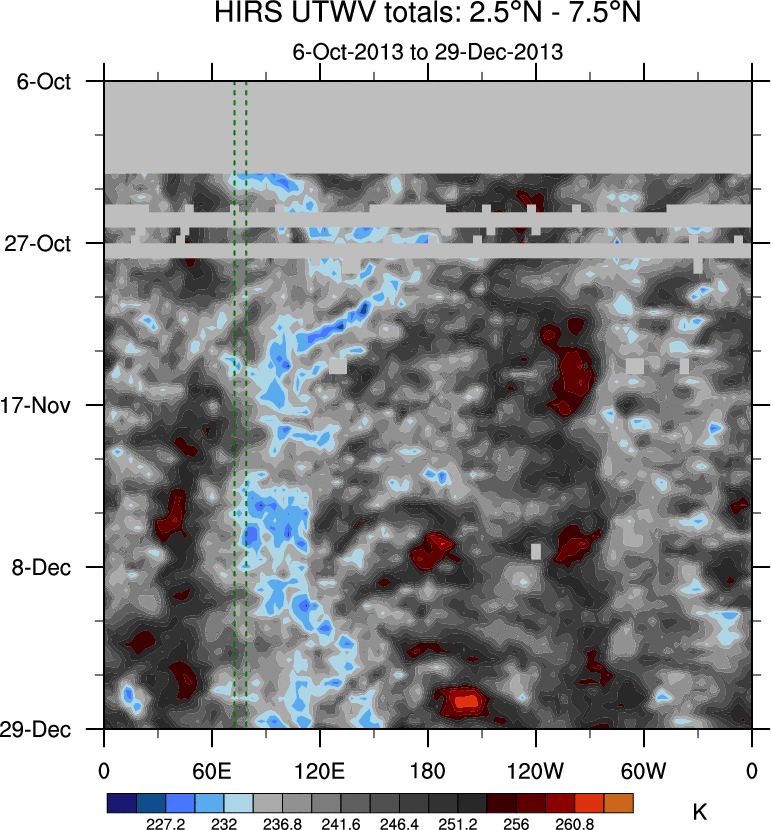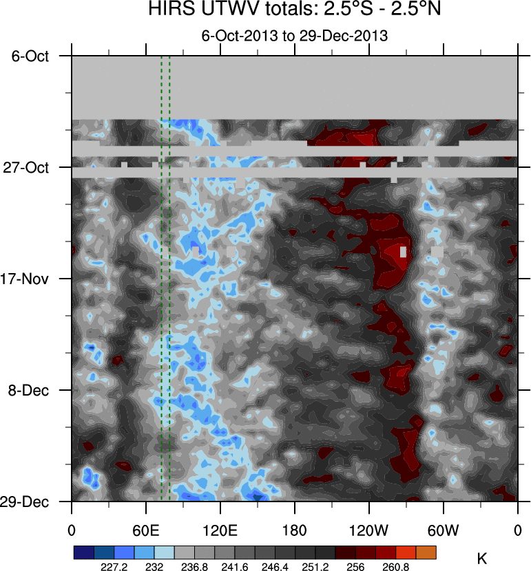 To identify tropical waves in near real-time, the OLR and UTWV data are filtered following Wheeler & Weickmann (2001 MWR). The daily anomalies are calculated using the first 3 harmonics of the seasonal cycle for 1979–2009. Missing values are then filled using linear interpolation in space and time. The most recent 365 days of anomalies are padded with 659 days of zeroes, and the result is filtered for each wave type.