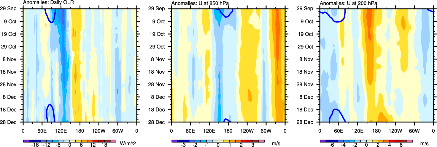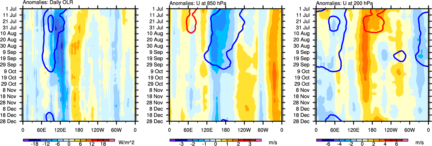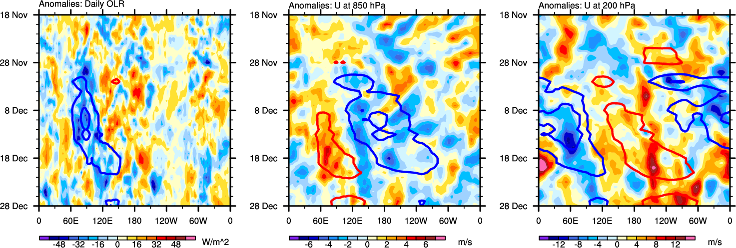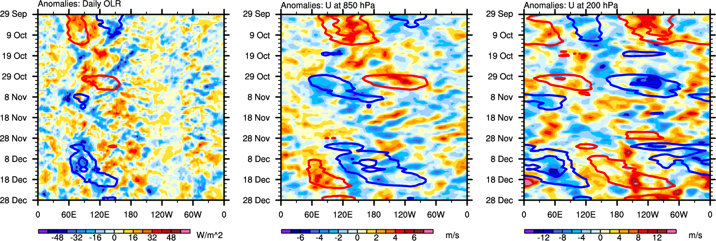 The Hovmollers show longitude-time plots for OLR, U-850, and U-200. The shading indicates the observed anomalies, while the contours are the projection of those anomalies onto the RMM EOFs.