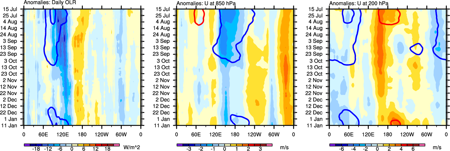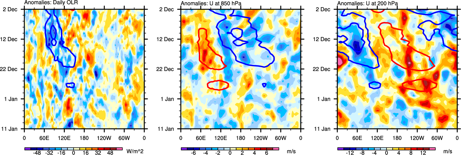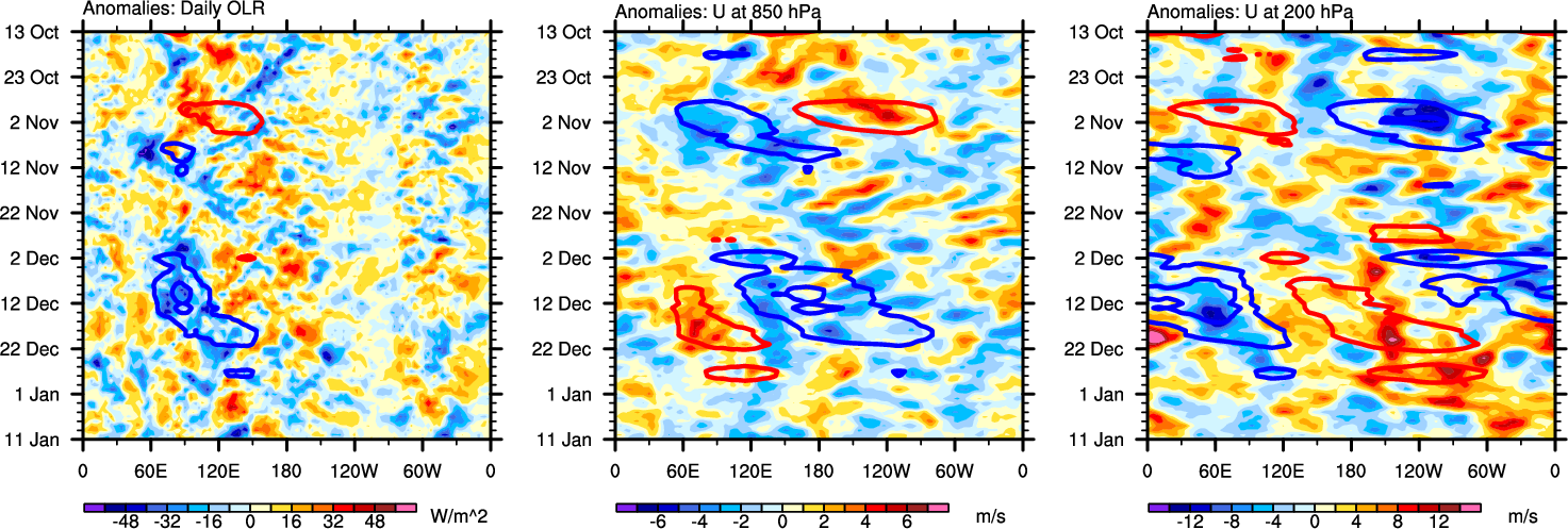 The Hovmollers show longitude-time plots for OLR, U-850, and U-200. The shading indicates the observed anomalies, while the contours are the projection of those anomalies onto the RMM EOFs.