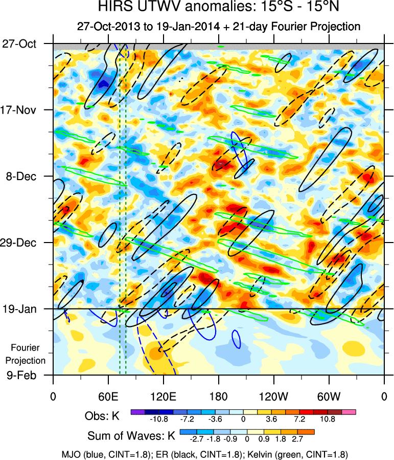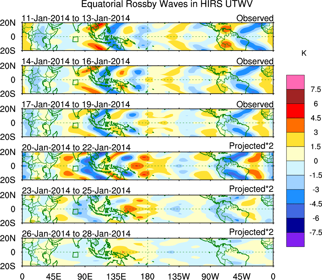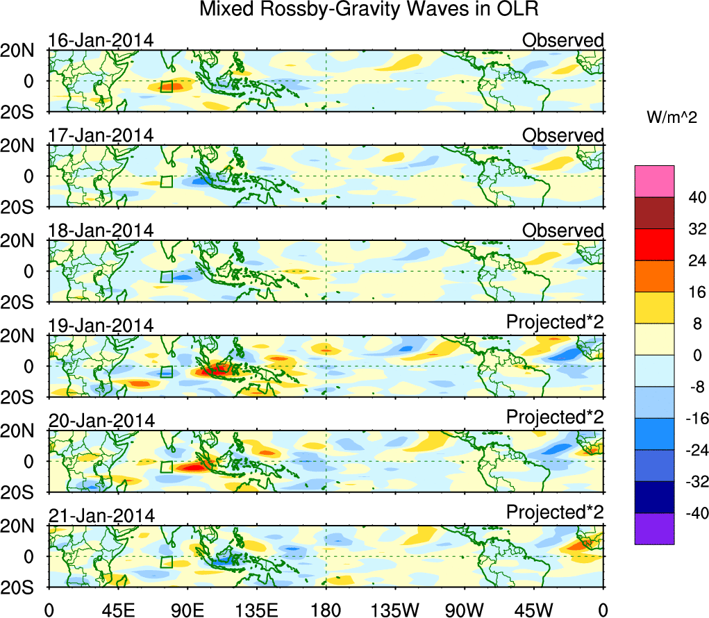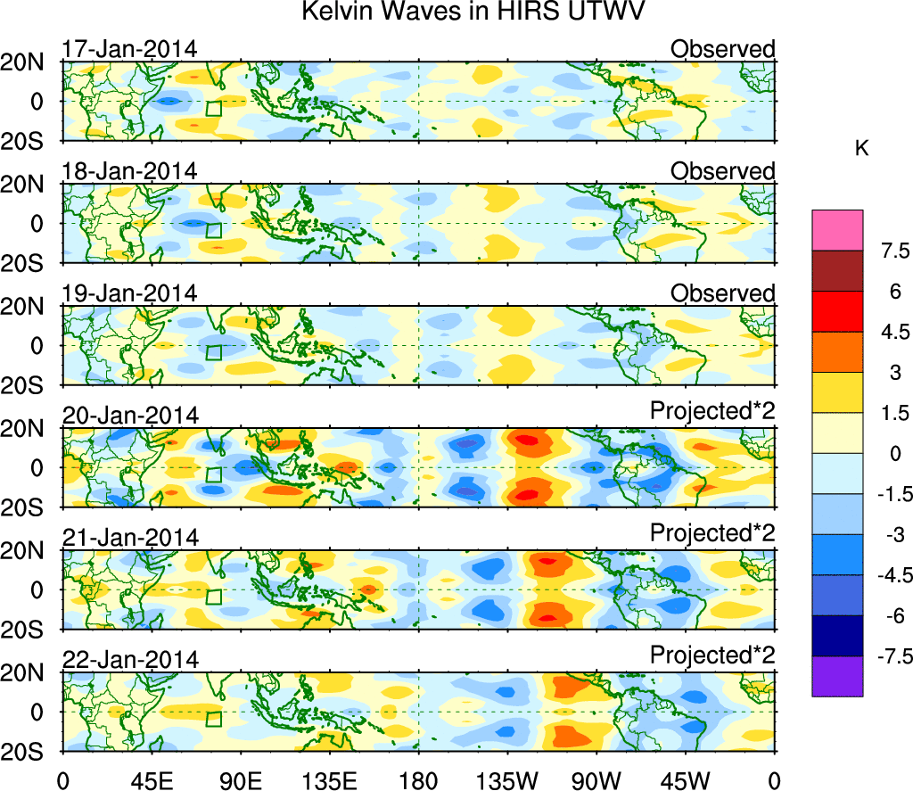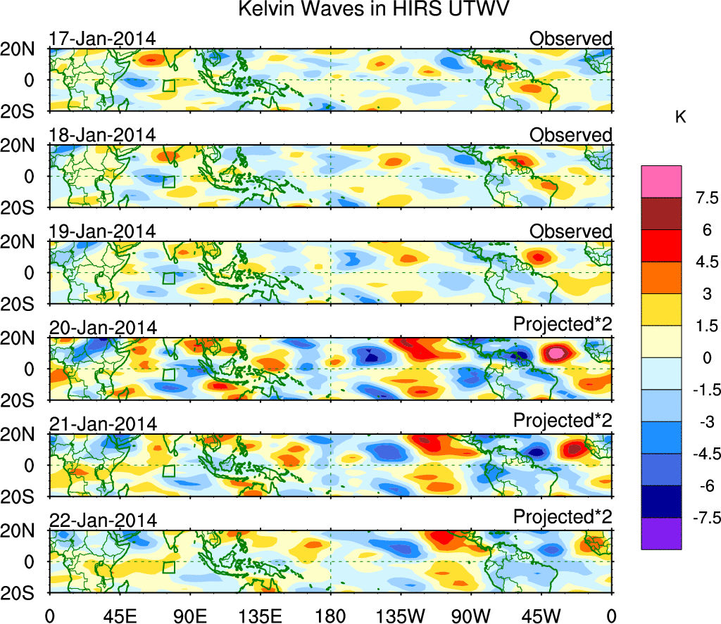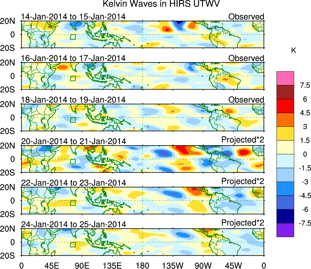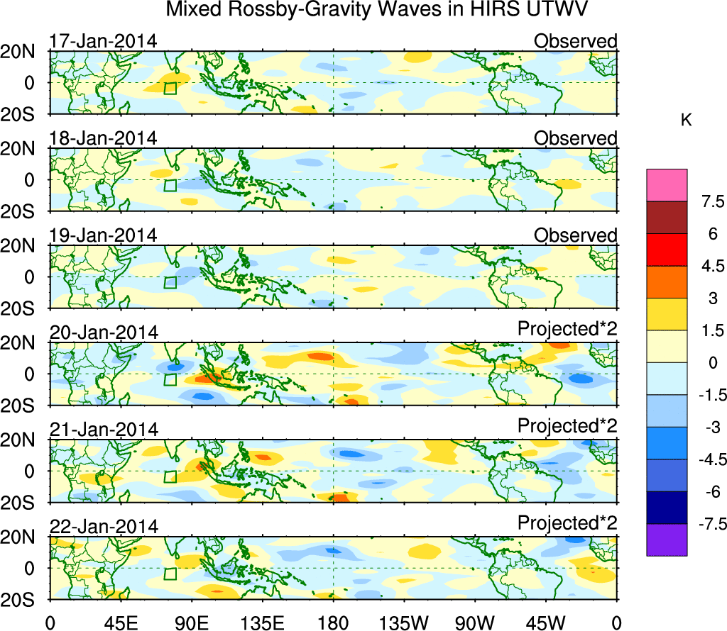 To identify tropical waves in near real-time, the OLR and UTWV data are filtered following Wheeler & Weickmann (2001 MWR). The daily anomalies are calculated using the first 3 harmonics of the seasonal cycle for 1979–2009. Missing values are then filled using linear interpolation in space and time. The most recent 365 days of anomalies are padded with 659 days of zeroes, and the result is filtered for each wave type.
