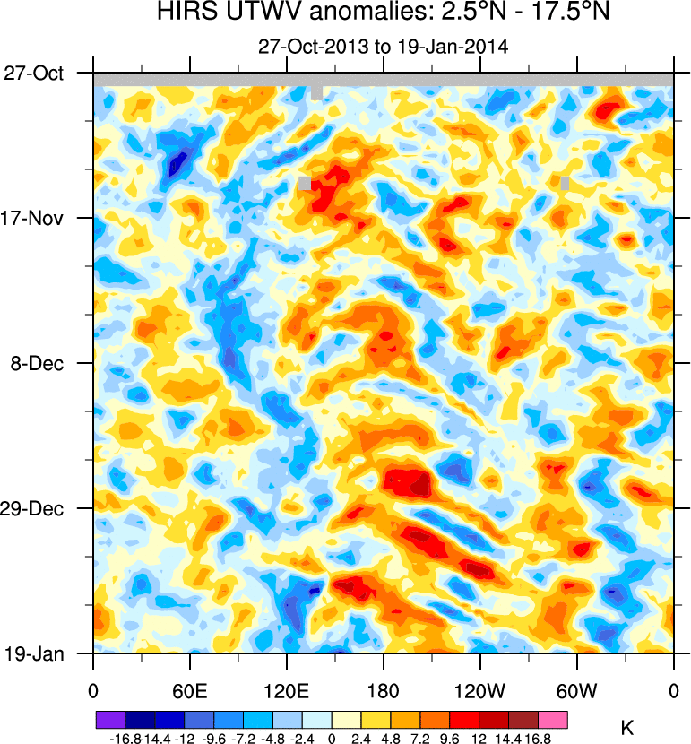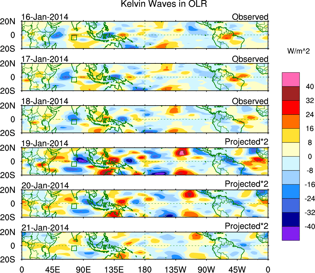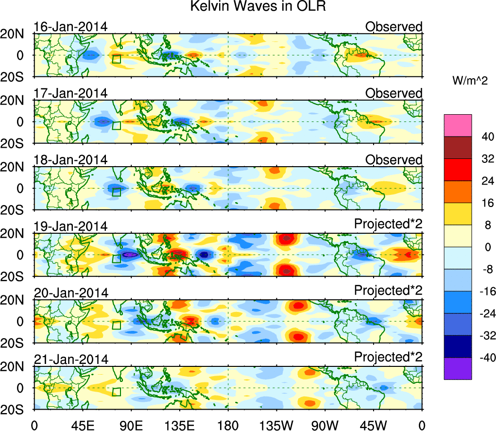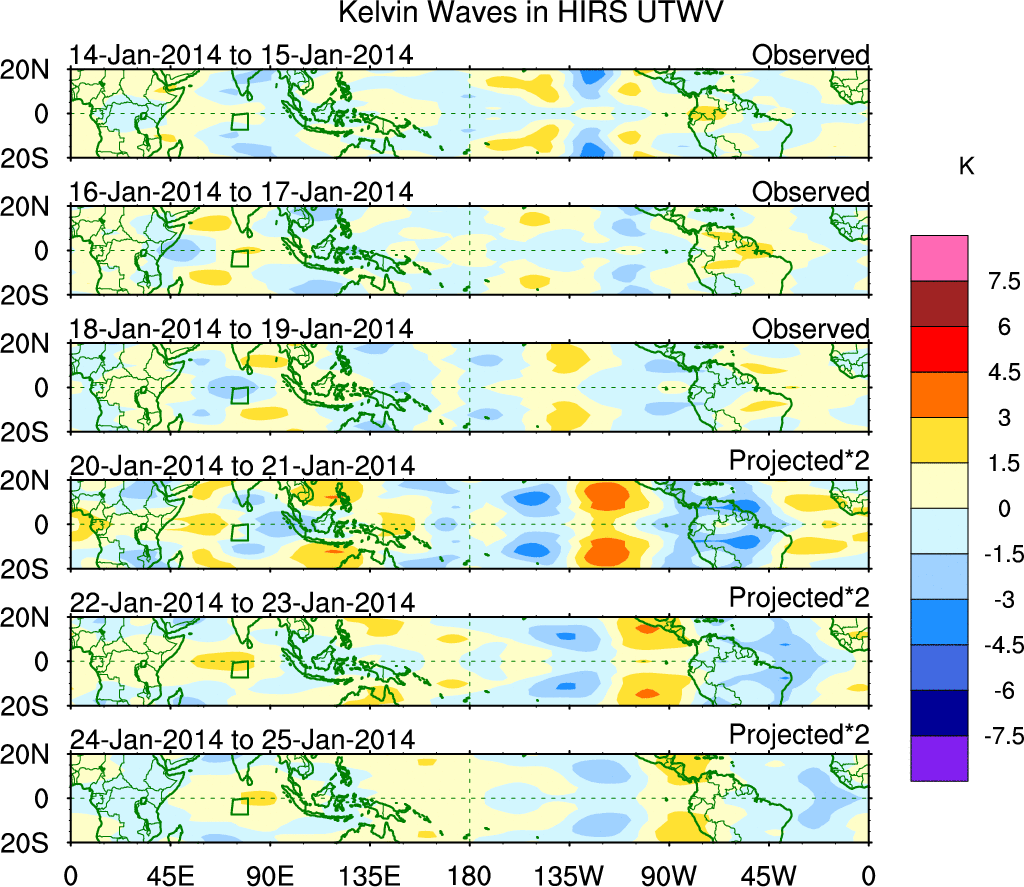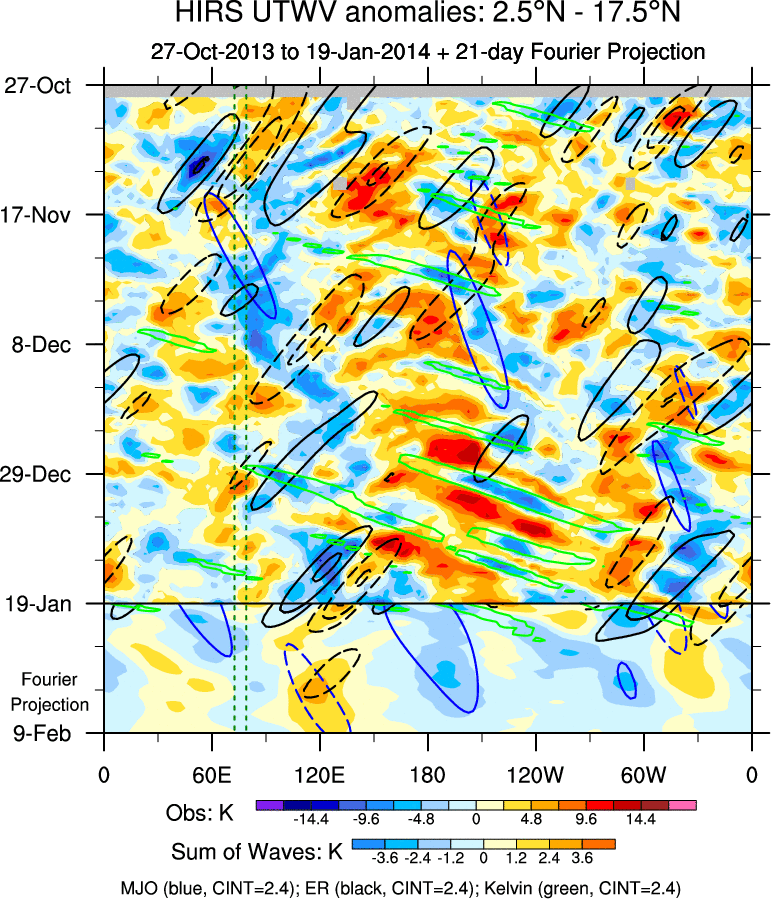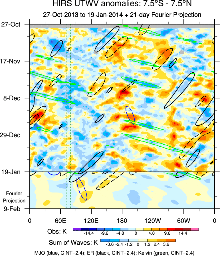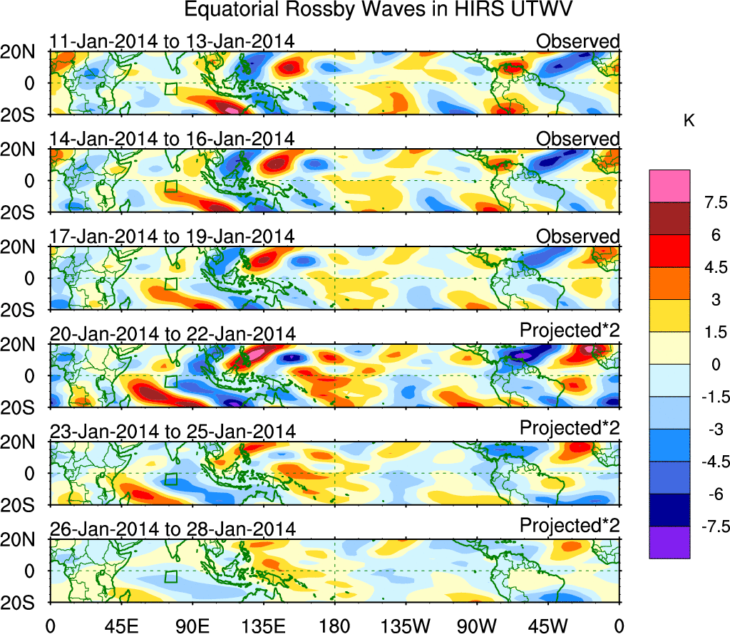To identify tropical waves in near real-time, the OLR and UTWV data are filtered following Wheeler & Weickmann (2001 MWR). The daily anomalies are calculated using the first 3 harmonics of the seasonal cycle for 1979–2009. Missing values are then filled using linear interpolation in space and time. The most recent 365 days of anomalies are padded with 659 days of zeroes, and the result is filtered for each wave type.