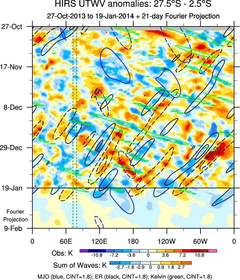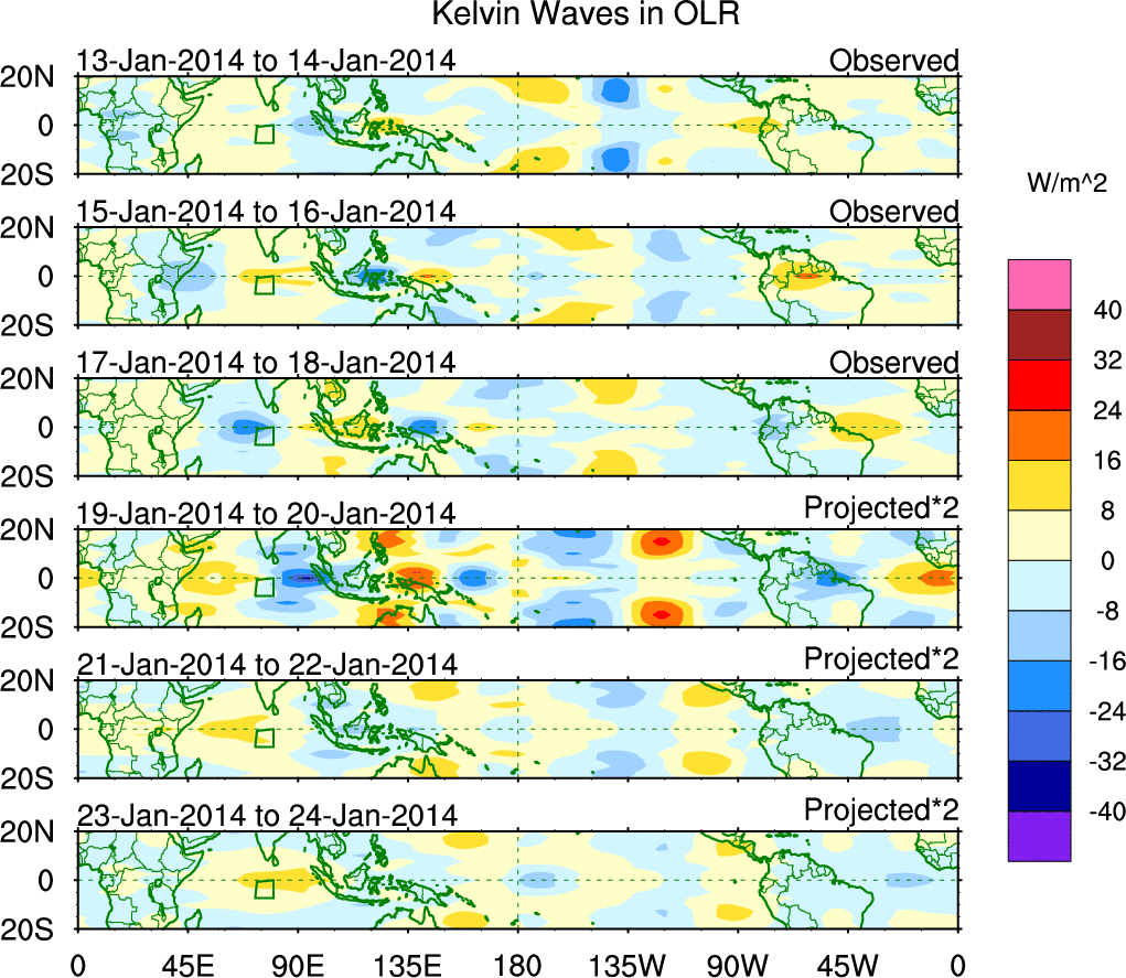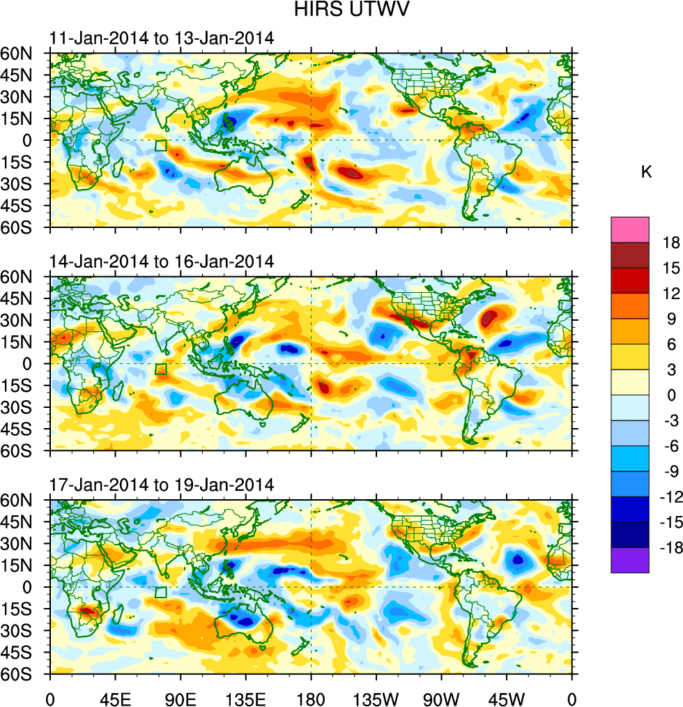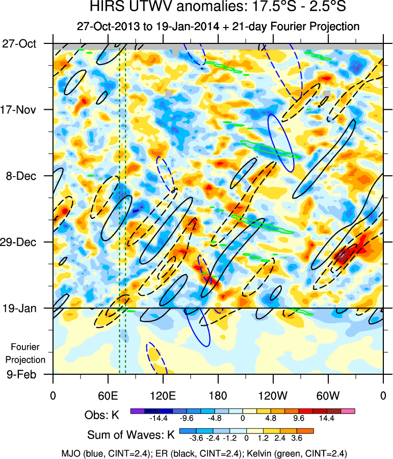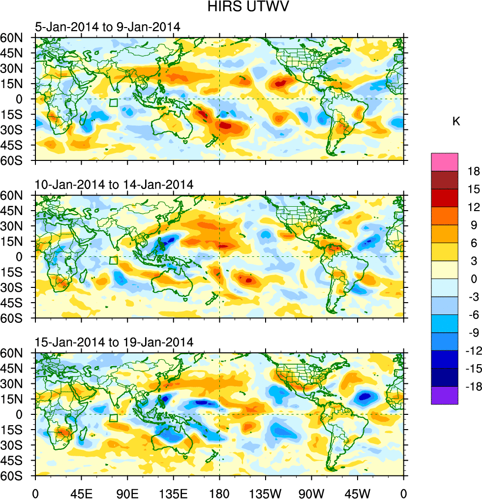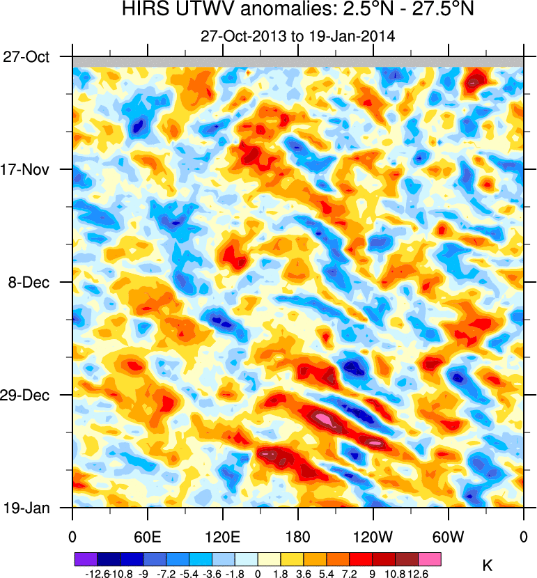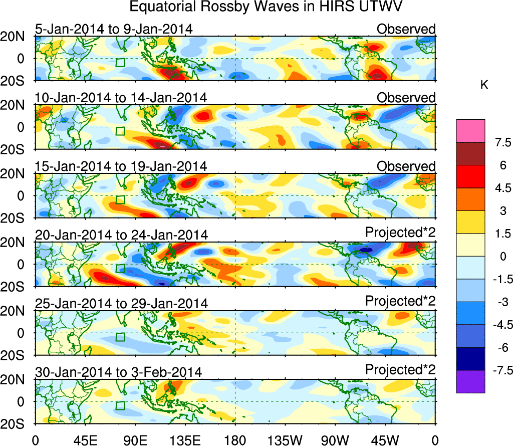 To identify tropical waves in near real-time, the OLR and UTWV data are filtered following Wheeler & Weickmann (2001 MWR). The daily anomalies are calculated using the first 3 harmonics of the seasonal cycle for 1979–2009. Missing values are then filled using linear interpolation in space and time. The most recent 365 days of anomalies are padded with 659 days of zeroes, and the result is filtered for each wave type.