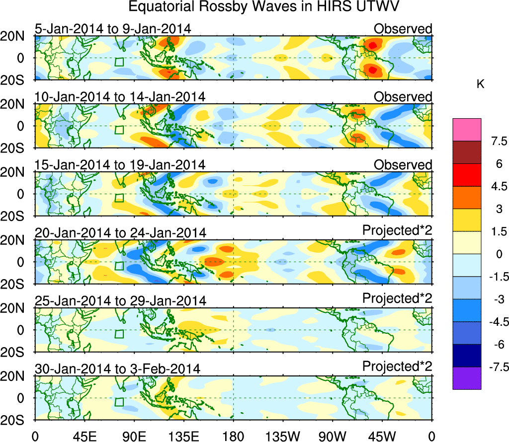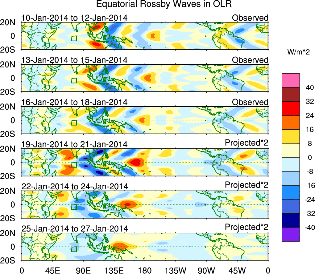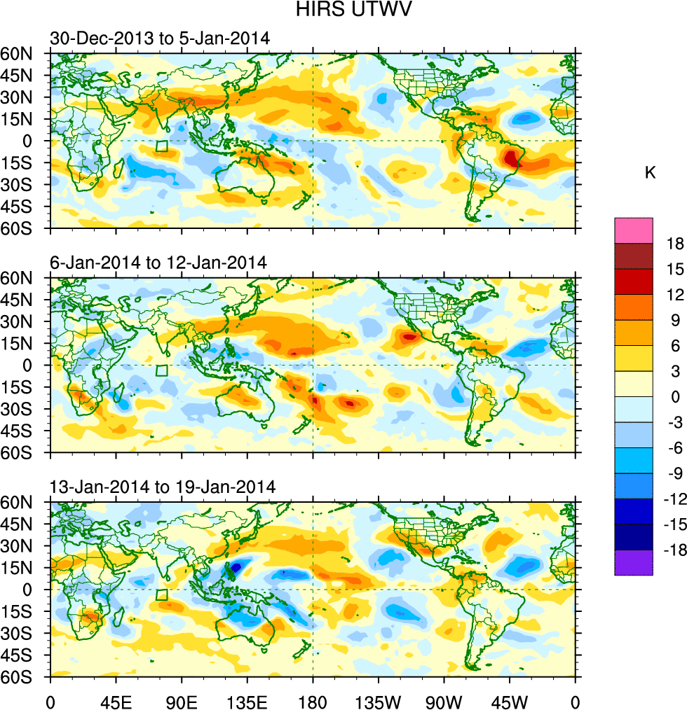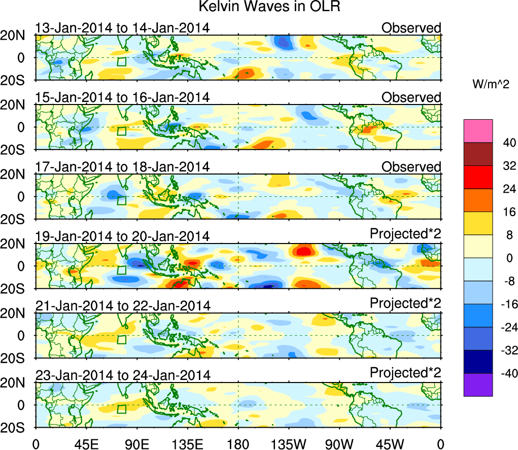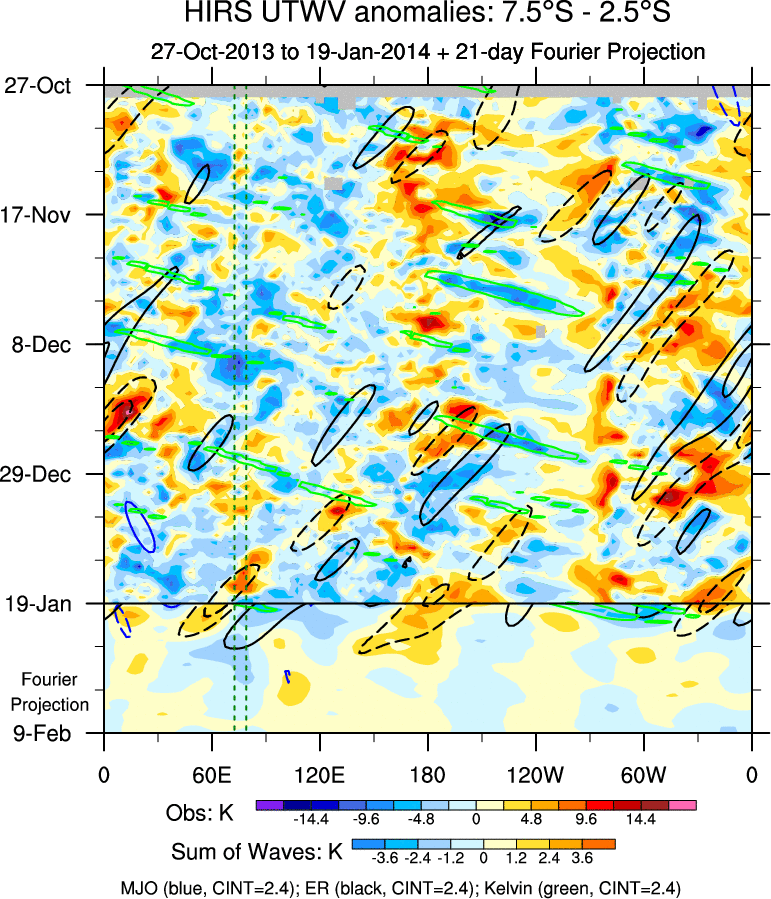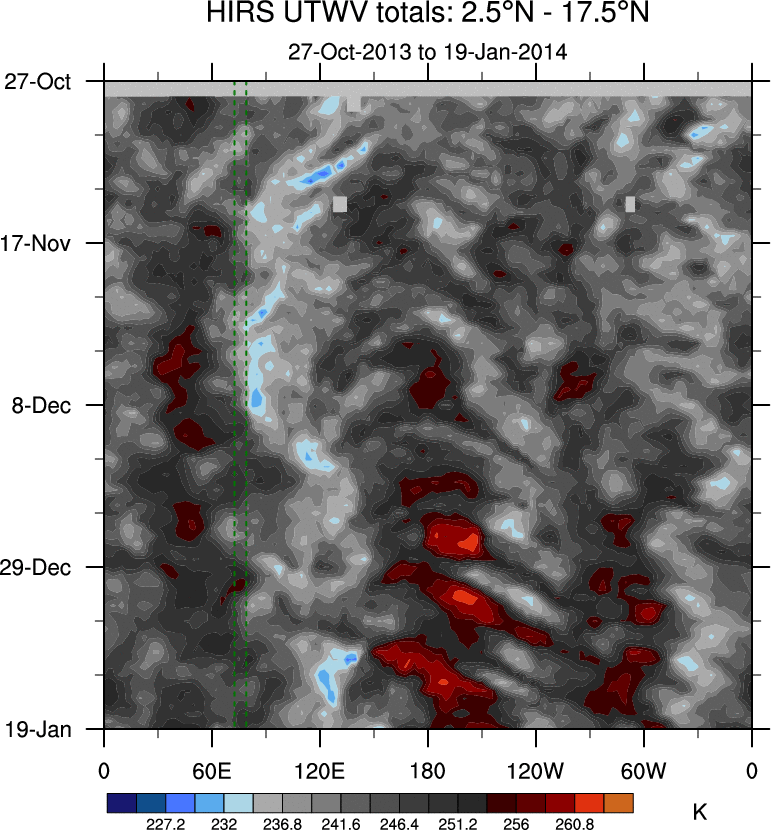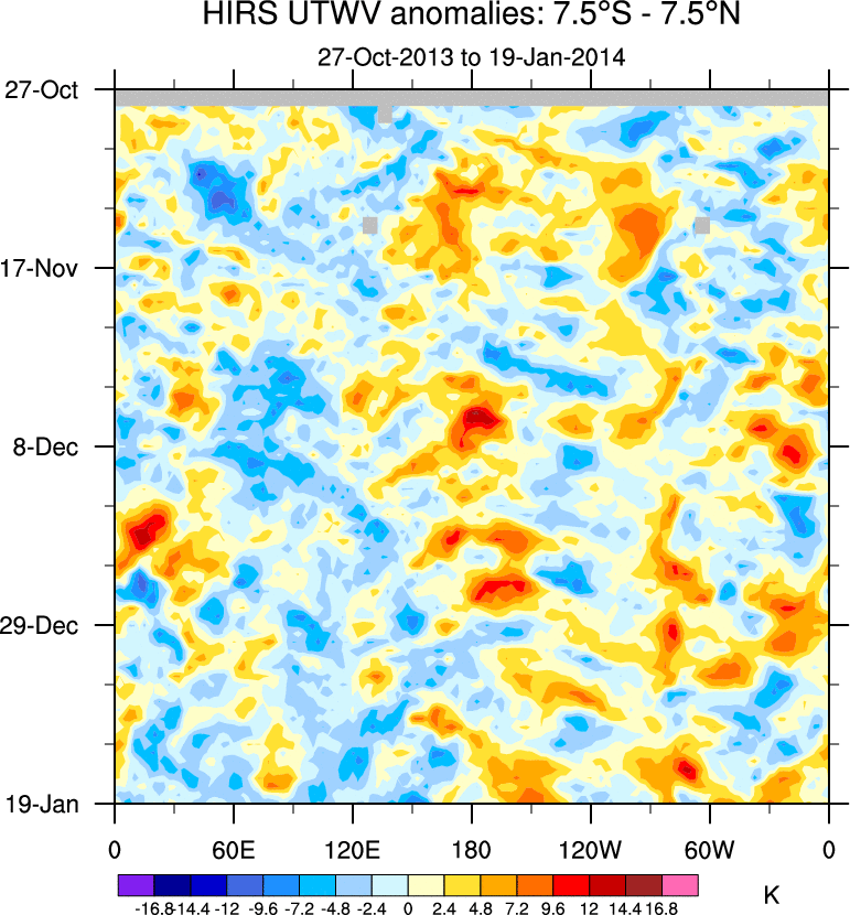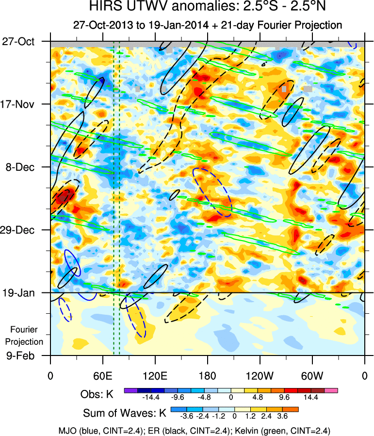 To identify tropical waves in near real-time, the OLR and UTWV data are filtered following Wheeler & Weickmann (2001 MWR). The daily anomalies are calculated using the first 3 harmonics of the seasonal cycle for 1979–2009. Missing values are then filled using linear interpolation in space and time. The most recent 365 days of anomalies are padded with 659 days of zeroes, and the result is filtered for each wave type.