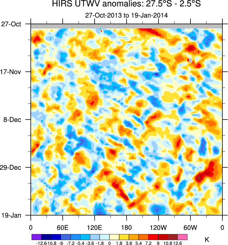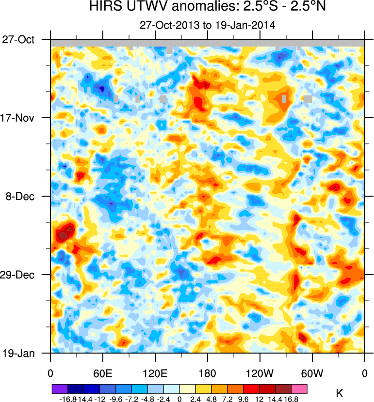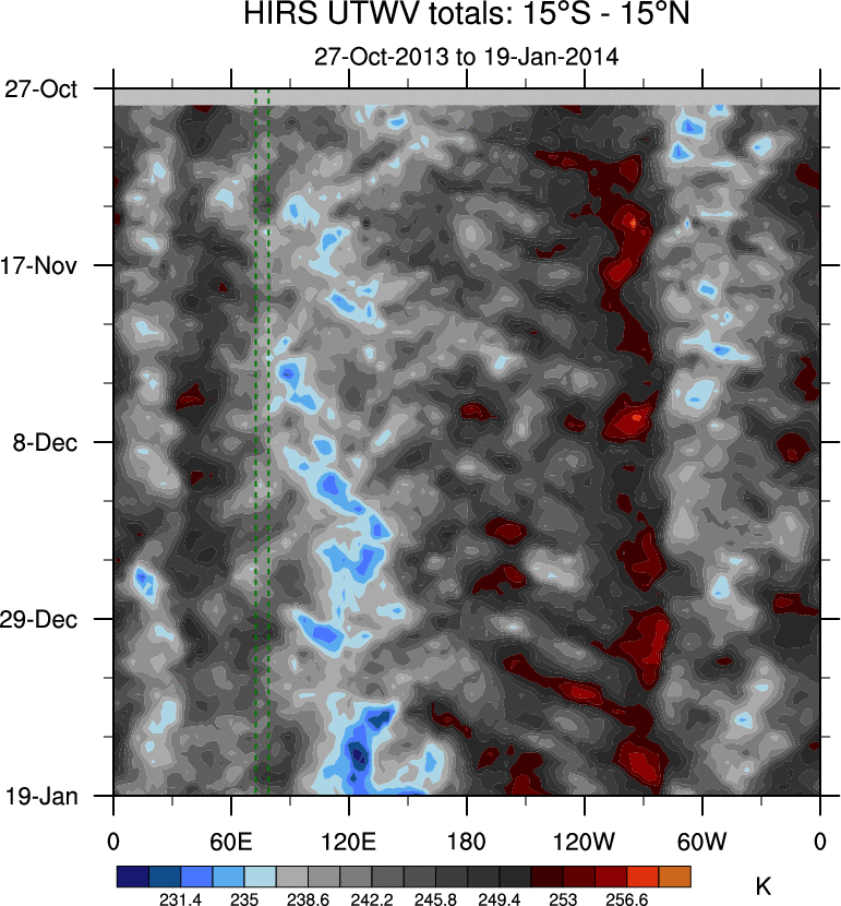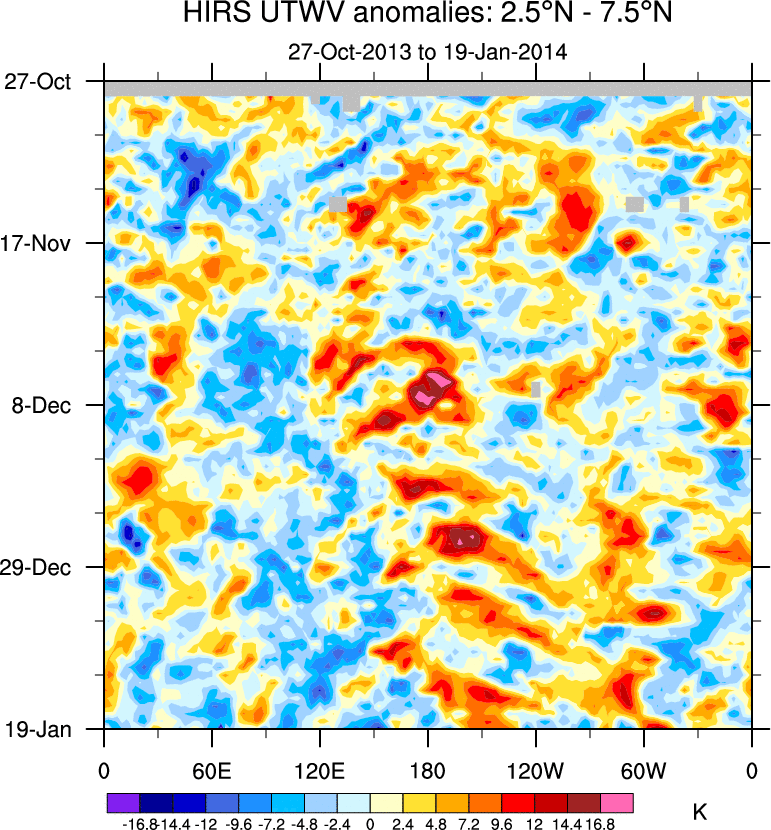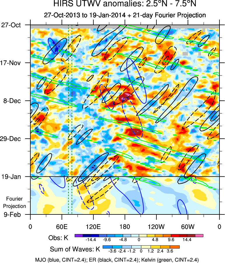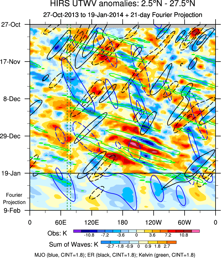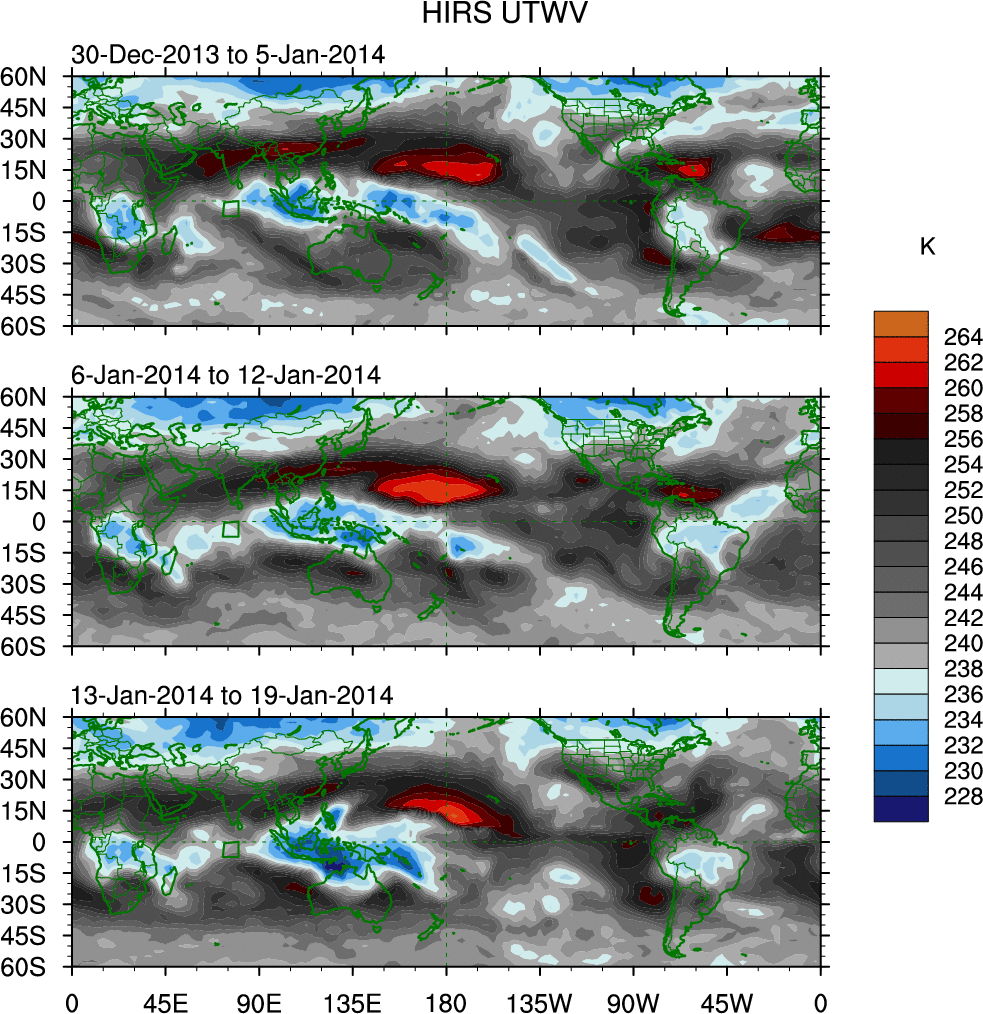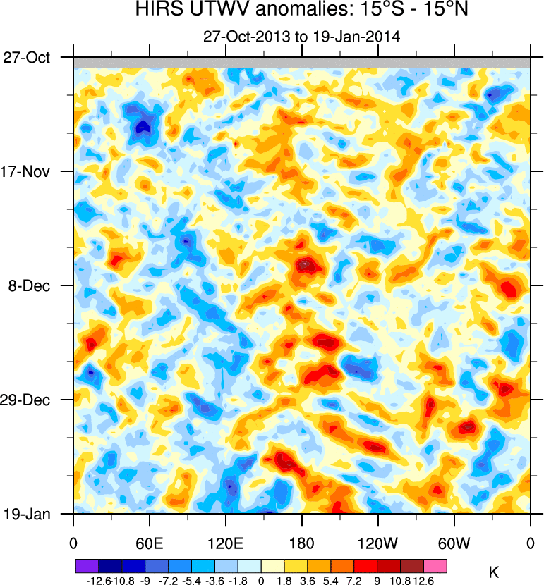 To identify tropical waves in near real-time, the OLR and UTWV data are filtered following Wheeler & Weickmann (2001 MWR). The daily anomalies are calculated using the first 3 harmonics of the seasonal cycle for 1979–2009. Missing values are then filled using linear interpolation in space and time. The most recent 365 days of anomalies are padded with 659 days of zeroes, and the result is filtered for each wave type.