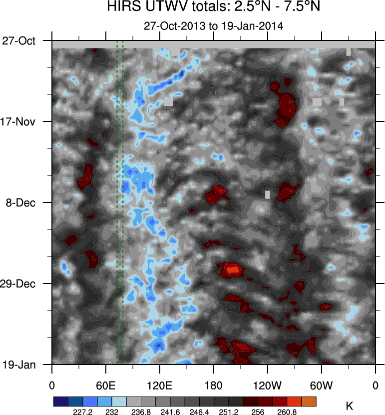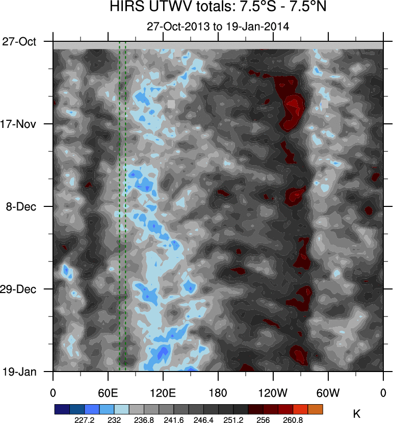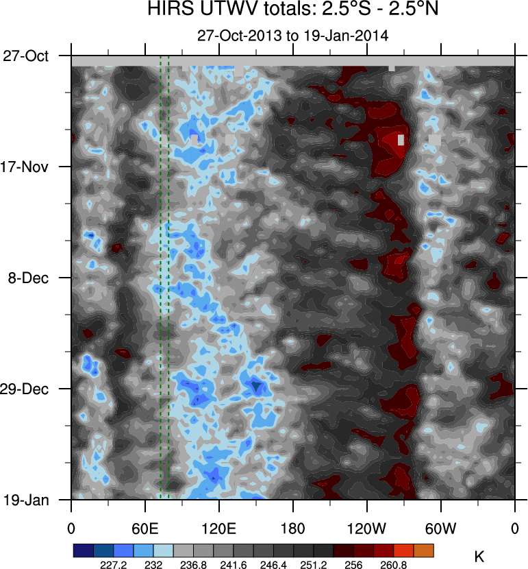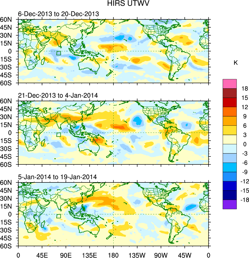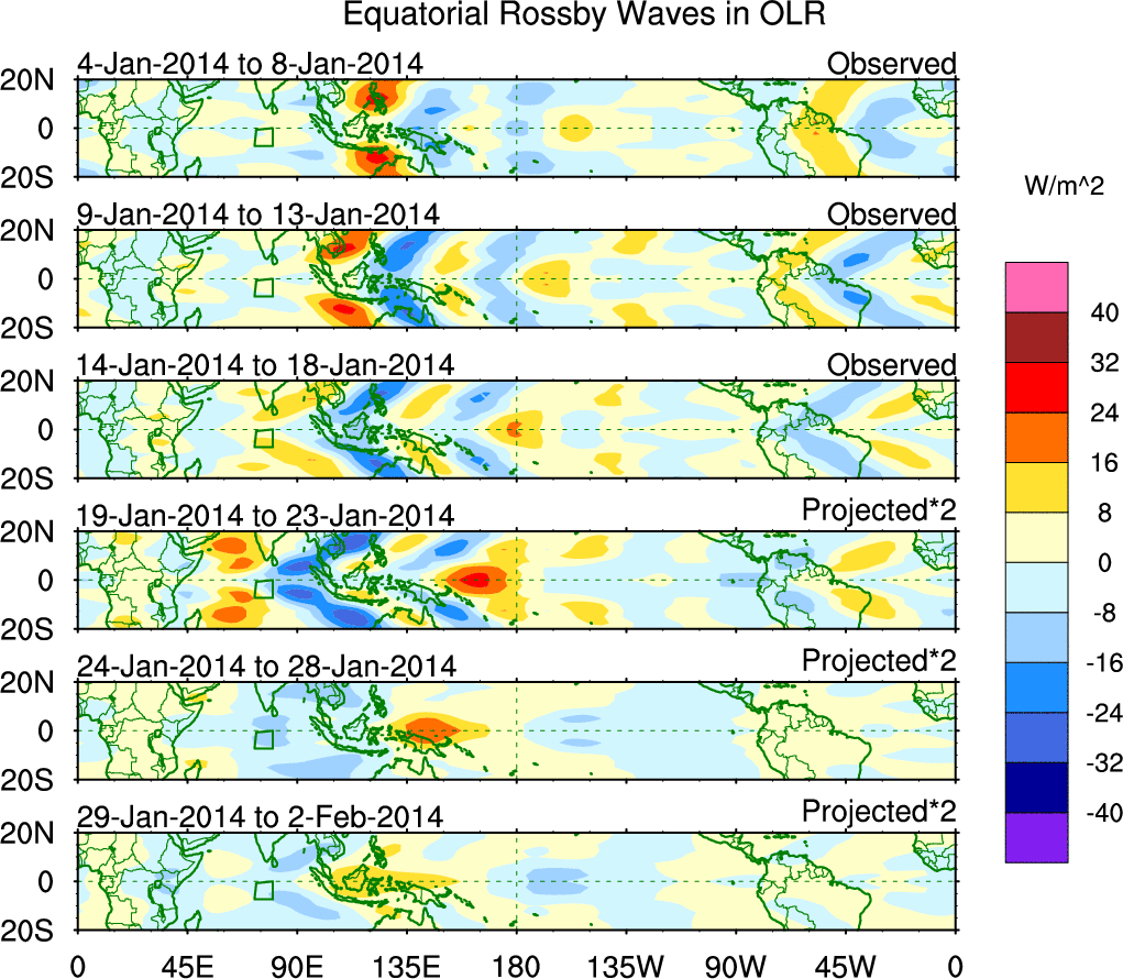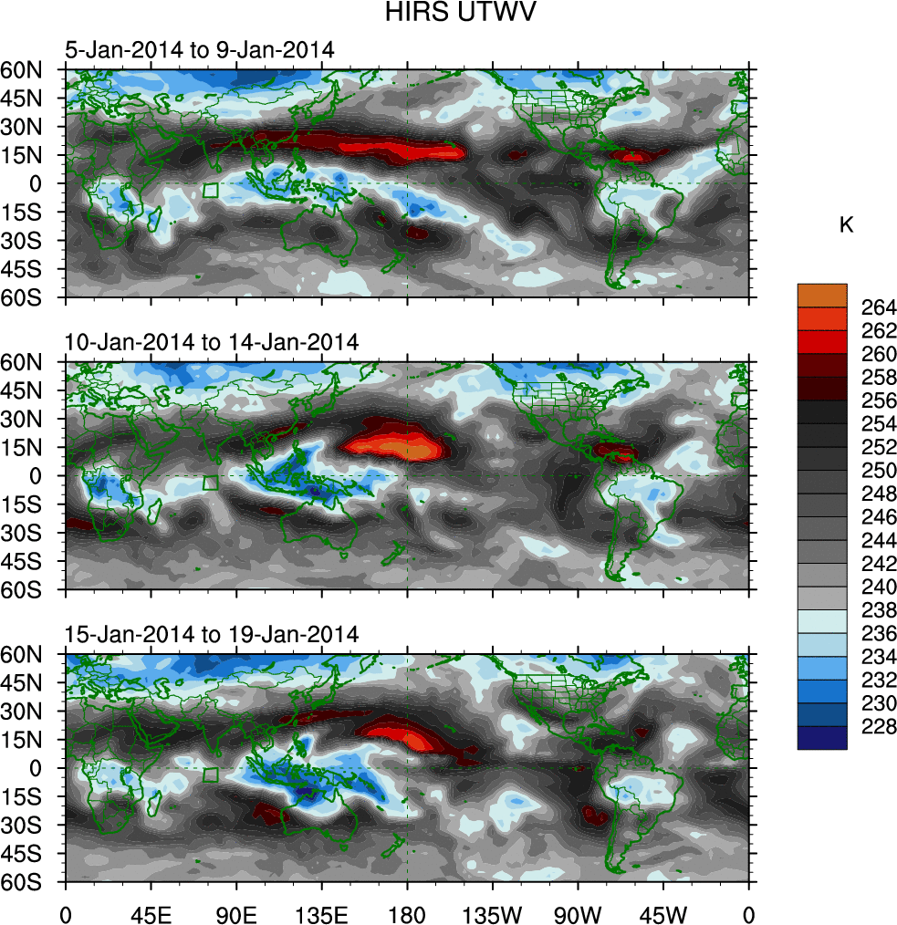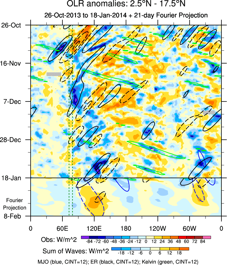 To identify tropical waves in near real-time, the OLR and UTWV data are filtered following Wheeler & Weickmann (2001 MWR). The daily anomalies are calculated using the first 3 harmonics of the seasonal cycle for 1979–2009. Missing values are then filled using linear interpolation in space and time. The most recent 365 days of anomalies are padded with 659 days of zeroes, and the result is filtered for each wave type.