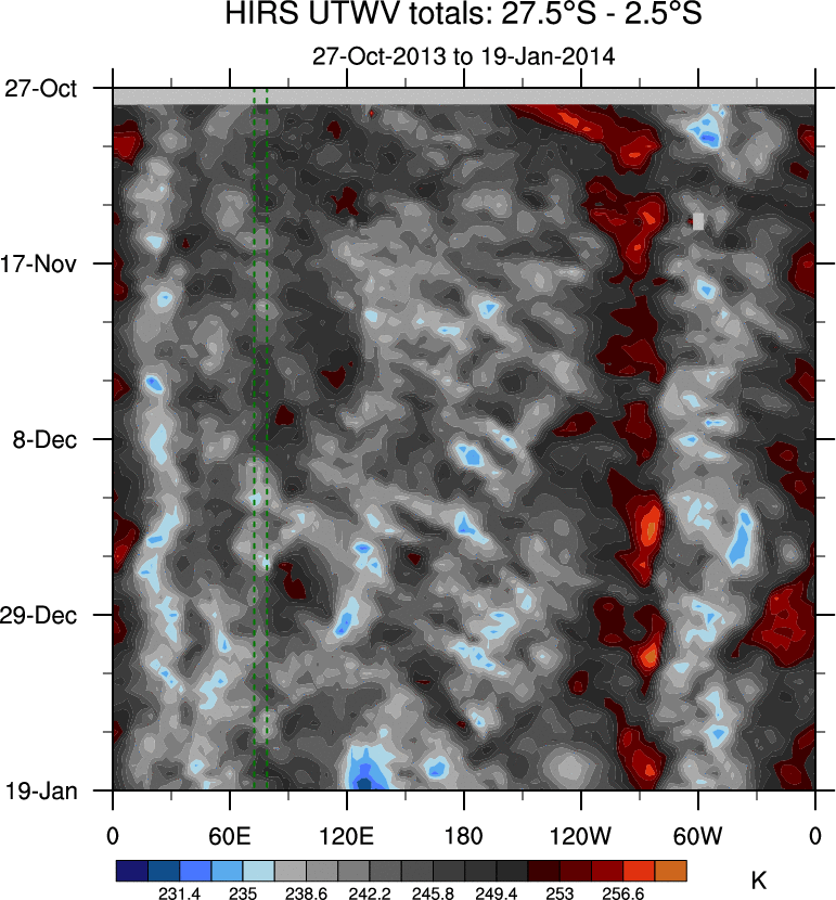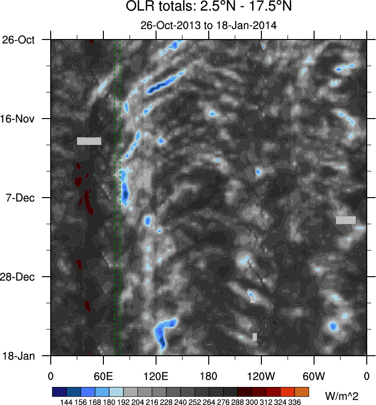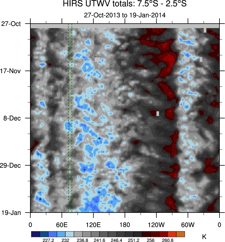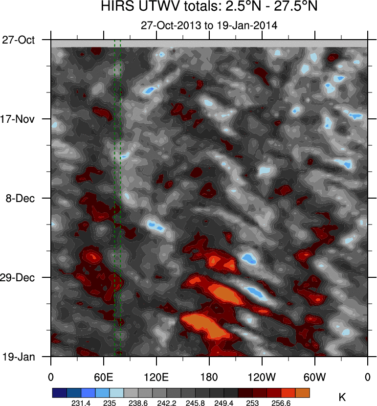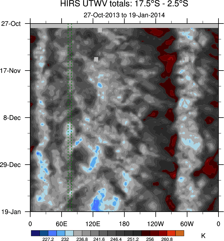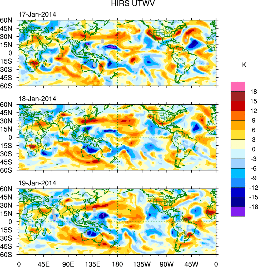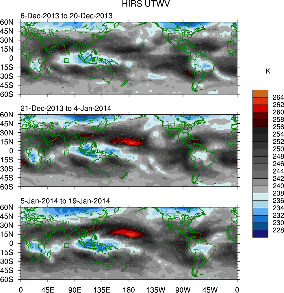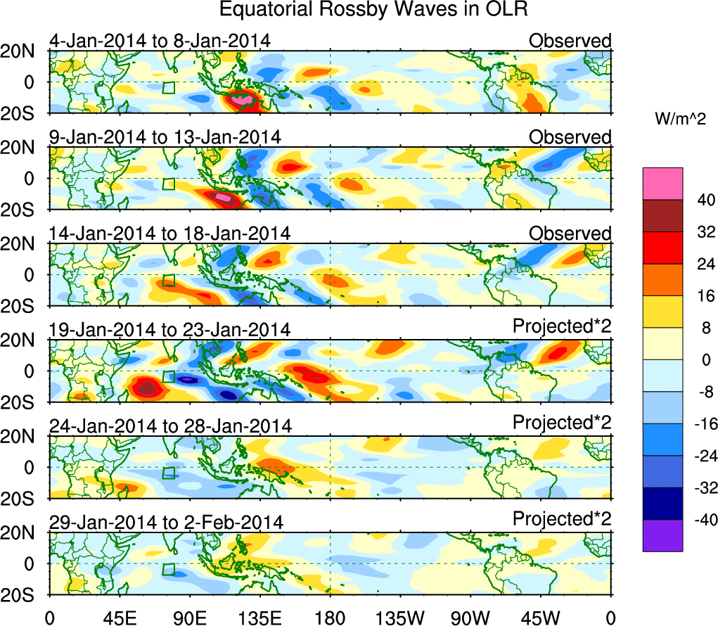 To identify tropical waves in near real-time, the OLR and UTWV data are filtered following Wheeler & Weickmann (2001 MWR). The daily anomalies are calculated using the first 3 harmonics of the seasonal cycle for 1979–2009. Missing values are then filled using linear interpolation in space and time. The most recent 365 days of anomalies are padded with 659 days of zeroes, and the result is filtered for each wave type.