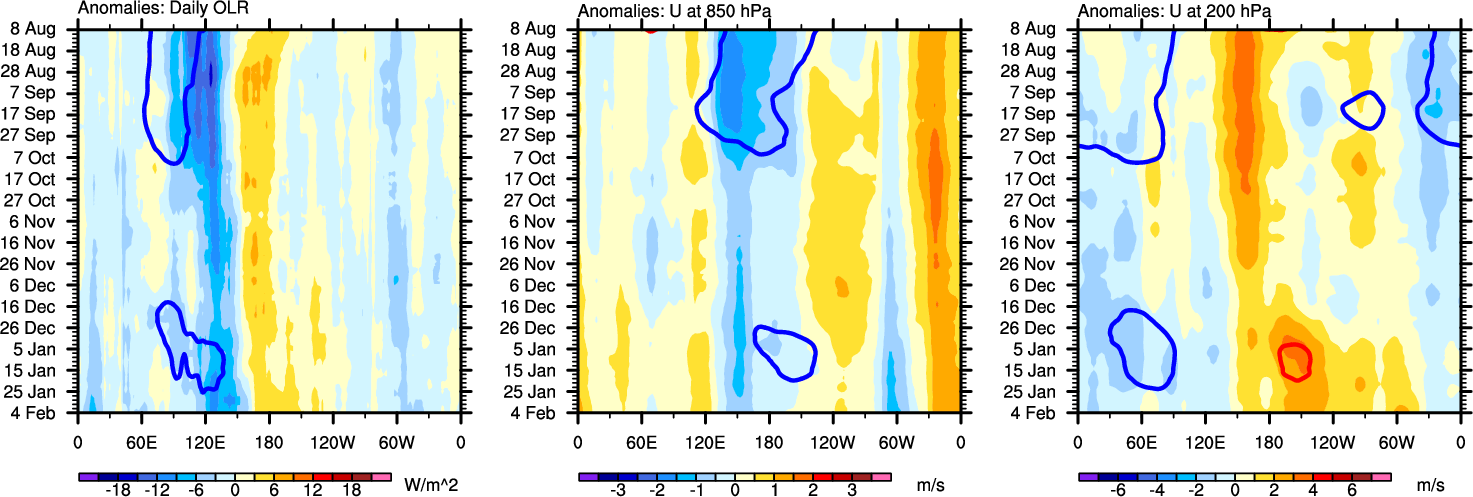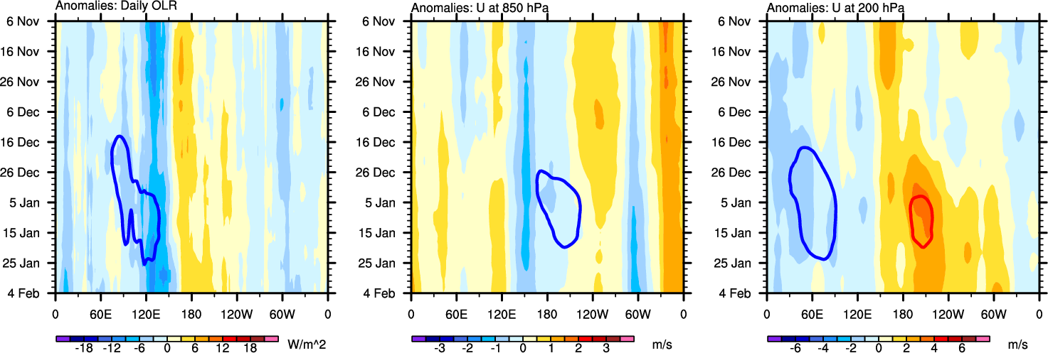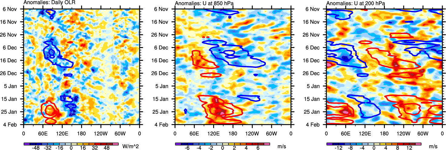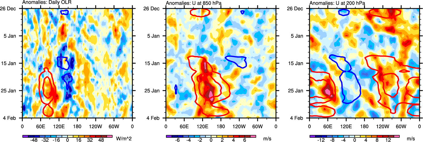 The Hovmollers show longitude-time plots for OLR, U-850, and U-200. The shading indicates the observed anomalies, while the contours are the projection of those anomalies onto the RMM EOFs.