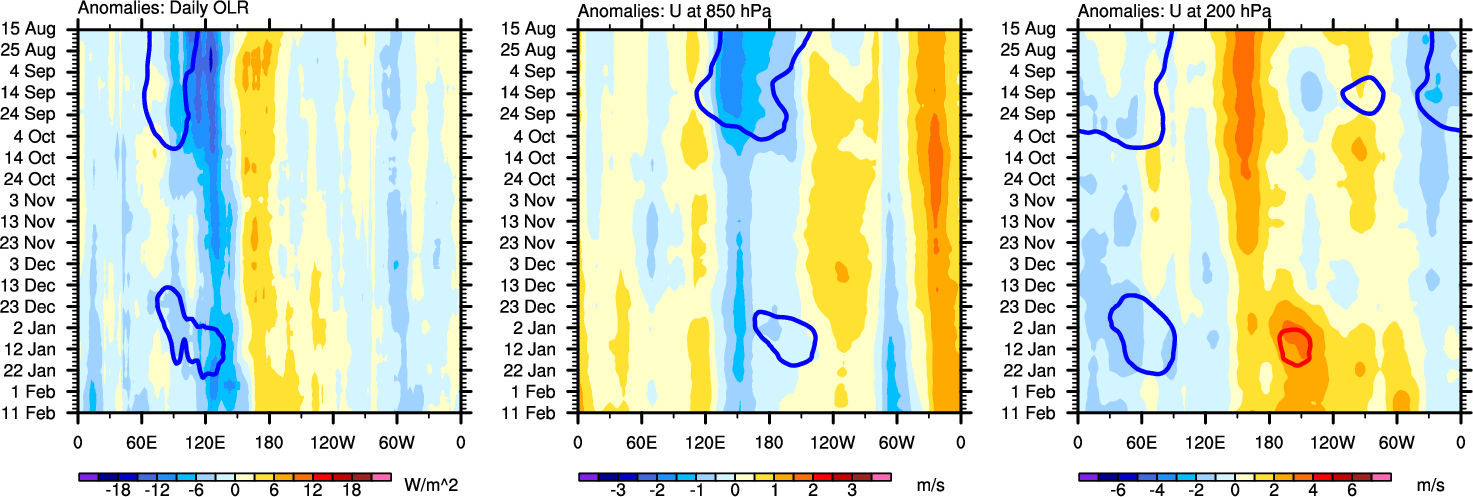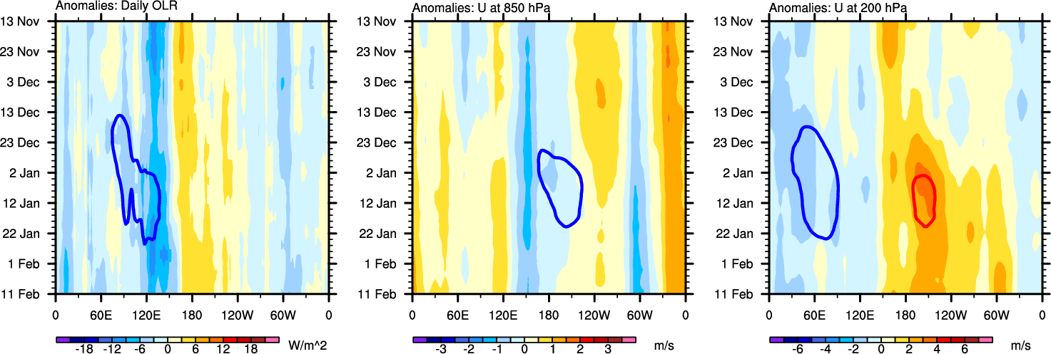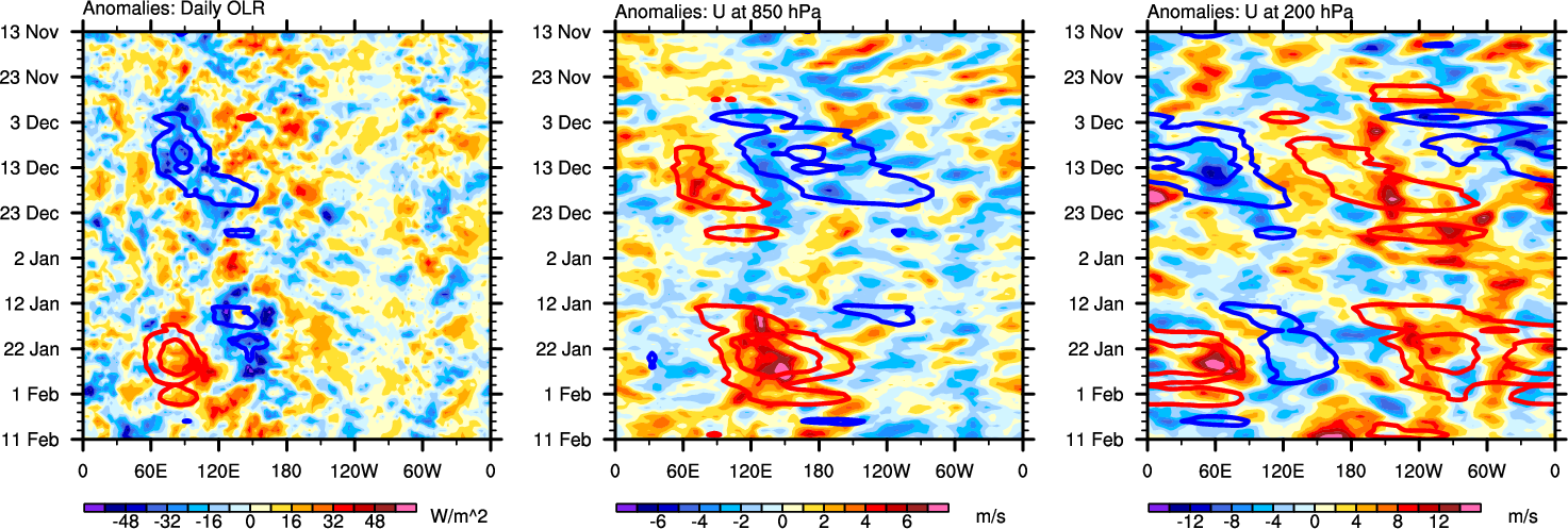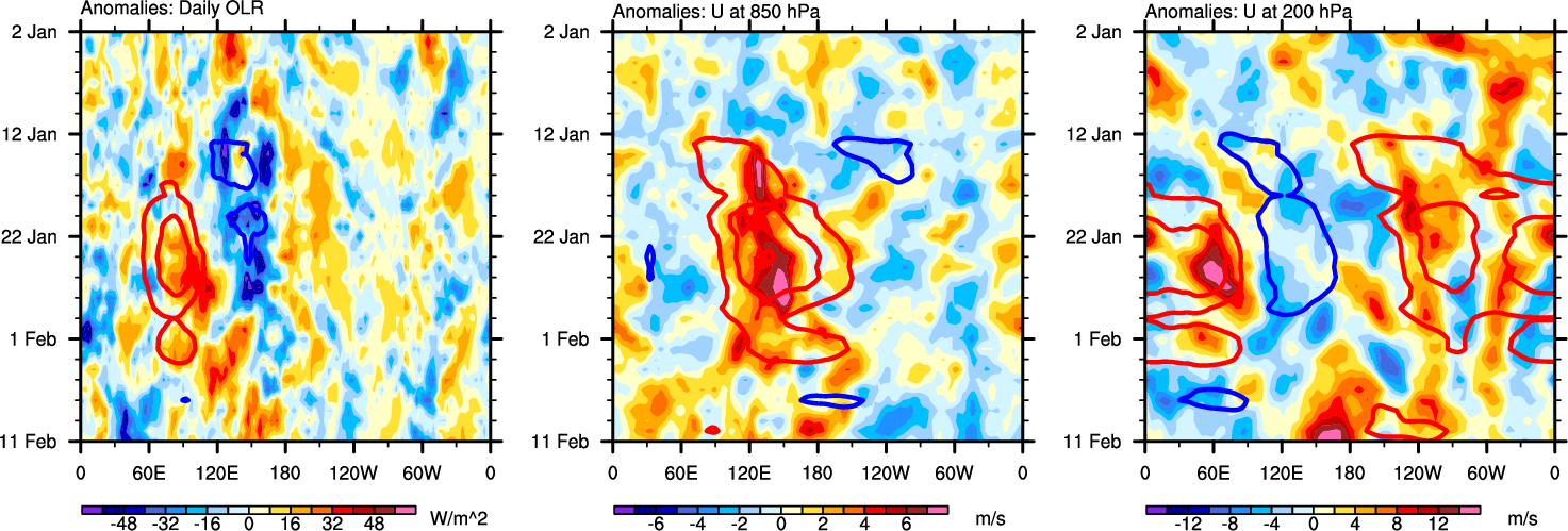 The Hovmollers show longitude-time plots for OLR, U-850, and U-200. The shading indicates the observed anomalies, while the contours are the projection of those anomalies onto the RMM EOFs.