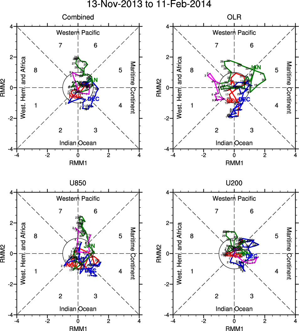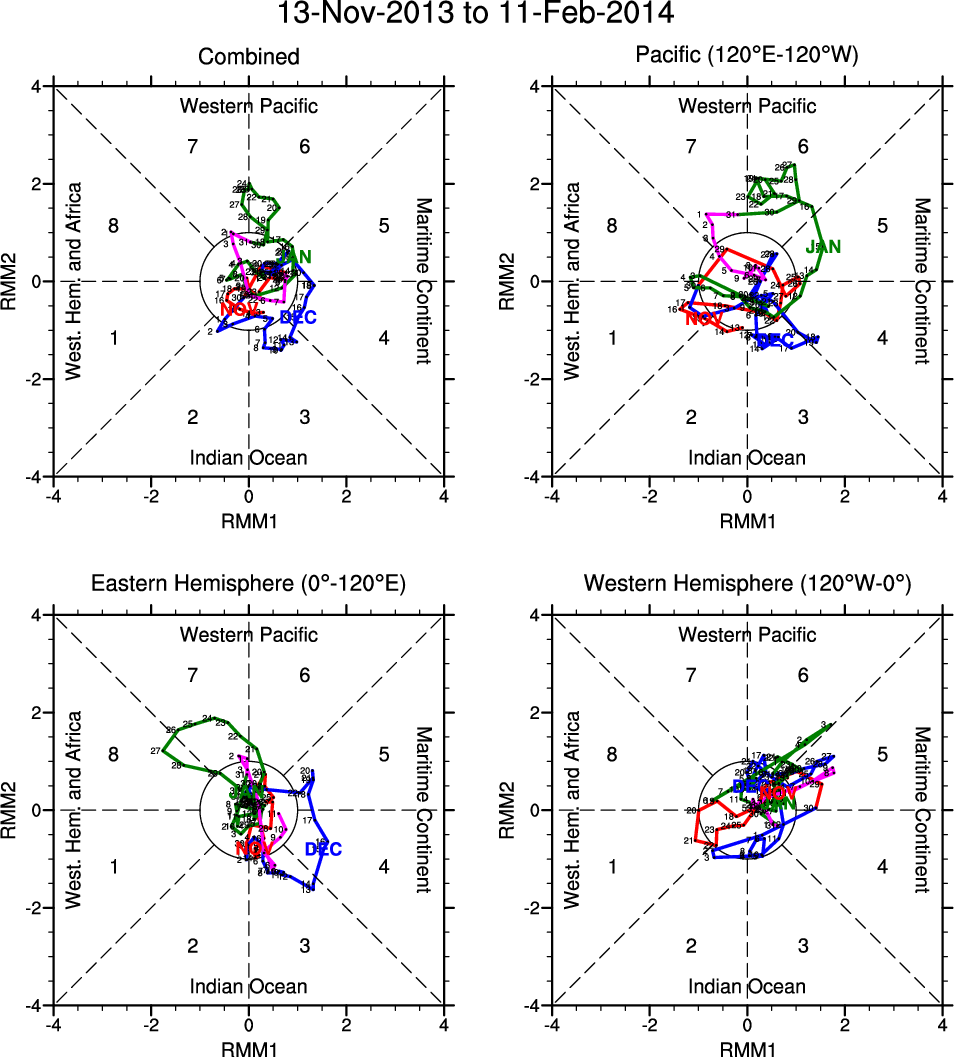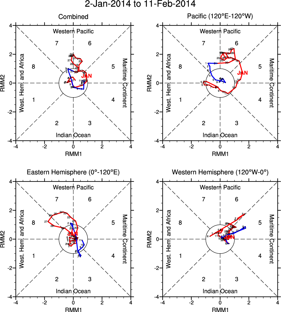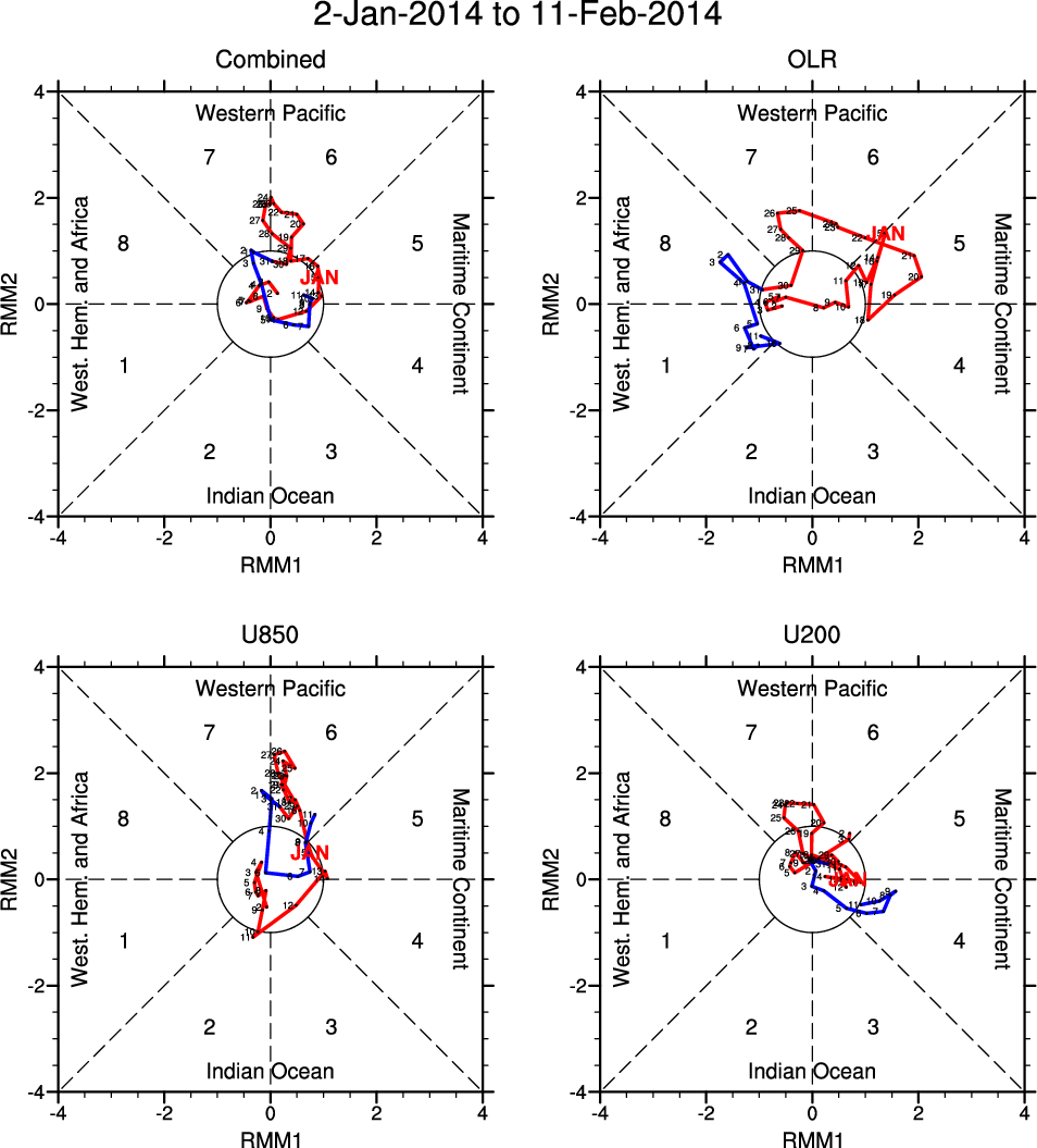 Wheeler and Hendon (2004) constructed the RMM index for monitoring the MJO. This index consists of the first two principal components (PCs) of OLR, 850-hPa zonal wind, and 200-hPa zonal wind averaged 15S-15N.