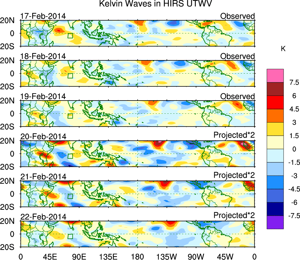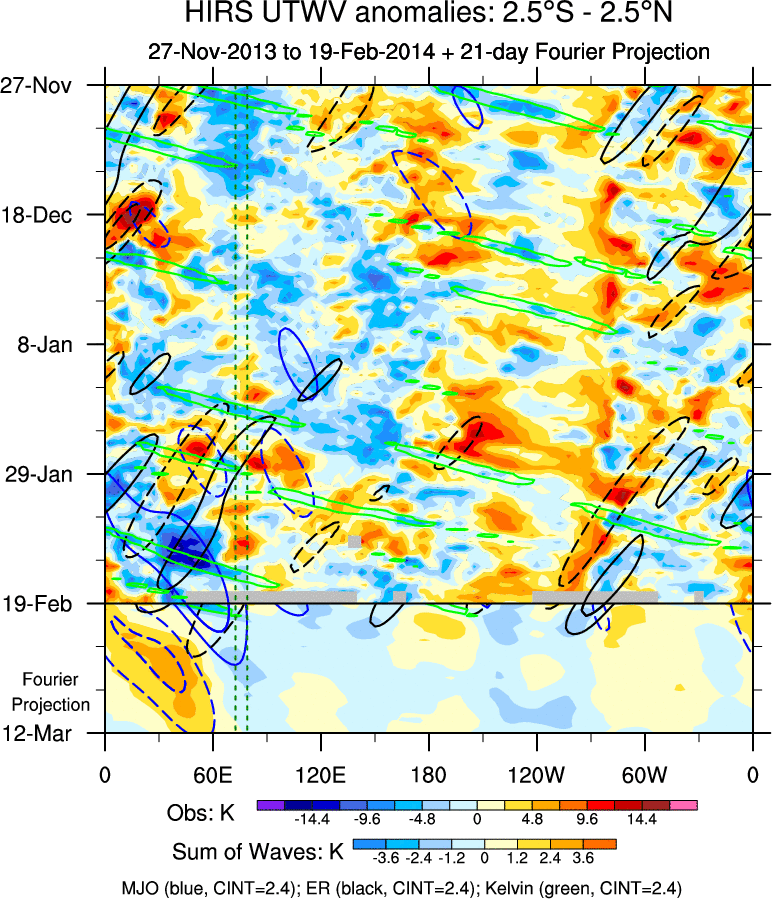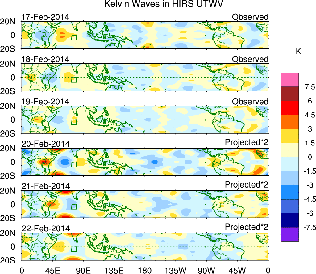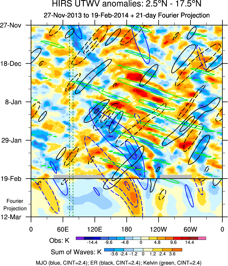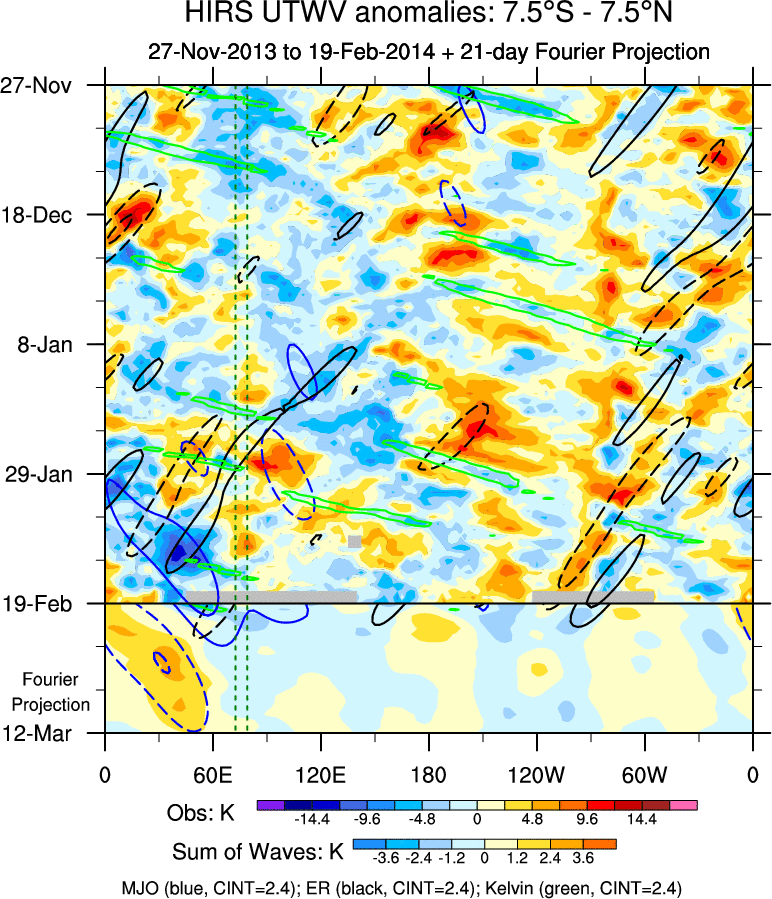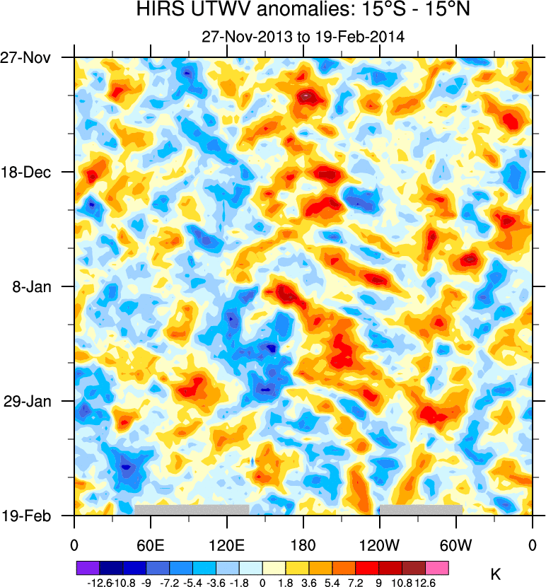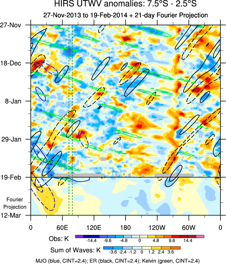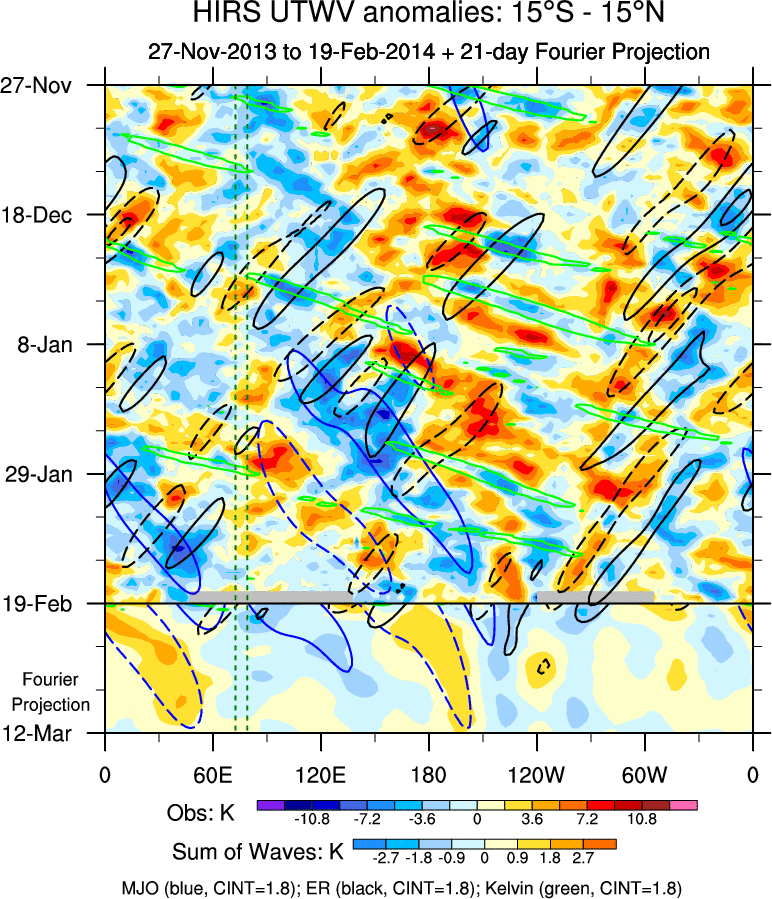To identify tropical waves in near real-time, the OLR and UTWV data are filtered following Wheeler & Weickmann (2001 MWR). The daily anomalies are calculated using the first 3 harmonics of the seasonal cycle for 1979–2009. Missing values are then filled using linear interpolation in space and time. The most recent 365 days of anomalies are padded with 659 days of zeroes, and the result is filtered for each wave type.