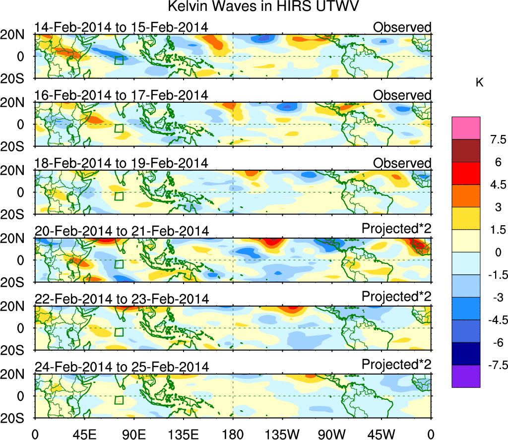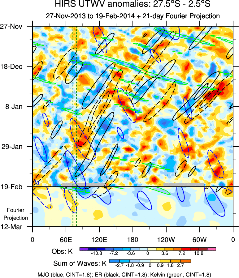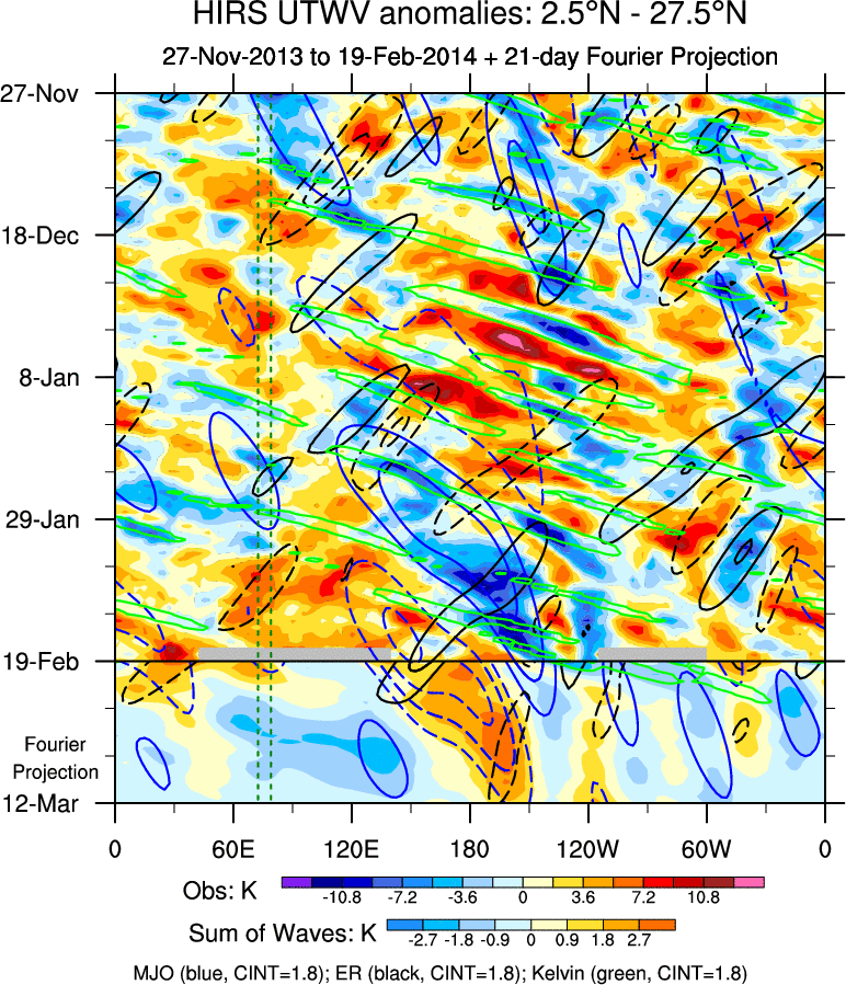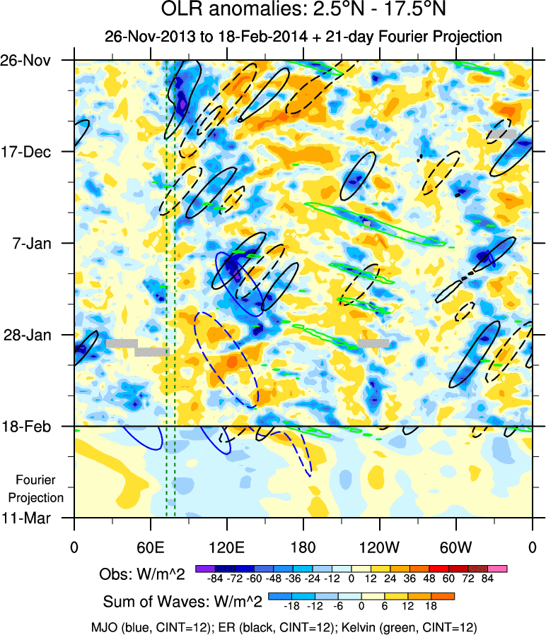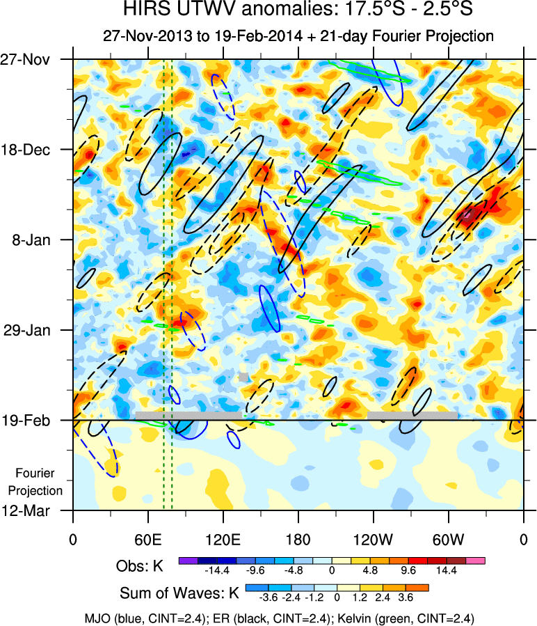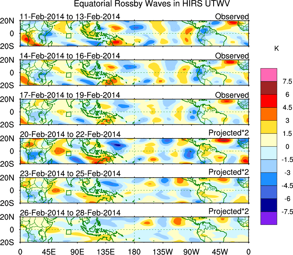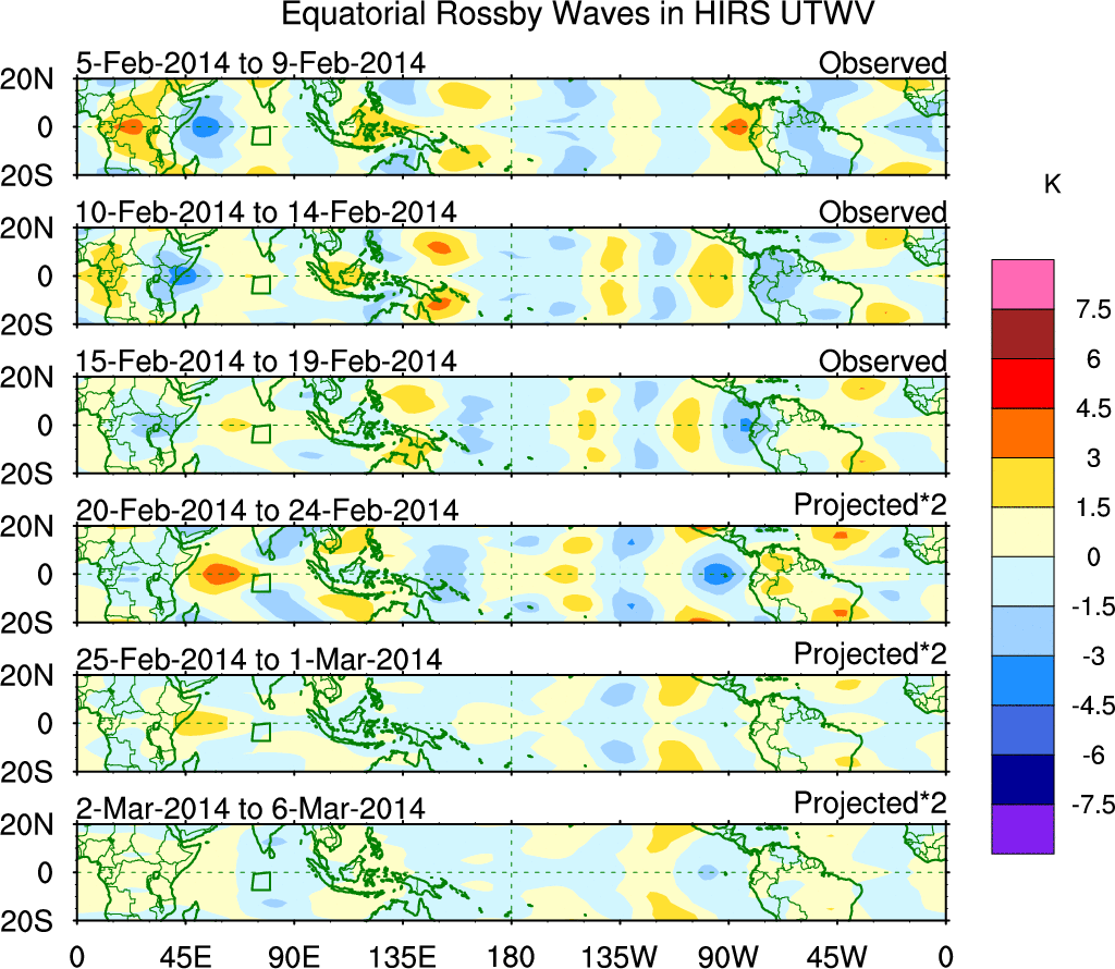 To identify tropical waves in near real-time, the OLR and UTWV data are filtered following Wheeler & Weickmann (2001 MWR). The daily anomalies are calculated using the first 3 harmonics of the seasonal cycle for 1979–2009. Missing values are then filled using linear interpolation in space and time. The most recent 365 days of anomalies are padded with 659 days of zeroes, and the result is filtered for each wave type.