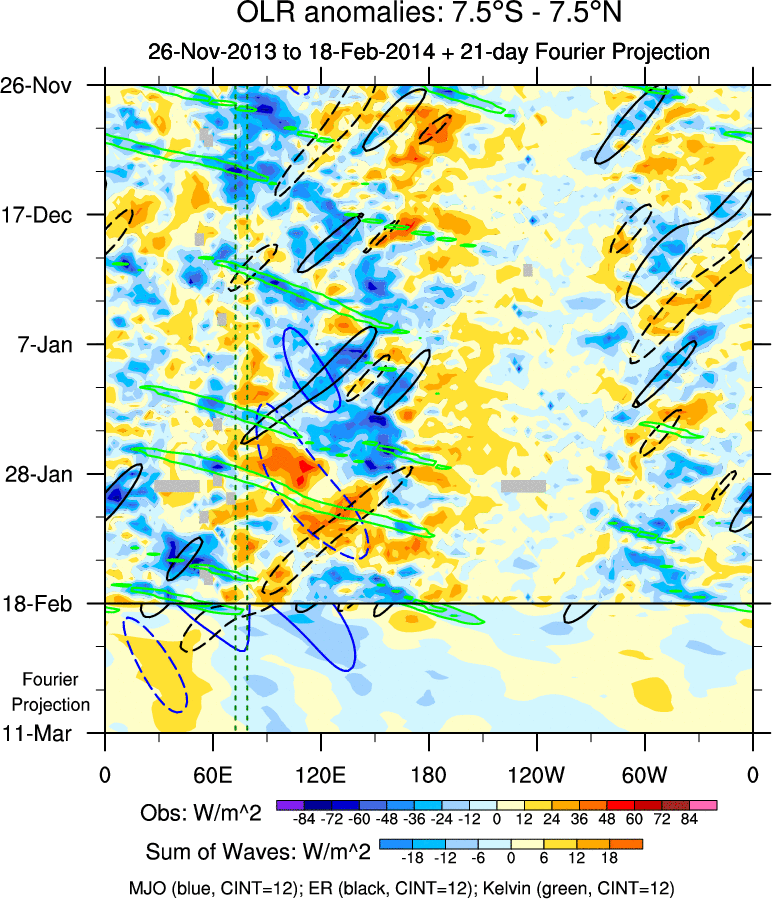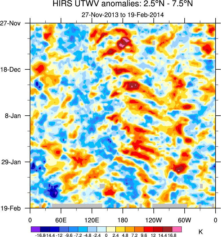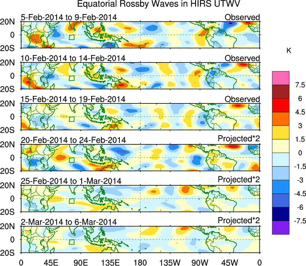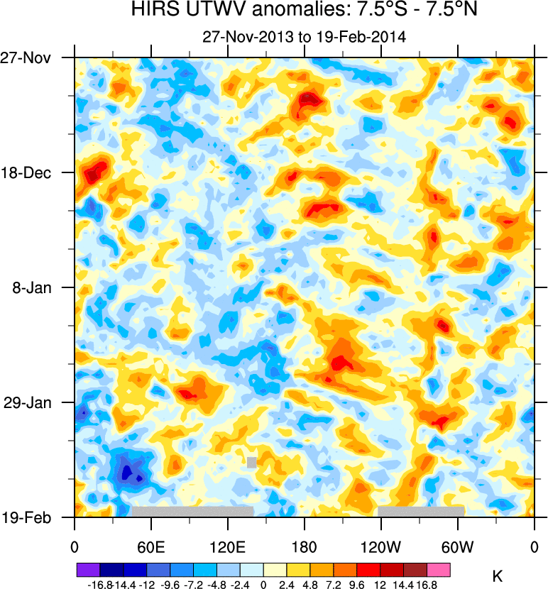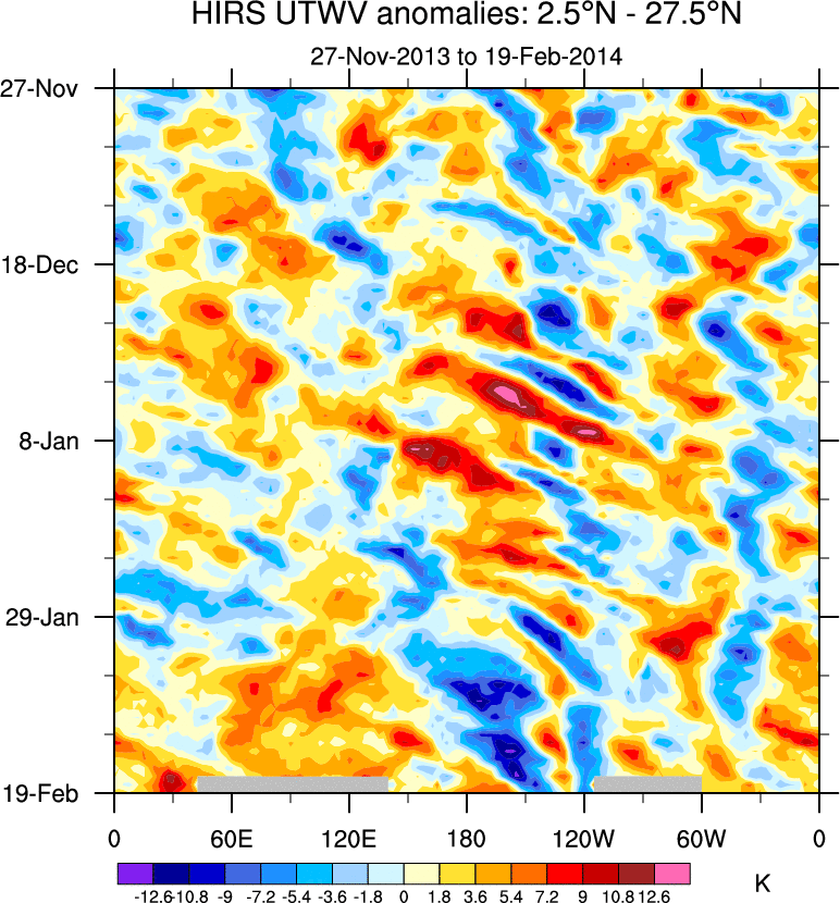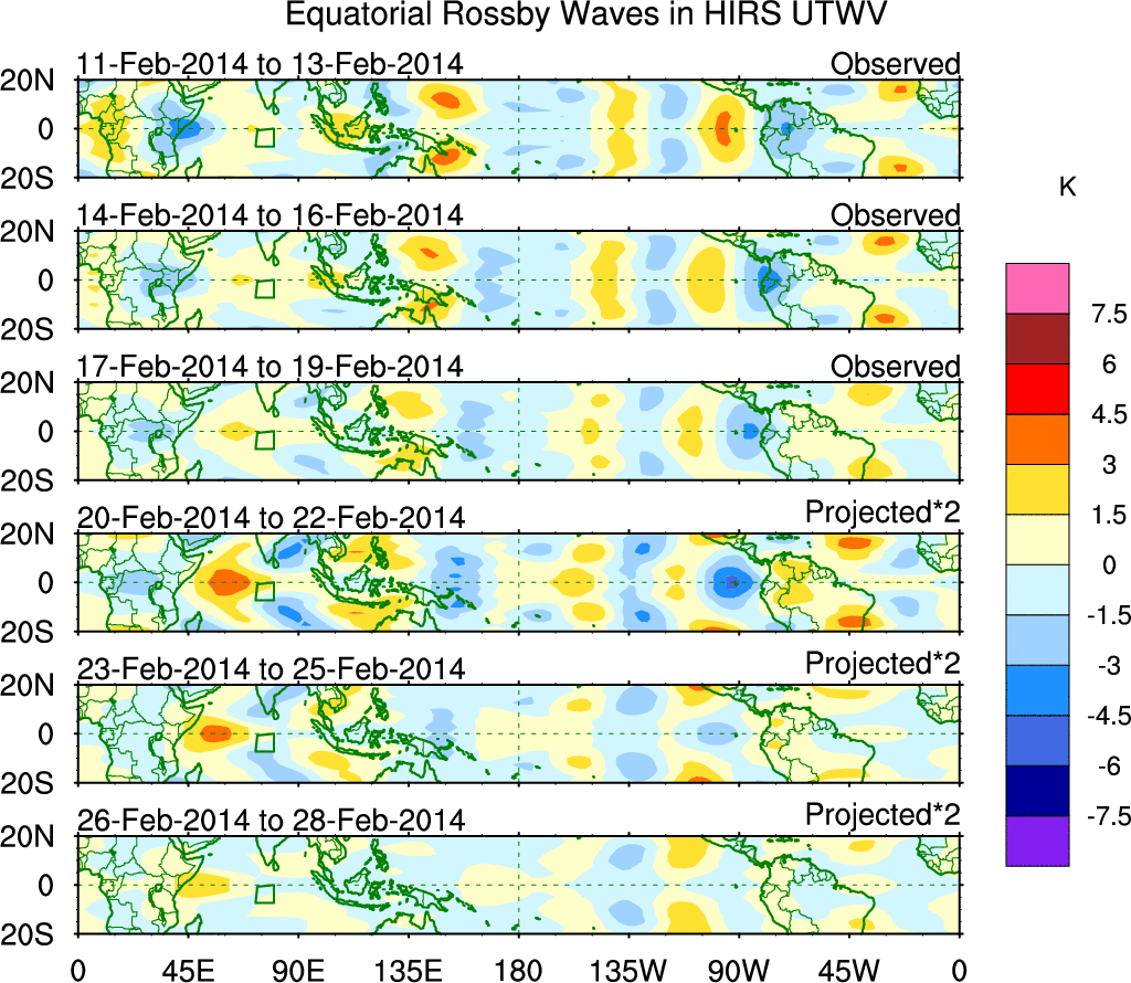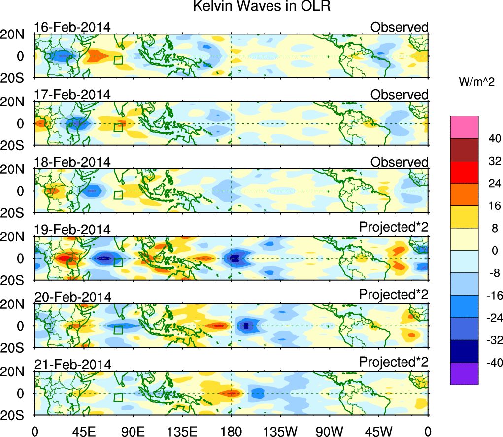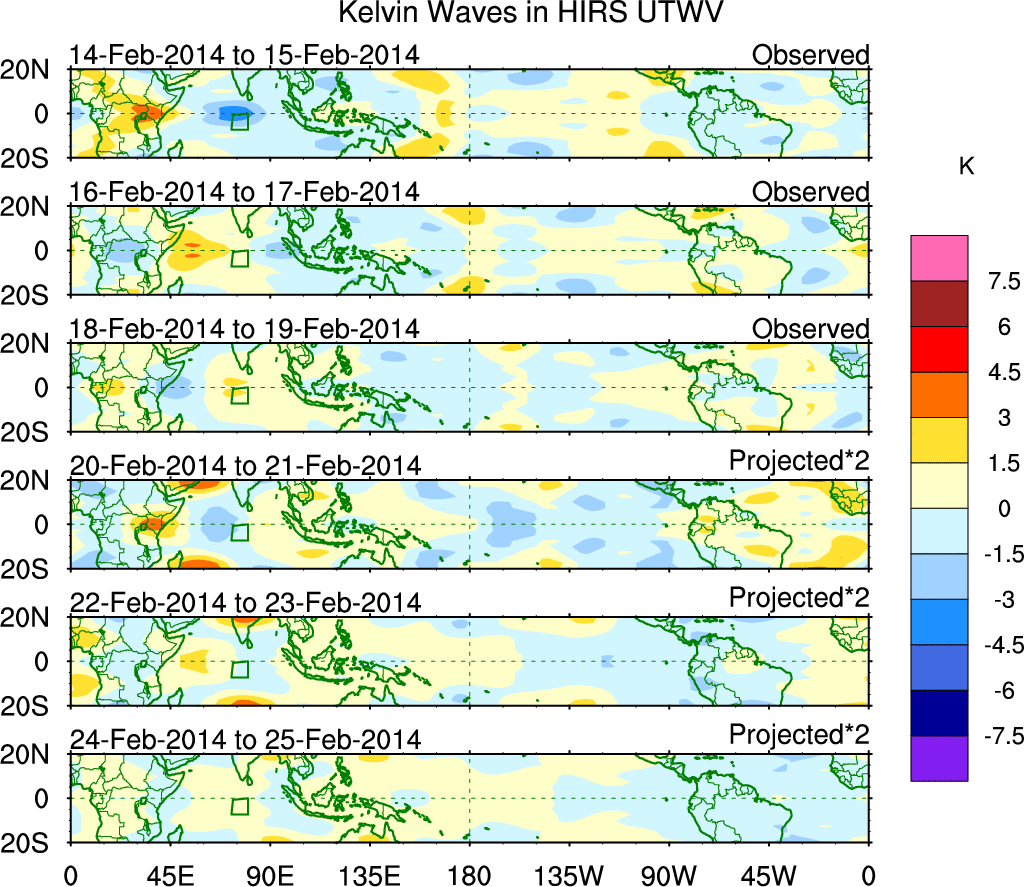 To identify tropical waves in near real-time, the OLR and UTWV data are filtered following Wheeler & Weickmann (2001 MWR). The daily anomalies are calculated using the first 3 harmonics of the seasonal cycle for 1979–2009. Missing values are then filled using linear interpolation in space and time. The most recent 365 days of anomalies are padded with 659 days of zeroes, and the result is filtered for each wave type.