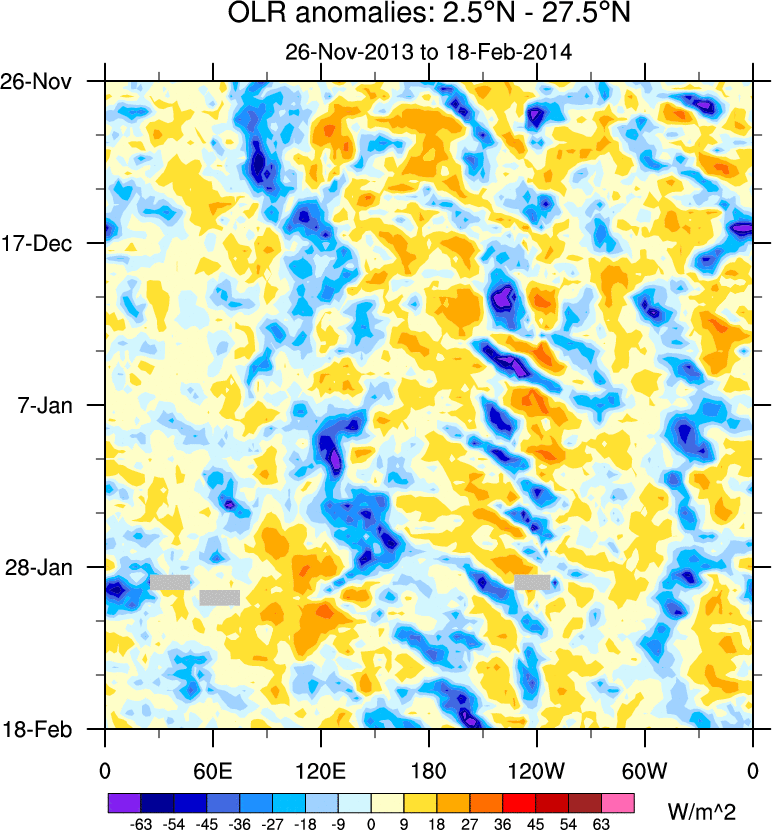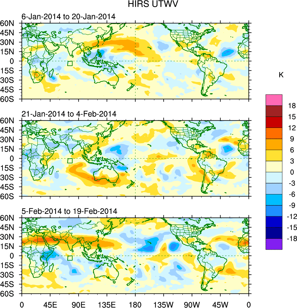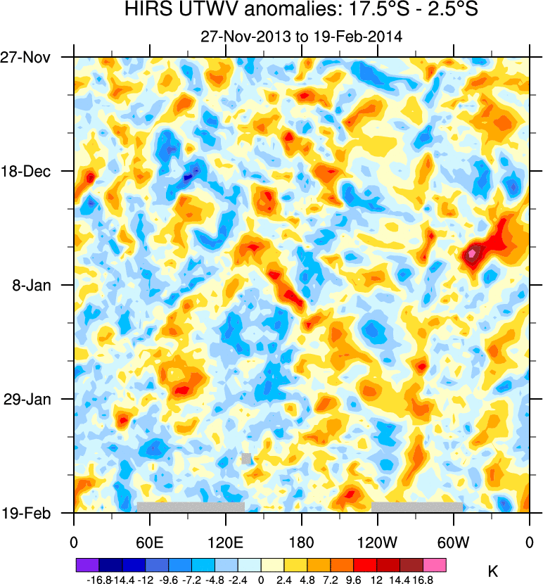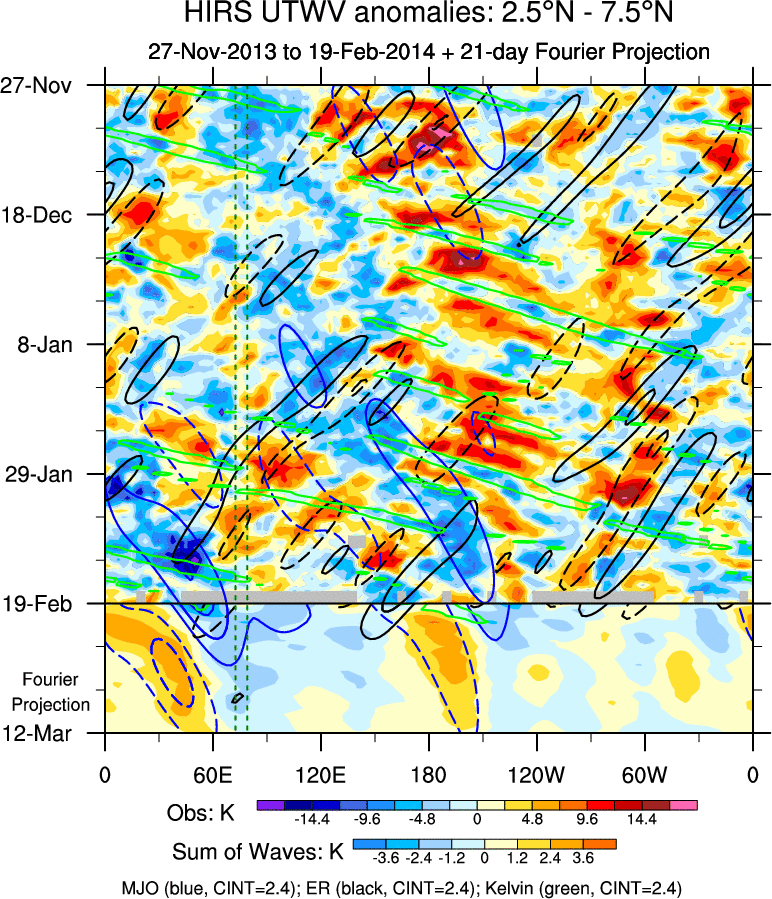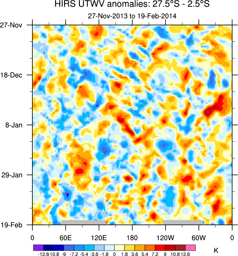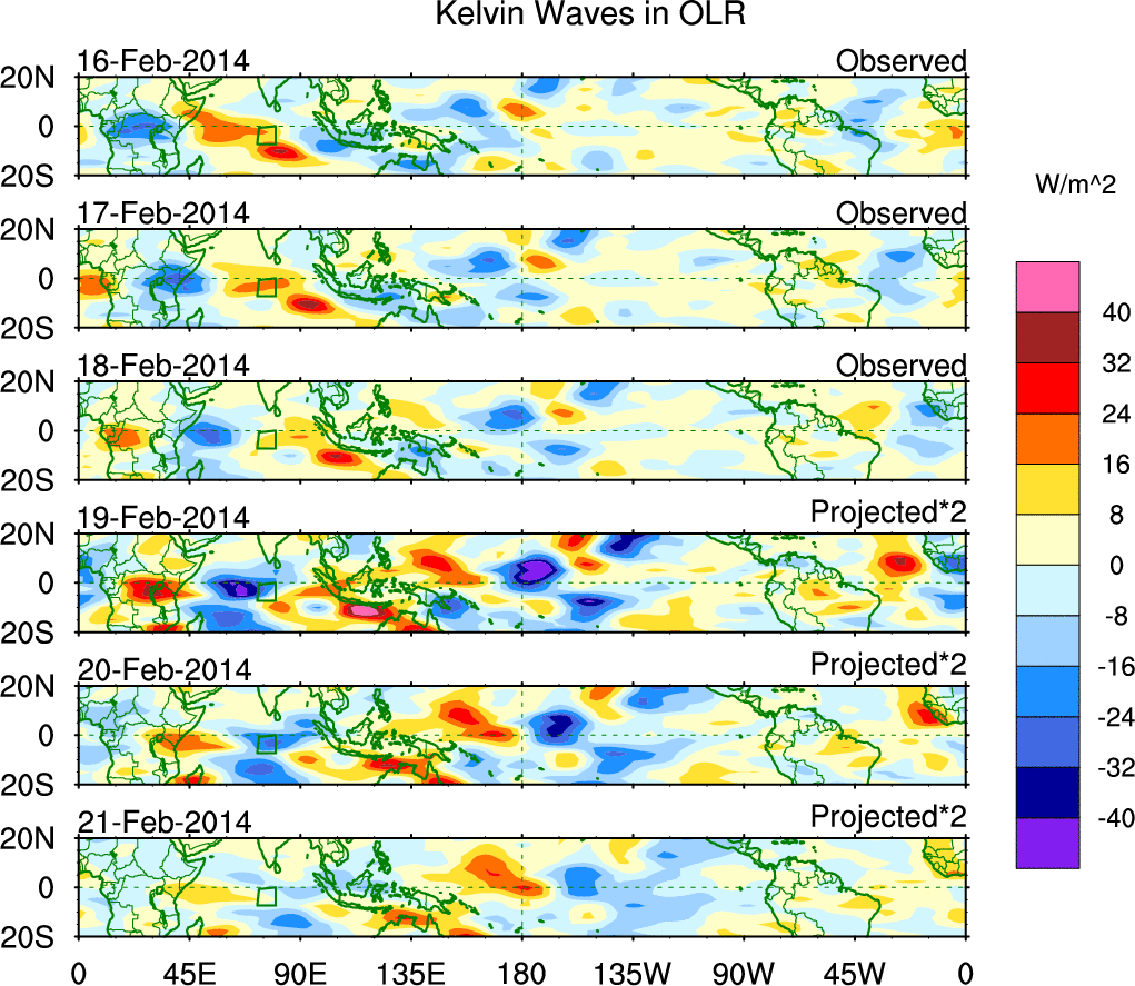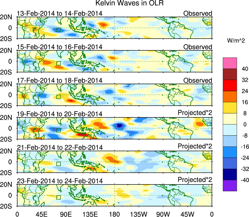 To identify tropical waves in near real-time, the OLR and UTWV data are filtered following Wheeler & Weickmann (2001 MWR). The daily anomalies are calculated using the first 3 harmonics of the seasonal cycle for 1979–2009. Missing values are then filled using linear interpolation in space and time. The most recent 365 days of anomalies are padded with 659 days of zeroes, and the result is filtered for each wave type.