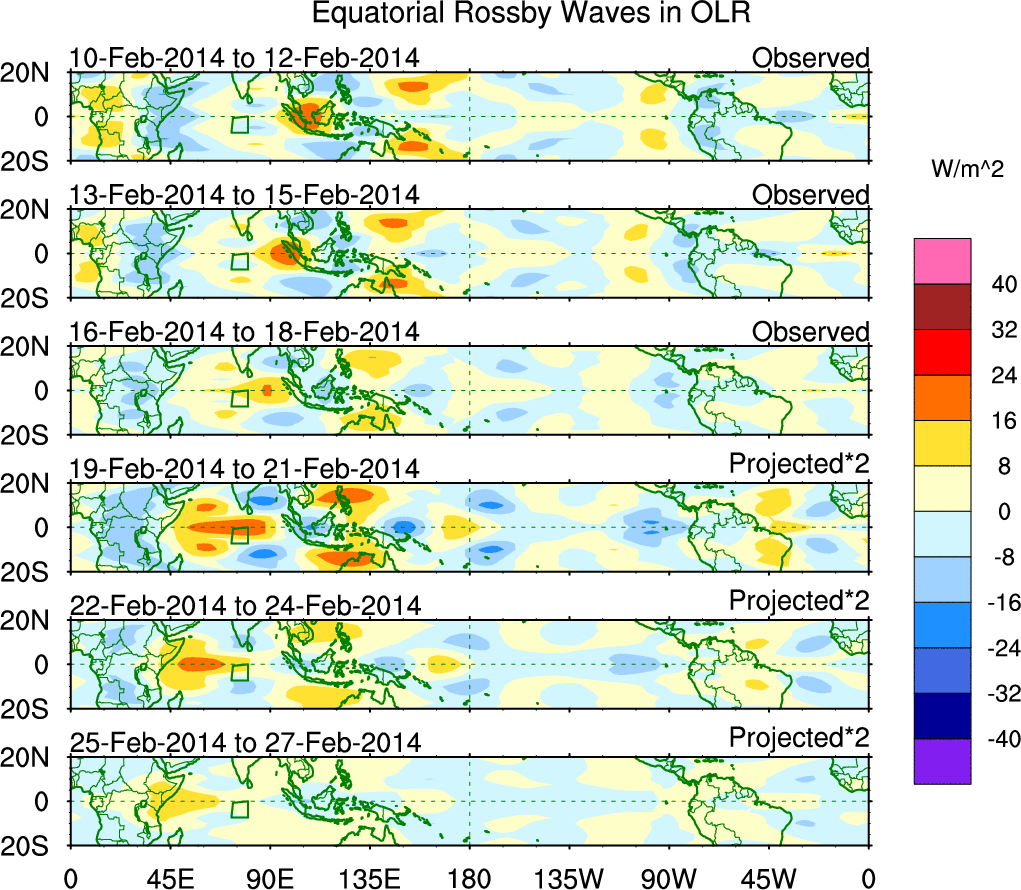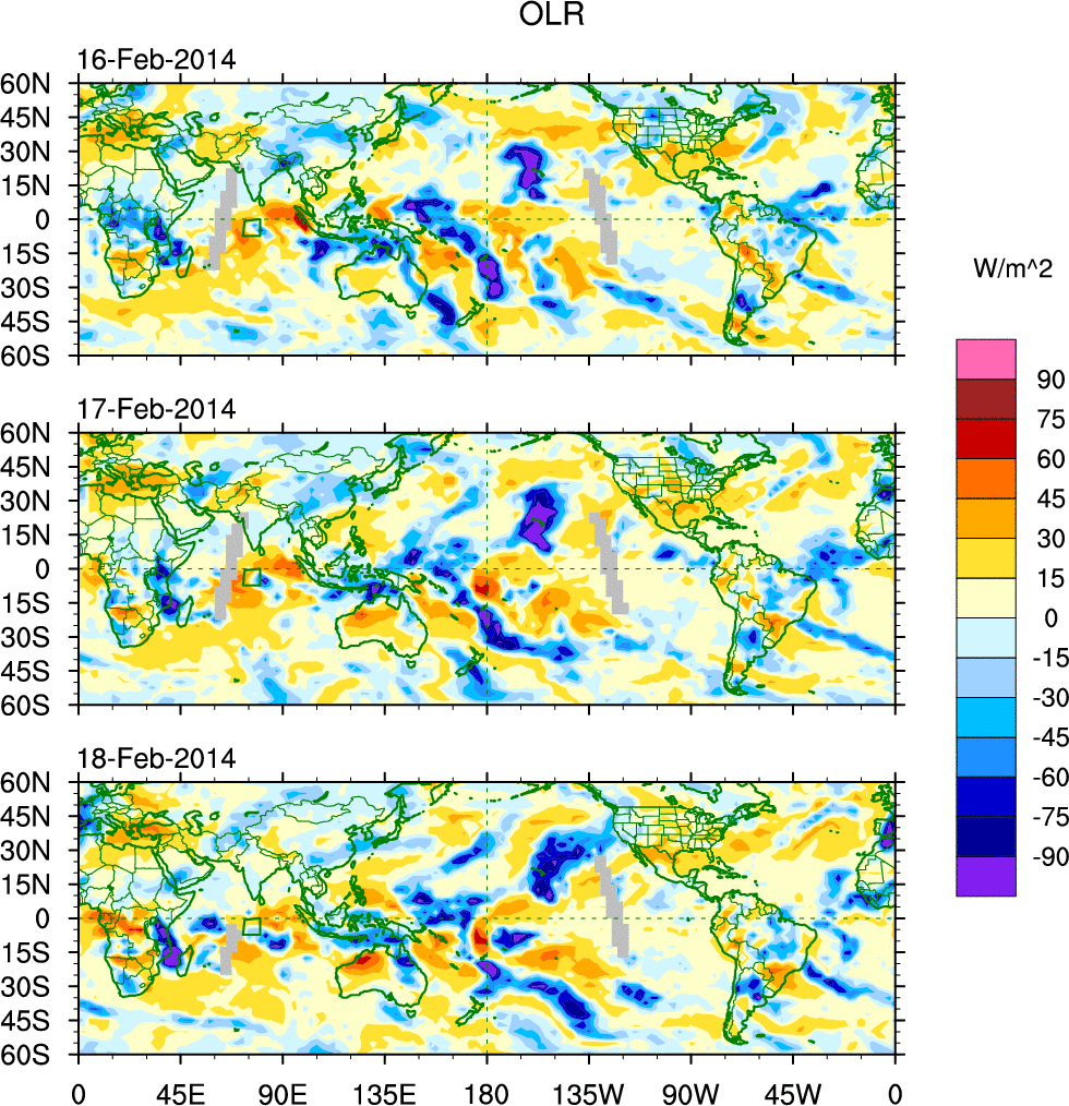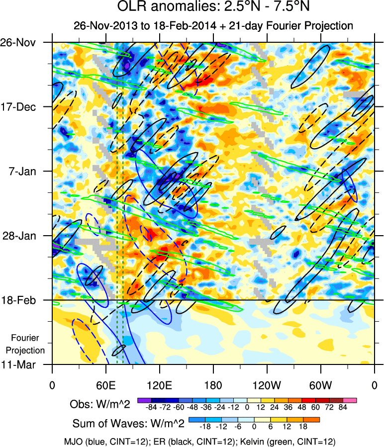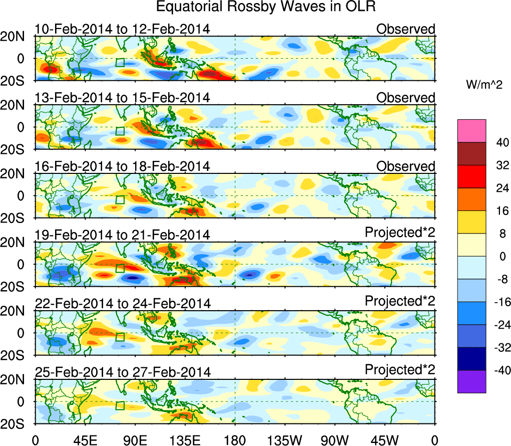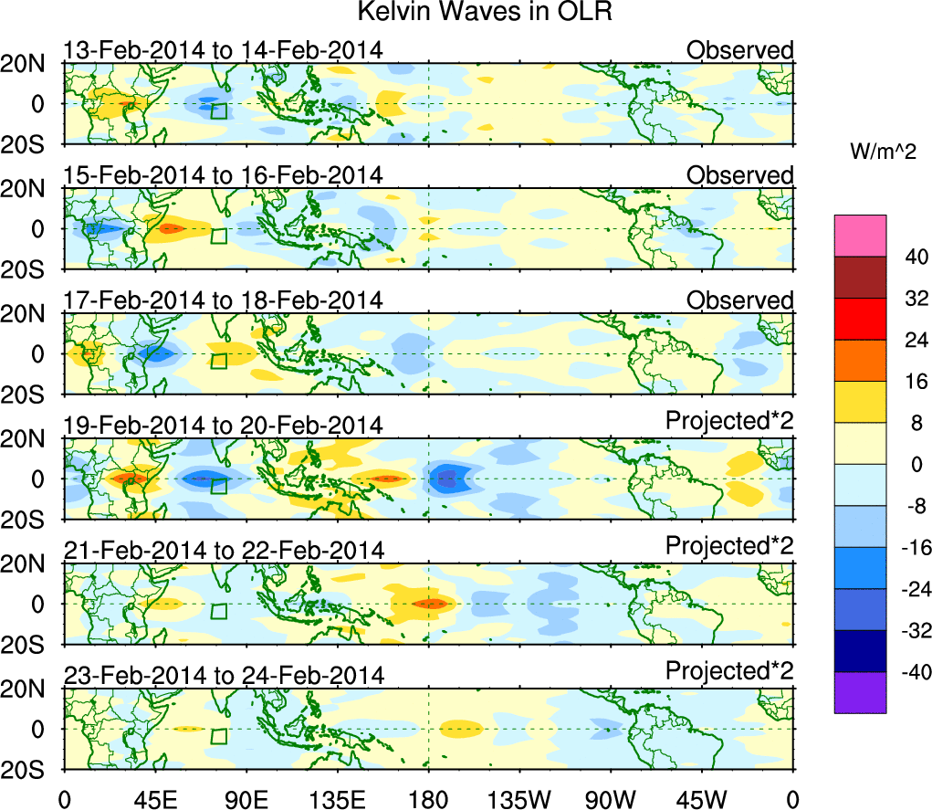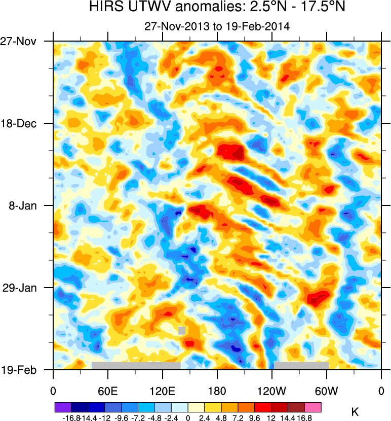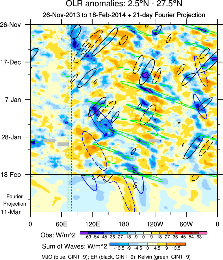 To identify tropical waves in near real-time, the OLR and UTWV data are filtered following Wheeler & Weickmann (2001 MWR). The daily anomalies are calculated using the first 3 harmonics of the seasonal cycle for 1979–2009. Missing values are then filled using linear interpolation in space and time. The most recent 365 days of anomalies are padded with 659 days of zeroes, and the result is filtered for each wave type.