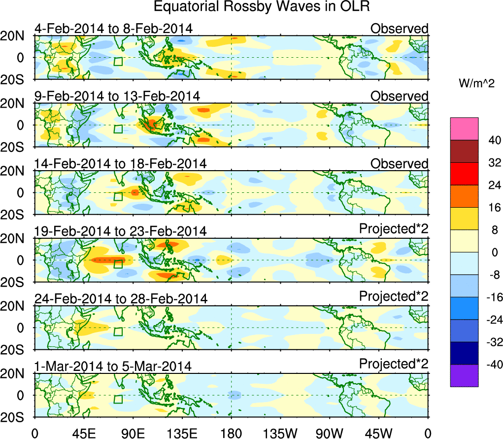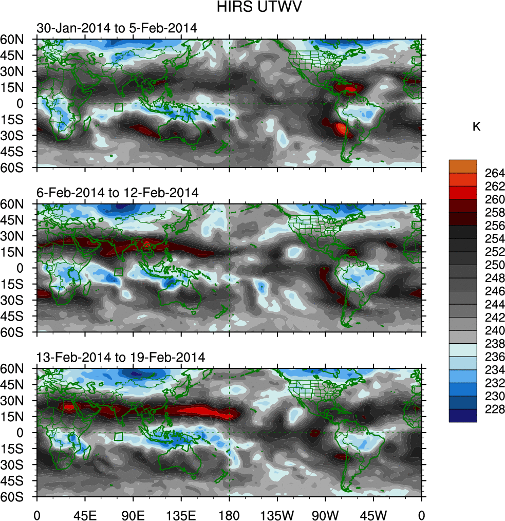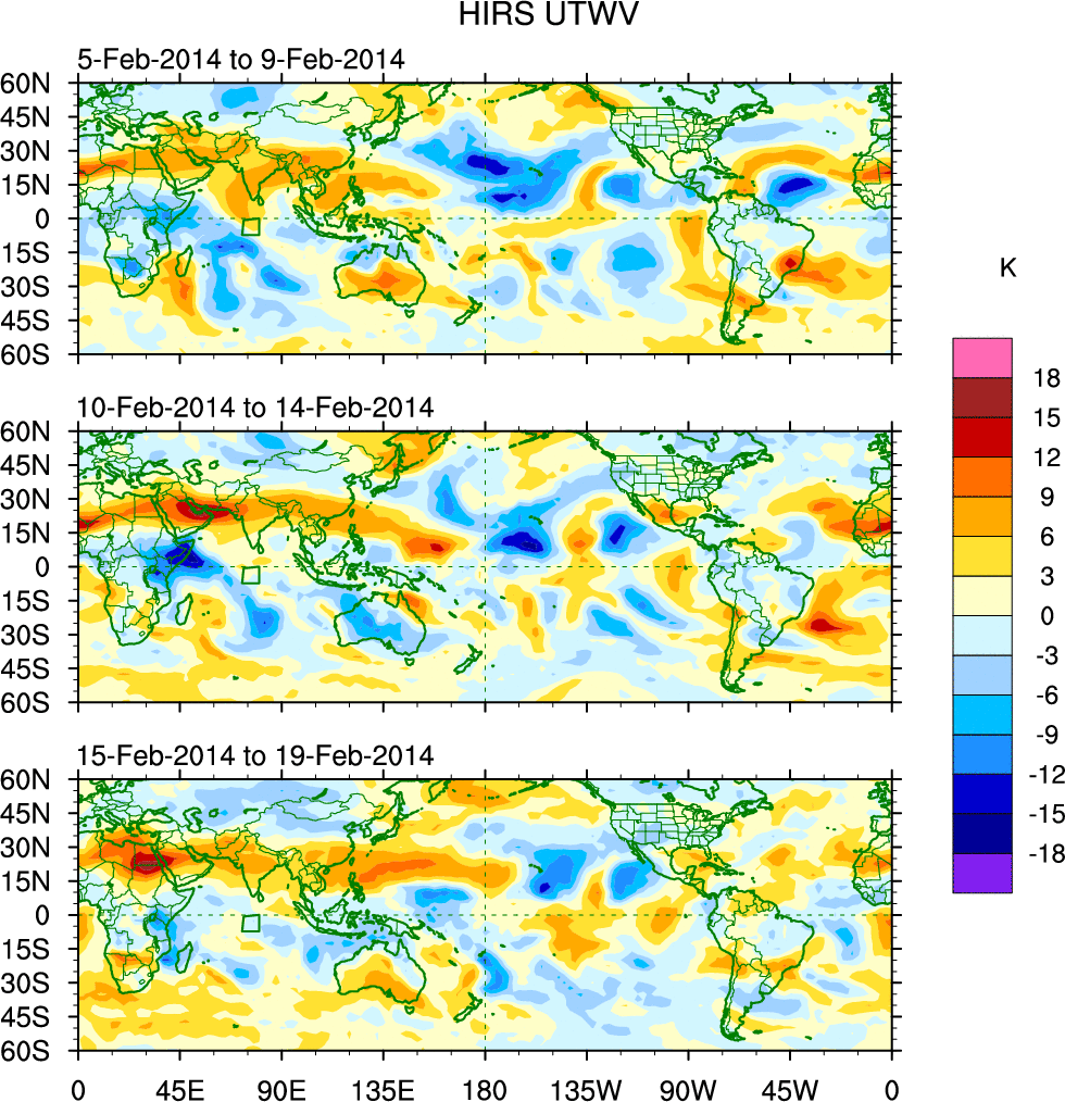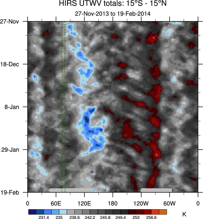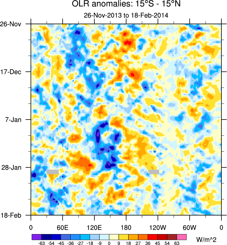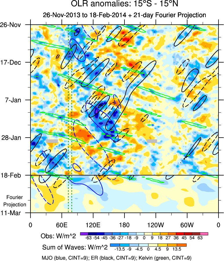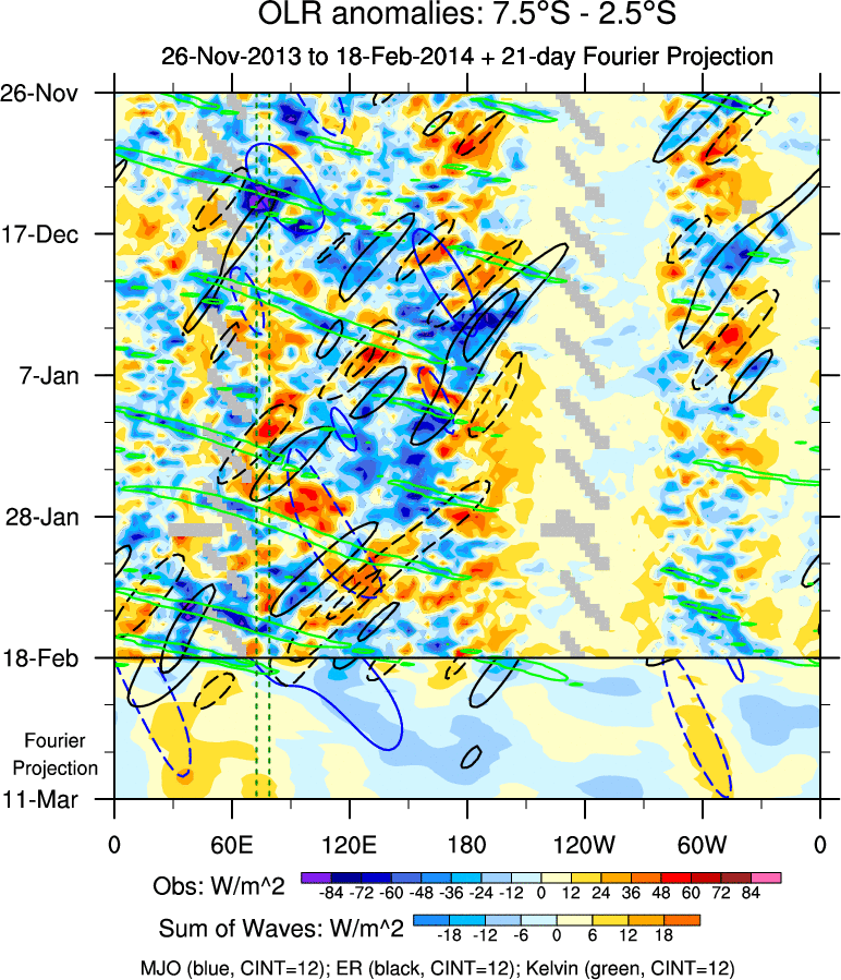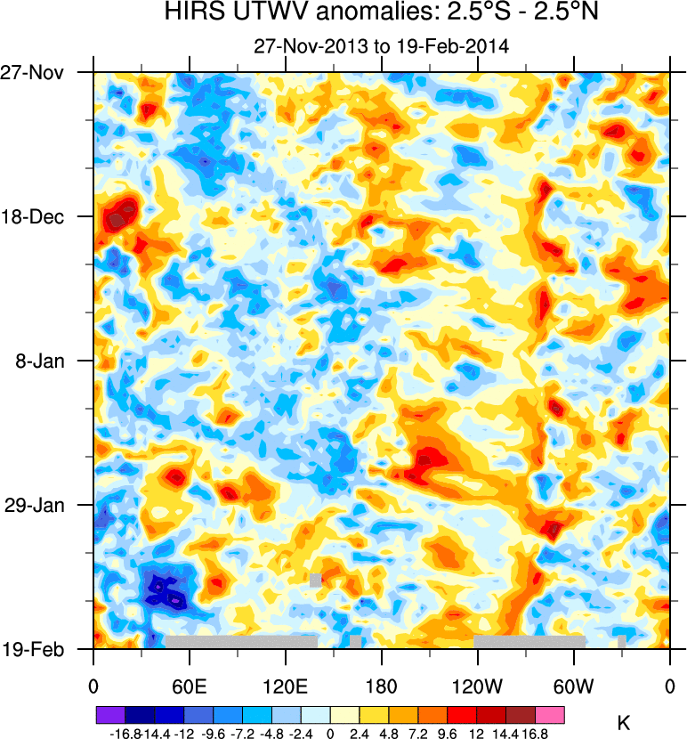 To identify tropical waves in near real-time, the OLR and UTWV data are filtered following Wheeler & Weickmann (2001 MWR). The daily anomalies are calculated using the first 3 harmonics of the seasonal cycle for 1979–2009. Missing values are then filled using linear interpolation in space and time. The most recent 365 days of anomalies are padded with 659 days of zeroes, and the result is filtered for each wave type.